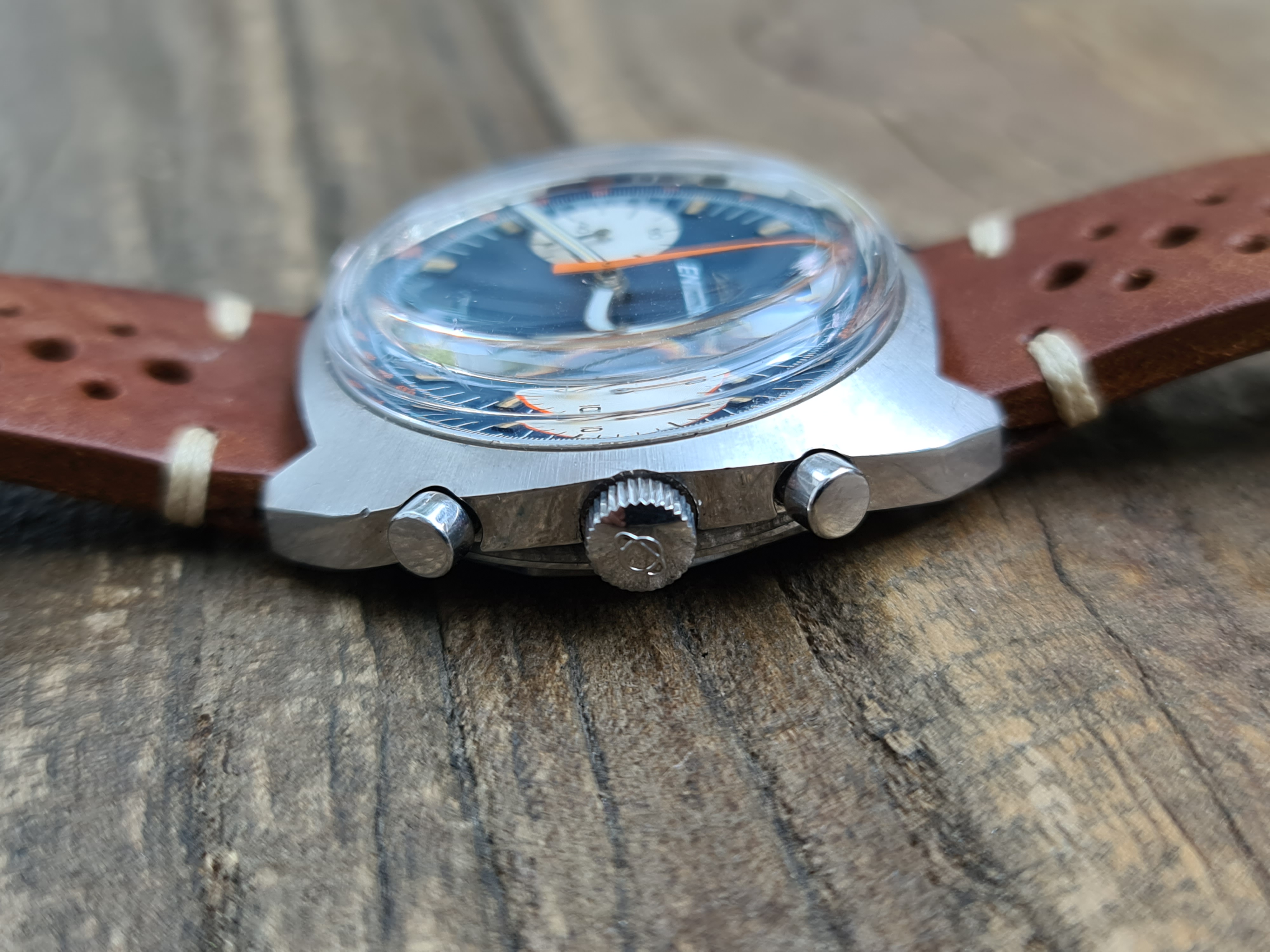 Lovely short lug style case with the dial going all the way to edge meaning that it wears more like a 39mm watch. The oversize "Big Eye" minutes register was intended for tracking elapsed time in an easy-to-read way when racing.