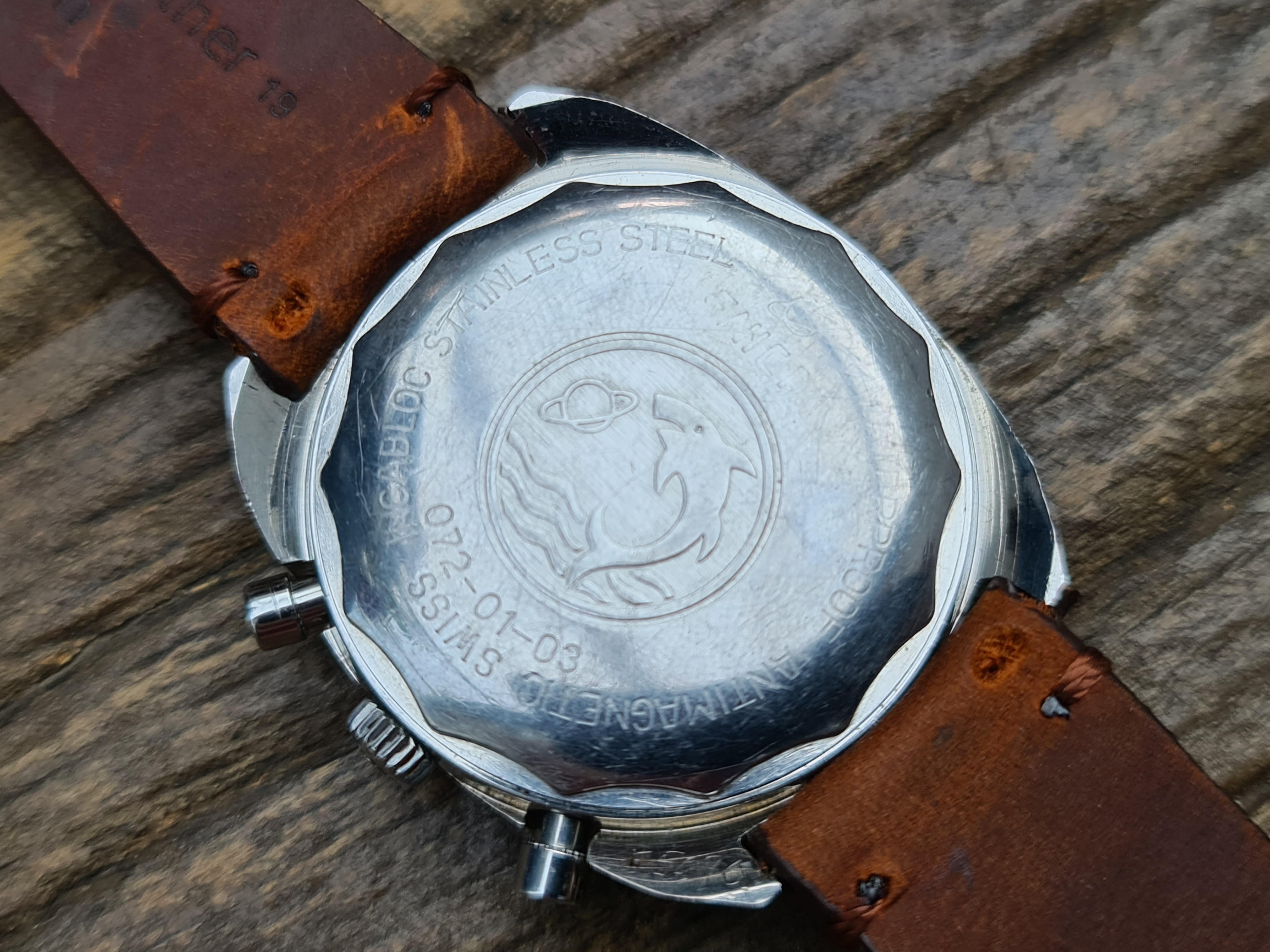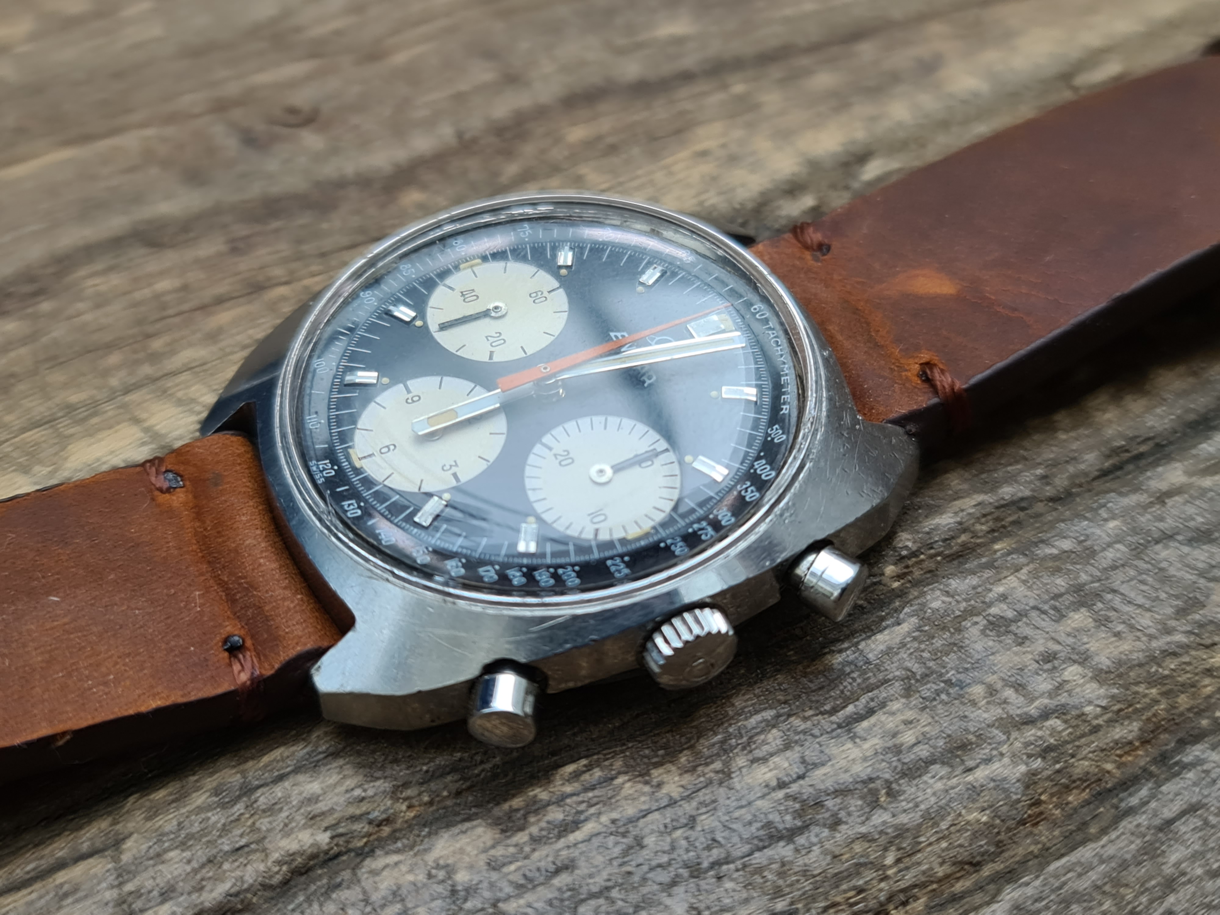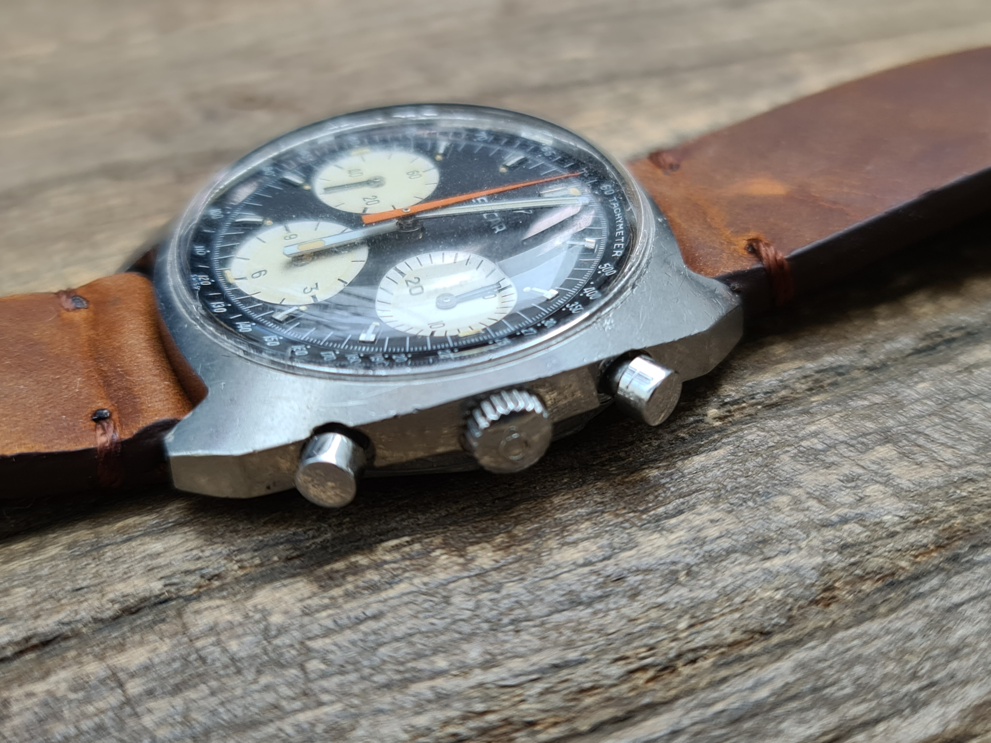 Good condition for age. Movement is running at +2 seconds per day and chronograph functioning perfectly and resetting crisply. Case shows signs of wear commensurate with age but is in overall lovely wearable vintage condition.