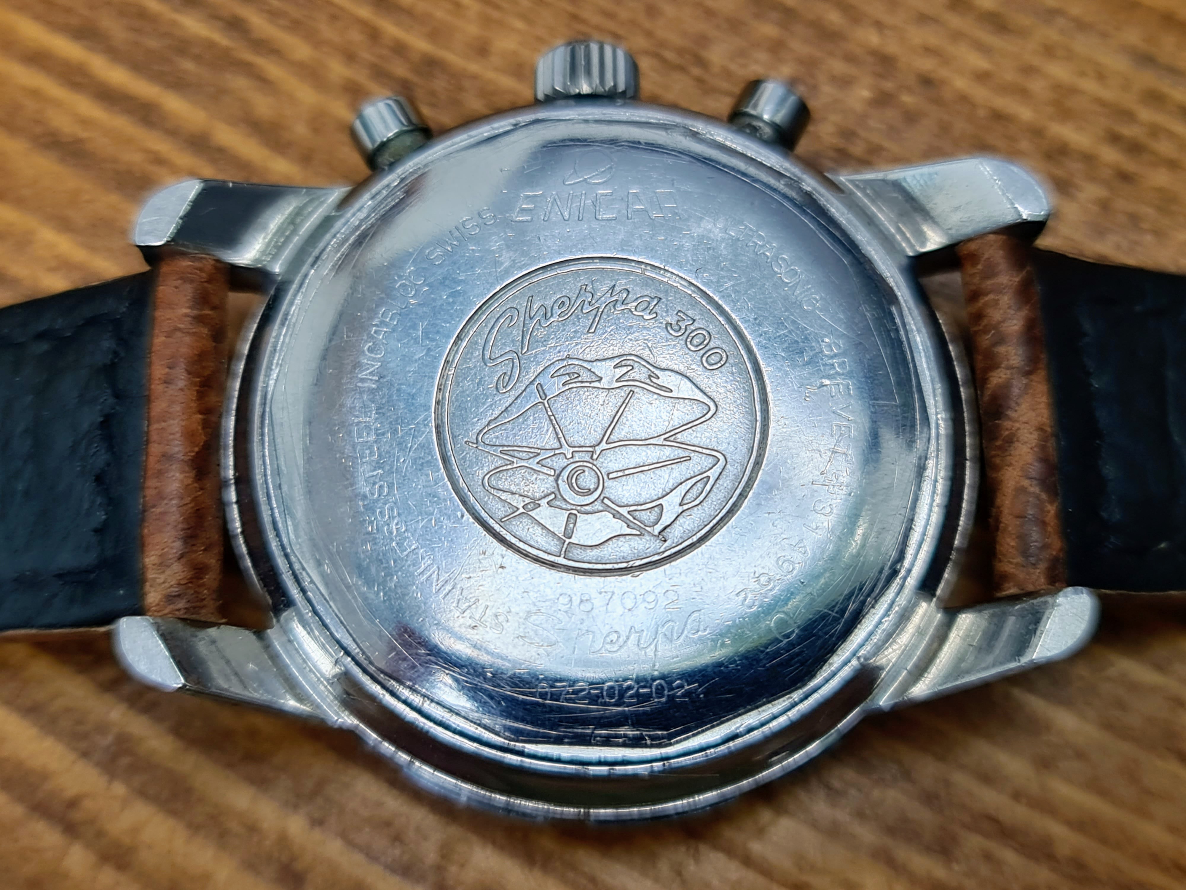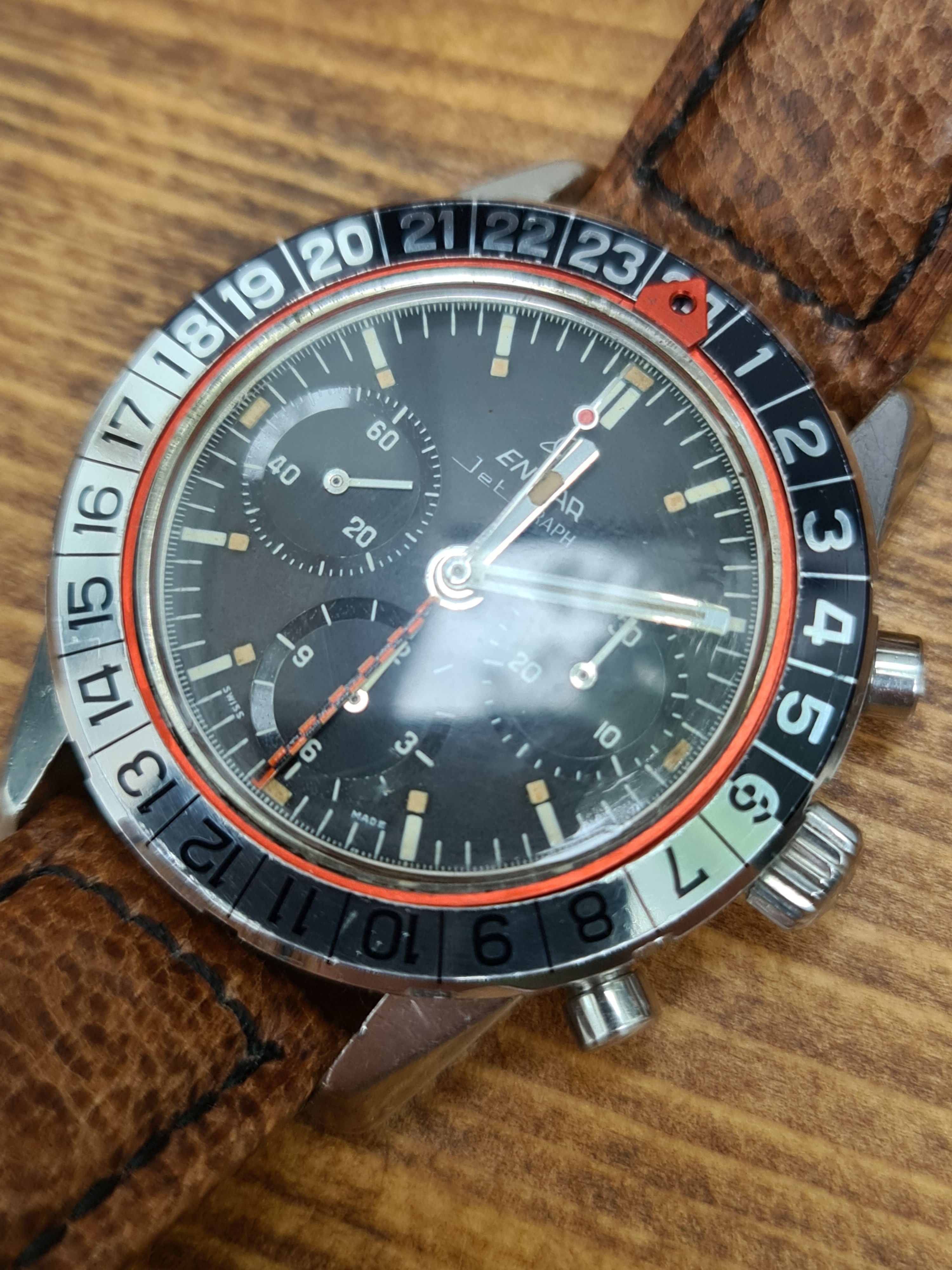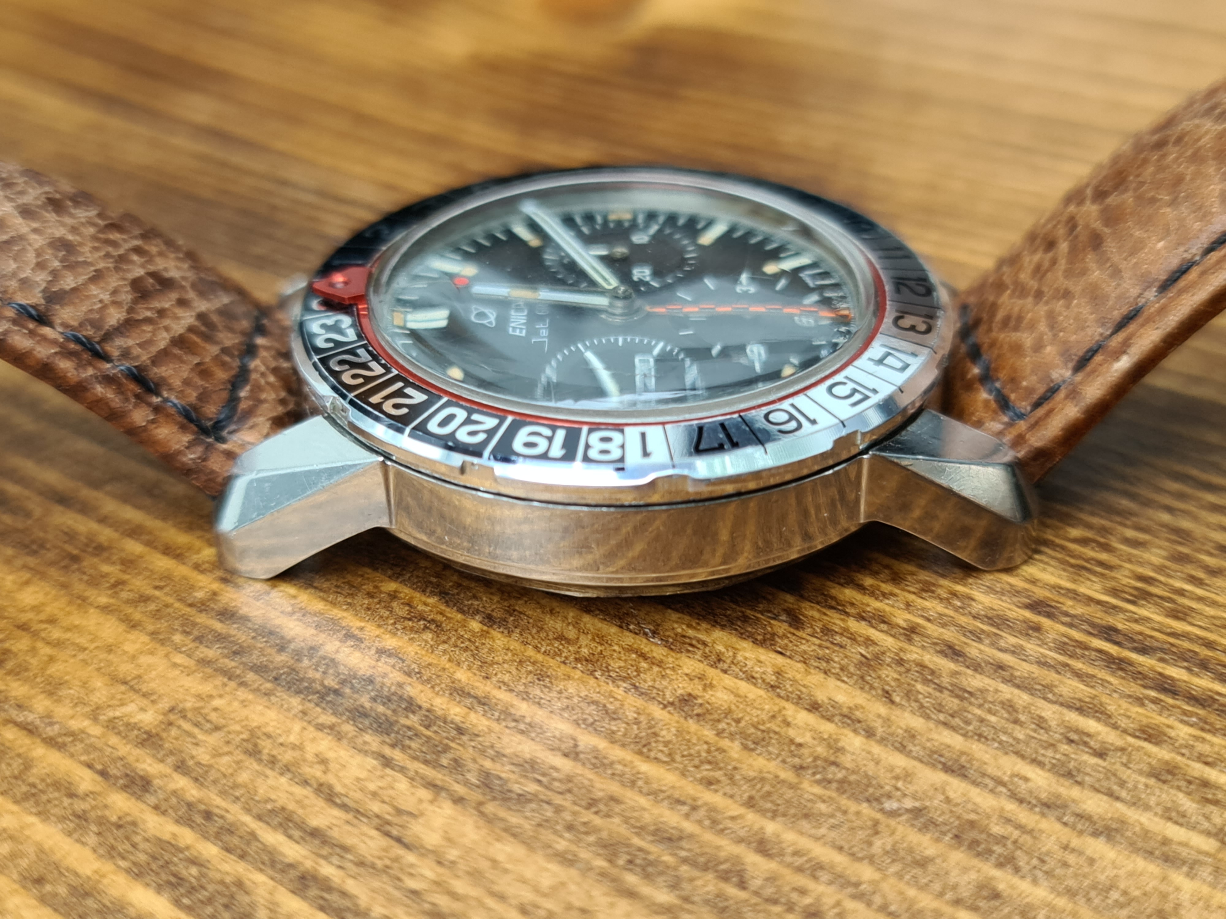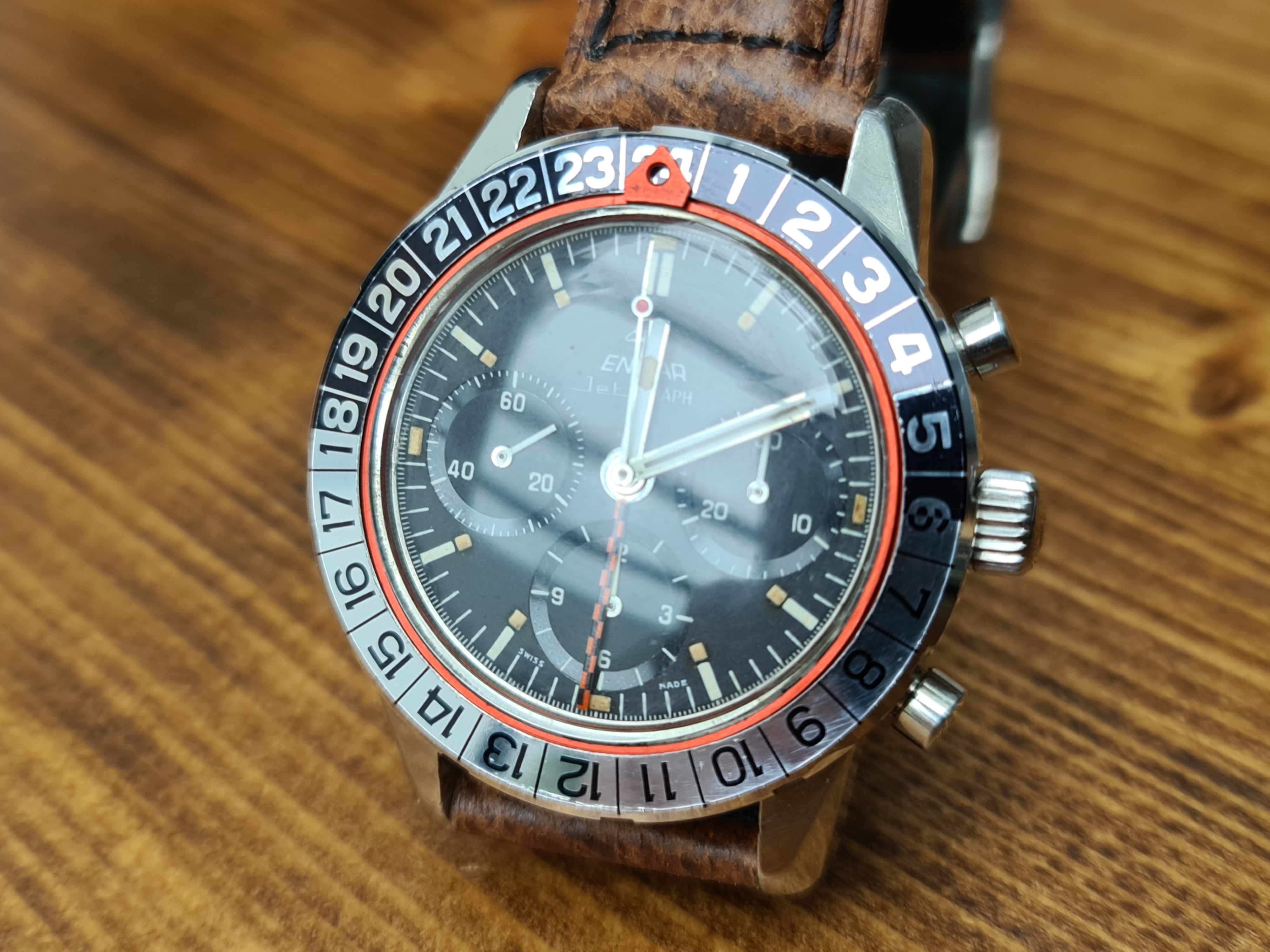 The Jet Graph was originally aimed at pilots in view of it's GMT and chronograph functions. These are 40mm with 20mm lugs. Lots of info on them here: https://thespringbar.com/blogs/guides/enicar-graph-collectors-guide-1/#JET_GRAPH and details on the serial numbers here: https://enicar101.com/serial-reference. The serial number on this one is 987092.