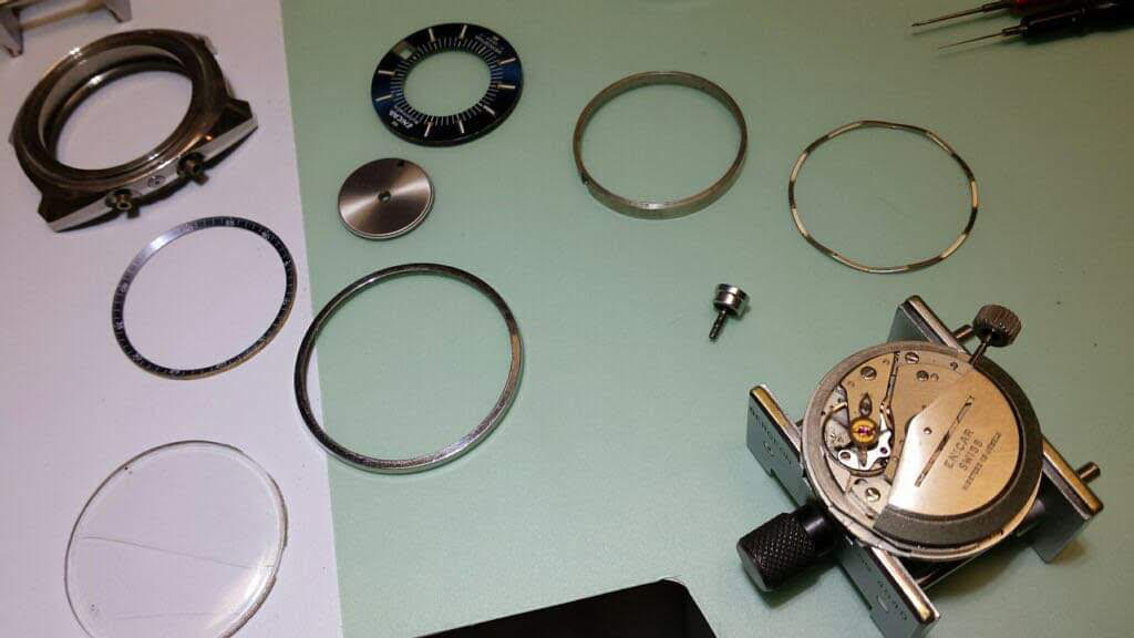 The dial is overall in clean condition with the original lume, it features a two-tone composition with the inner silver circle where you can set the alarm-time with. Crystal was replaced with an original NOS “Omega Memomatic” crystal as they both use exactly the same case! (Omega and Enicar released nearly identical watches using the same Lemania automatic movement). A perfect fit, with the Enicar minute track/retaining ring fitted perfectly.