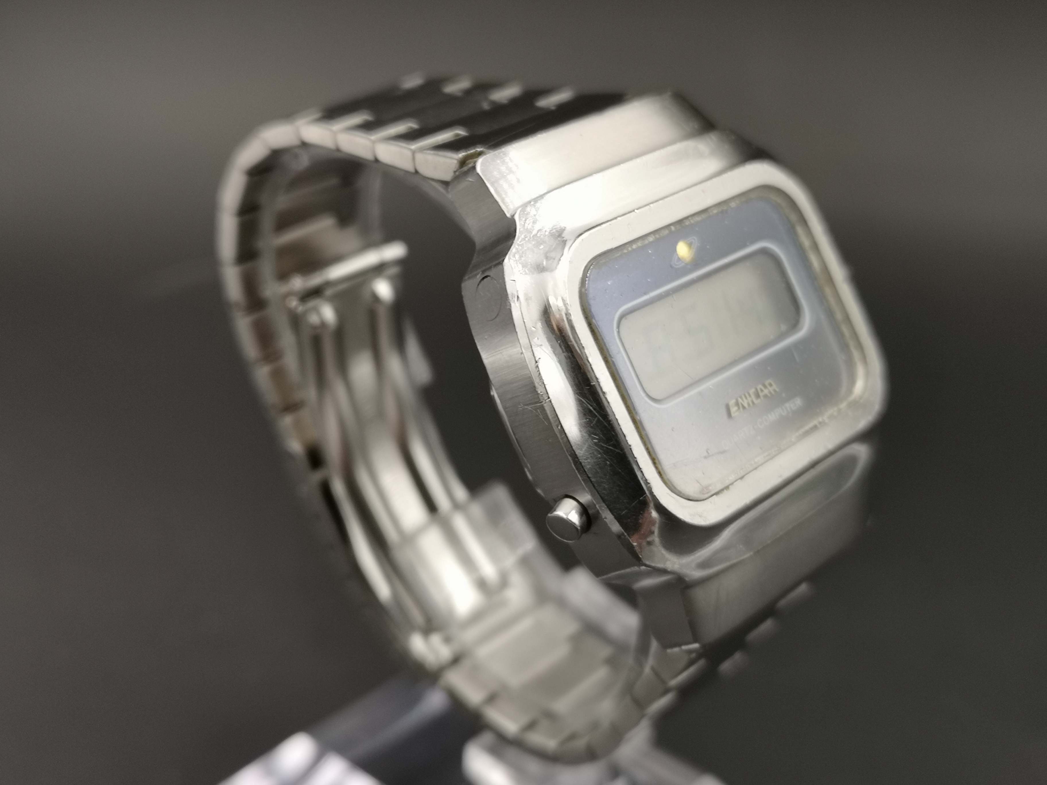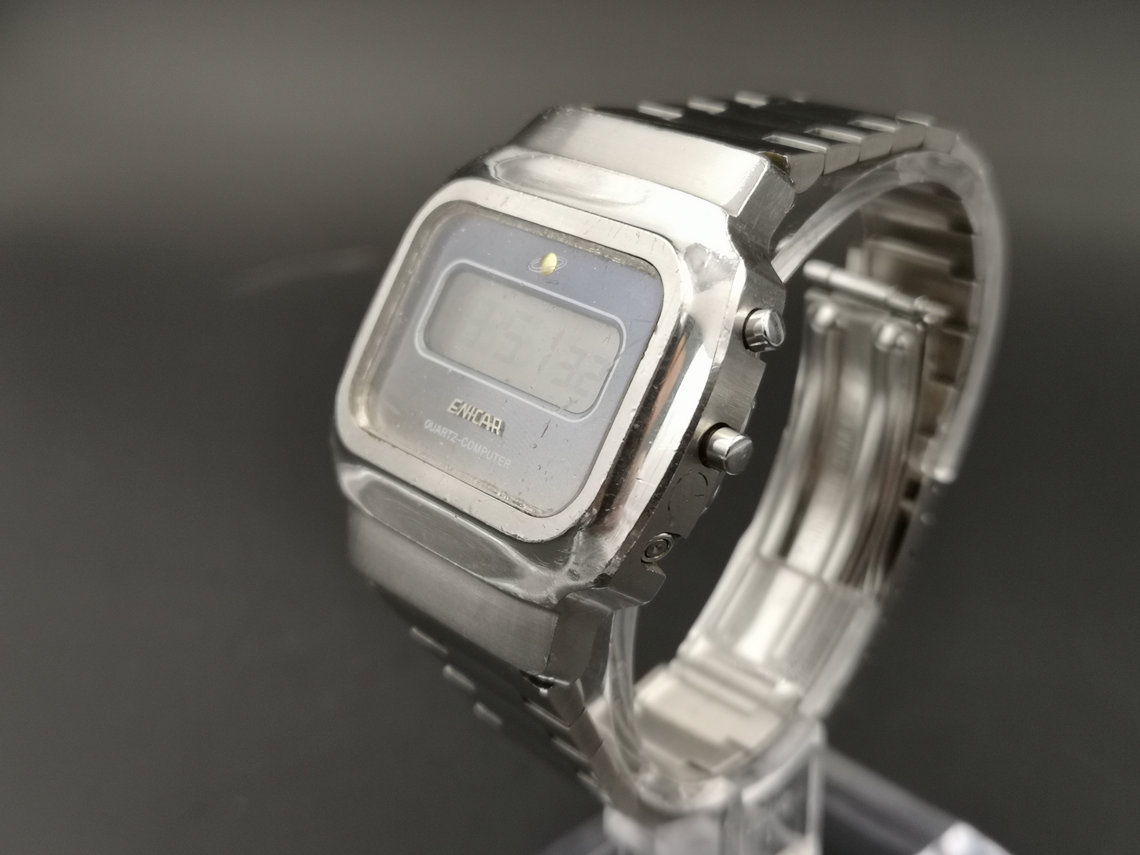 Case is in good overall condition but obviously has marks commensurate with it's age. The crystal also shows signs of wear and could do with a light refurb (none of the marks are deep as far as I can see) or replacement. Original bracelet in great condition and all functioning correctly including the display light. The buttons are slightly 'sticky' and slow to pop back out, so could do with a strip down and clean to get this one back to perfect order but does function perfectly still as is.