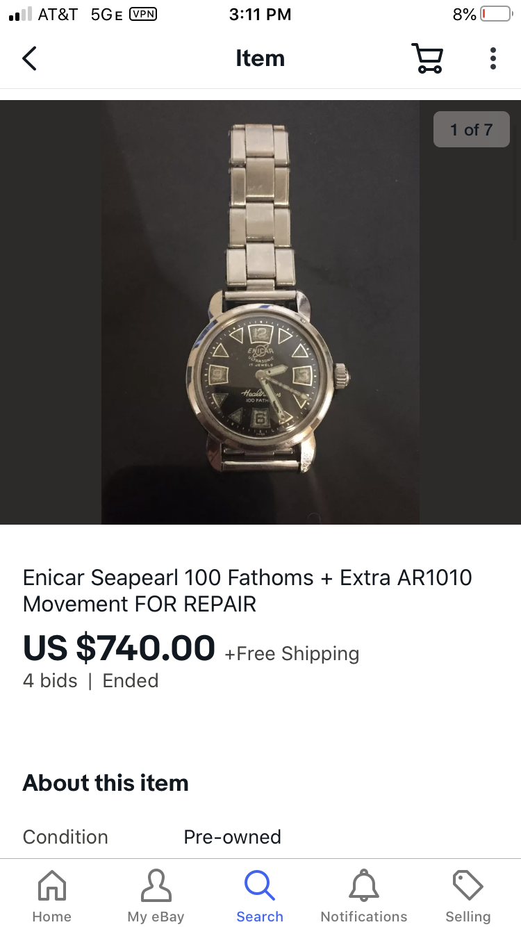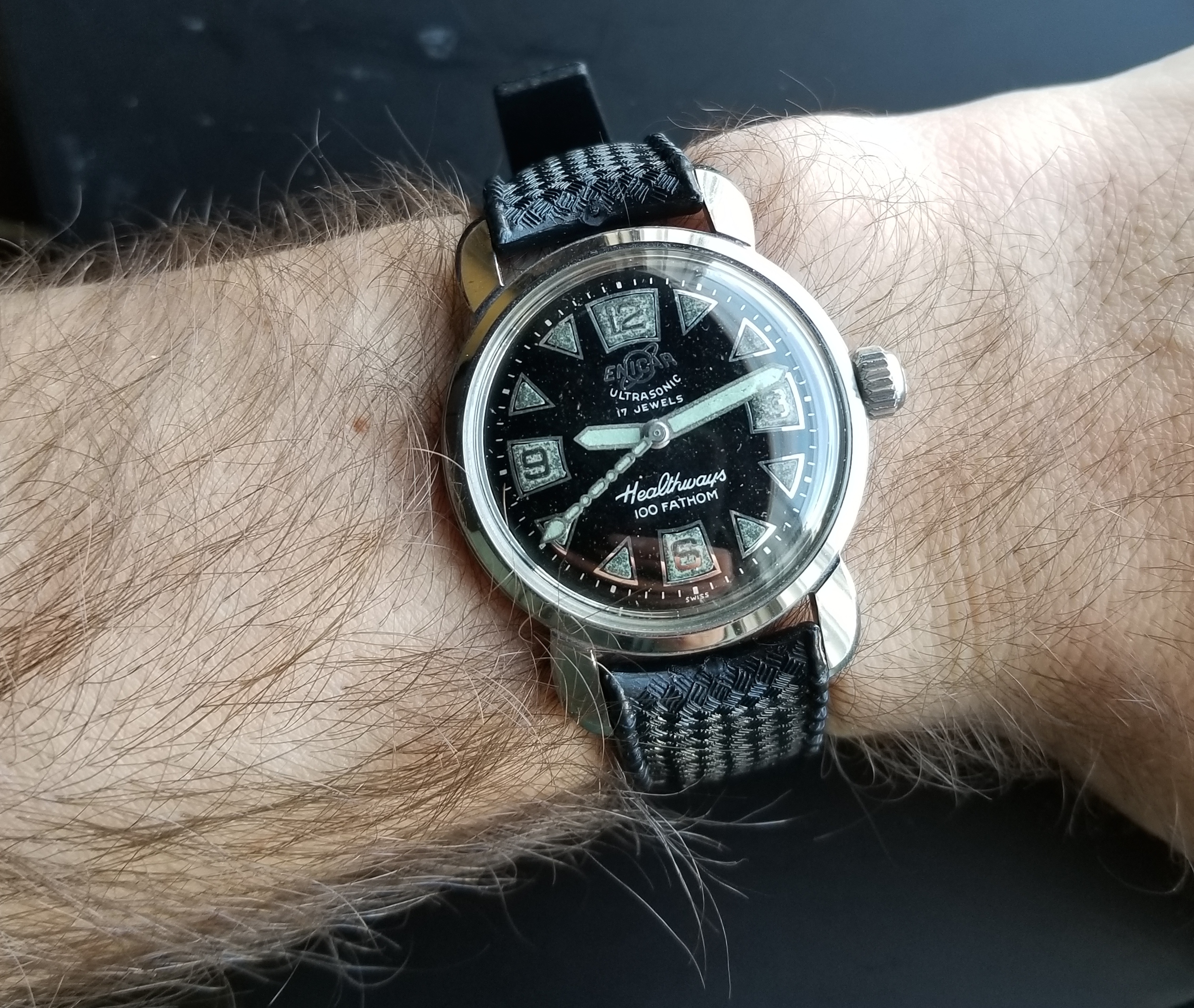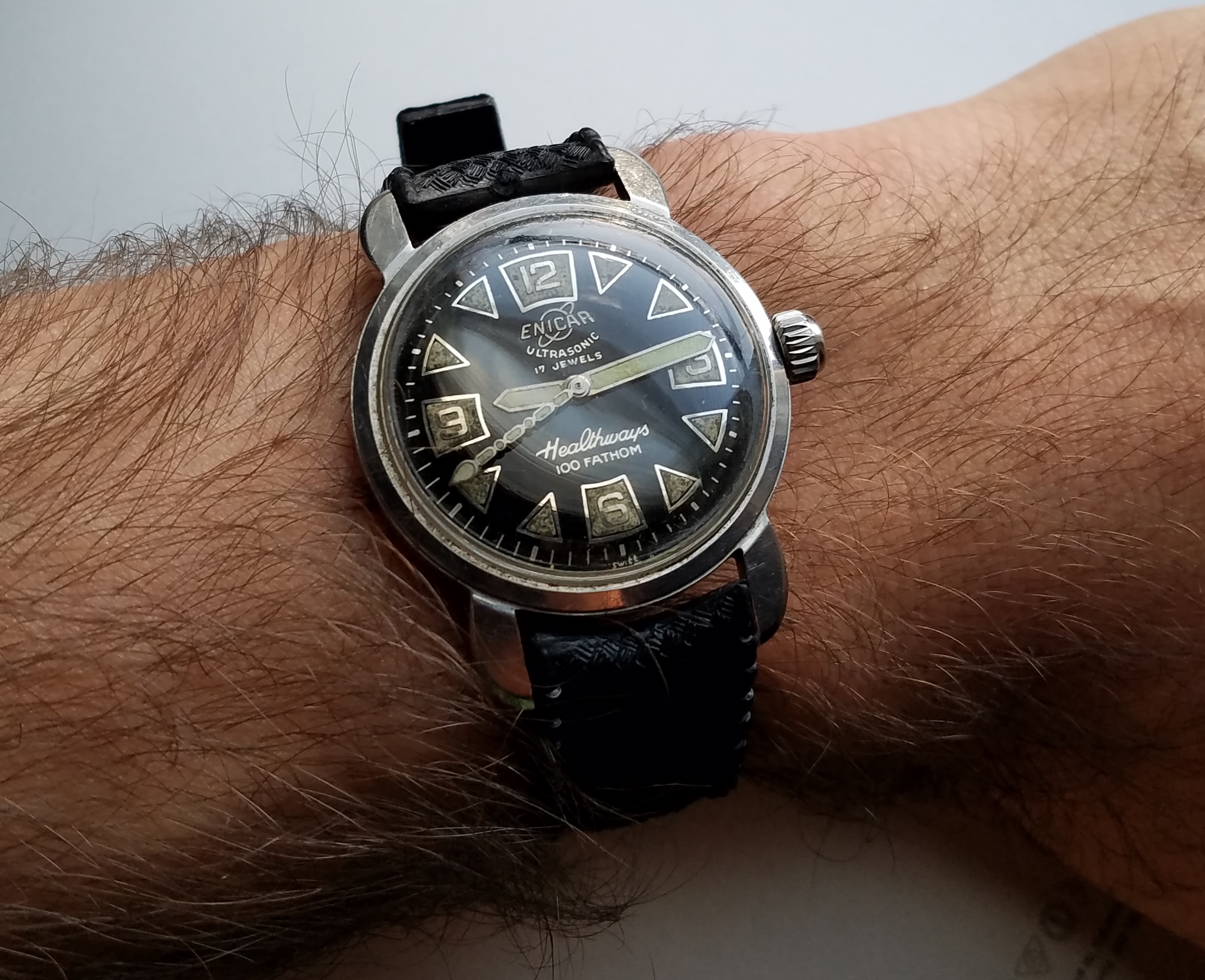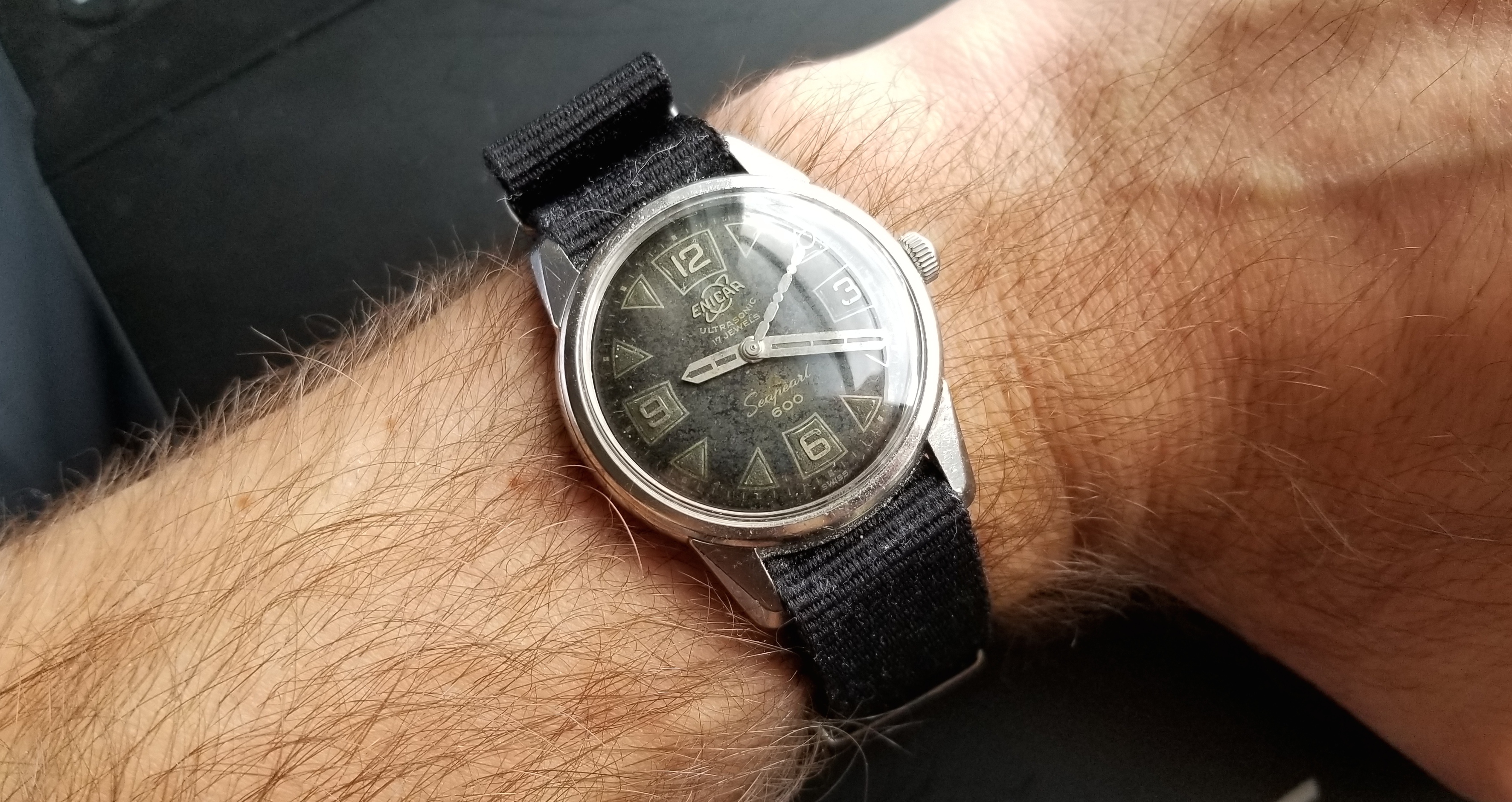 Why would this beat up watch seem attractive? Well, under the heavily scratched bezel lies an attractive dial with, apparently incredible lume. Also, Enicar is a well respected brand among collectors (although undervalued IMHO).
