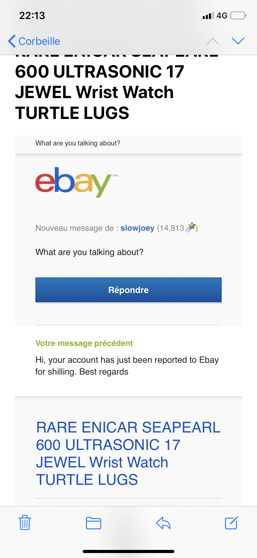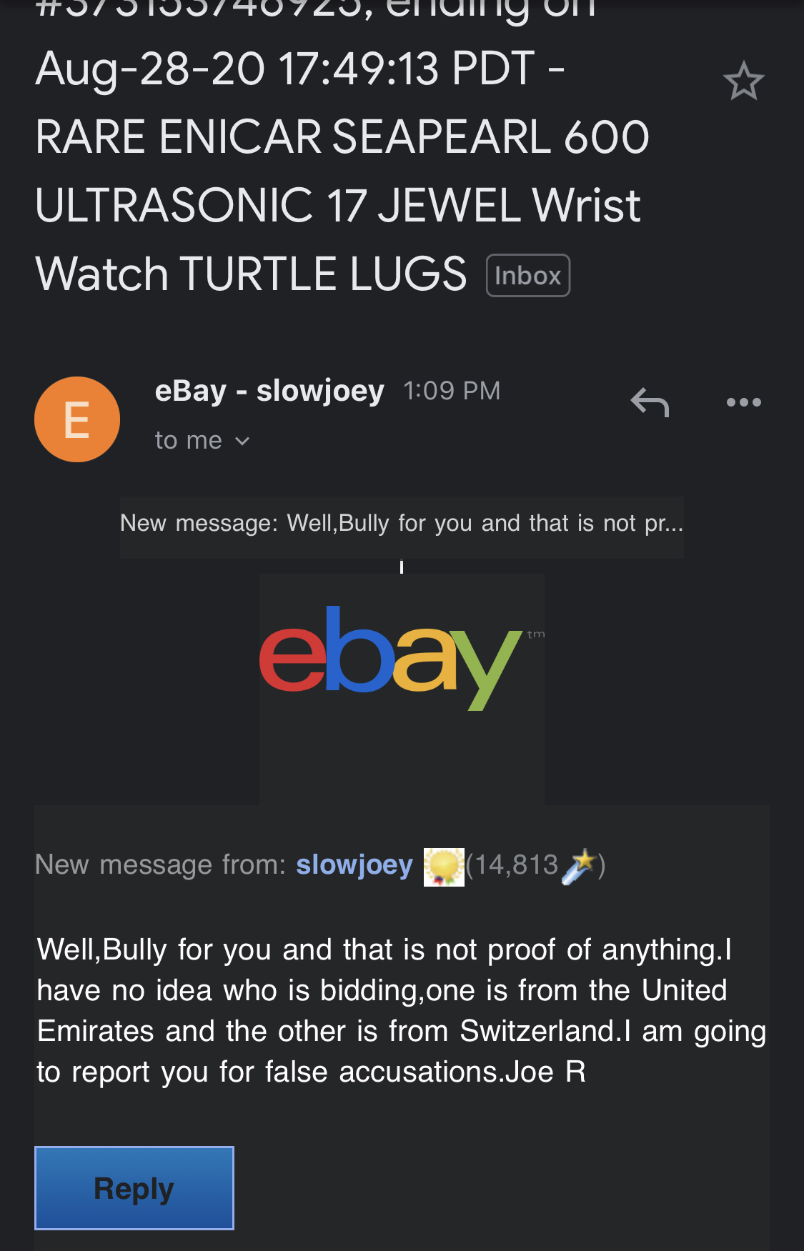 My problem starts here: there are two accounts that have engaged on a "bid war". Note the eBay "level" of each account and the dates.