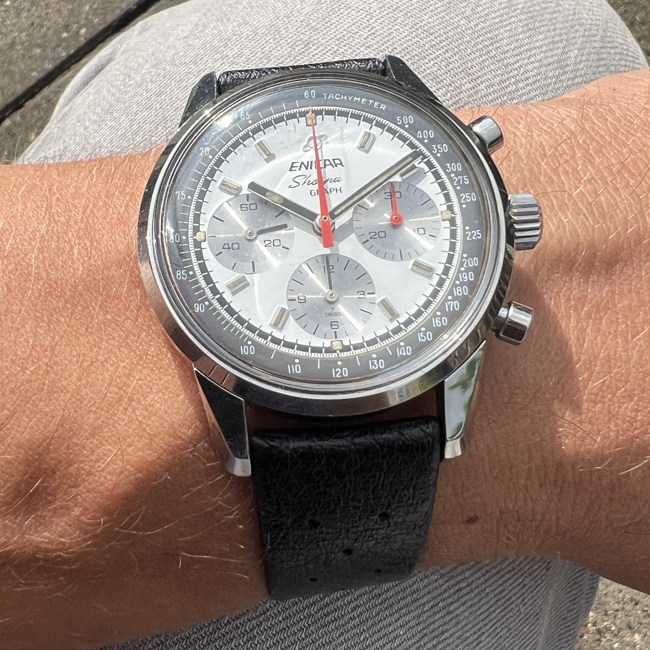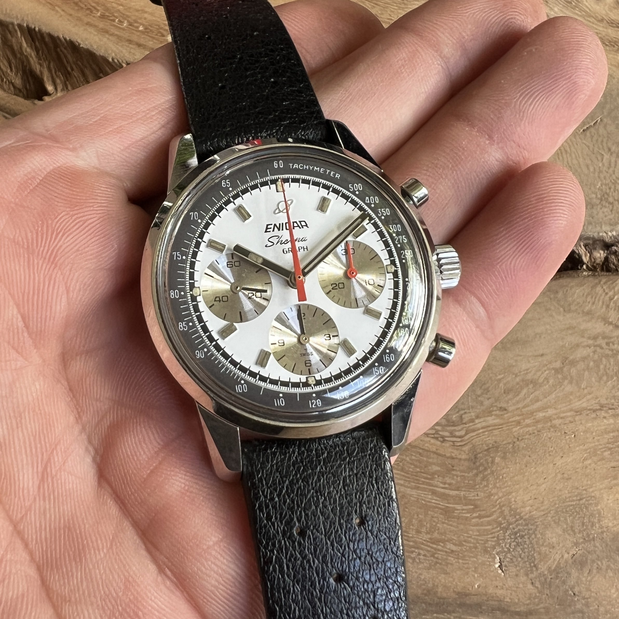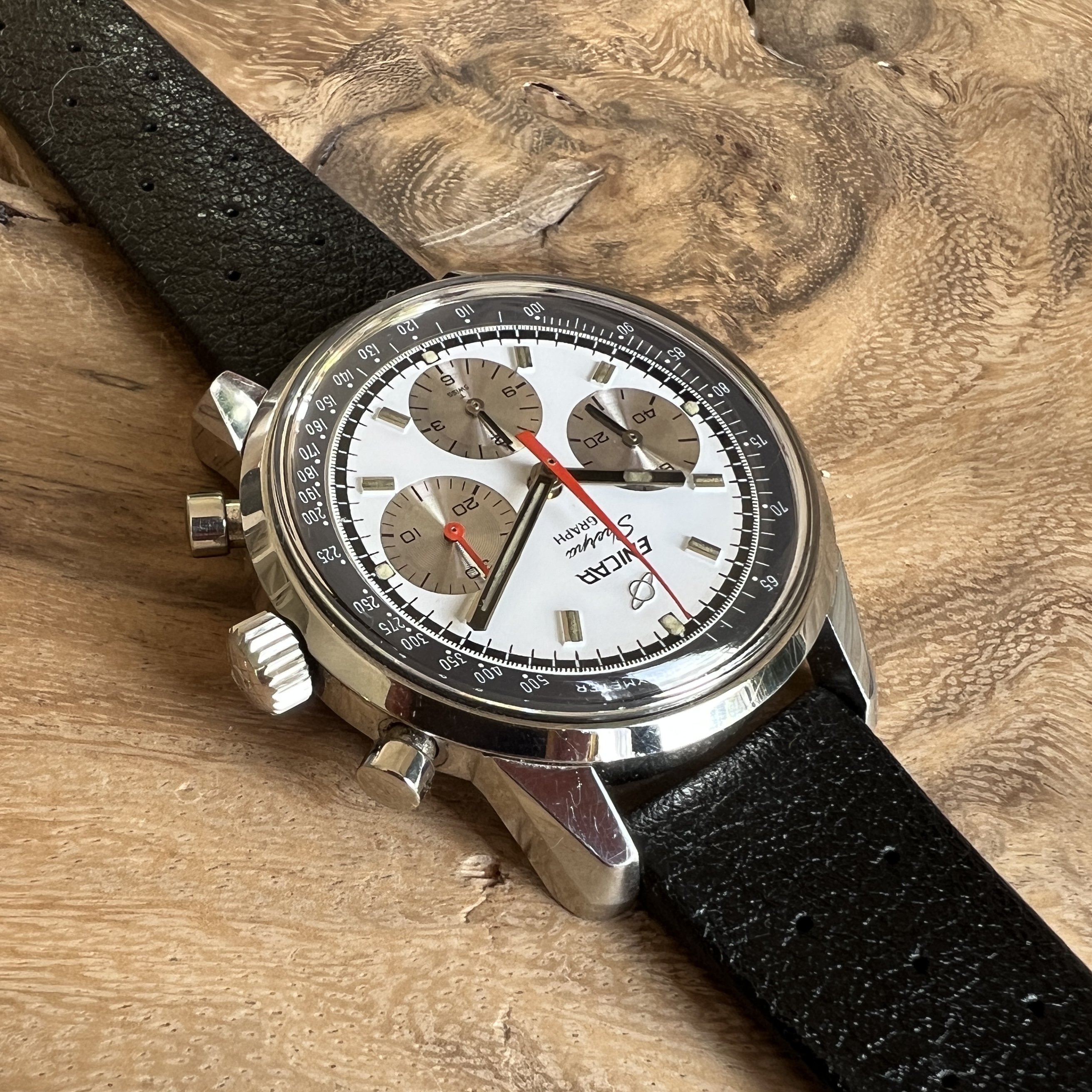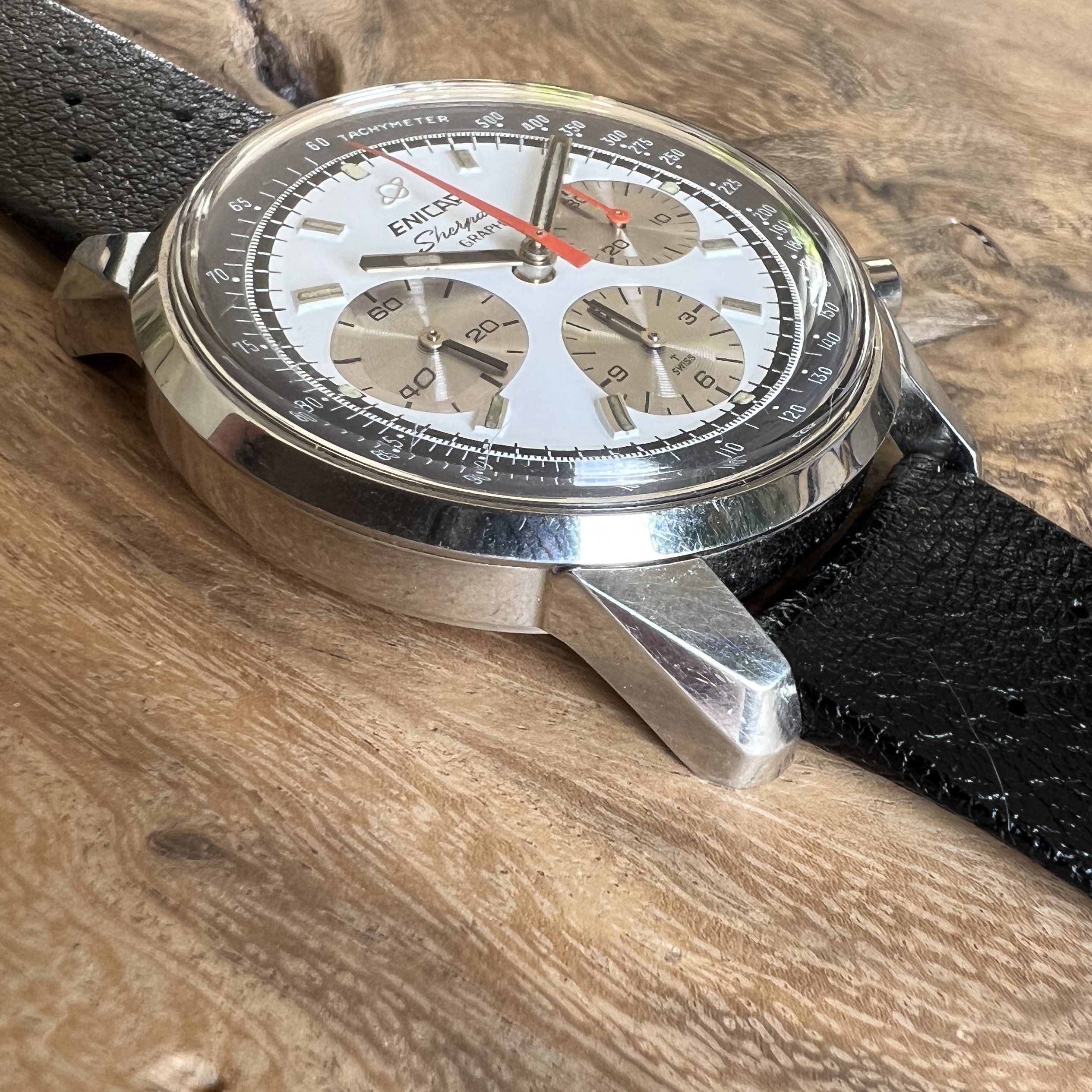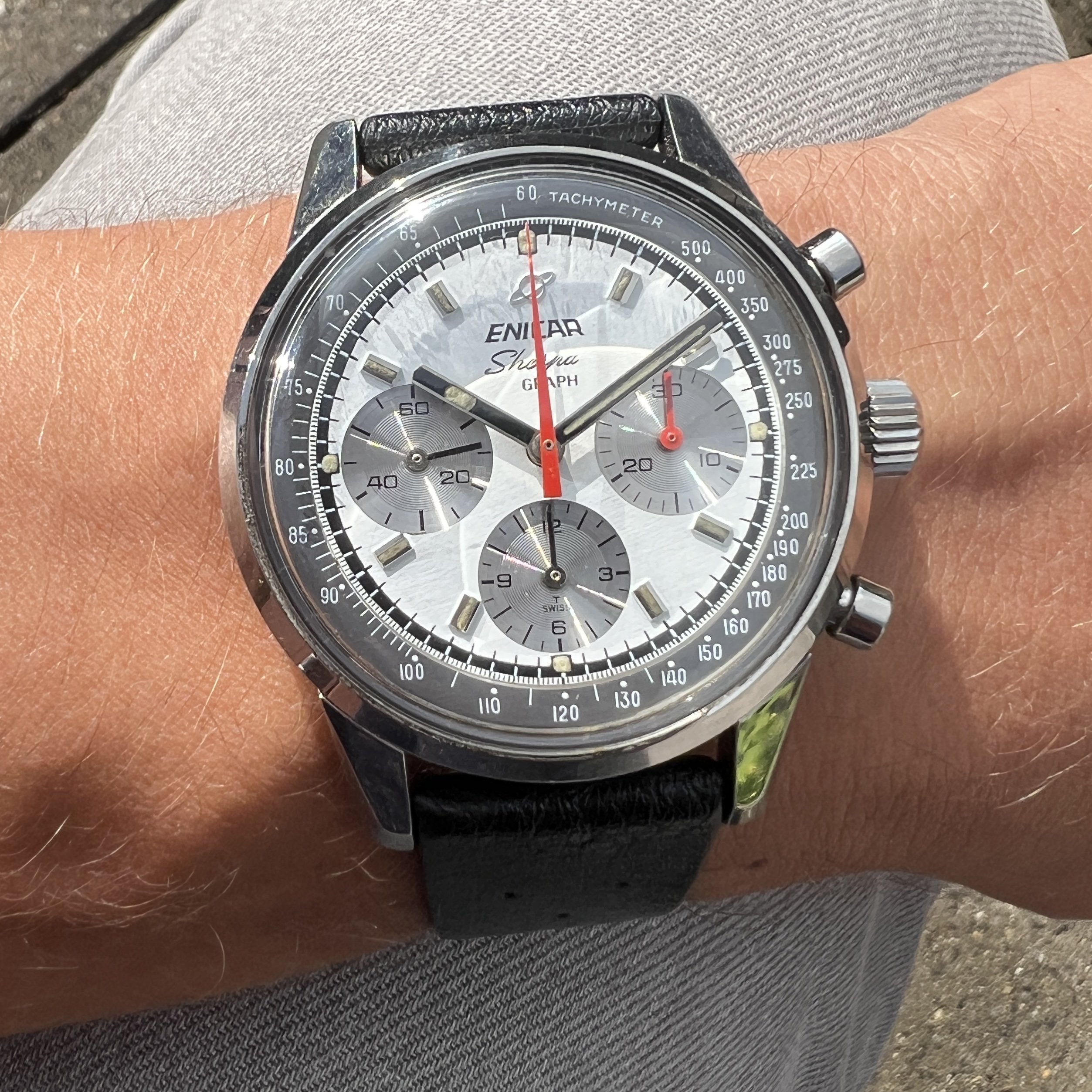 ··@SpeedyBirthYearFor sale an Enicar Sherpa Graph in amazing vintage condition. This unusual white dial Sherpa Graph must have spend a long time of its life in a drawer as its condition shows little of its life since production in approx. 1968. It pains me to let it go, but other horological priorities await. 😀
