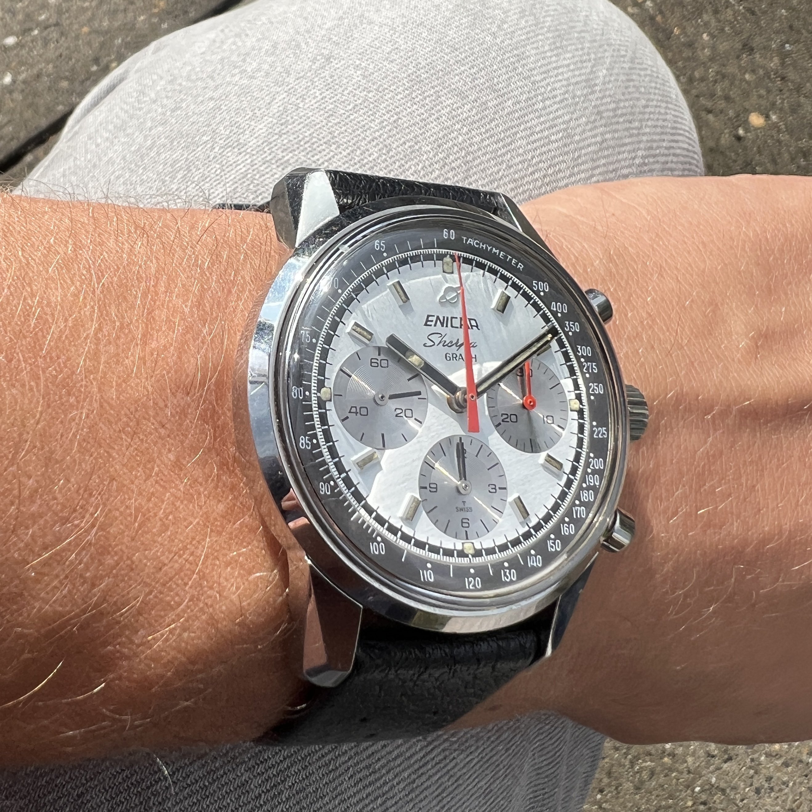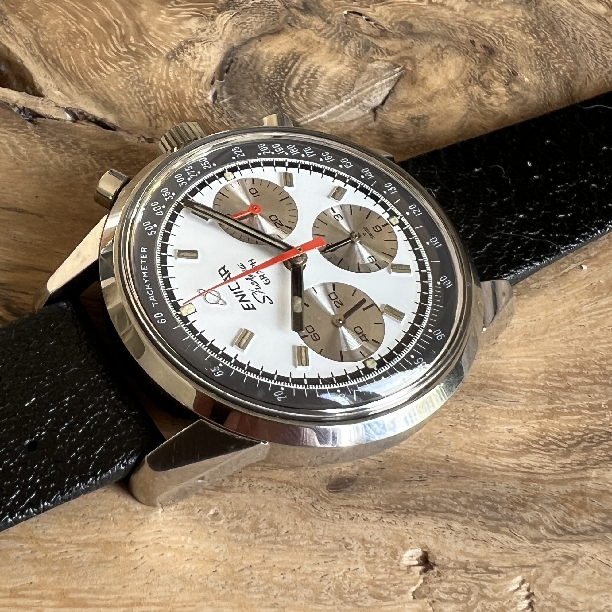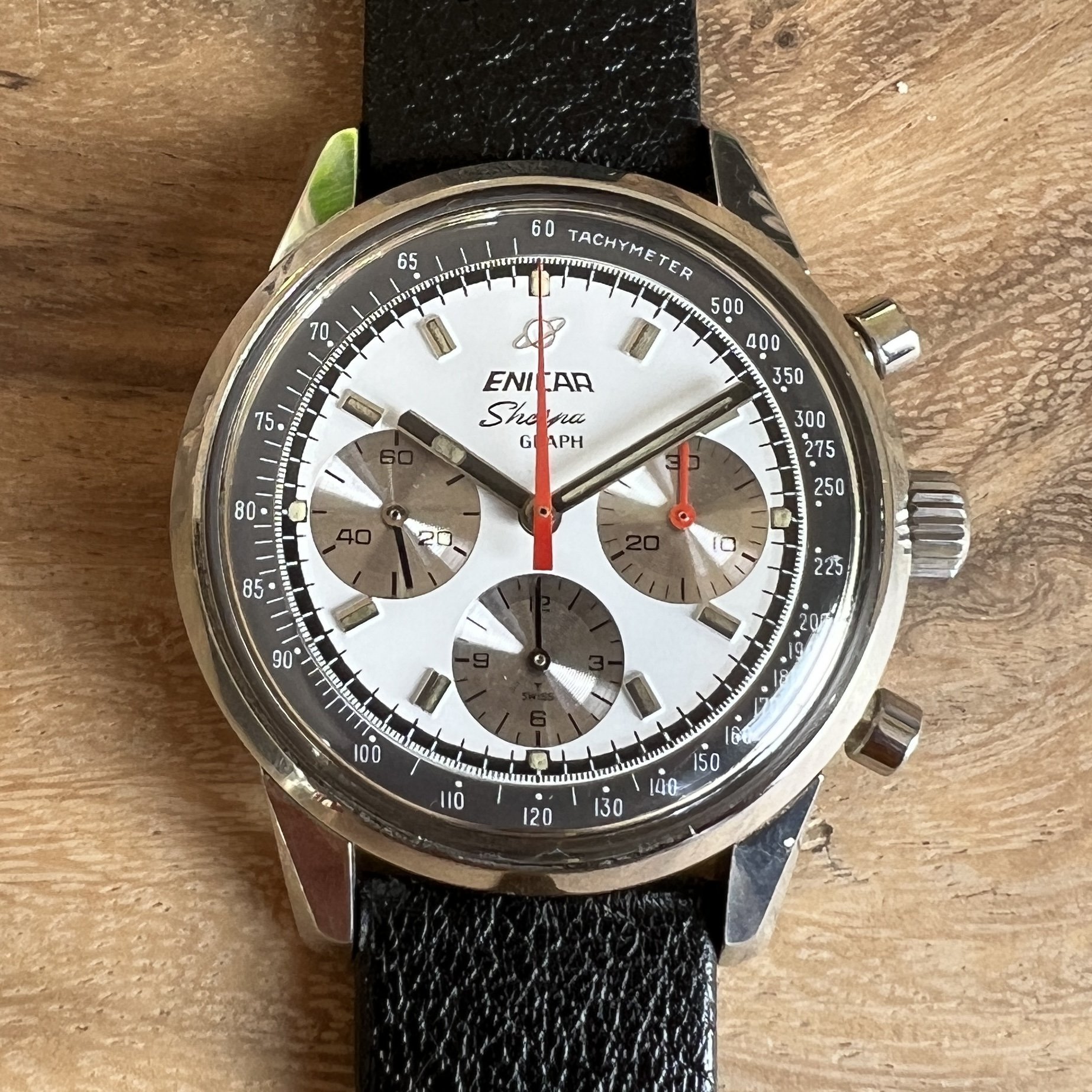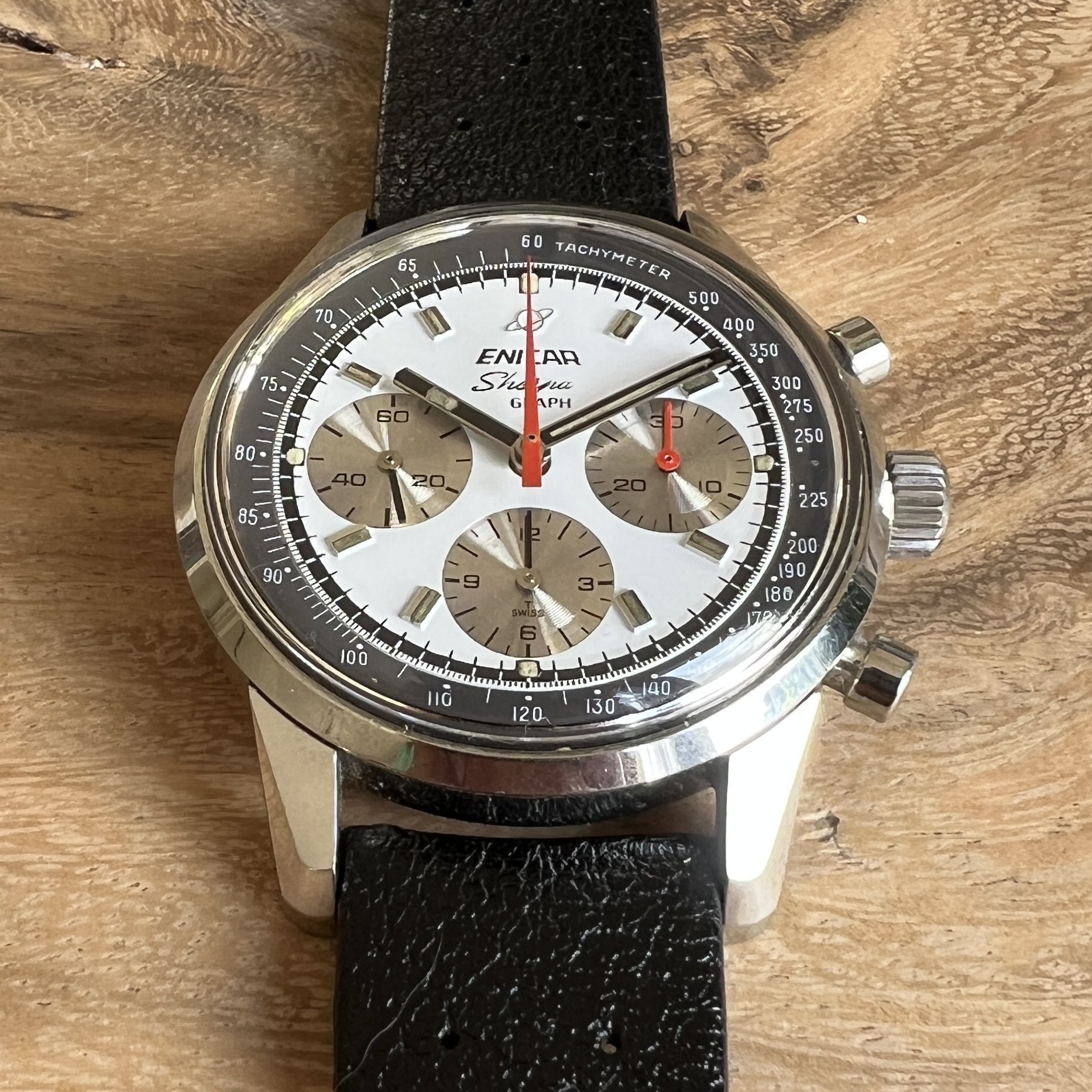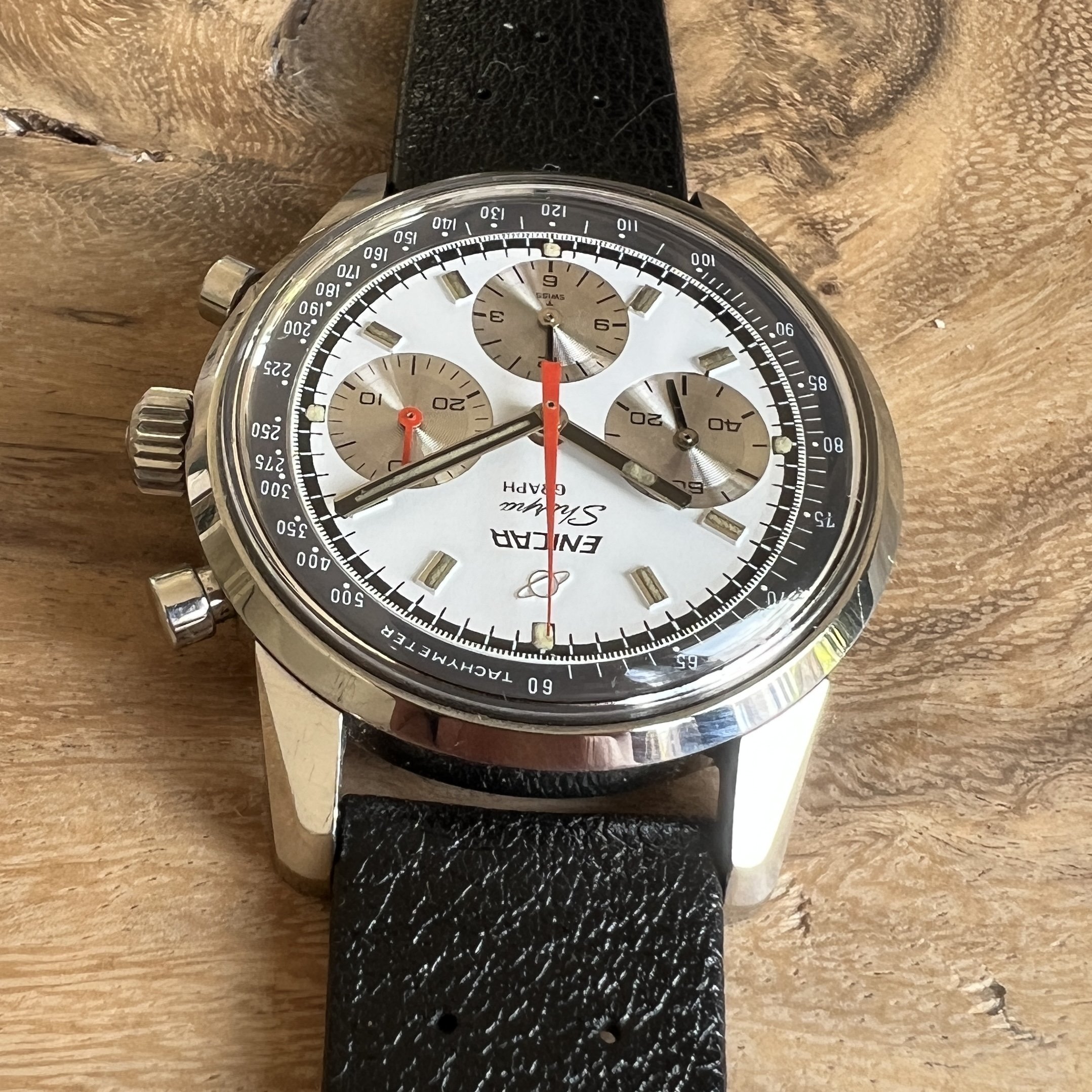 ··@SpeedyBirthYearFor sale an Enicar Sherpa Graph in amazing vintage condition. This unusual white dial Sherpa Graph must have spend a long time of its life in a drawer as its condition shows little of its life since production in approx. 1968. It pains me to let it go, but other horological priorities await. 😀