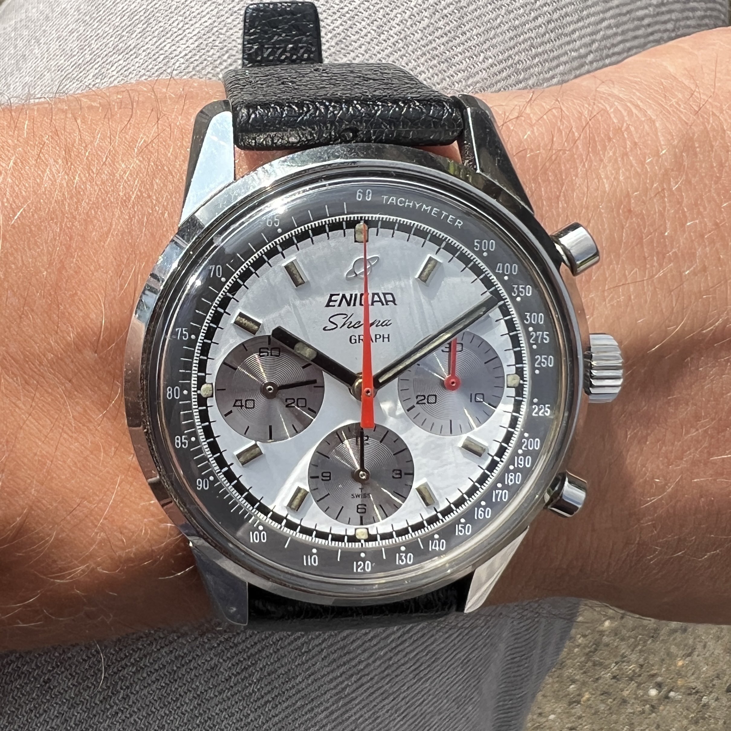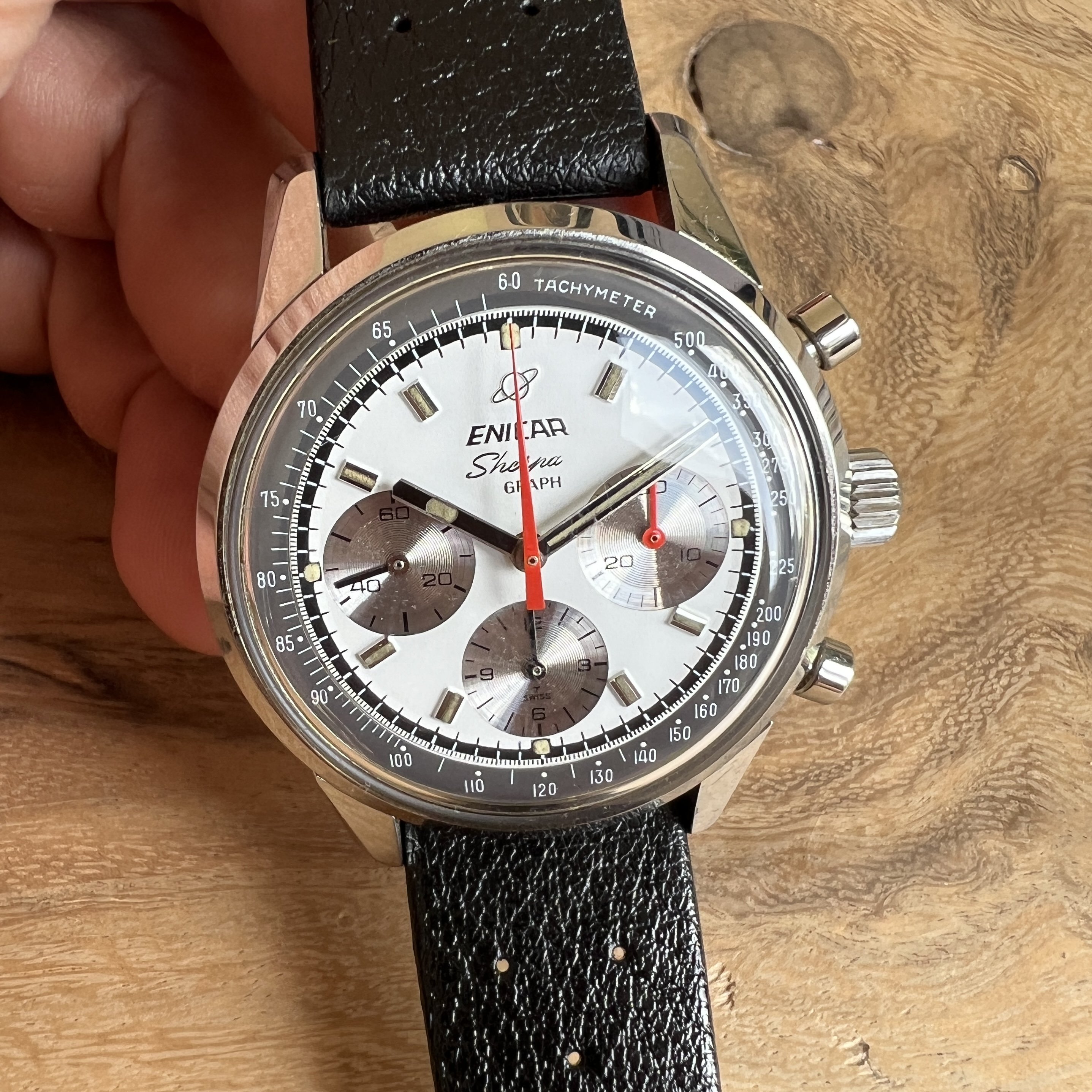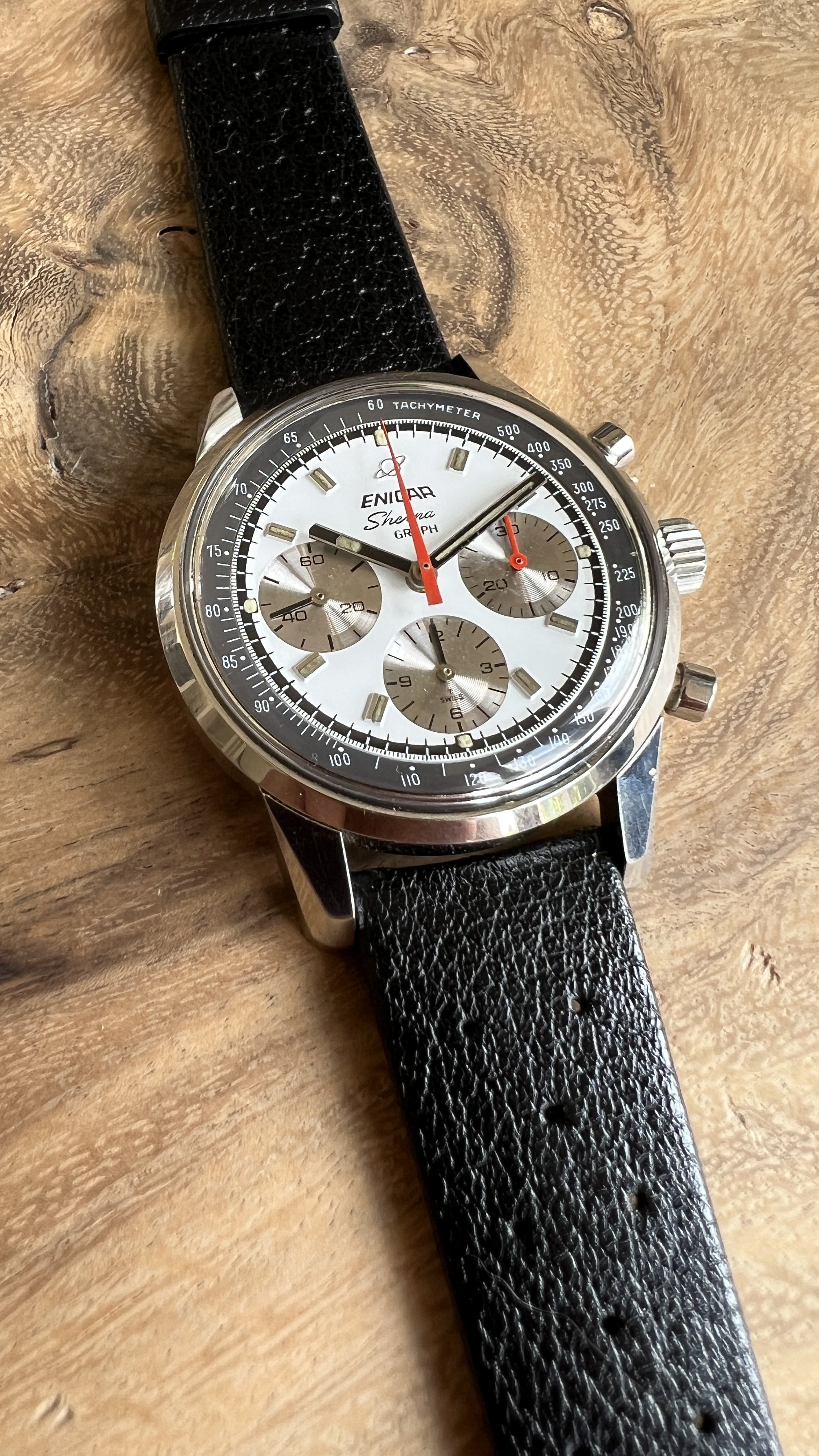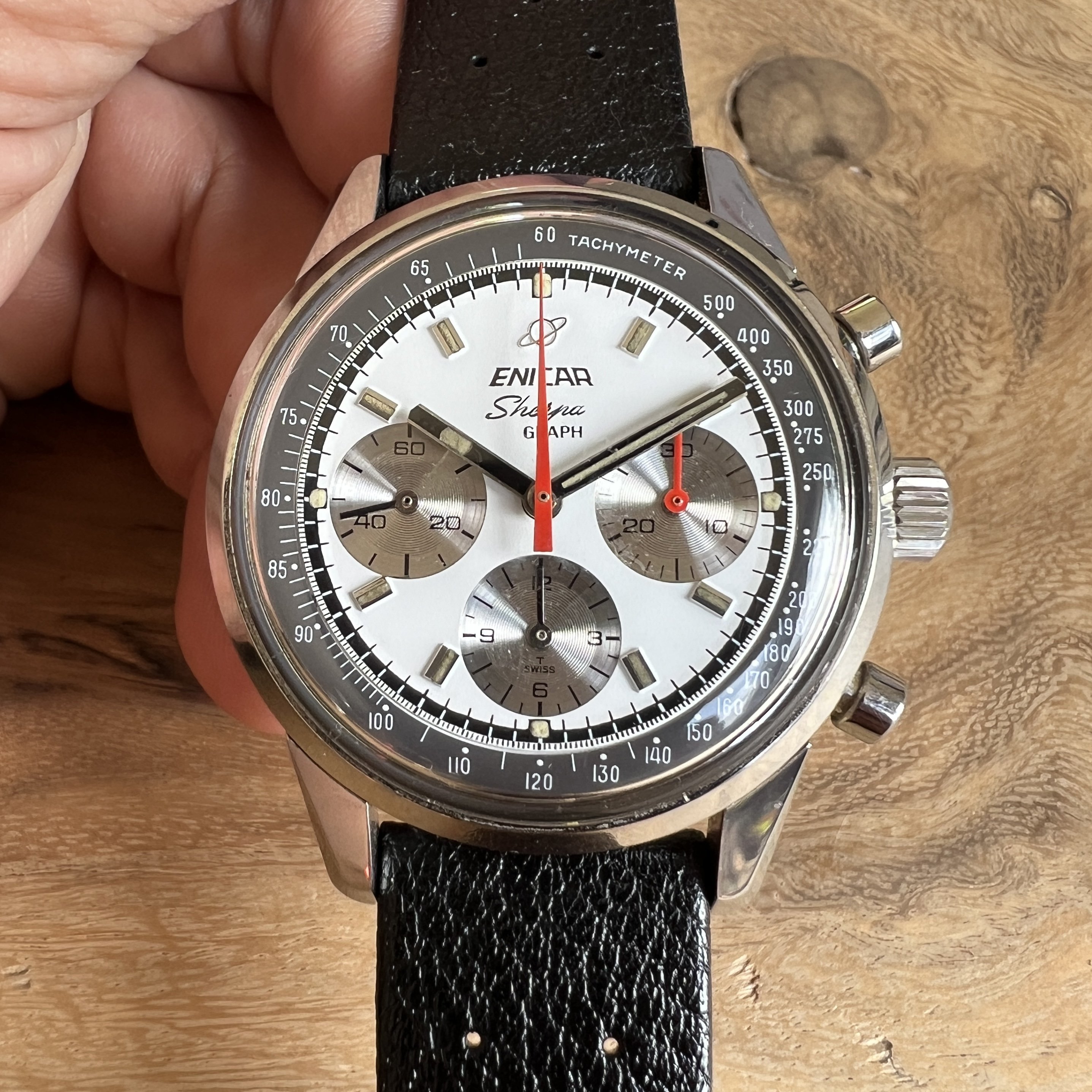 ··@SpeedyBirthYearFor sale an Enicar Sherpa Graph in amazing vintage condition. This unusual white dial Sherpa Graph must have spend a long time of its life in a drawer as its condition shows little of its life since production in approx. 1968. It pains me to let it go, but other horological priorities await. 😀