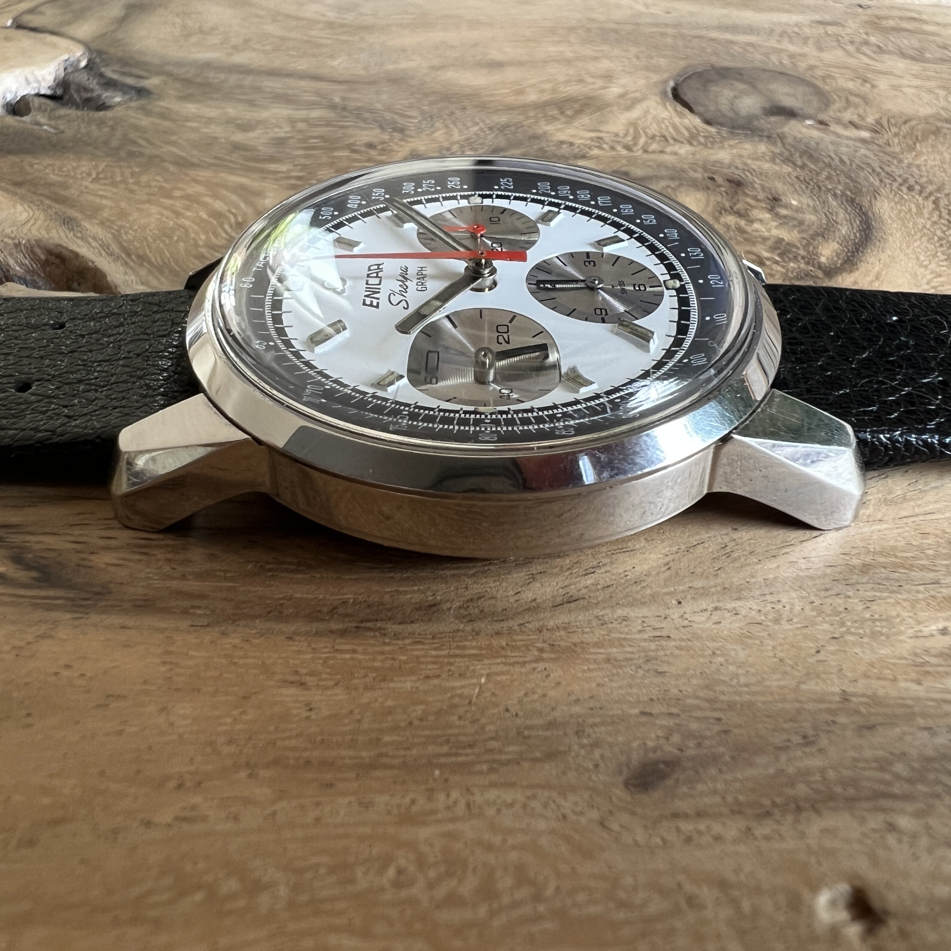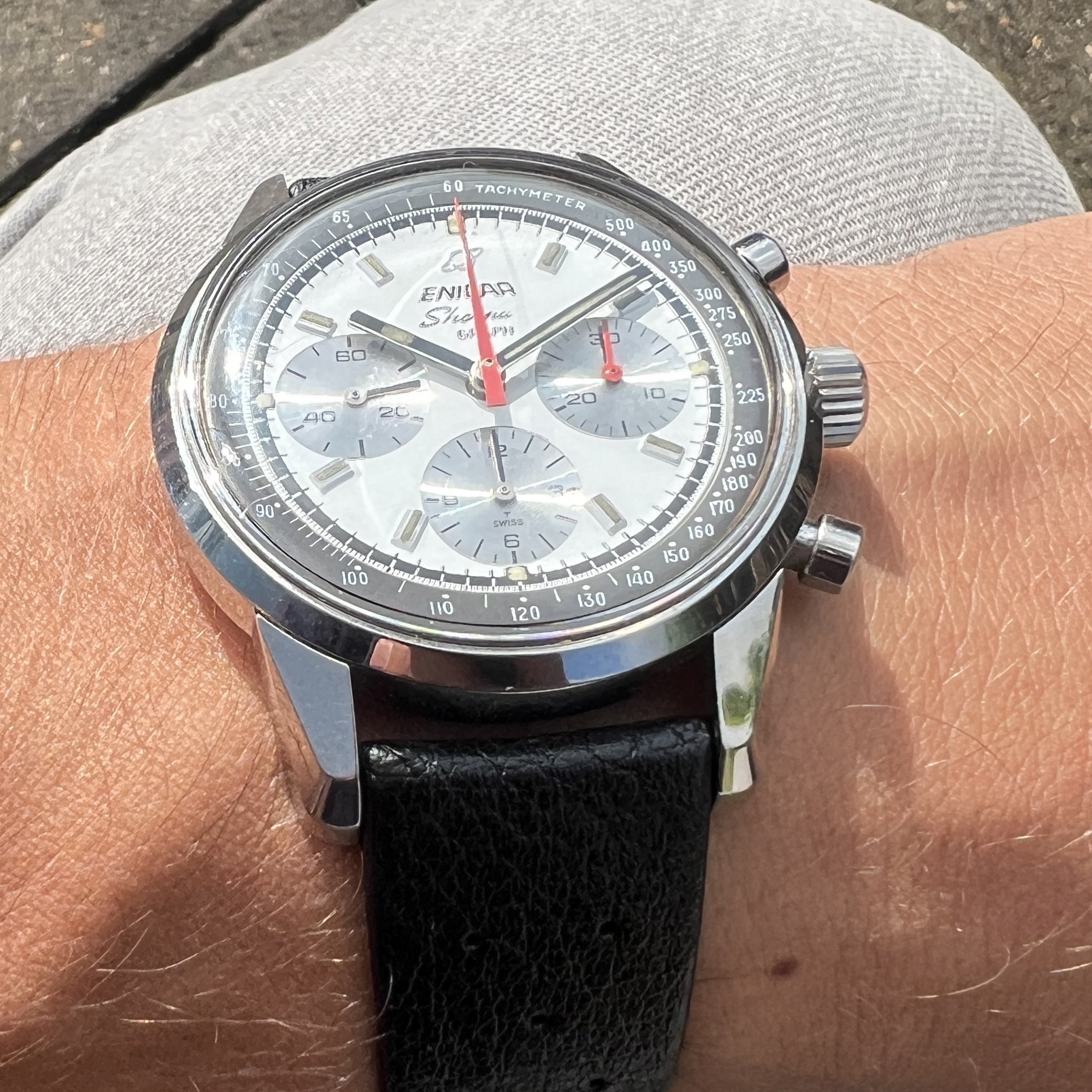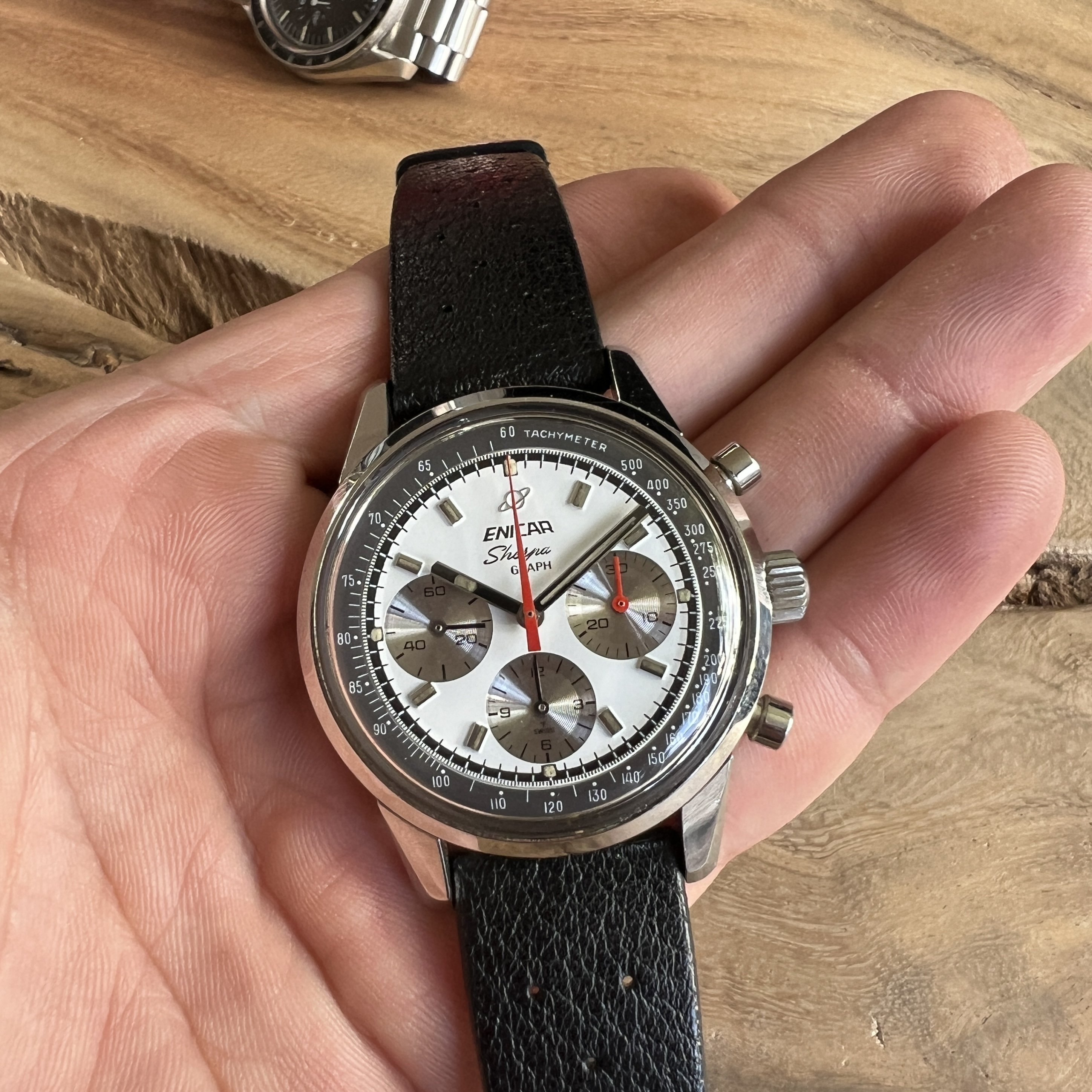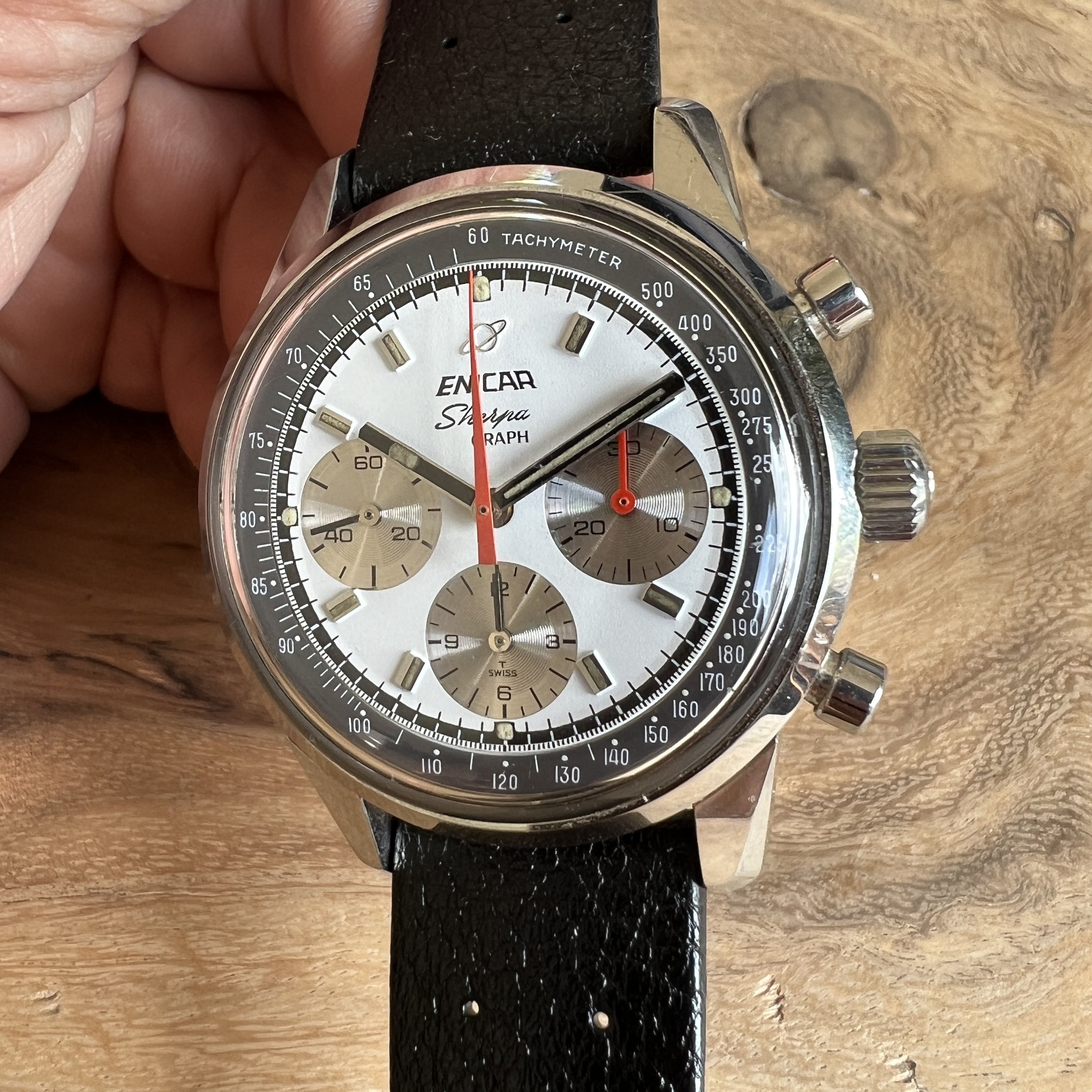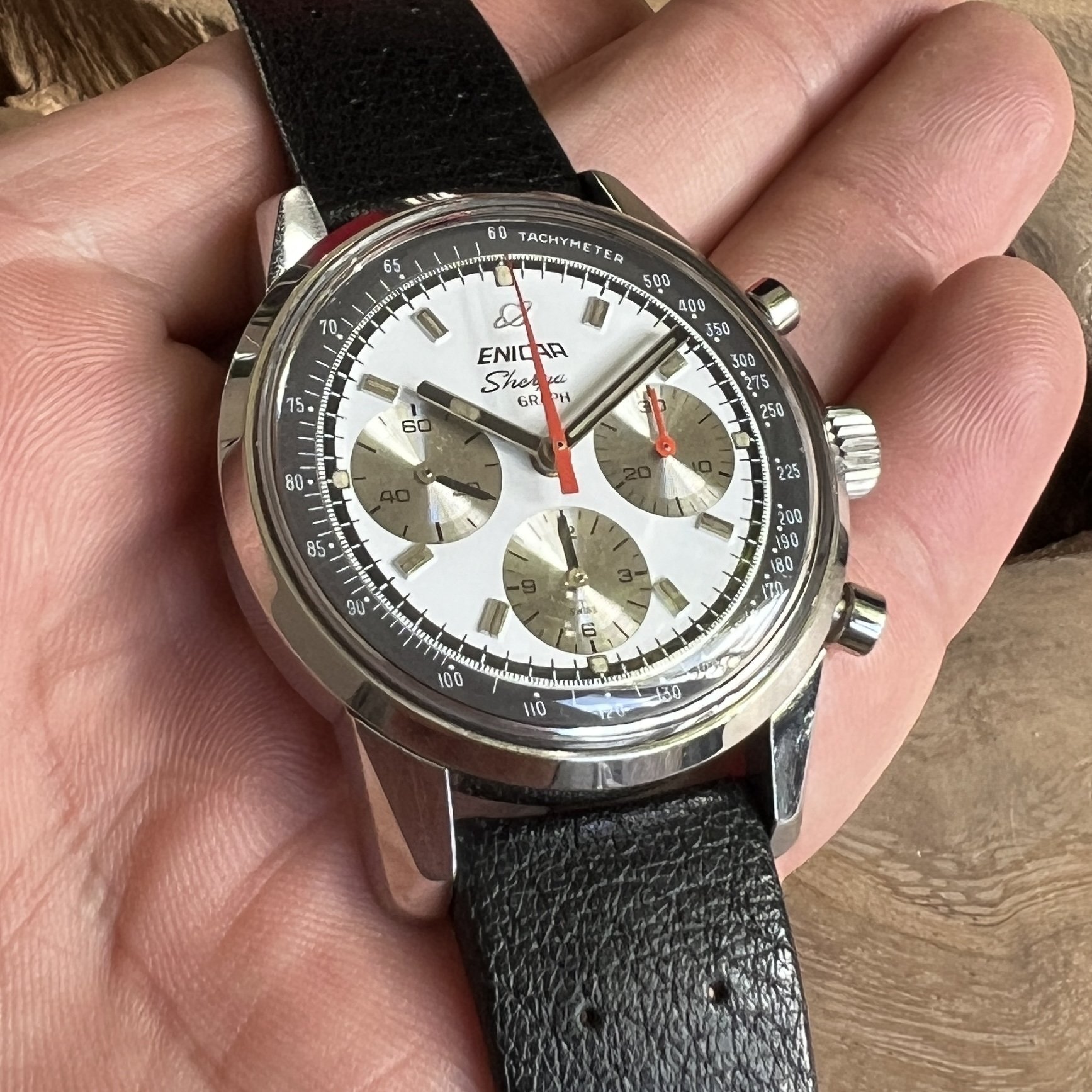 ··@SpeedyBirthYearFor sale an Enicar Sherpa Graph in amazing vintage condition. This unusual white dial Sherpa Graph must have spend a long time of its life in a drawer as its condition shows little of its life since production in approx. 1968. It pains me to let it go, but other horological priorities await. 😀