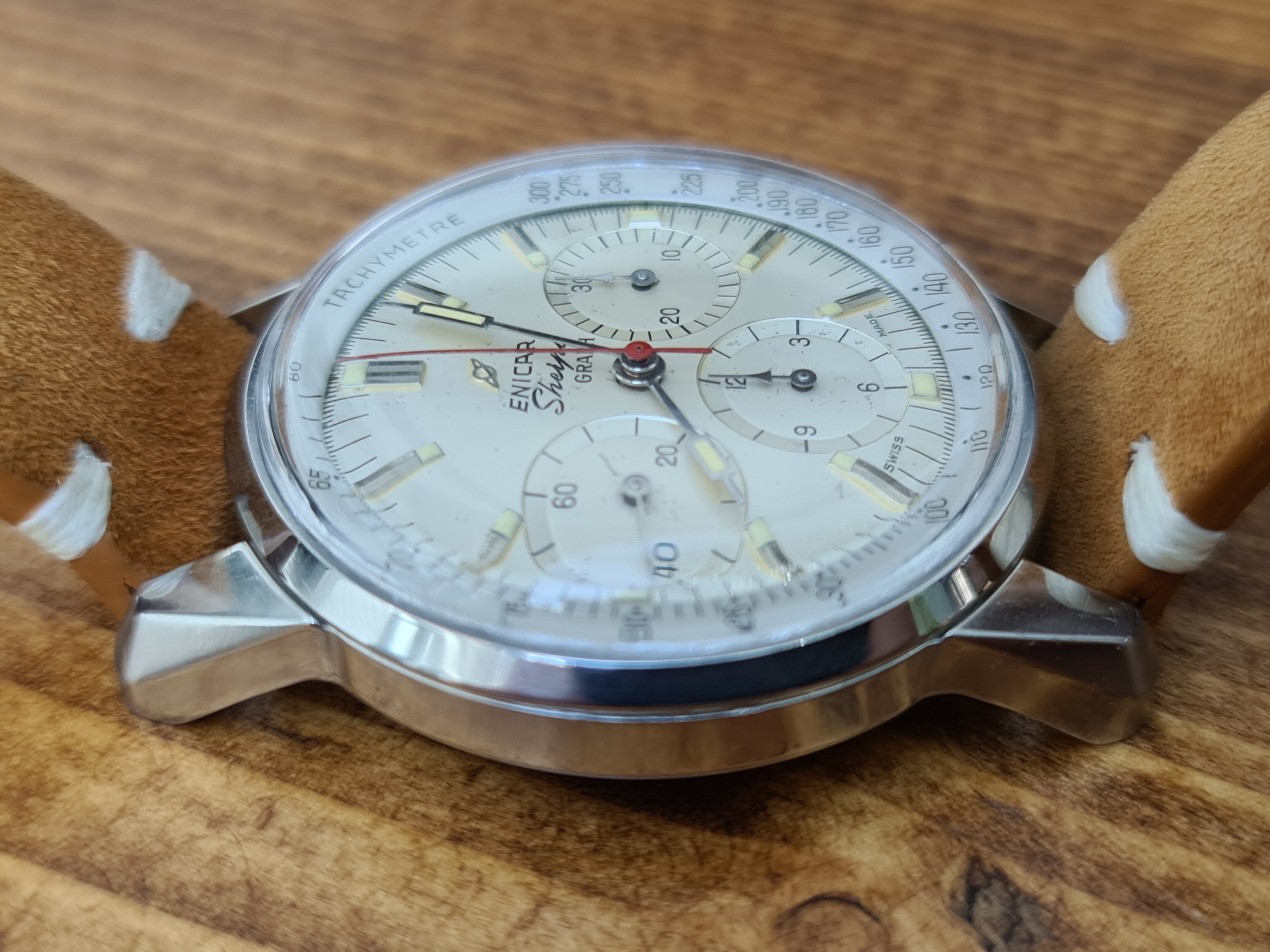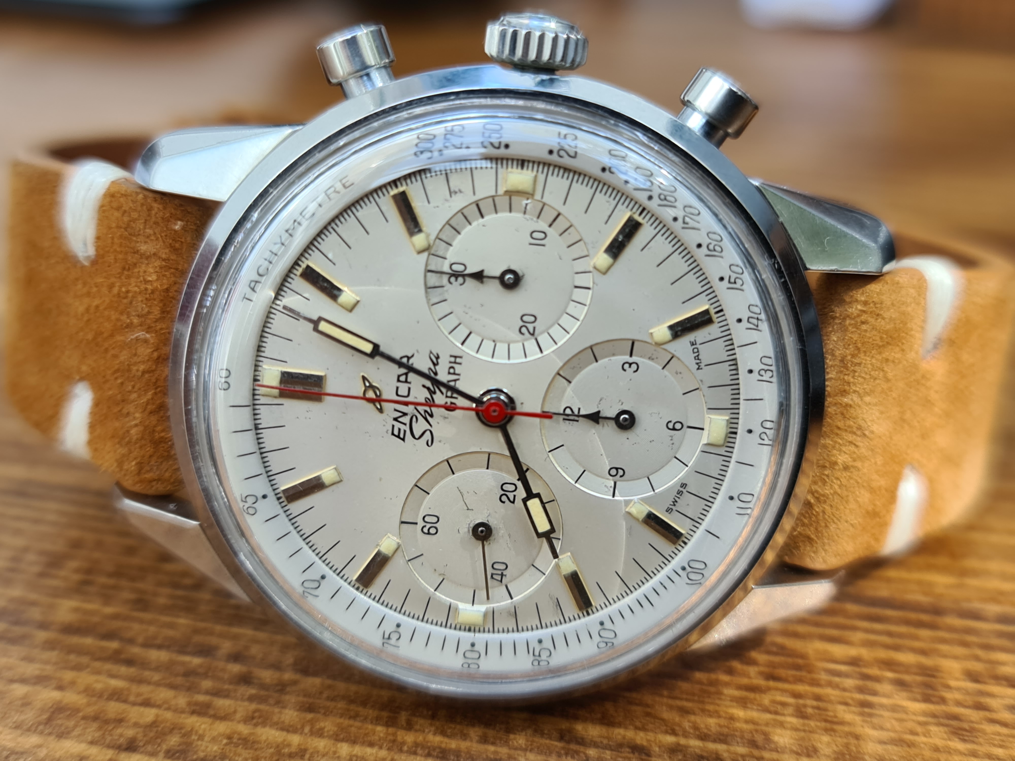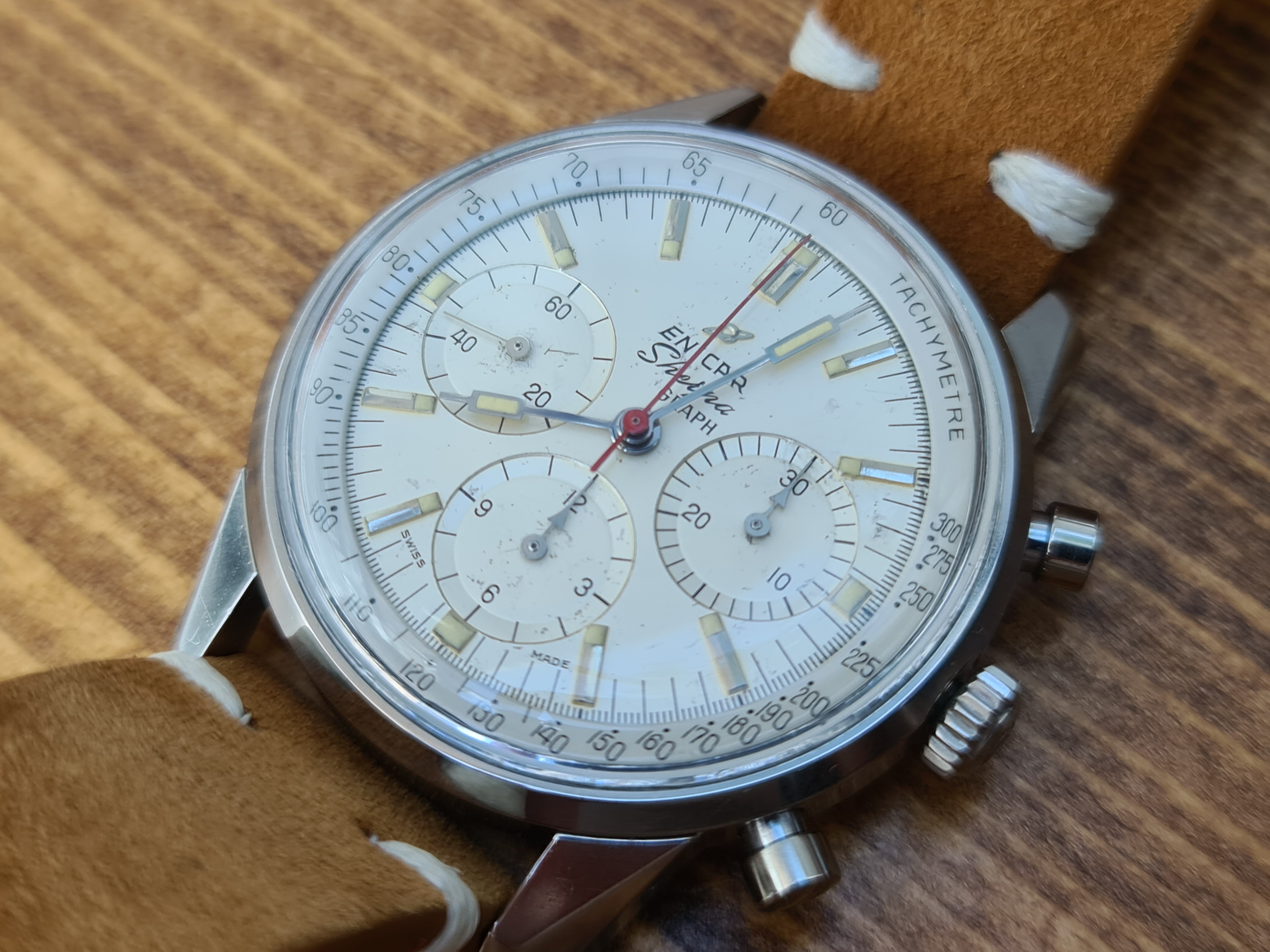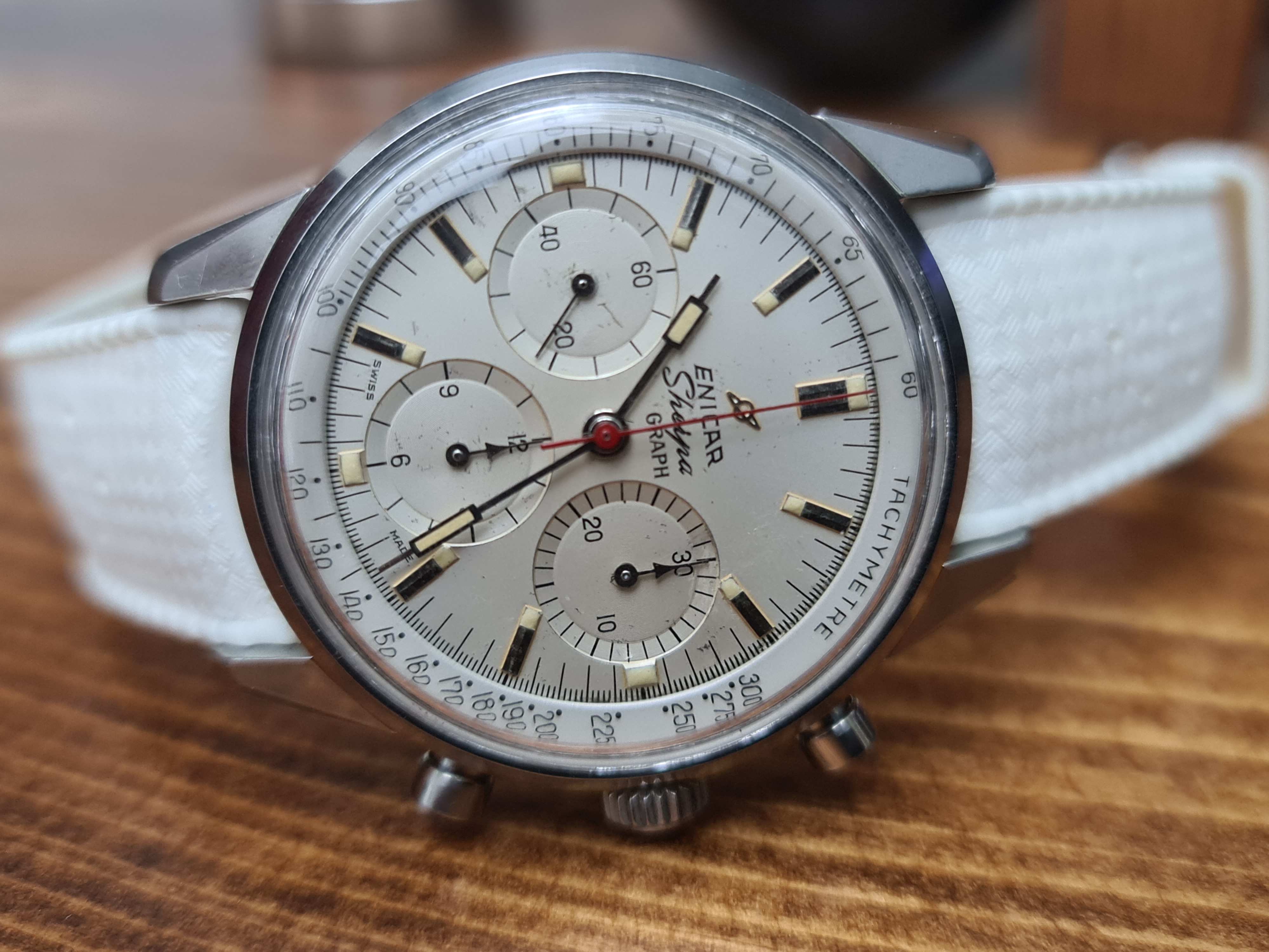 Enicar Sherpa Graph Mark 1d with the highly venerated Valjoux 72 movement. Highly sought after white dial and tachy combination with the signature red chronograph hands and arrow sub-dial hands at 12 and 3.
