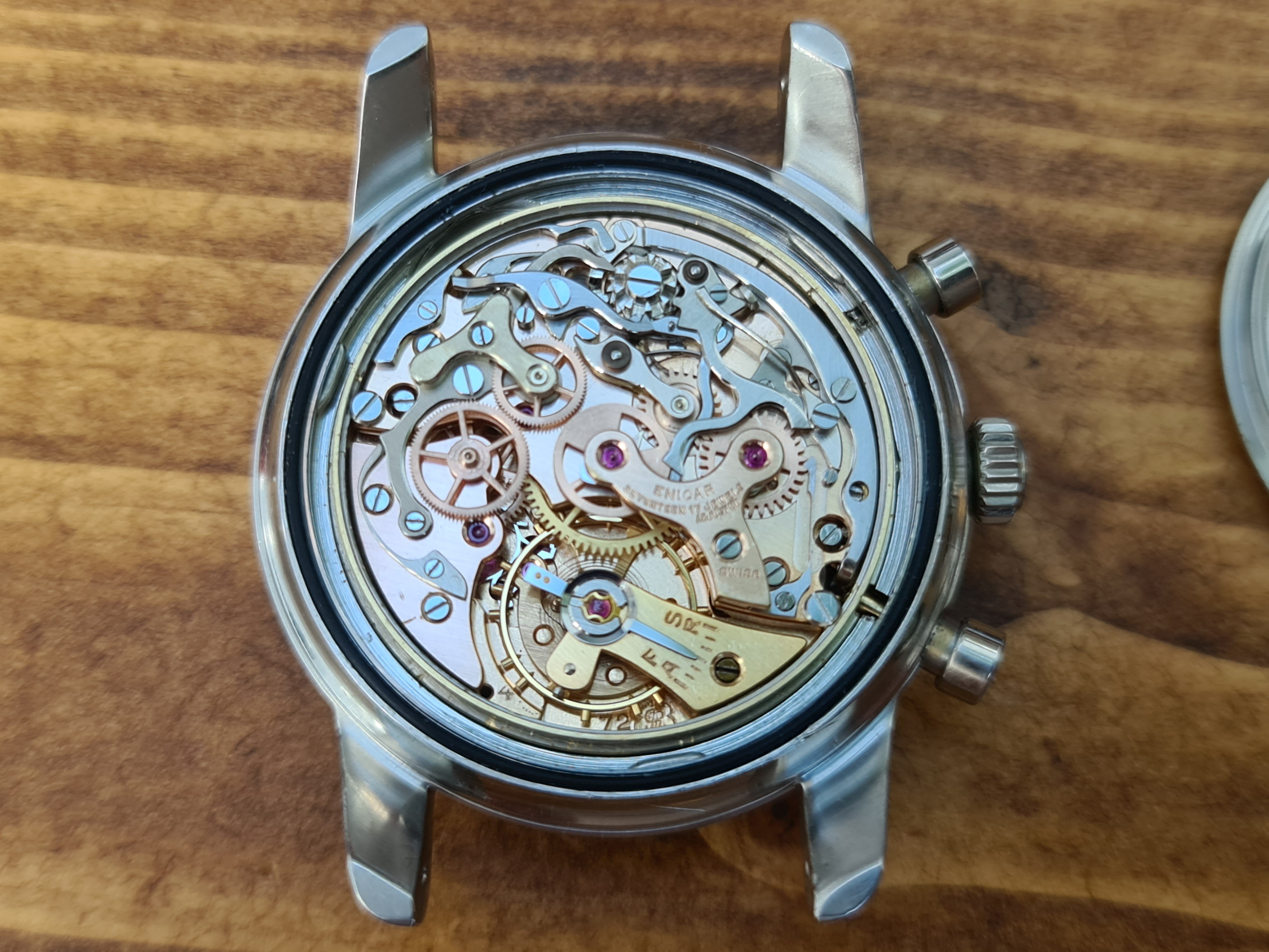 The watch is all correct and was recently serviced (July 2021) with all functions working perfectly and chrono resetting crisply. The case is in overall very good condition with the serial number clear and showing the correct clover caseback. The dial does show some marks and was relumed with original Tritium lume by The Alchemist Relumer. Overall, it's a lovely example.