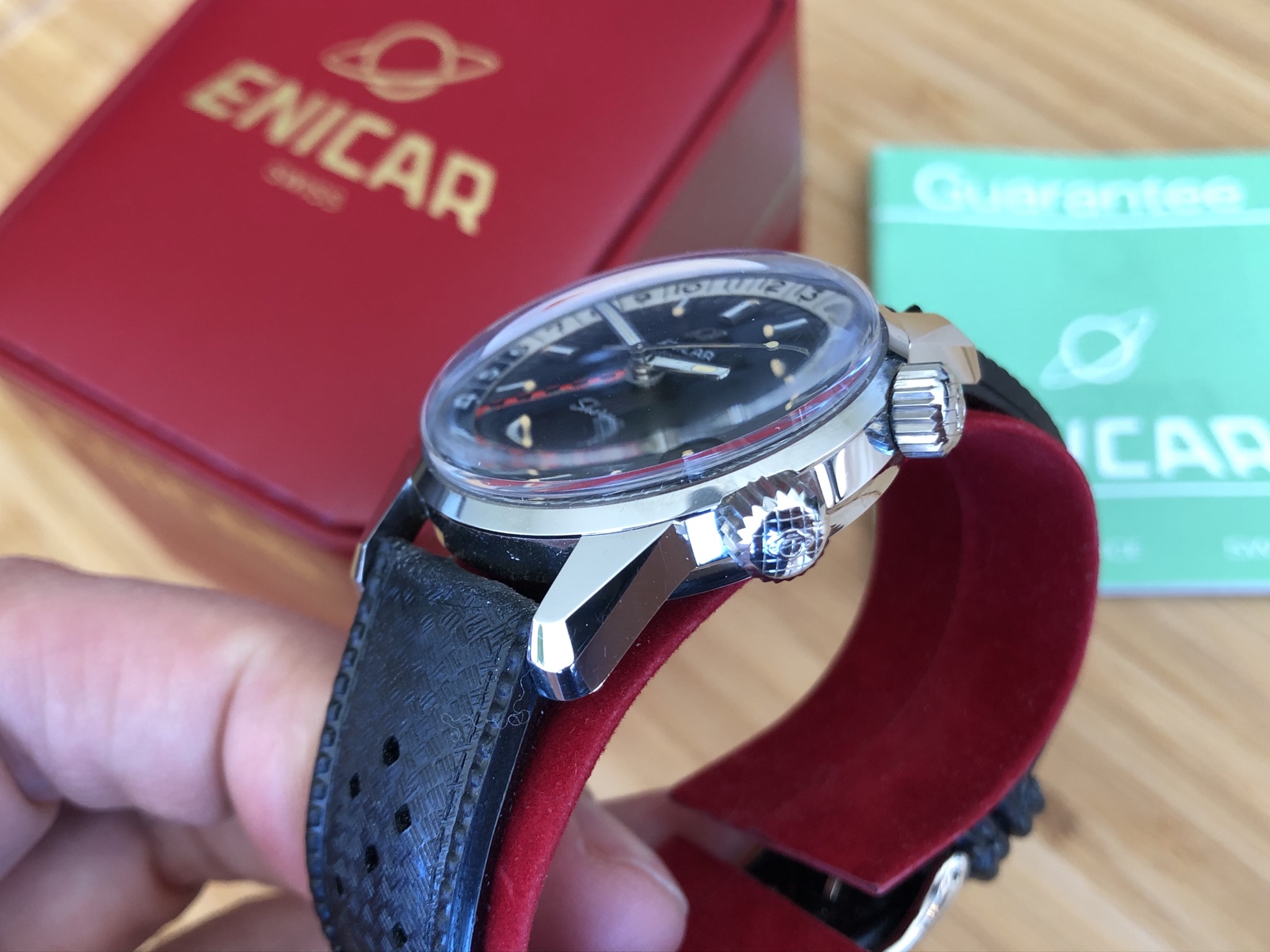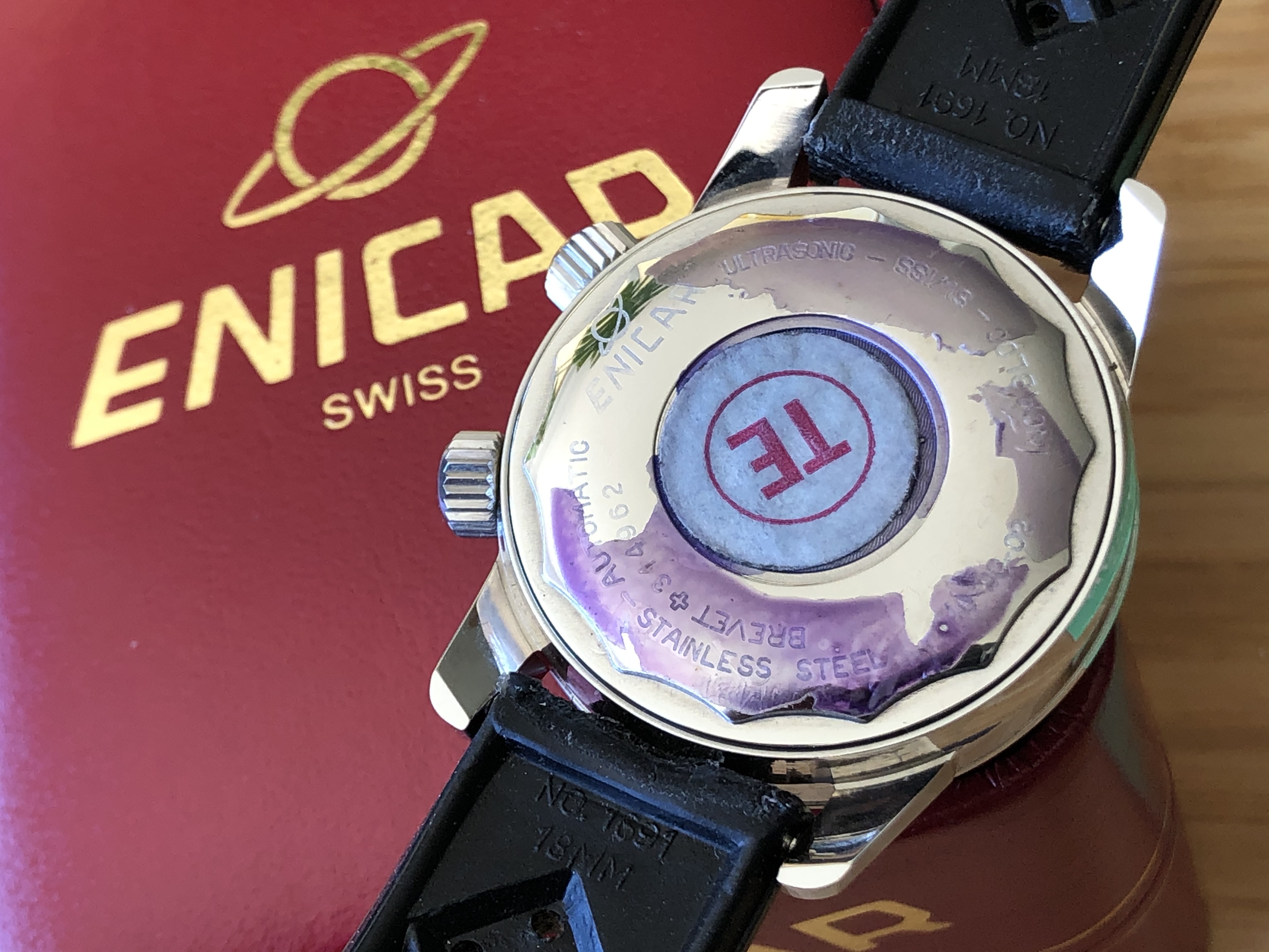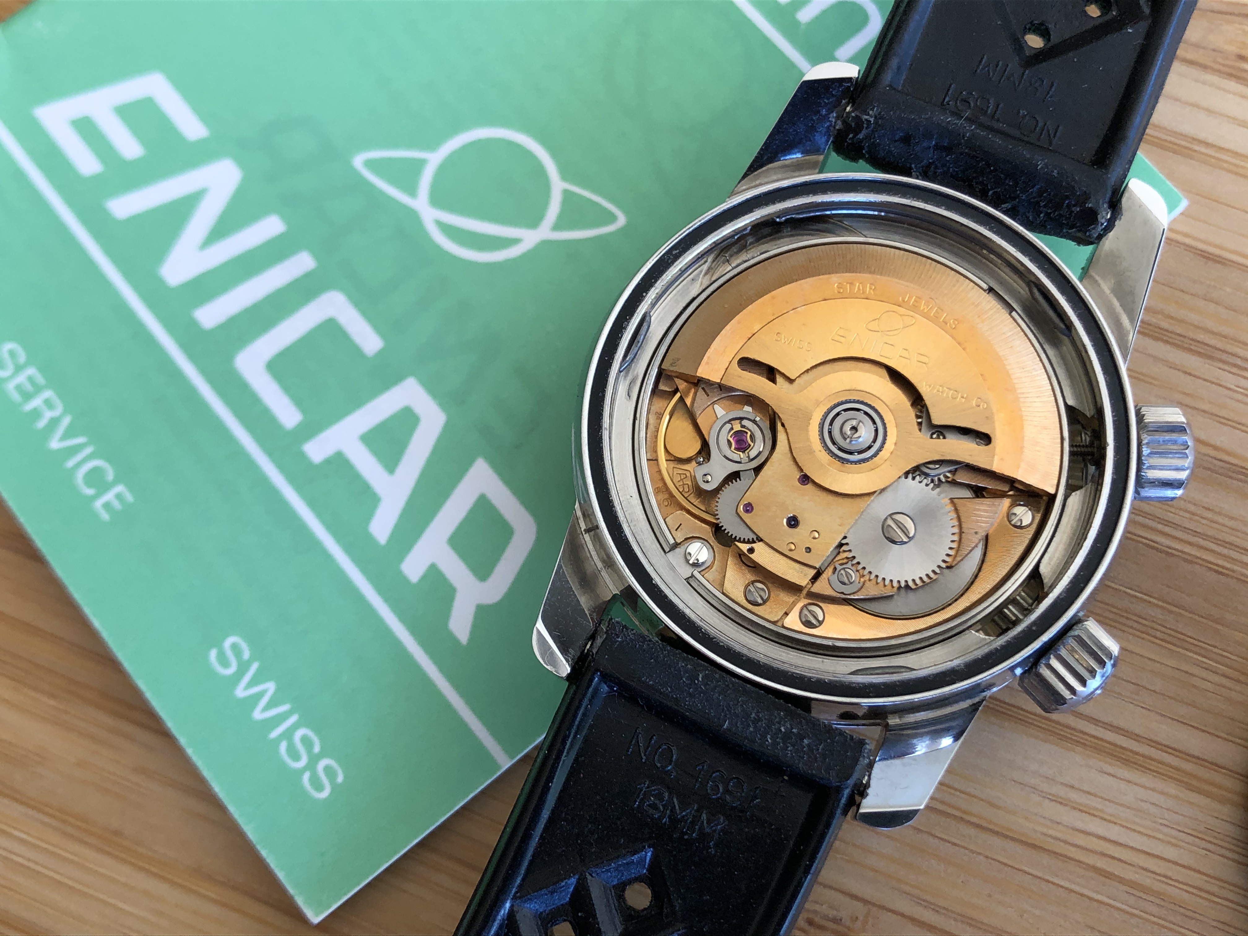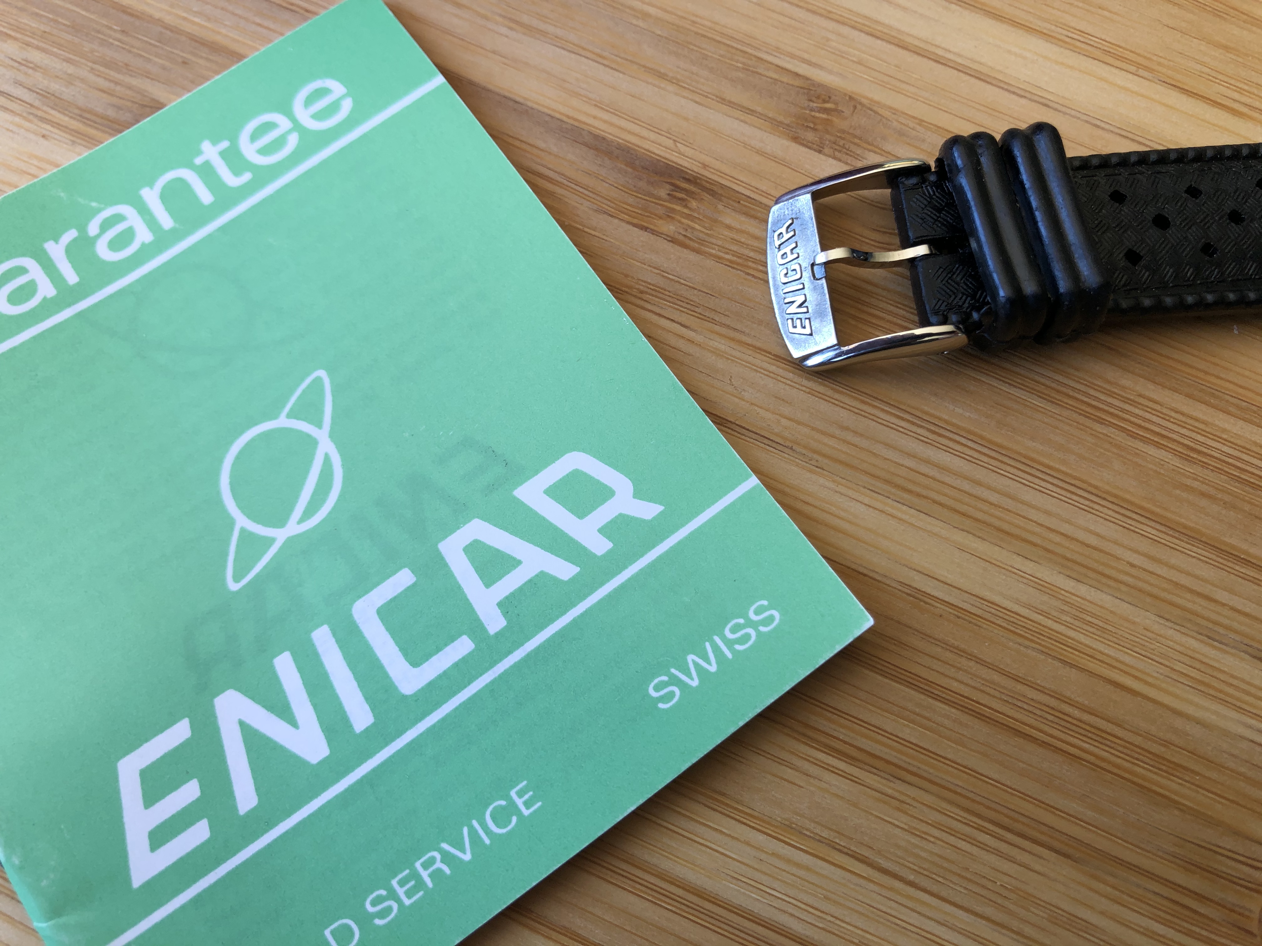A 18mm Tropic strap from the sixties is fitted with a signed Enicar stainless steel buckle.