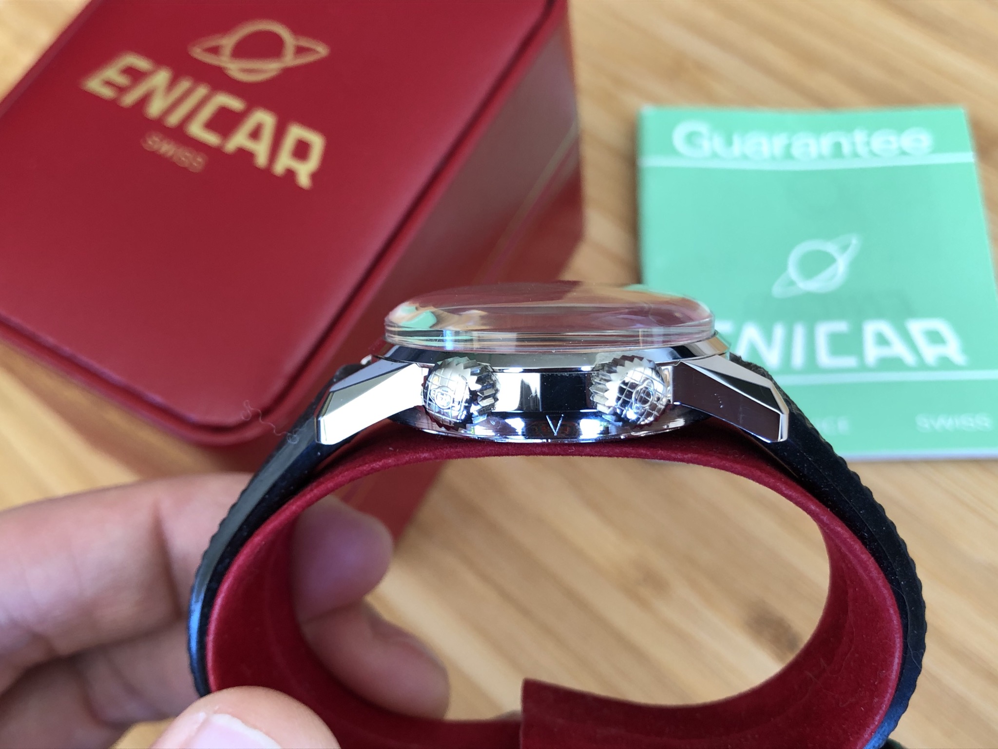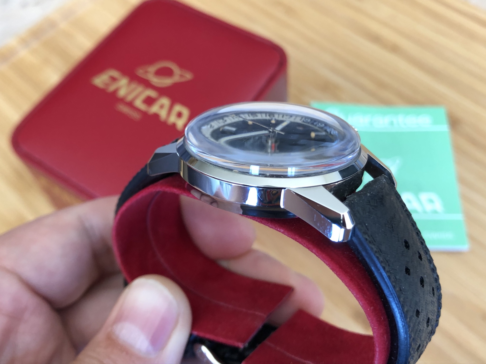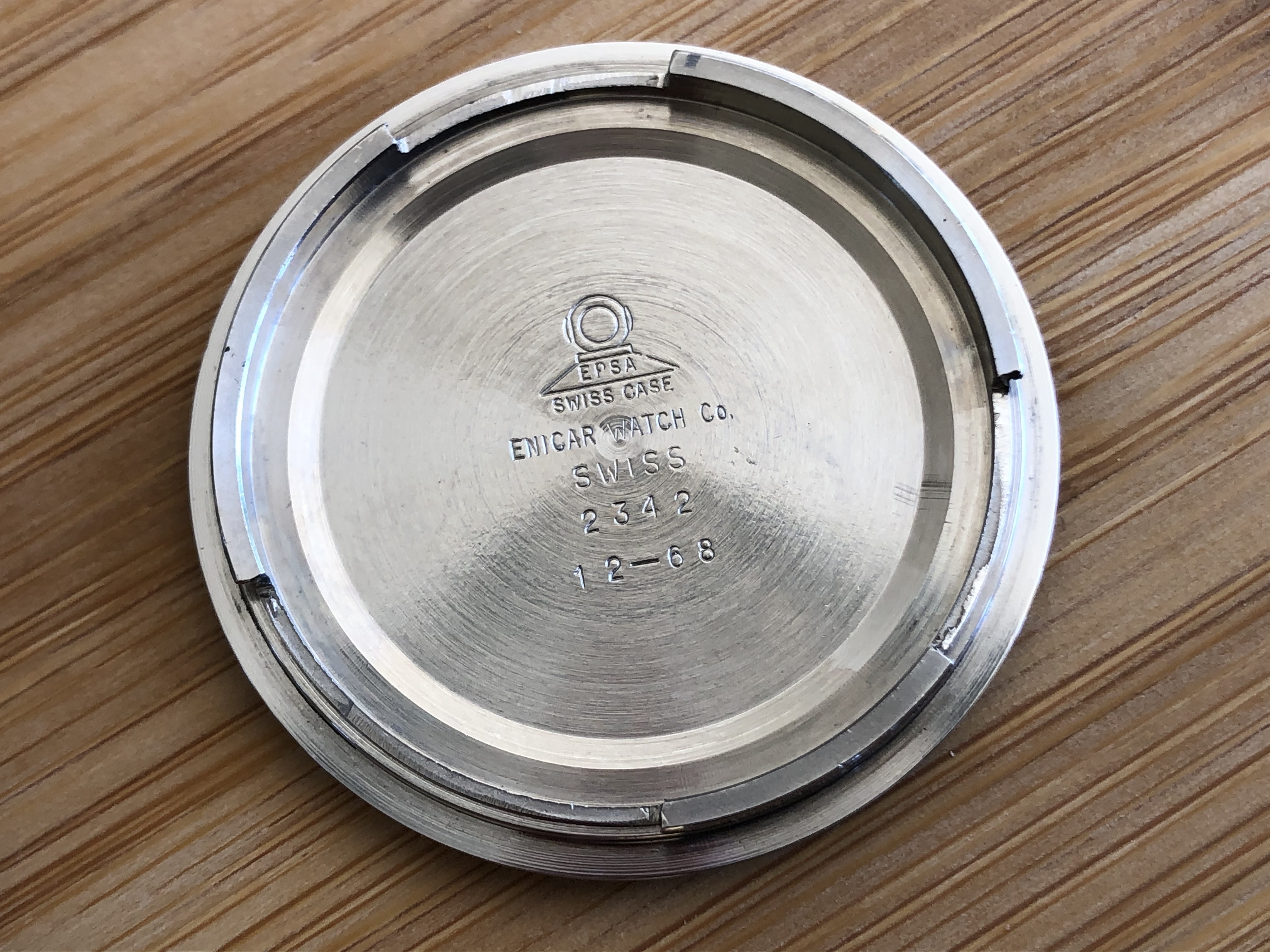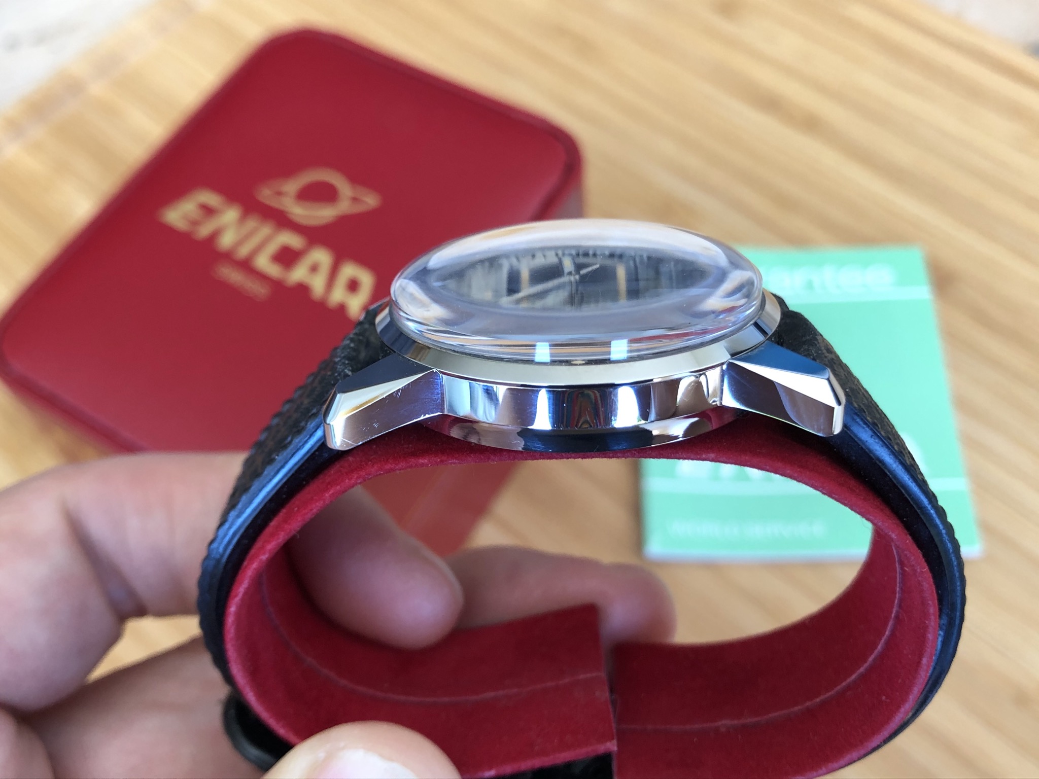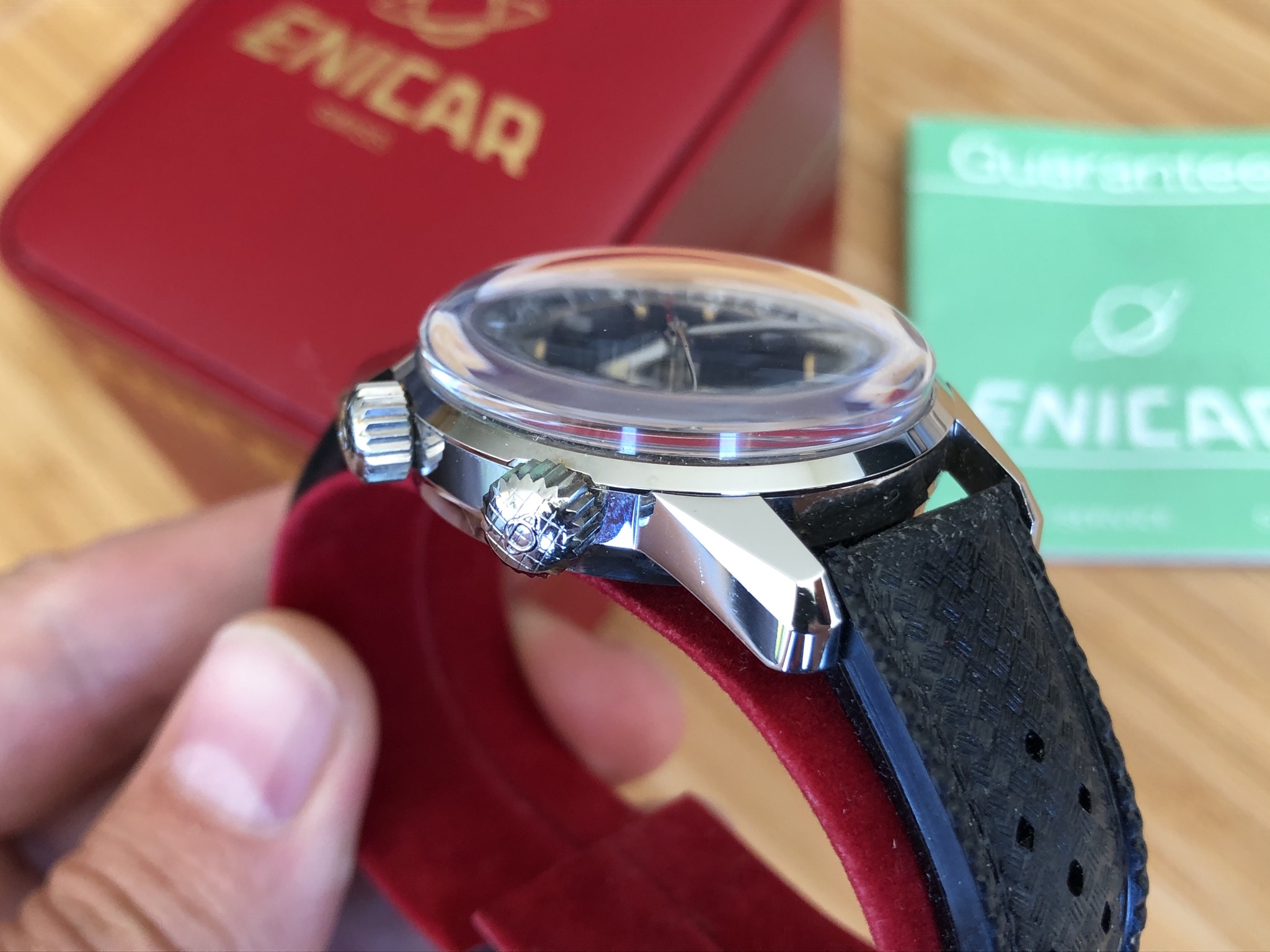 A 18mm Tropic strap from the sixties is fitted with a signed Enicar stainless steel buckle.