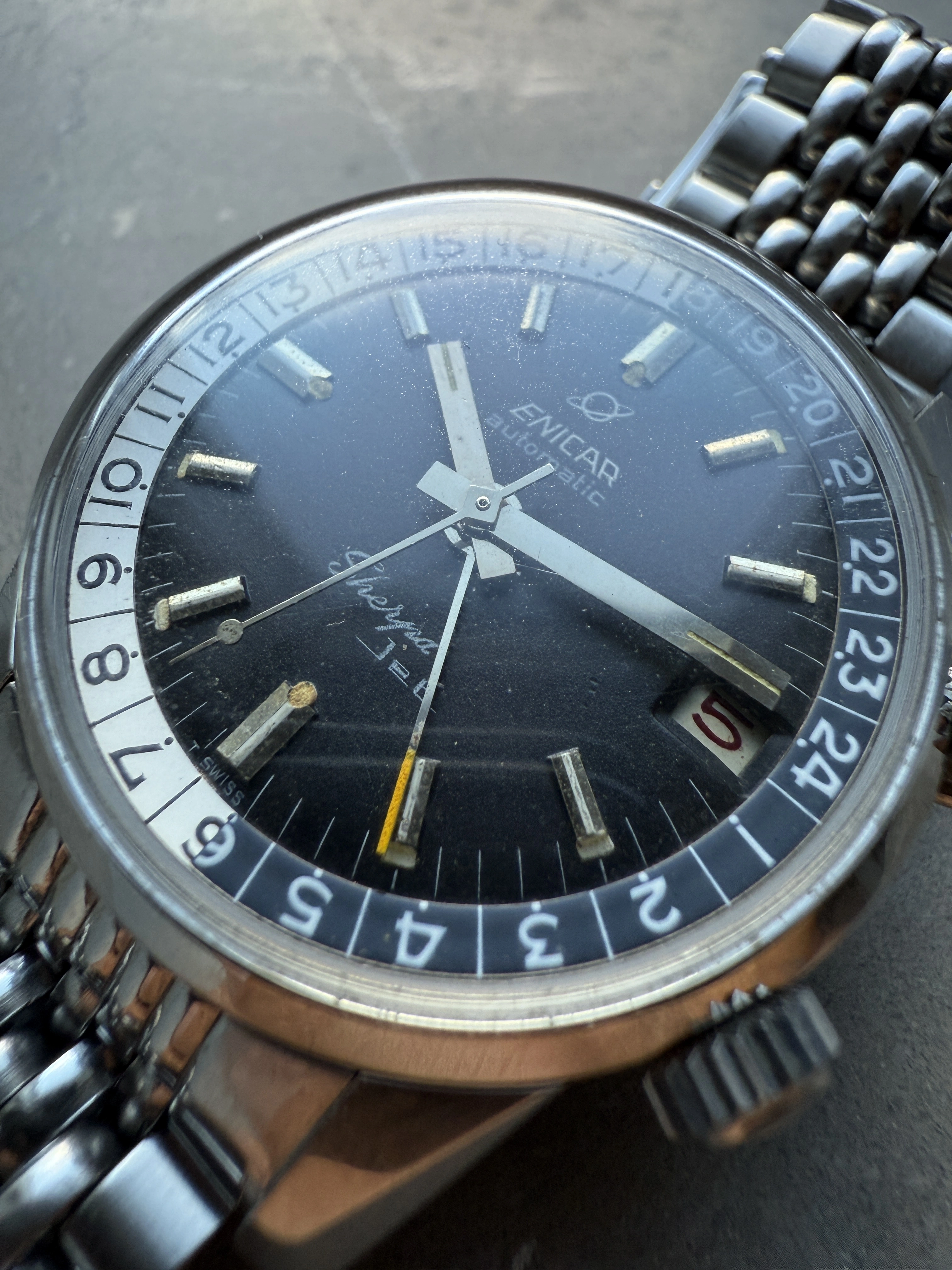 The Sherpa Jet Mk2 is one of Enicar’s most recognizable GMT models - robust, wearable, and full of vintage character. This example stands out for its originality and balanced patina, offering strong collector appeal and reliable performance despite no recent service.