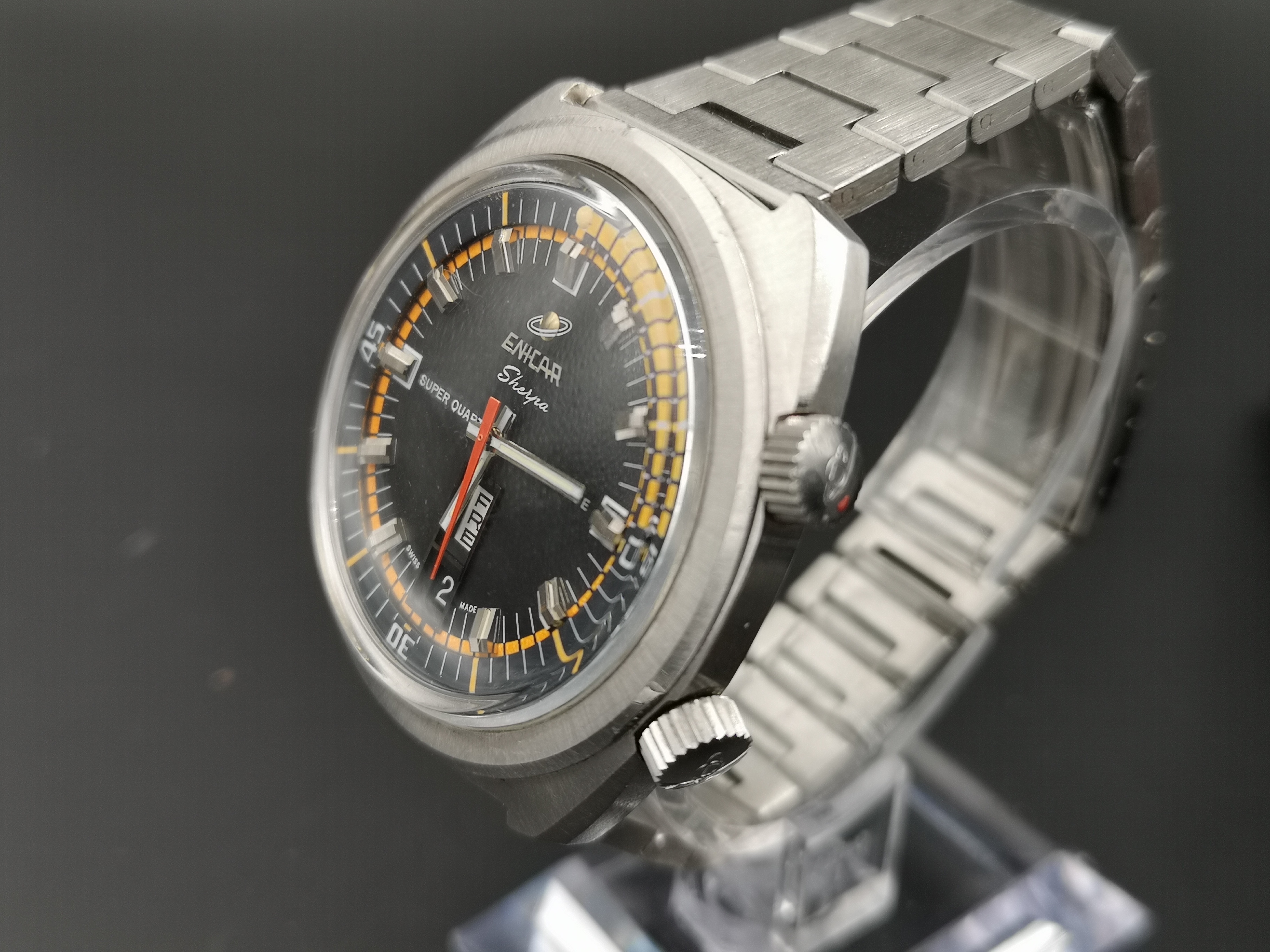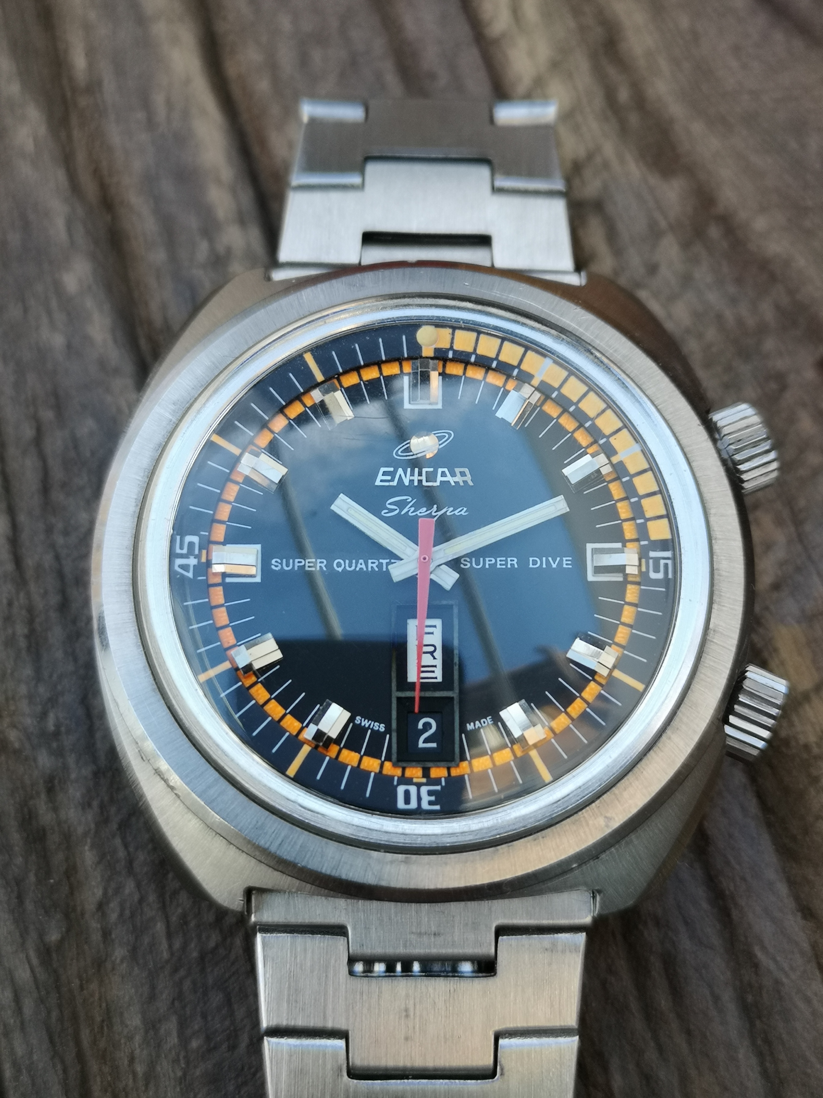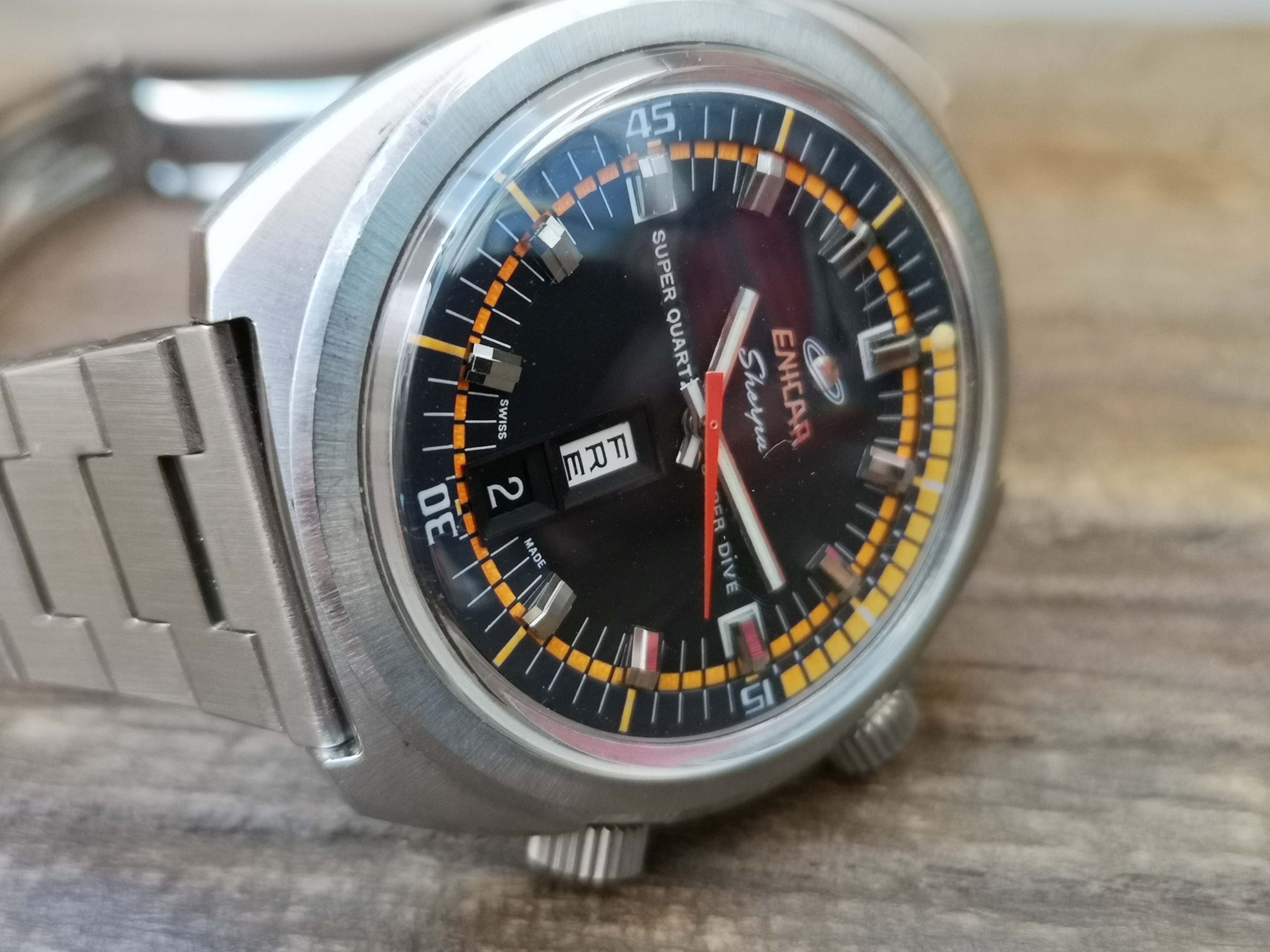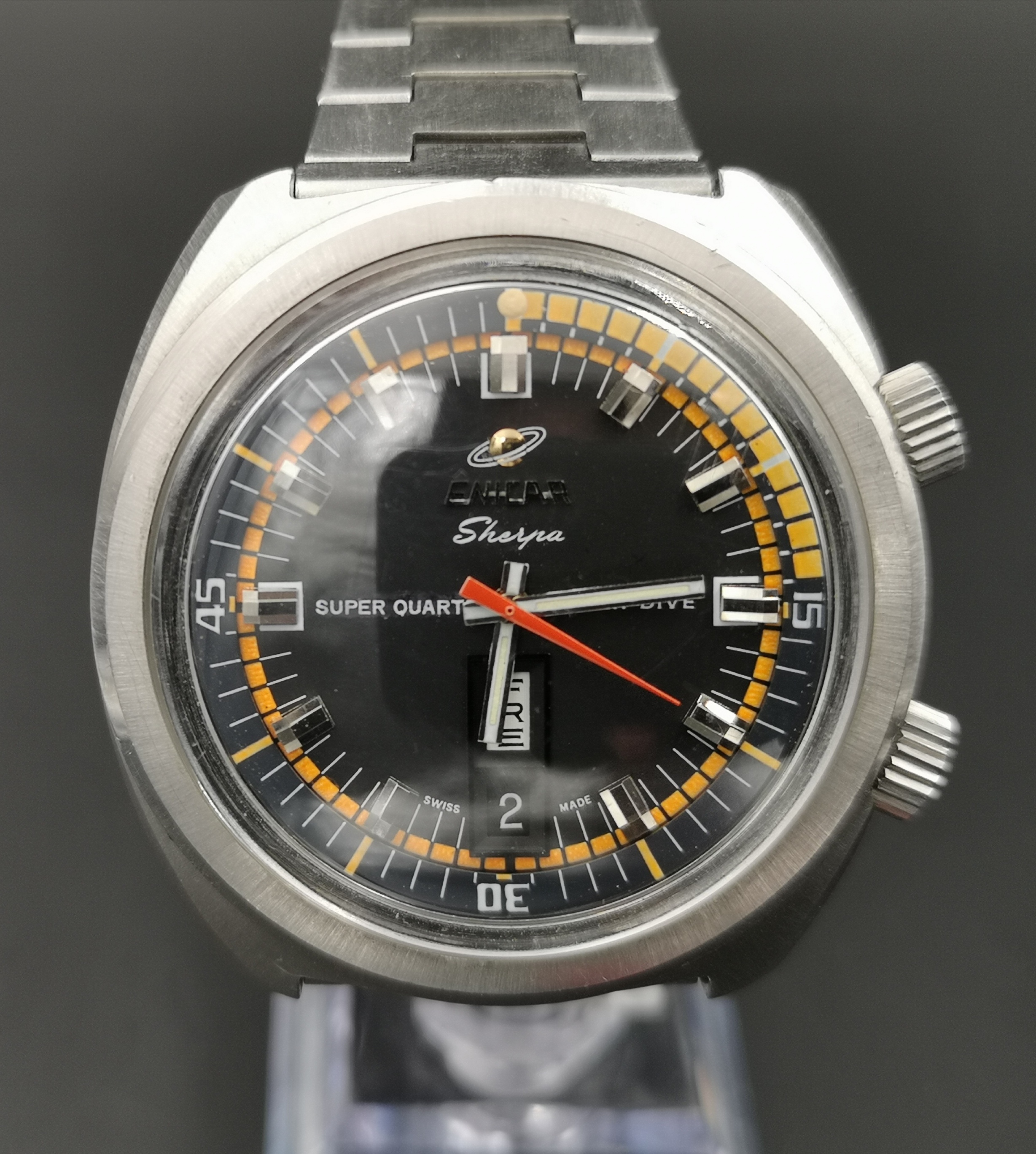 Why is it one of a kind? Have a look at the dial. Where these would normally say 'Automatic' on the dial this one says Super Quartz. A model that Enicar never released. How did the watch end up with this dial? Nobody can say for sure but Martijn van der Ven wrote a nice article about it on his blog here: https://enicar.org/2018/02/12/sherpa-super-dive-mkiii-a-quartz-that-never-happened/