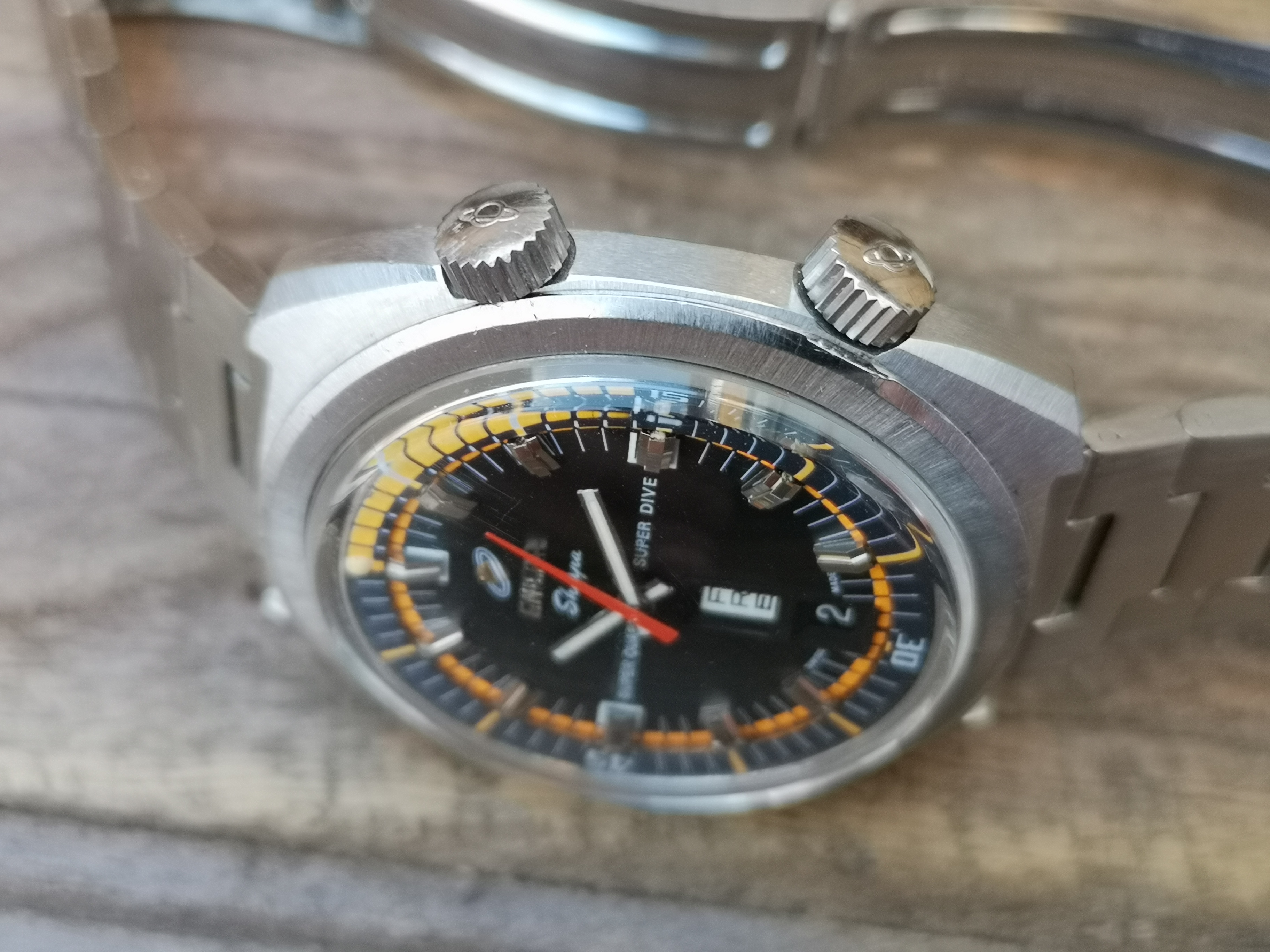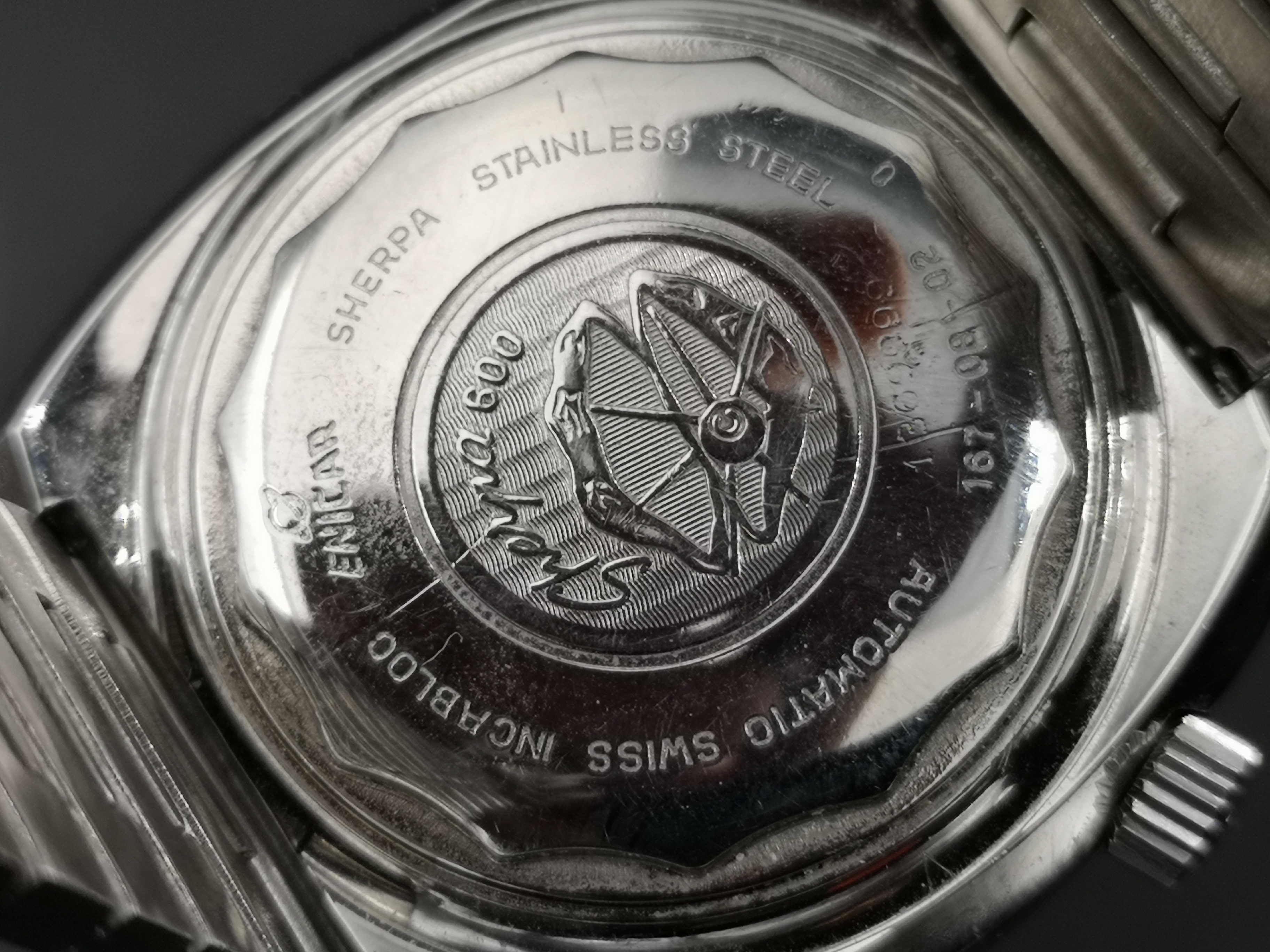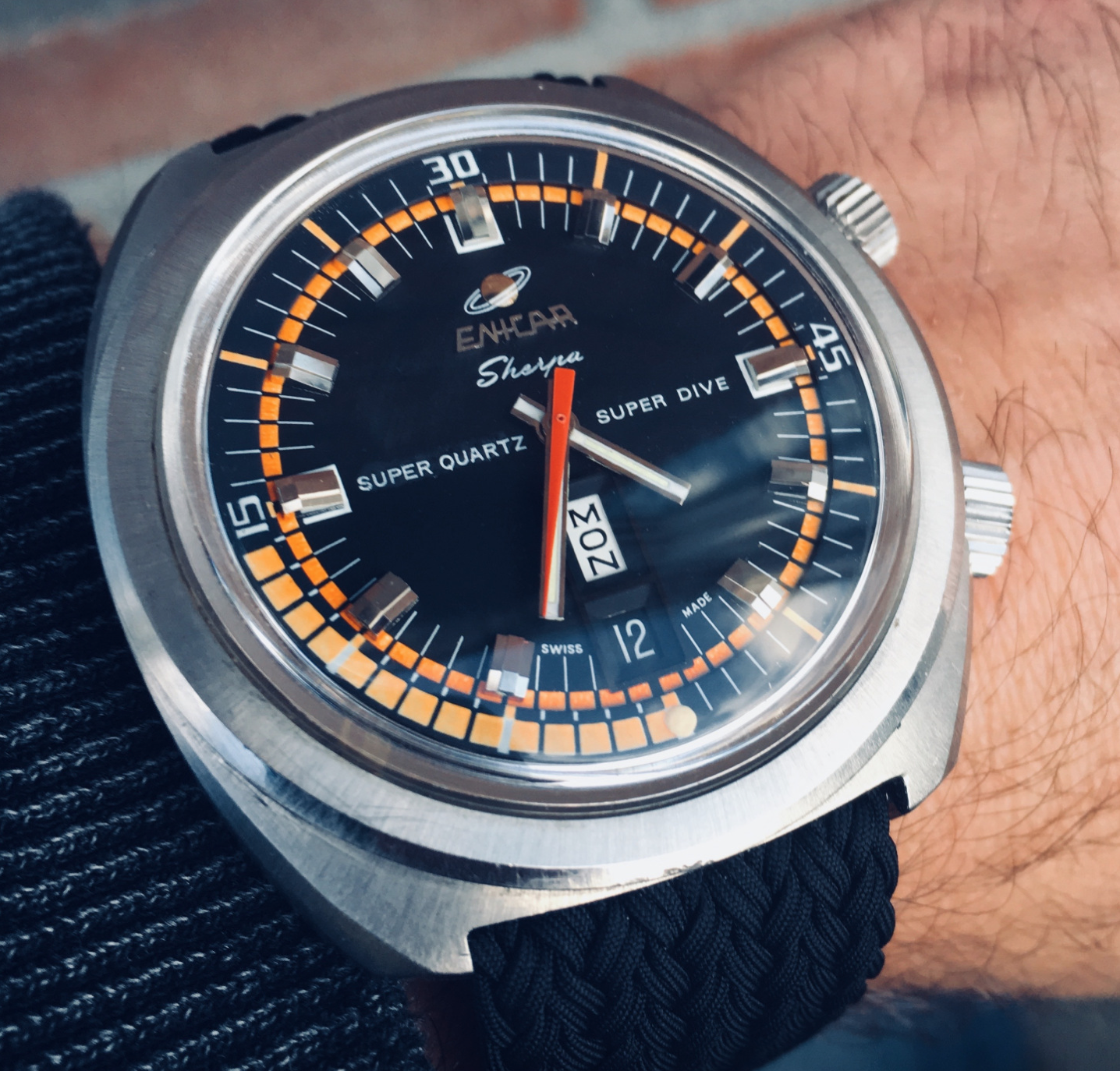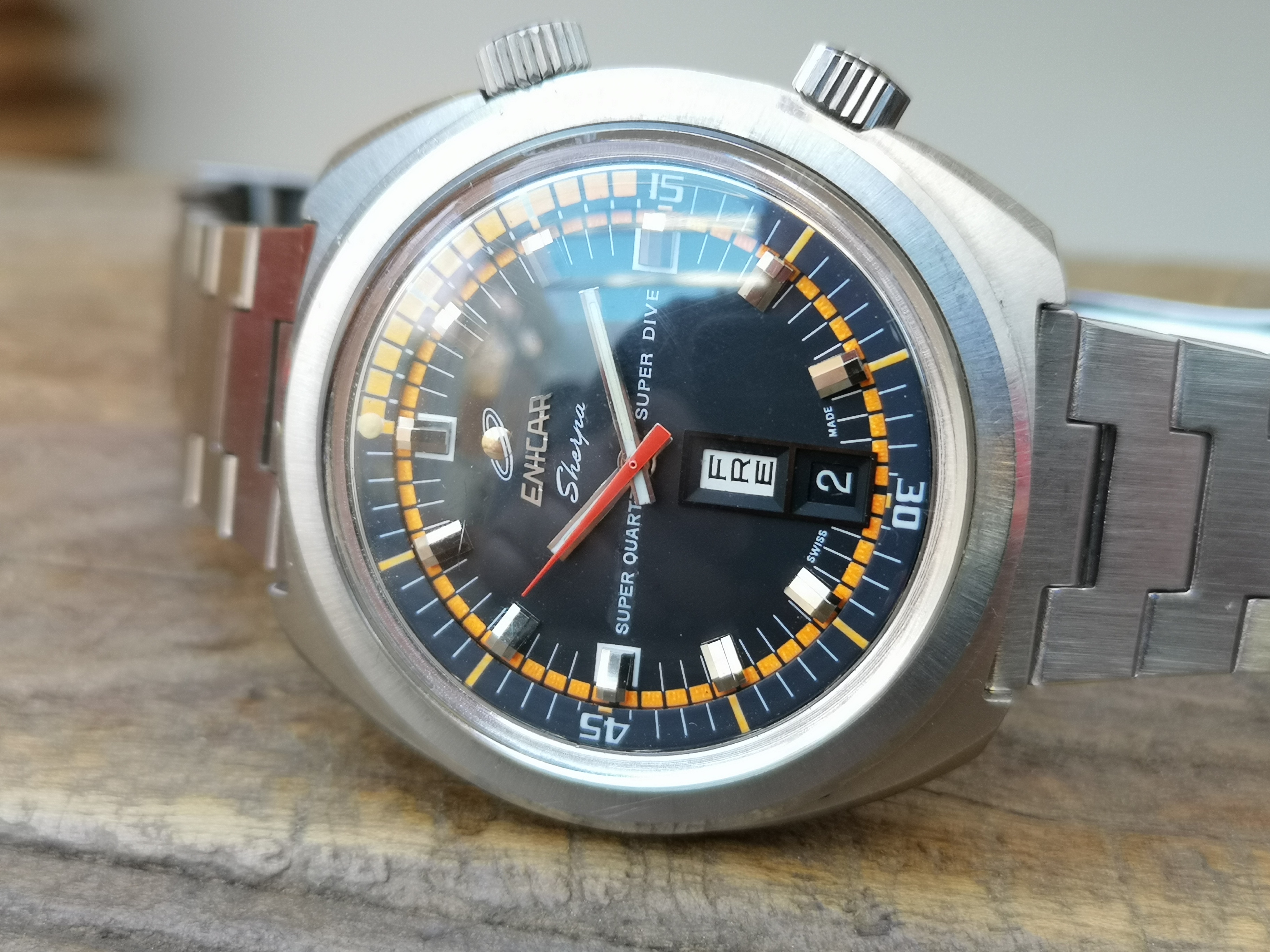 Why is it one of a kind? Have a look at the dial. Where these would normally say 'Automatic' on the dial this one says Super Quartz. A model that Enicar never released. How did the watch end up with this dial? Nobody can say for sure but Martijn van der Ven wrote a nice article about it on his blog here: https://enicar.org/2018/02/12/sherpa-super-dive-mkiii-a-quartz-that-never-happened/