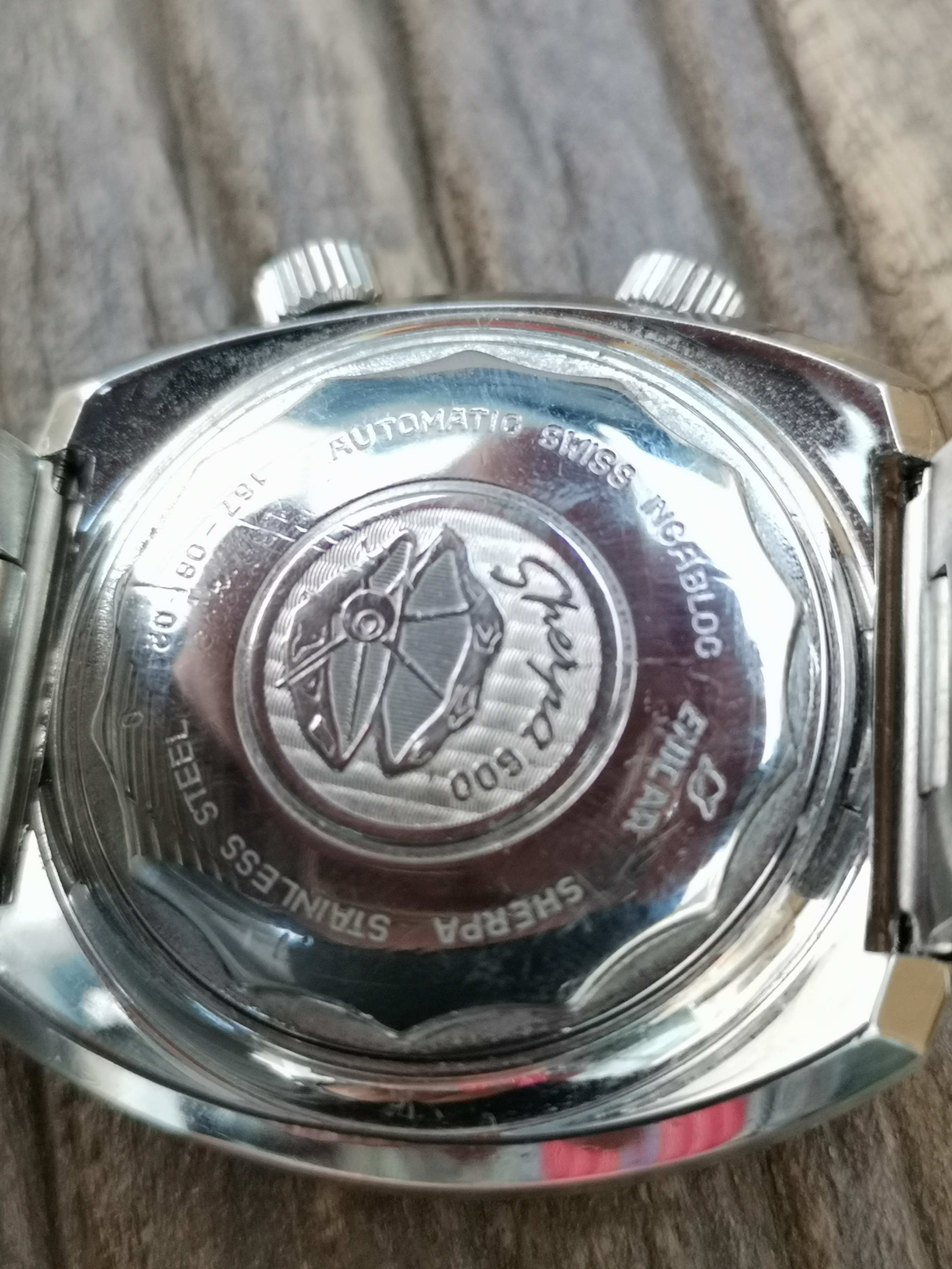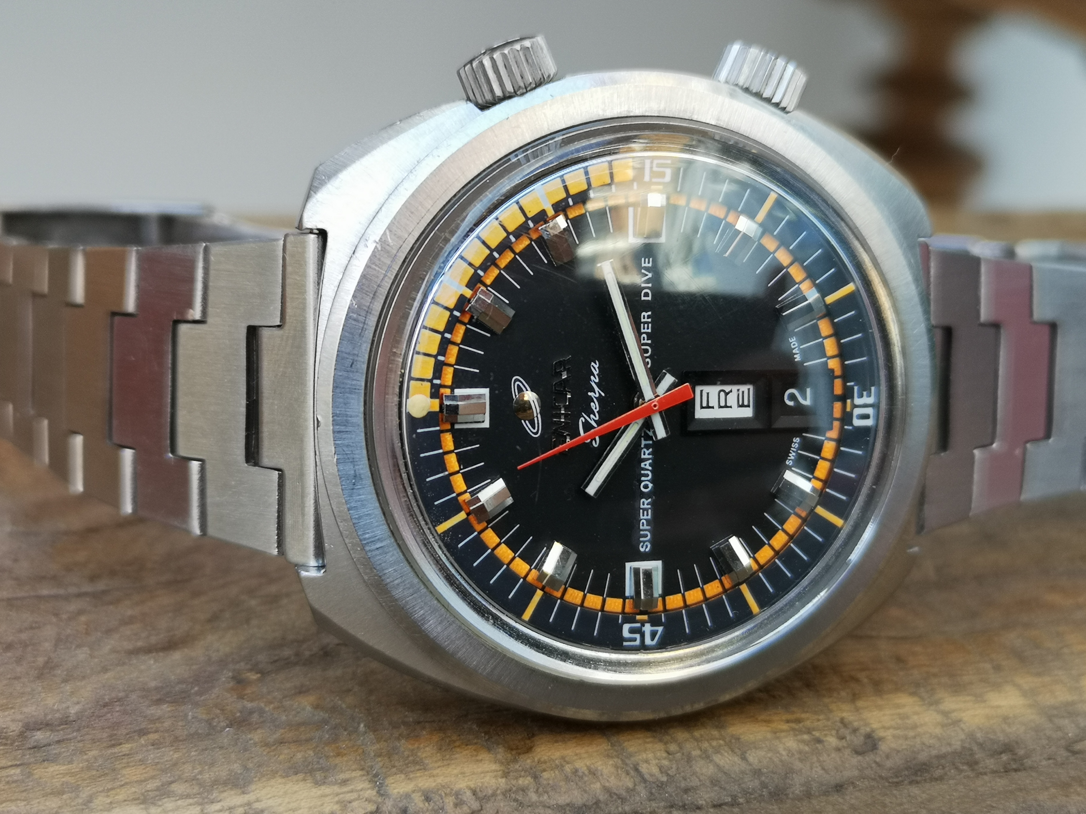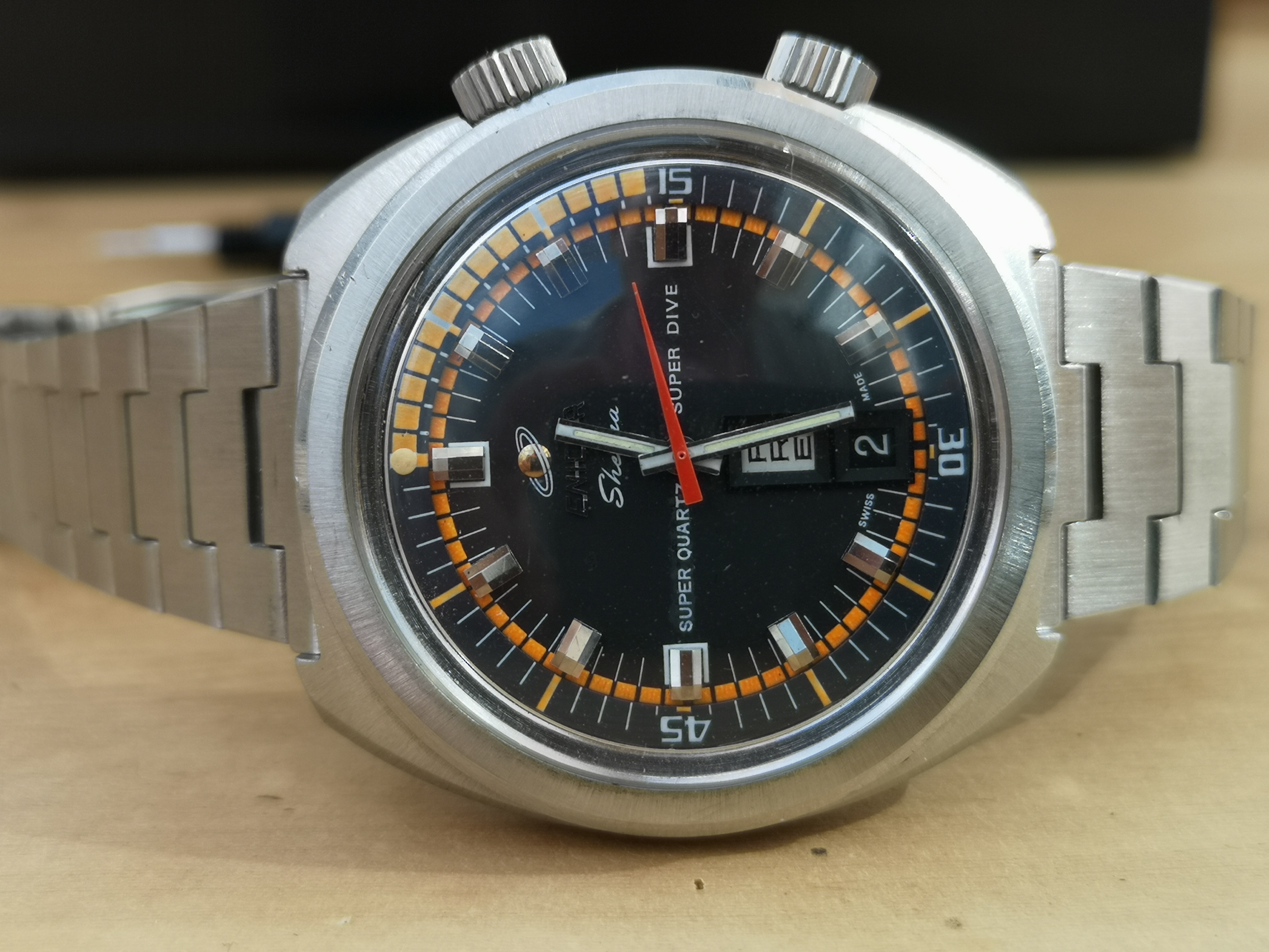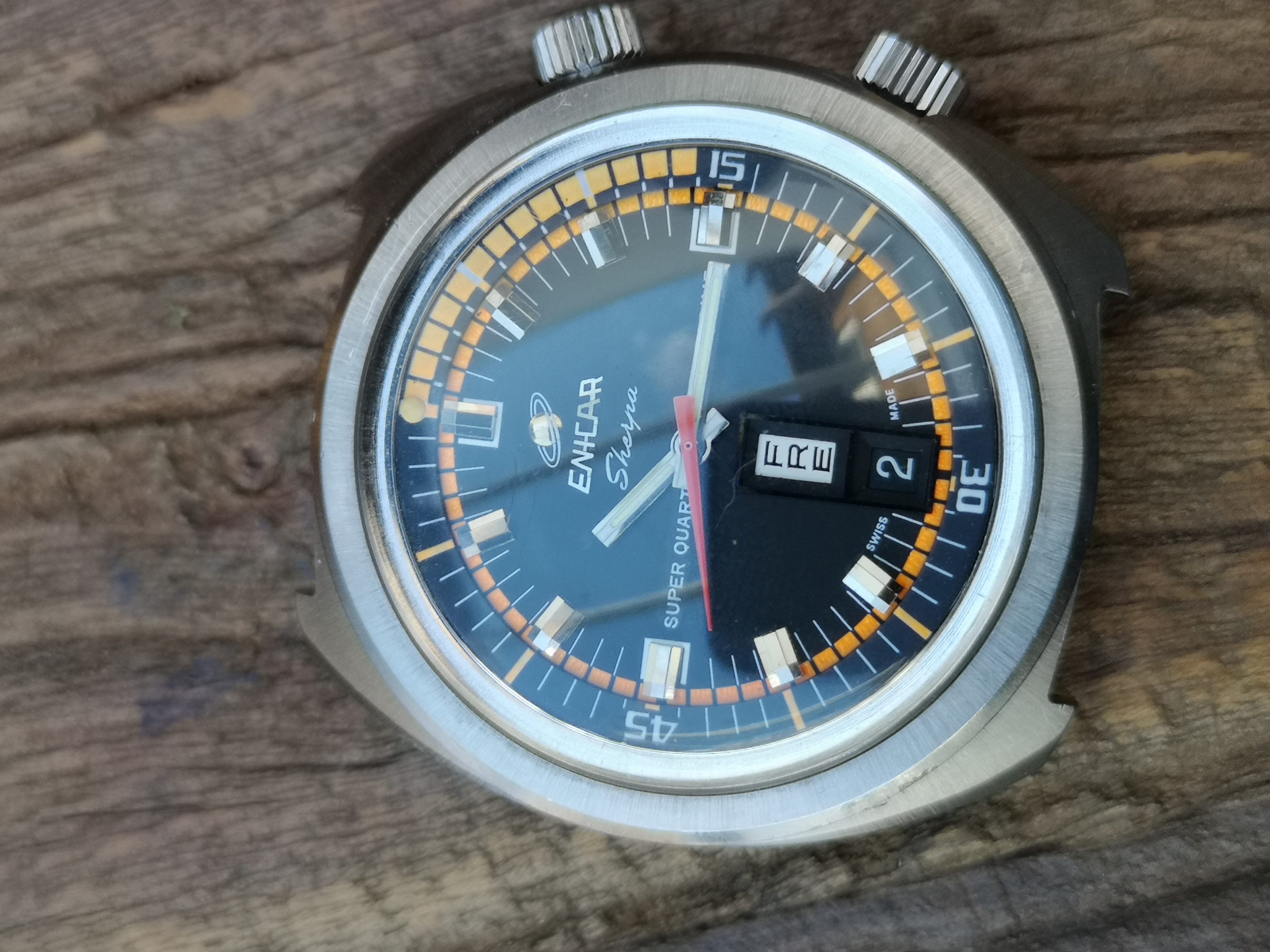 Why is it one of a kind? Have a look at the dial. Where these would normally say 'Automatic' on the dial this one says Super Quartz. A model that Enicar never released. How did the watch end up with this dial? Nobody can say for sure but Martijn van der Ven wrote a nice article about it on his blog here: https://enicar.org/2018/02/12/sherpa-super-dive-mkiii-a-quartz-that-never-happened/