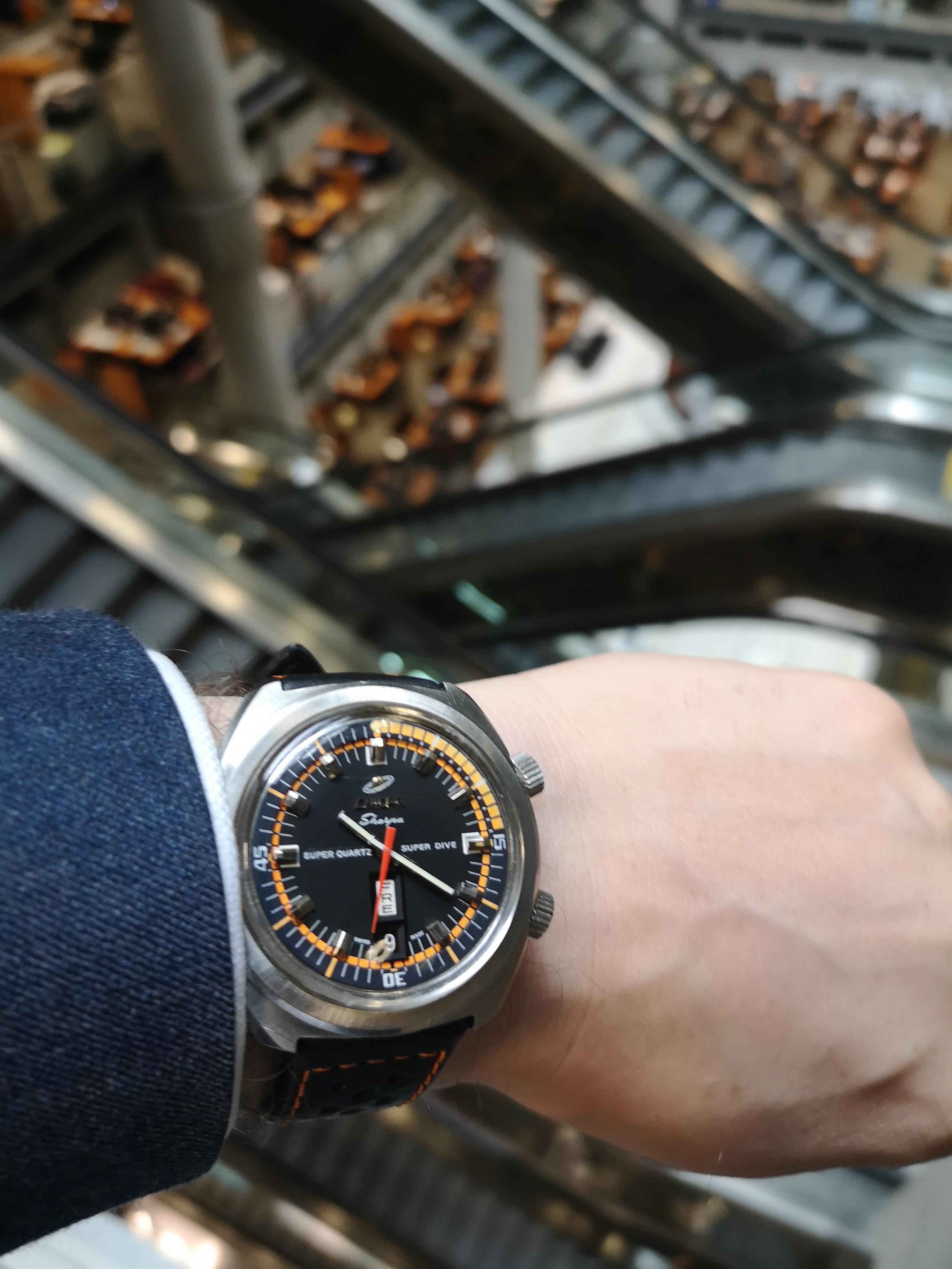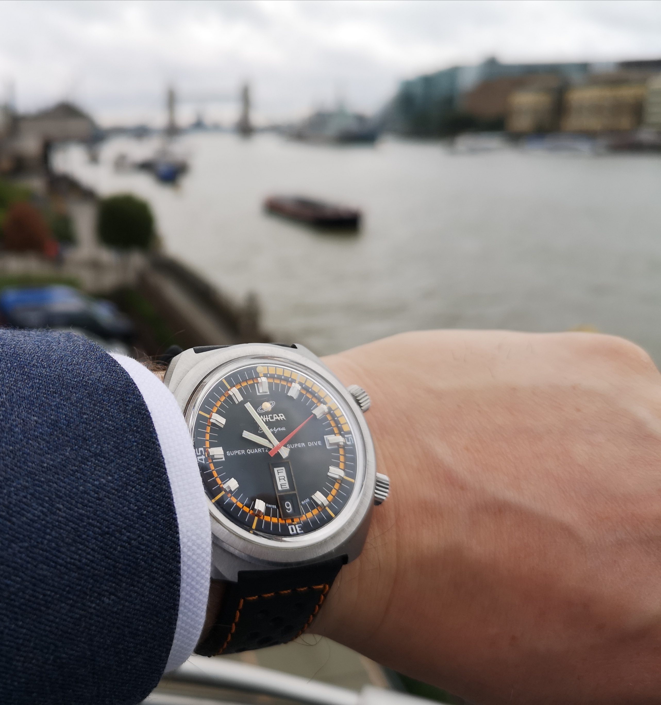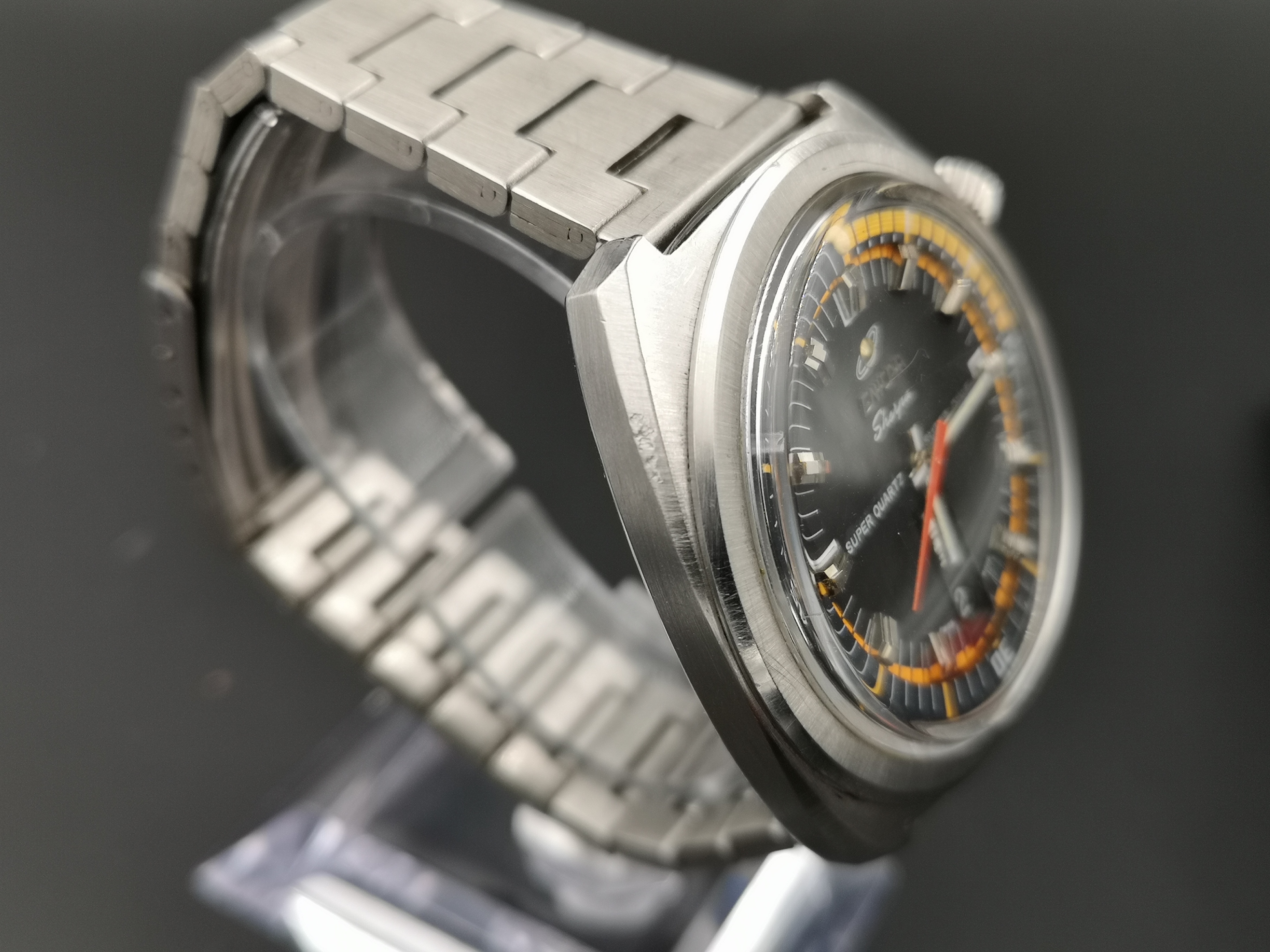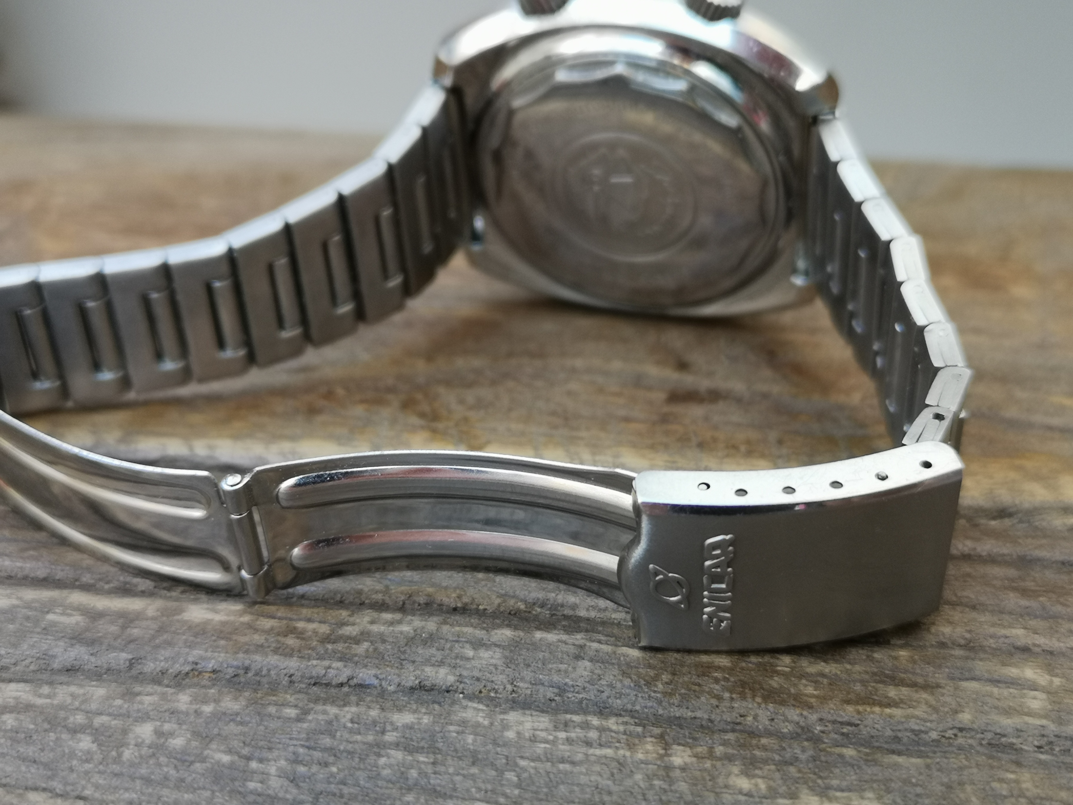 Why is it one of a kind? Have a look at the dial. Where these would normally say 'Automatic' on the dial this one says Super Quartz. A model that Enicar never released. How did the watch end up with this dial? Nobody can say for sure but Martijn van der Ven wrote a nice article about it on his blog here: https://enicar.org/2018/02/12/sherpa-super-dive-mkiii-a-quartz-that-never-happened/