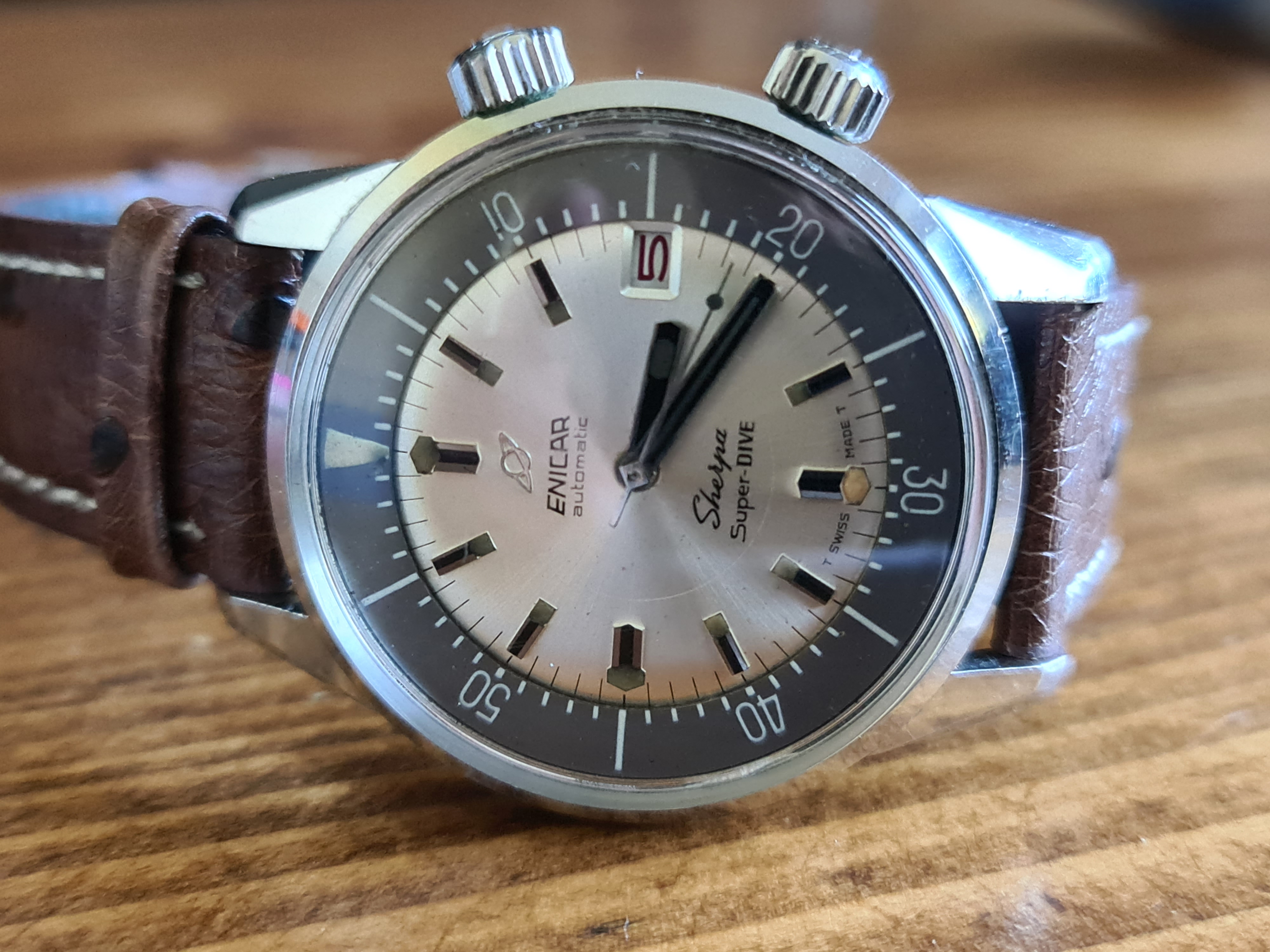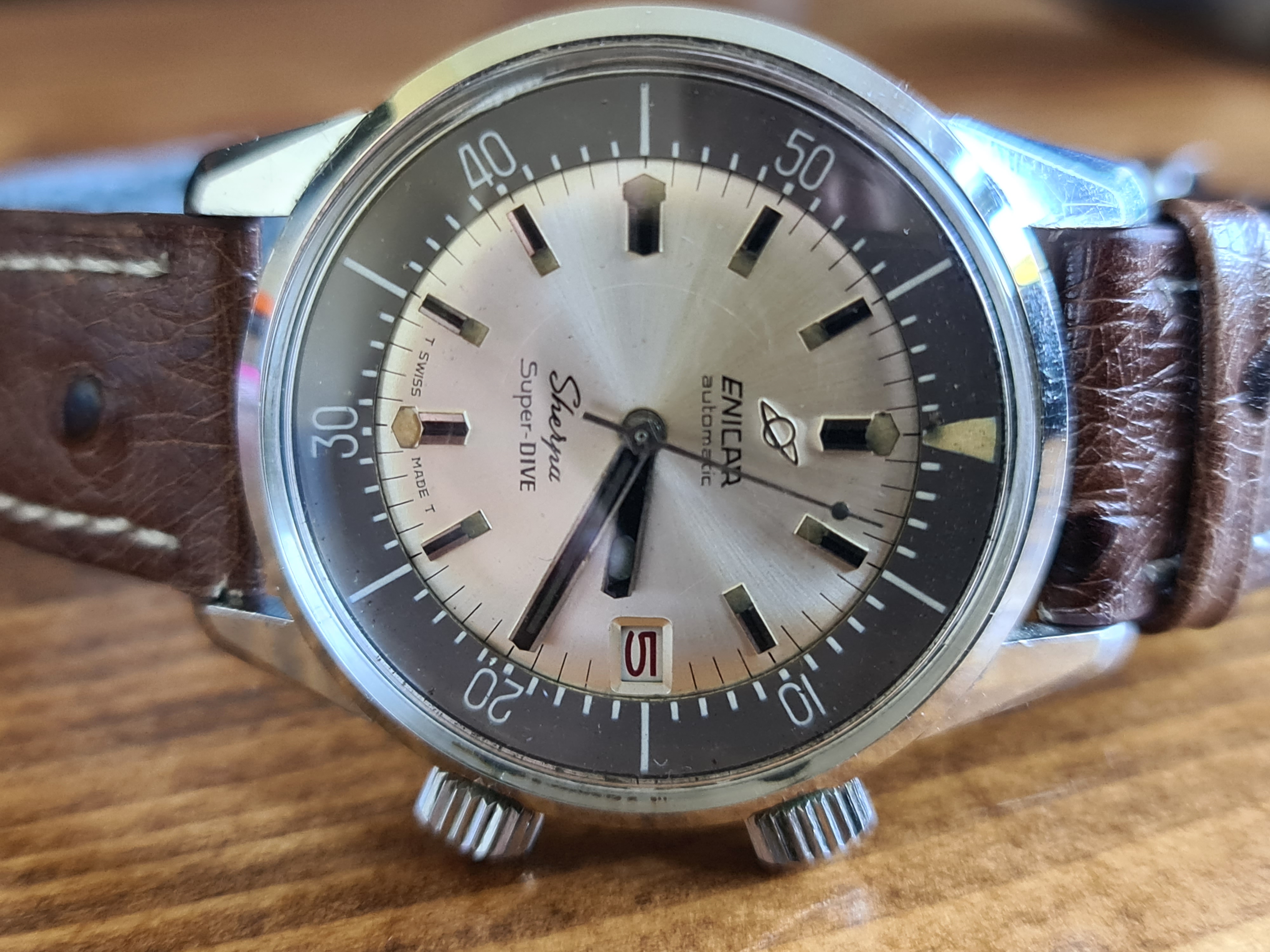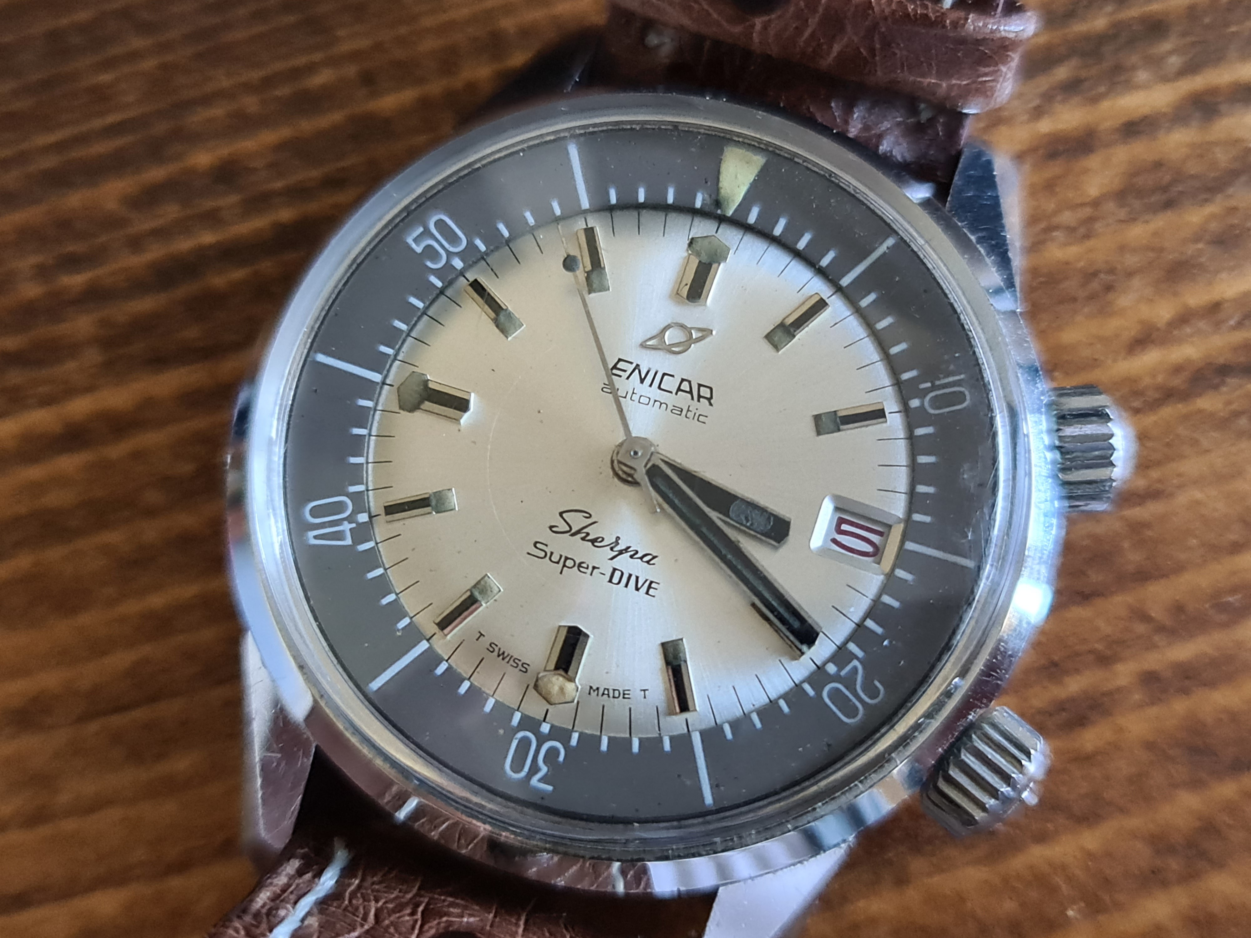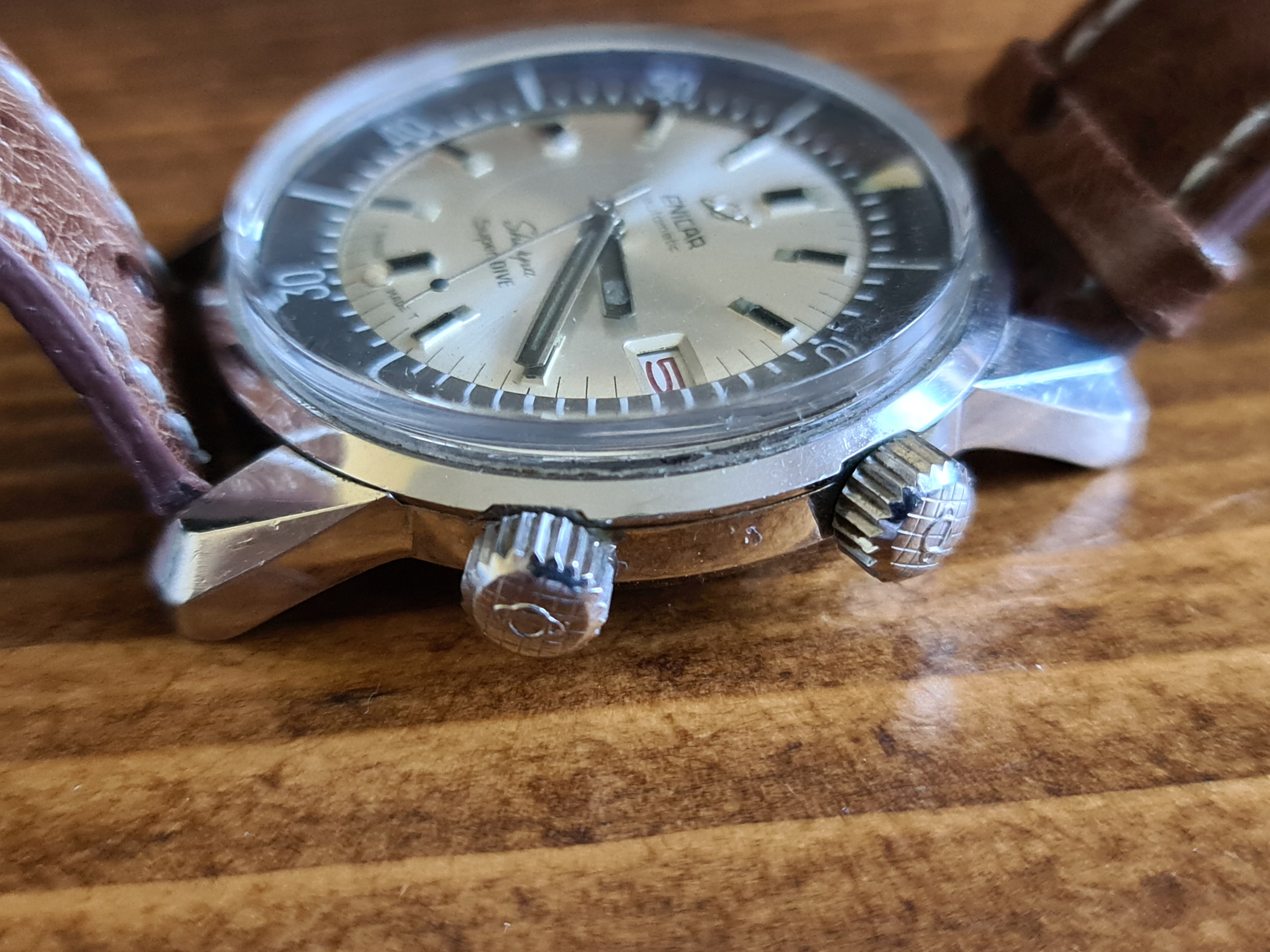 Up for sale is an Enicar Sherpa Super Dive with the rare silver/white dial, black baton hands and lollipop running seconds hand. In all round lovely original condition and running very well. The inner bezel turns nicely with no issues.
