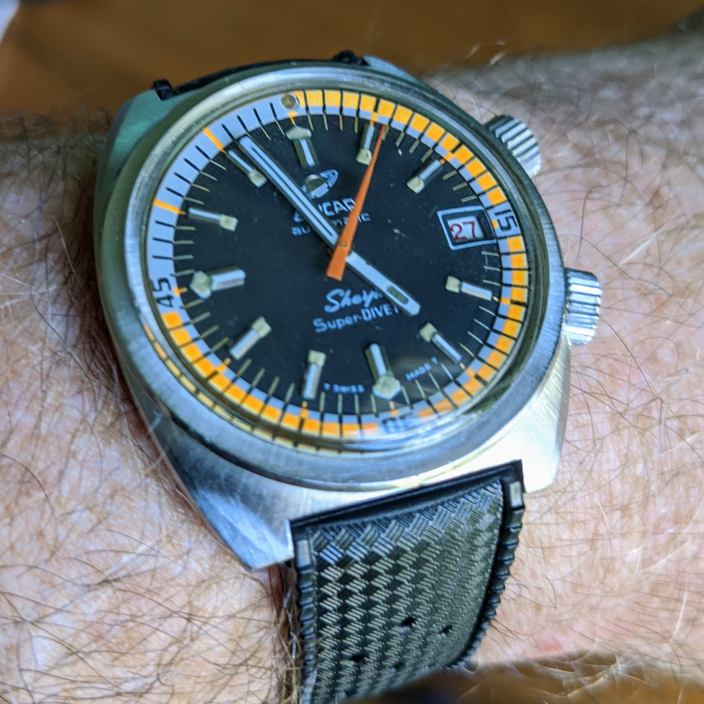 Question: when I pull out the lower crown and push it back in, the day advances. I can't find a first/second position difference which I can use to quickset the date. And I'm not pushing the crown in, as with some Seiko movements; I'm just returning it to the unopened position.