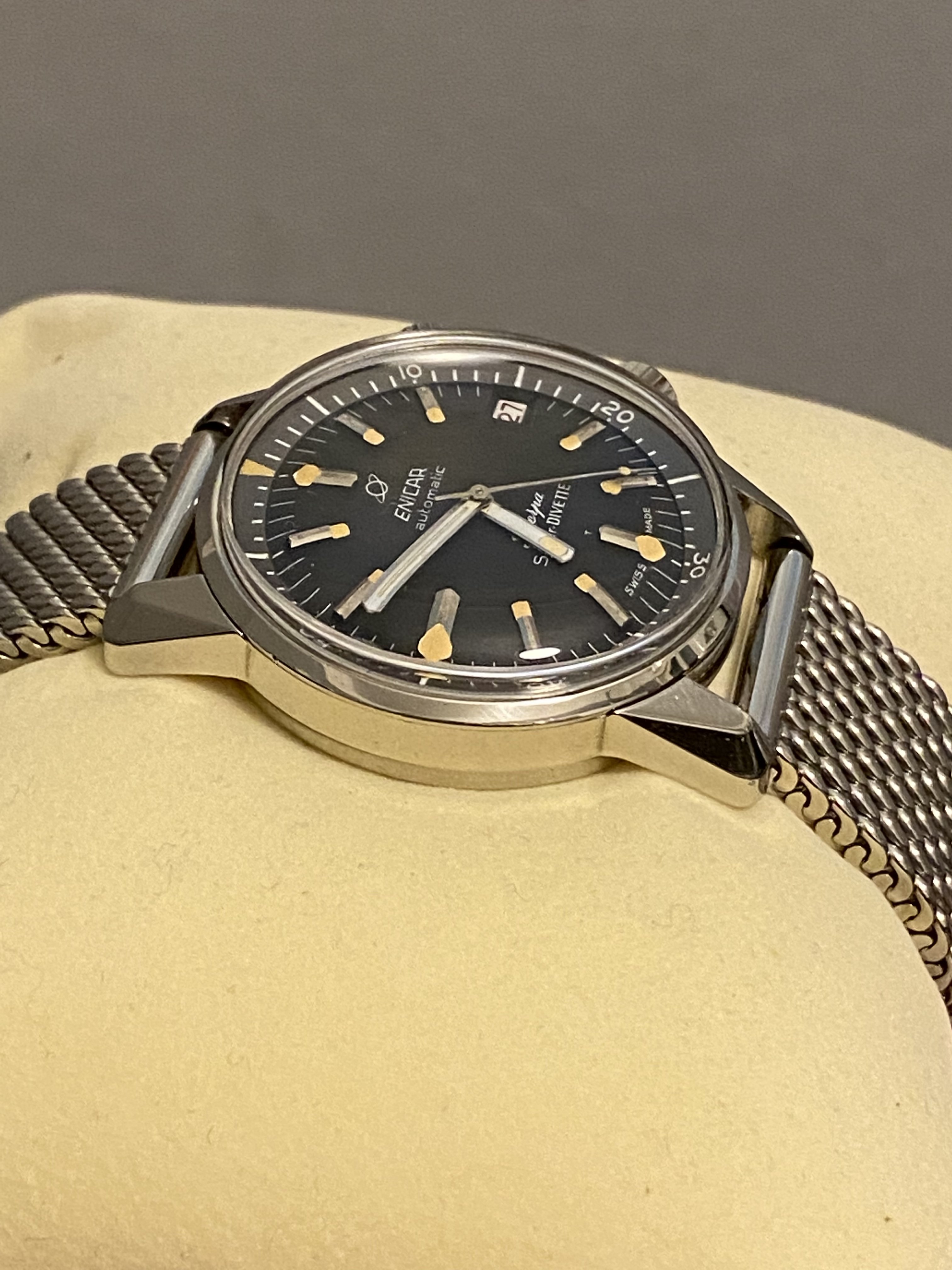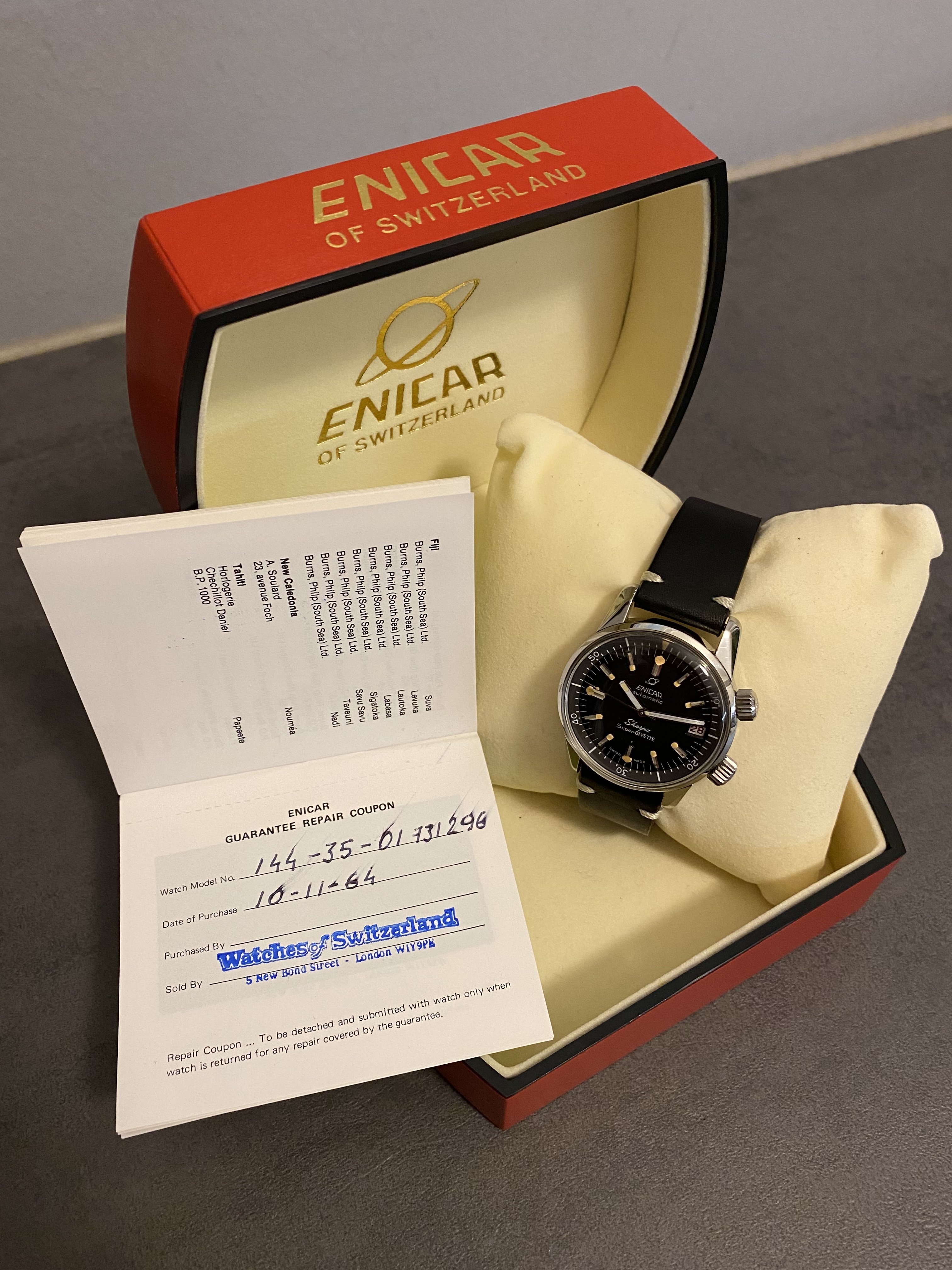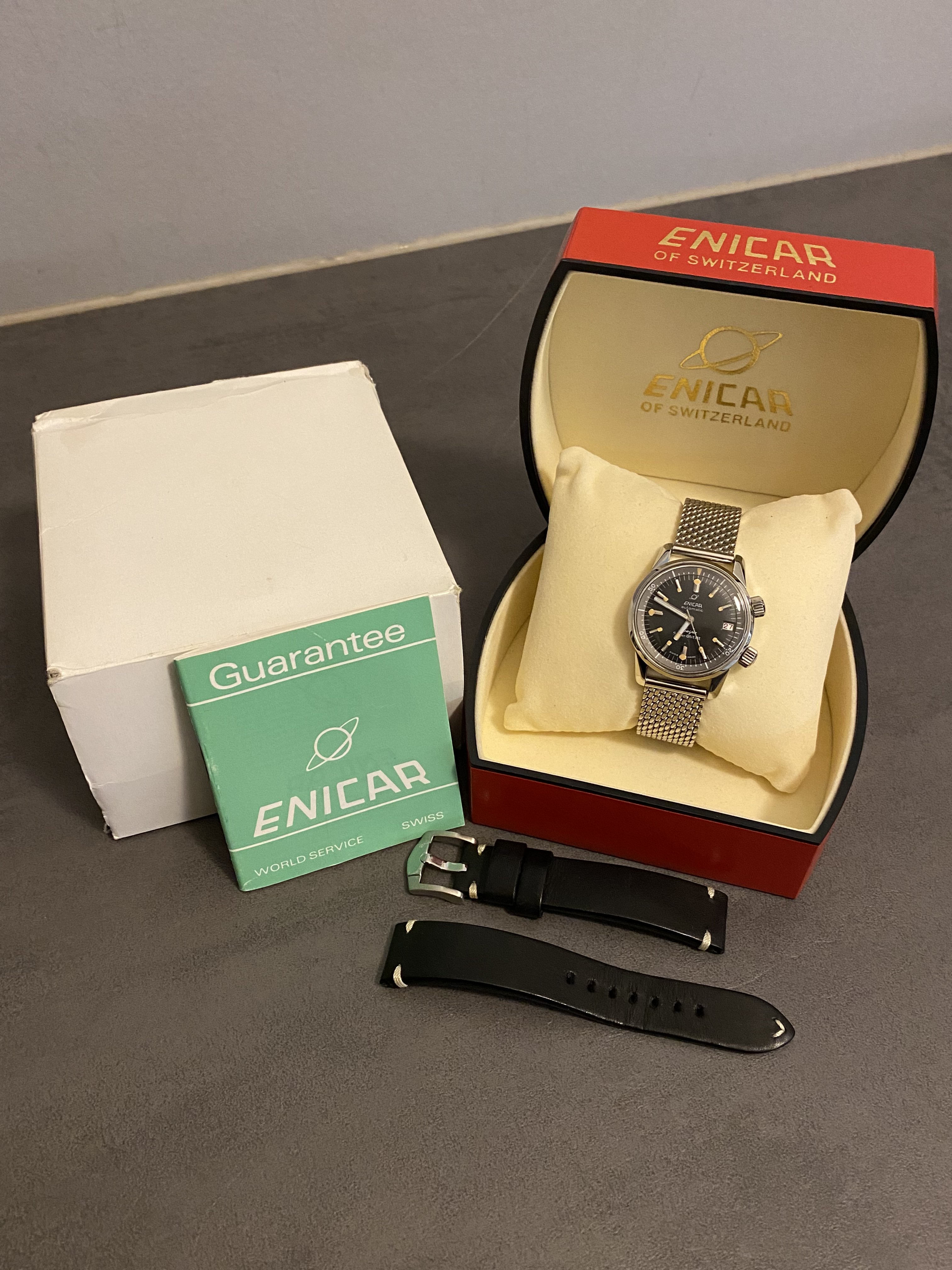 Posts 503 Likes 736 Gui13250 ·Mar 8, 2023 Hi all, For sale, a vintage Enicar super divette in incredible condition! The watch was fully serviced in 2021 and come with outer box, box and paper. It was originally bought in London in November 1964. Asking price is 3200€, shipping to discuss. Feel free to ask for more information.