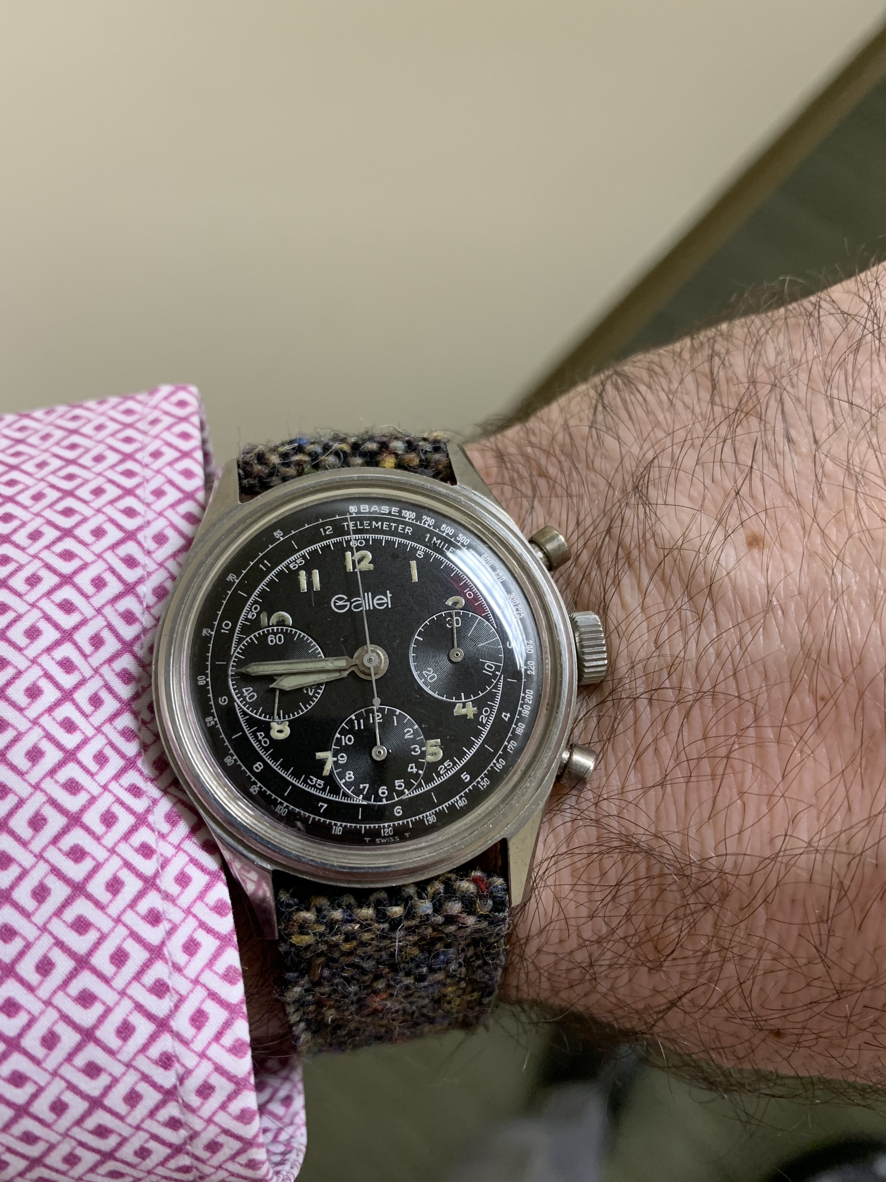 Certina's transaction having been cancelled because the caseback did not correspond to the model. I chose something very, very rare, a Gallet chronograph entirely original from the seventies, powered by an Excelsior Park 40-6 caliber, rarer and just as desirable as a Valjoux 72 if not more. The watch that I acquired and rare by its state of conversation and by its movement. It is a collector's item as rare as the Jardur Bezel Meter and Girard Perregaux Olympico of the 70s. A connoisseur's piece above all.