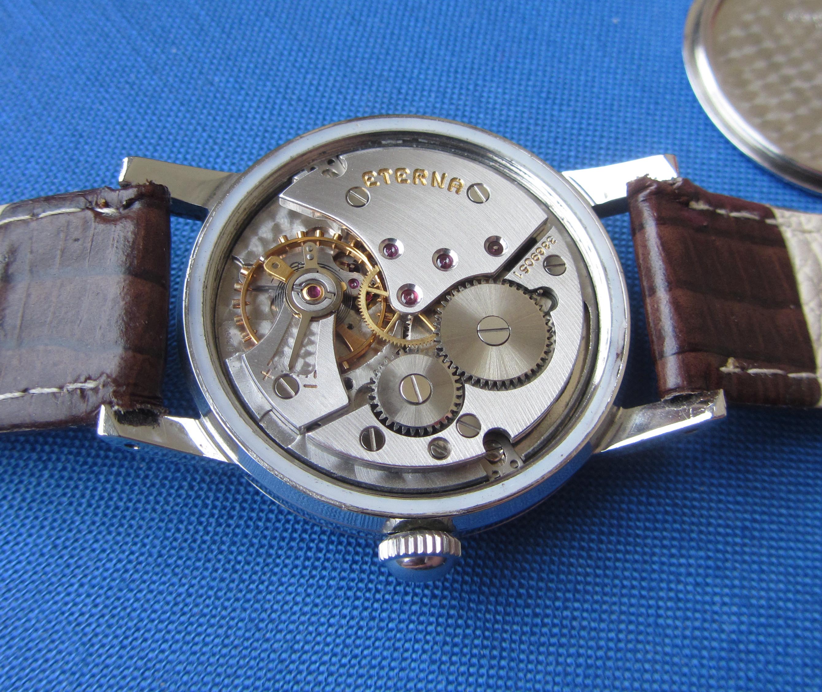 ·...just for entertainment, my "new" Eterna from 1954/55. Actually a "small one" with only 33.2mm (you fight for every tenth!) case diameter, but I haven't been so happy about a watch for a long time. I guess nobody polished it, the dial and the hands have some patina. Inside, the 1409U, 12.5", thus relatively large and with some Zenith 135 appeal, still with a screw balance and nicely decorated. As a bonus, there was a buckle that fits quite well, even if there is no ball bearing in the 1409U...
