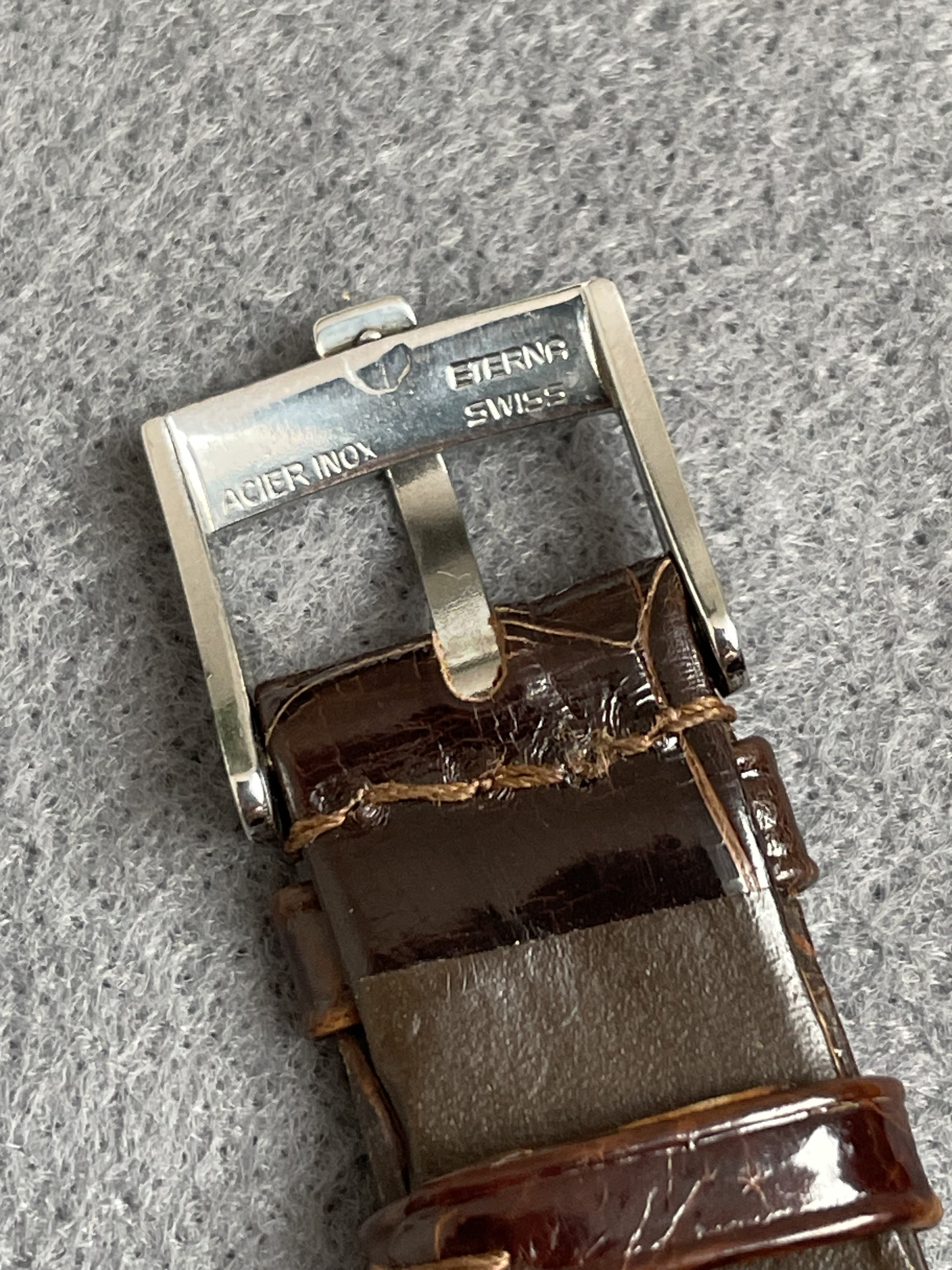 The Eterna is in exceptionally beautiful condition, it was offered to me as new old stock, although I don't share this description of its condition. It has few signs of wear and has probably hardly been worn, which can also be seen on the original strap. The original buckle is also fitted and the box is also included. The