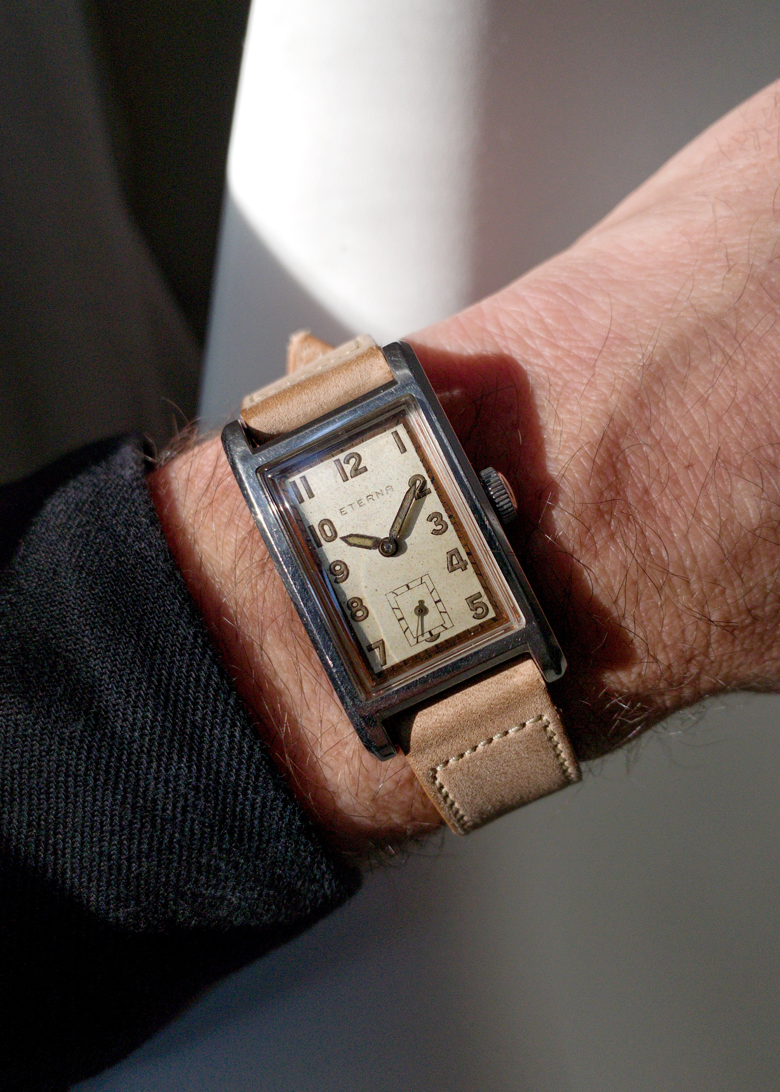 This watch features a beautifully aged two-tone dial, with a copper outer ring and a center section that’s taken on an off-white patina over the years. The luminous material is radium, the crystal is sharp, and the original crown is intact. It’s also marked Fab. Suisse, as is often seen on Eterna clamshells from this period.