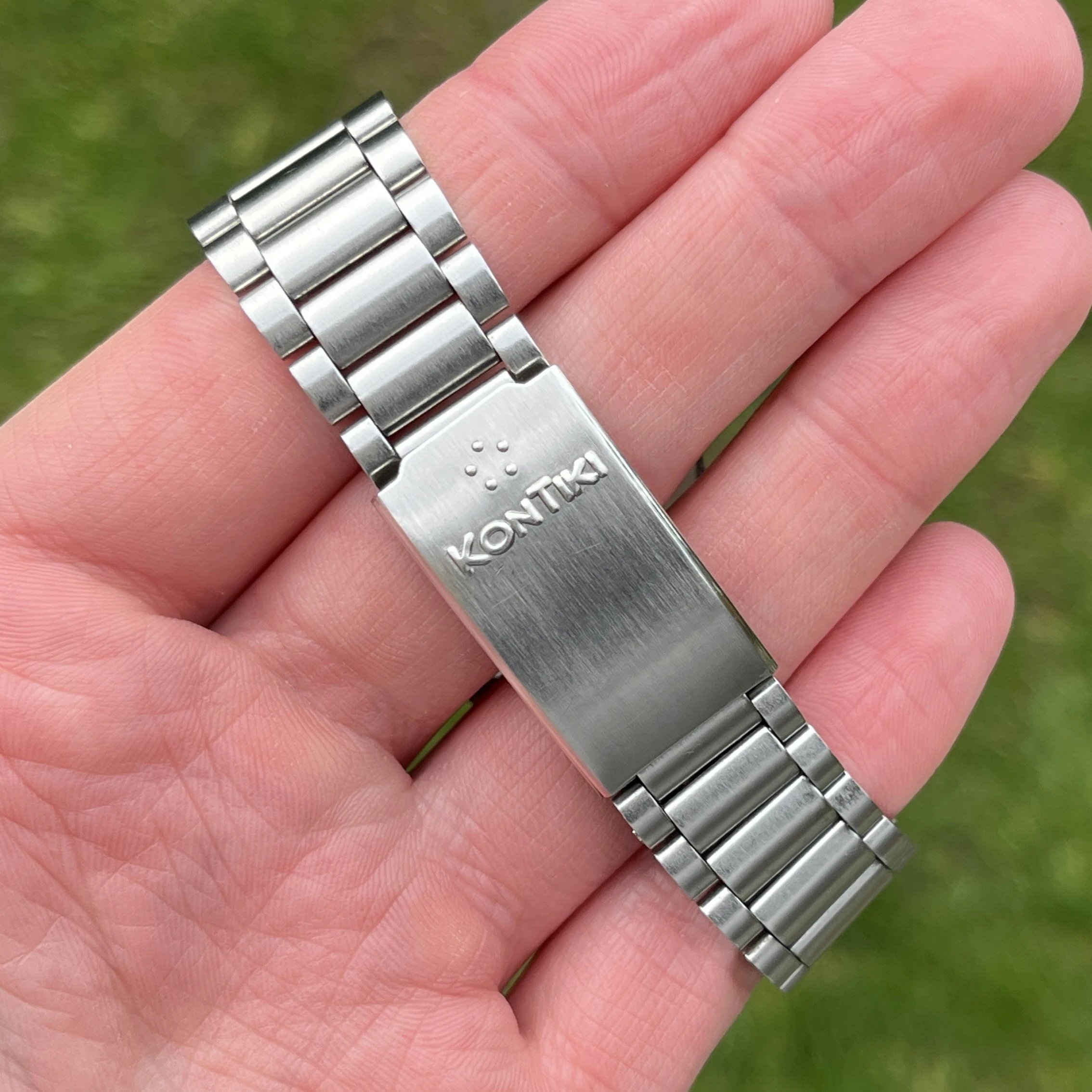 Solid signed bracelet with screwed links. You can really feel the quality. It fits my 17,5cm wrist with lots of room to spare on the micro adjustment.