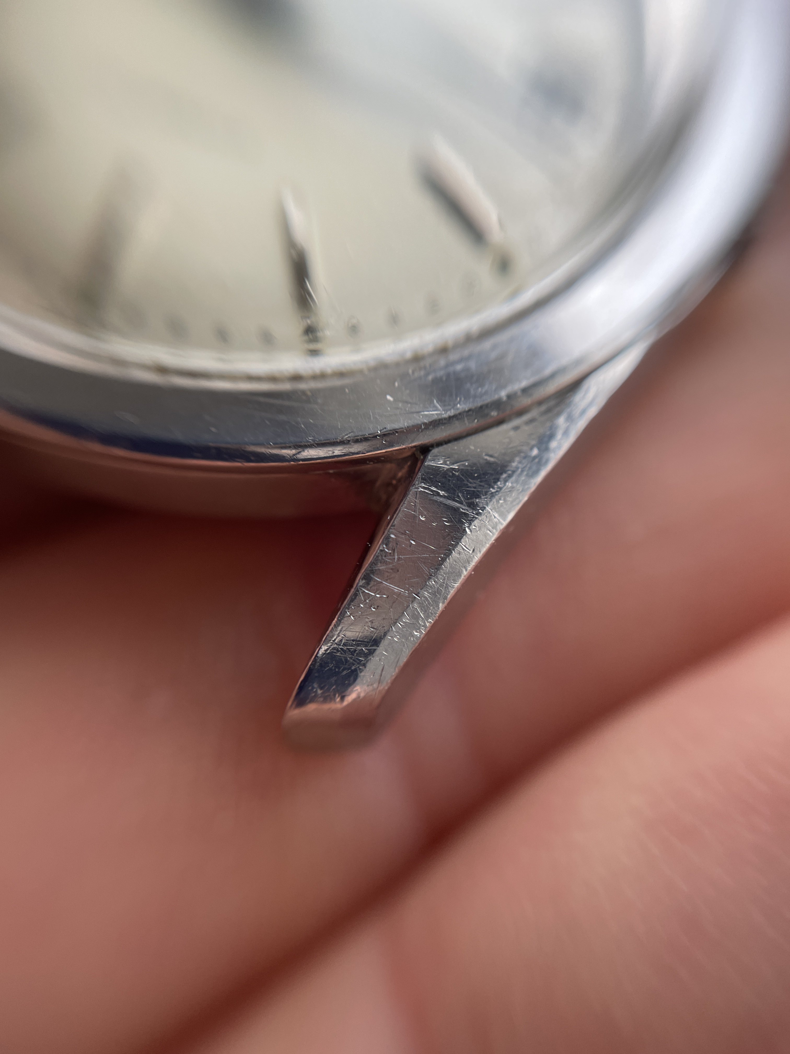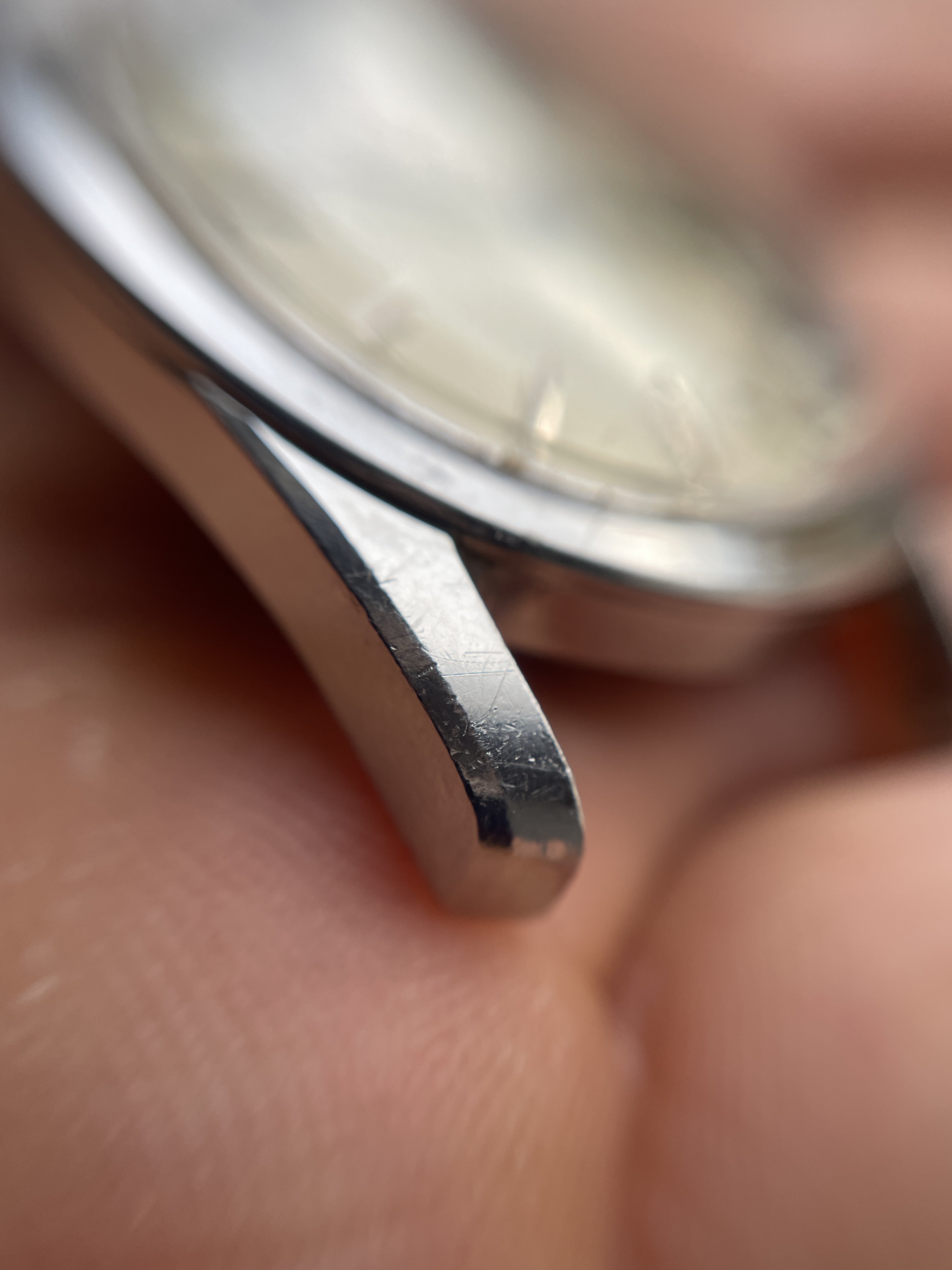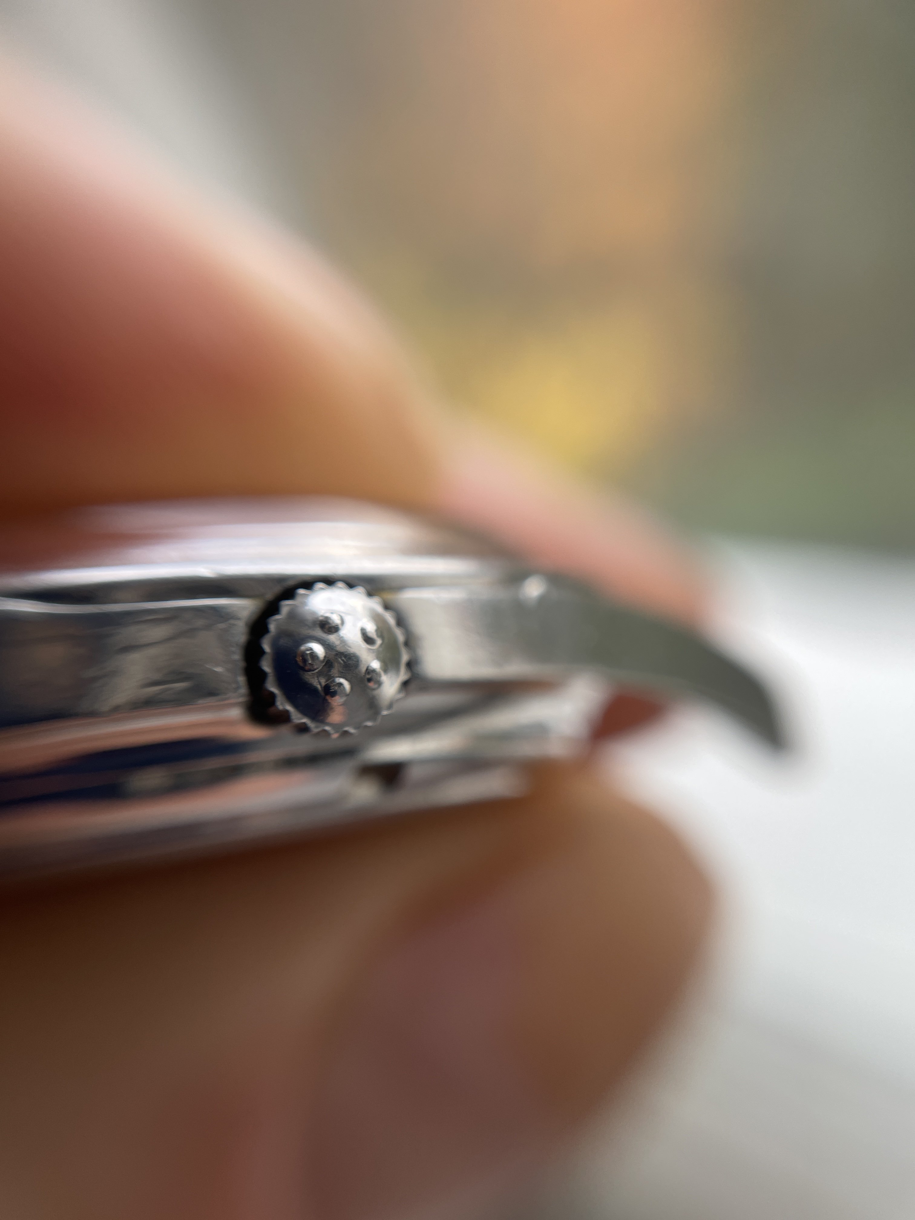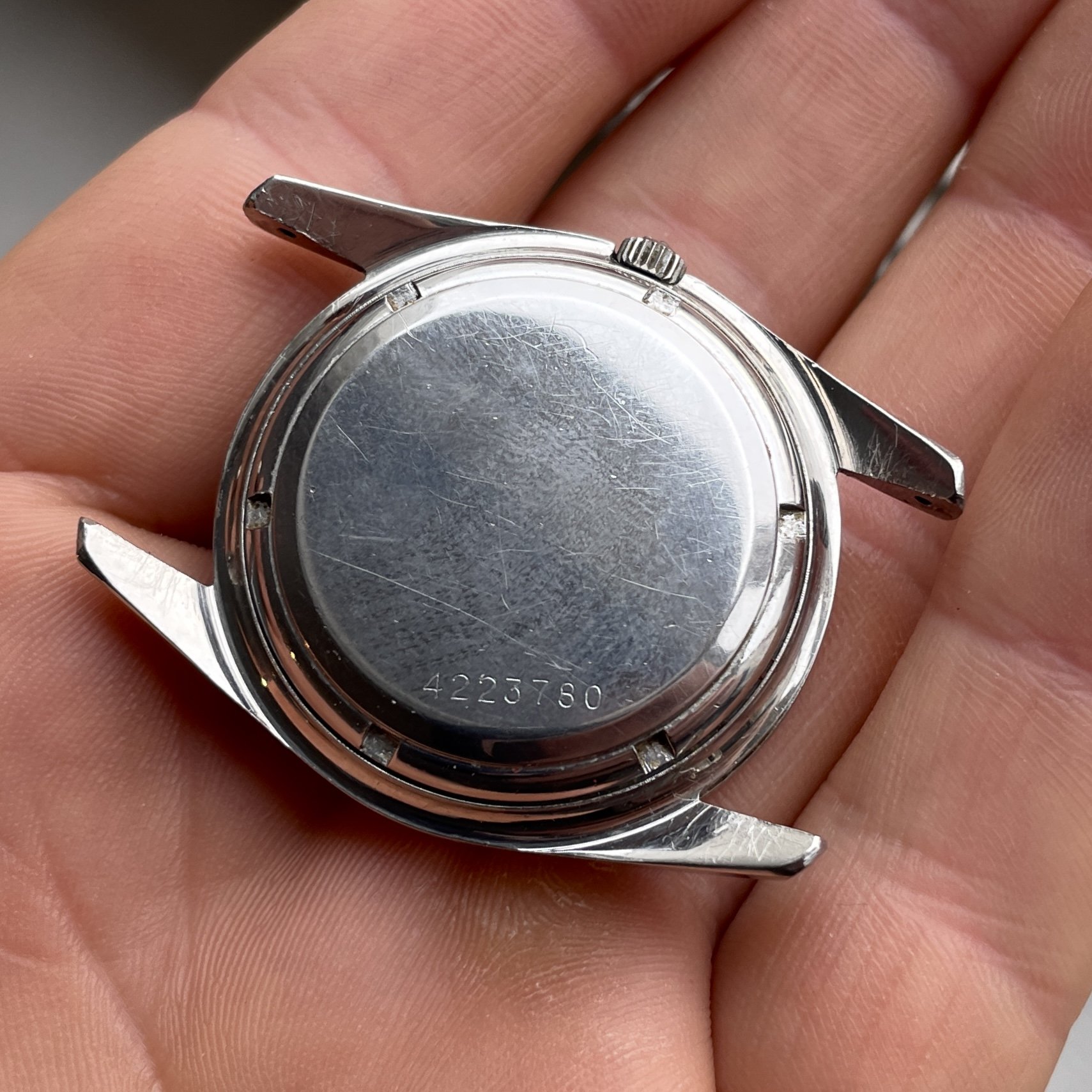 Case is 35mm excluding the original signed crown and is sharp with distinct bevels and only light scratches, screwed down caseback with clear serial number.