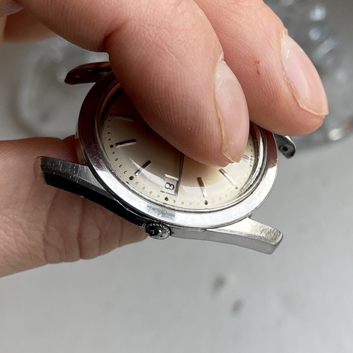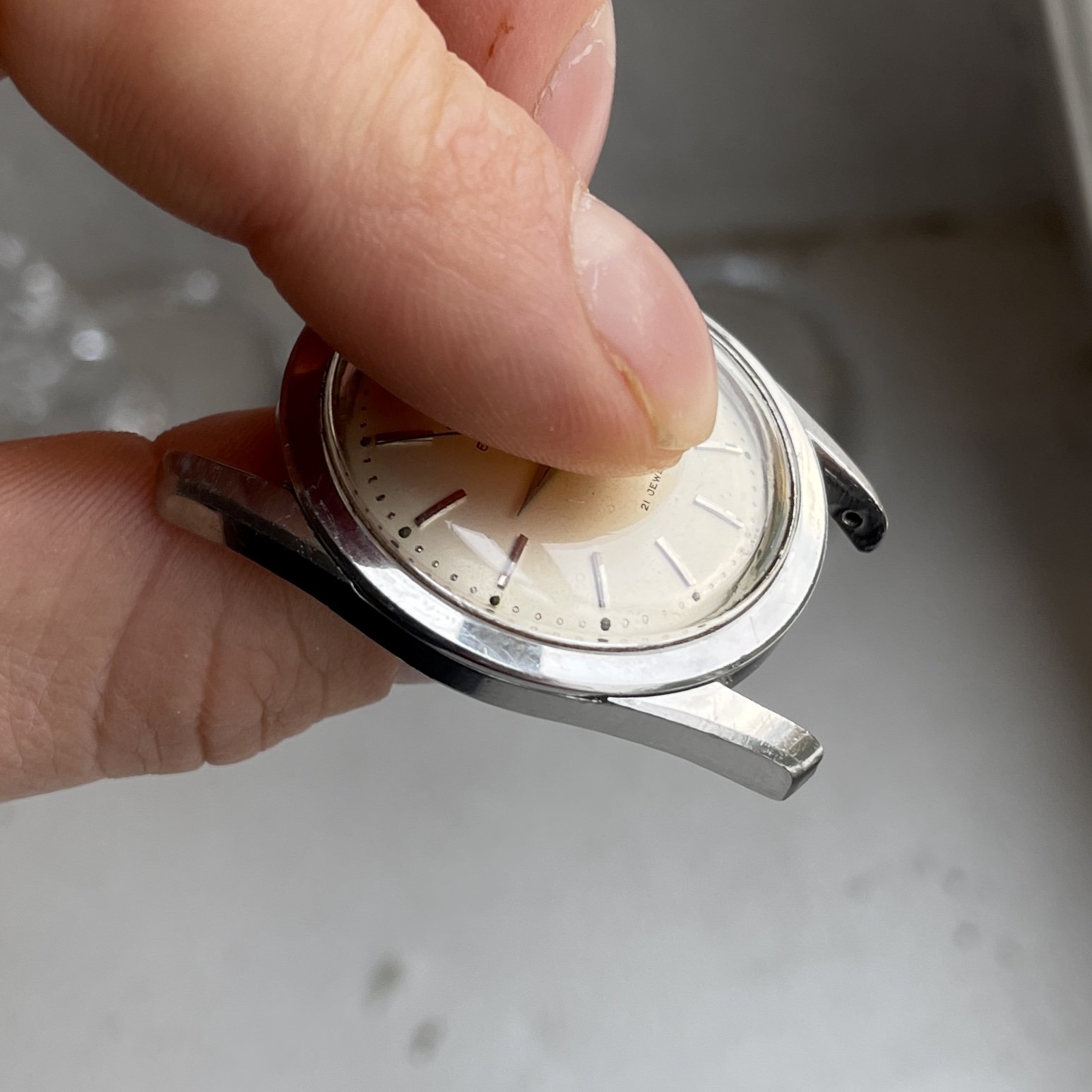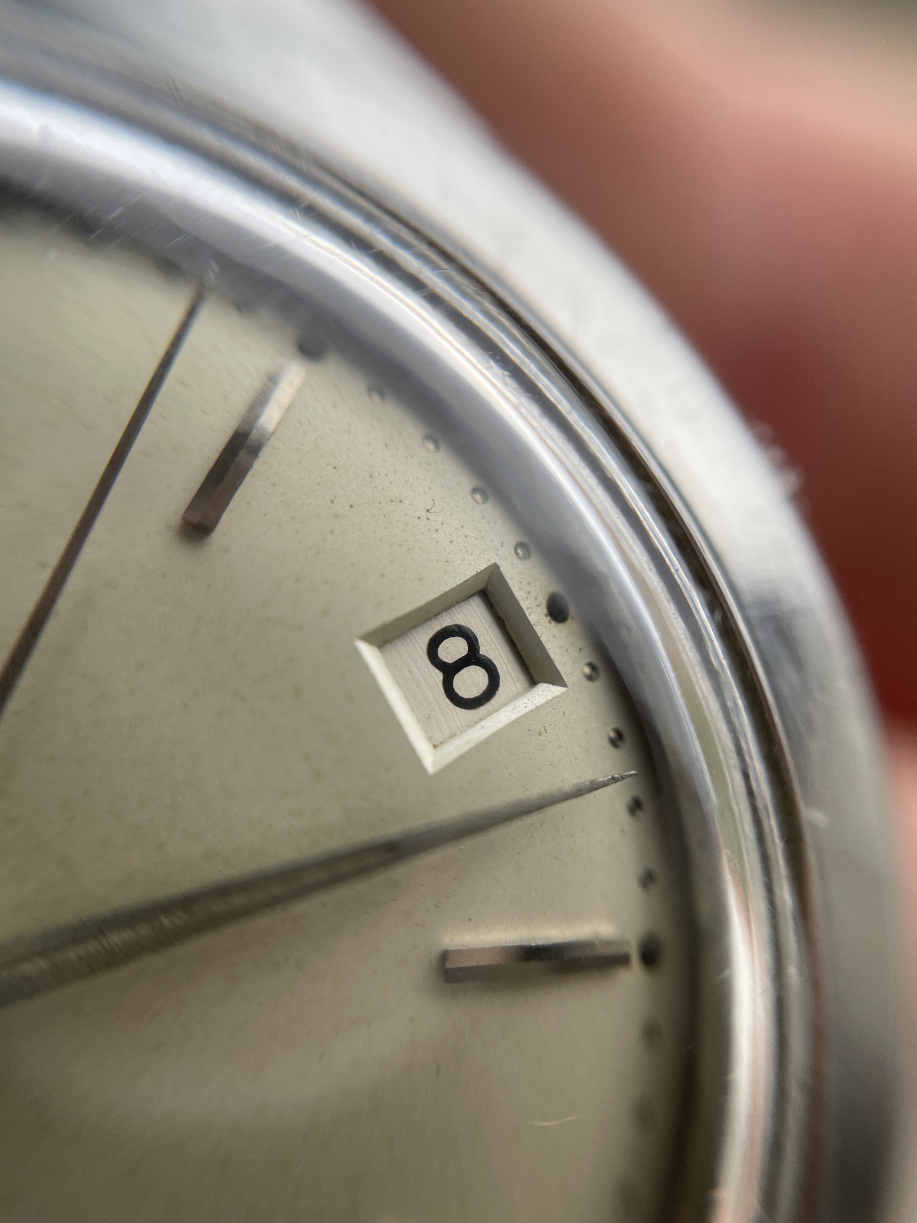 Cream white dial with silver furniture, the dial have a light but very even patina and the lume have darkened consistently.