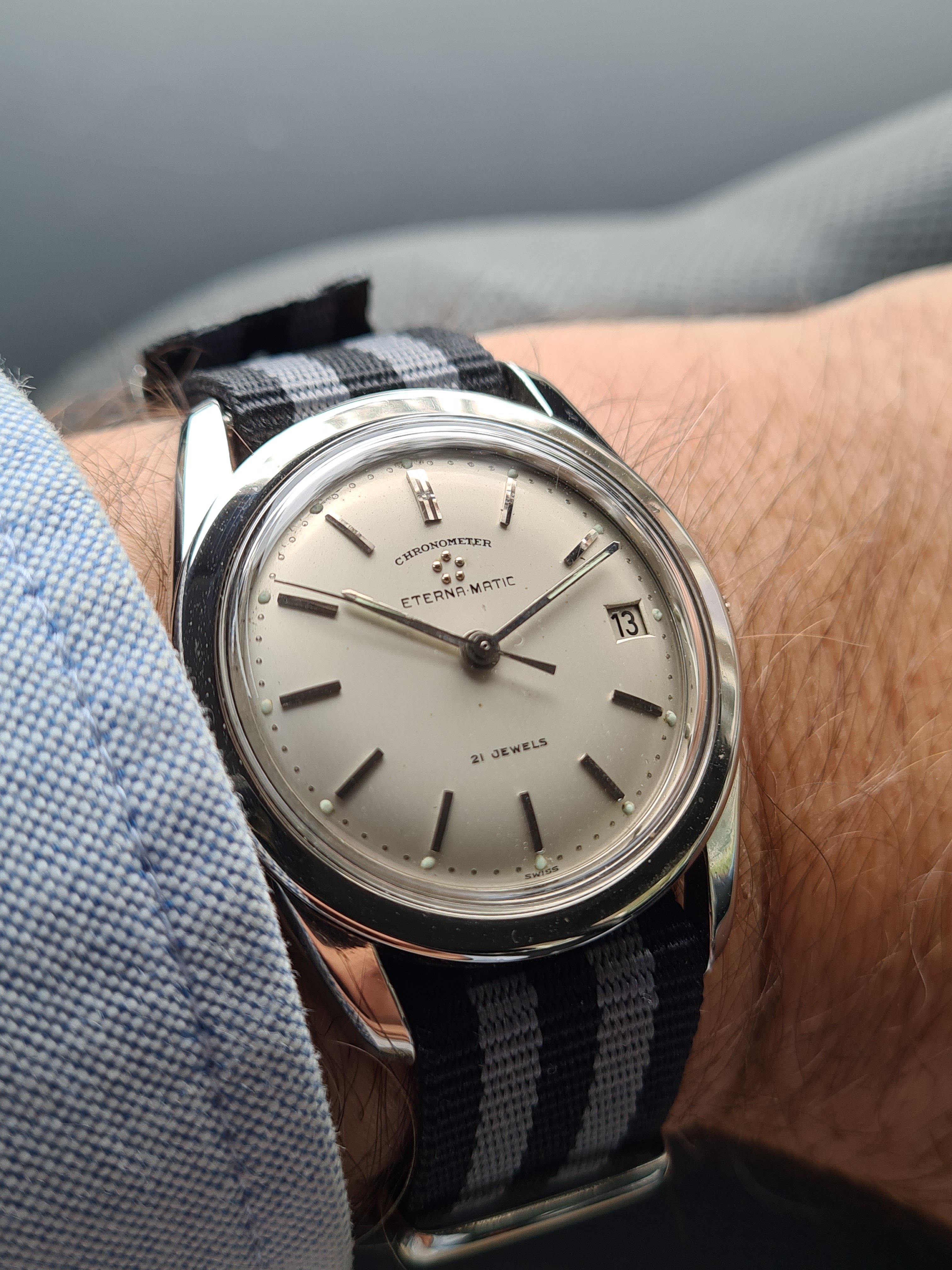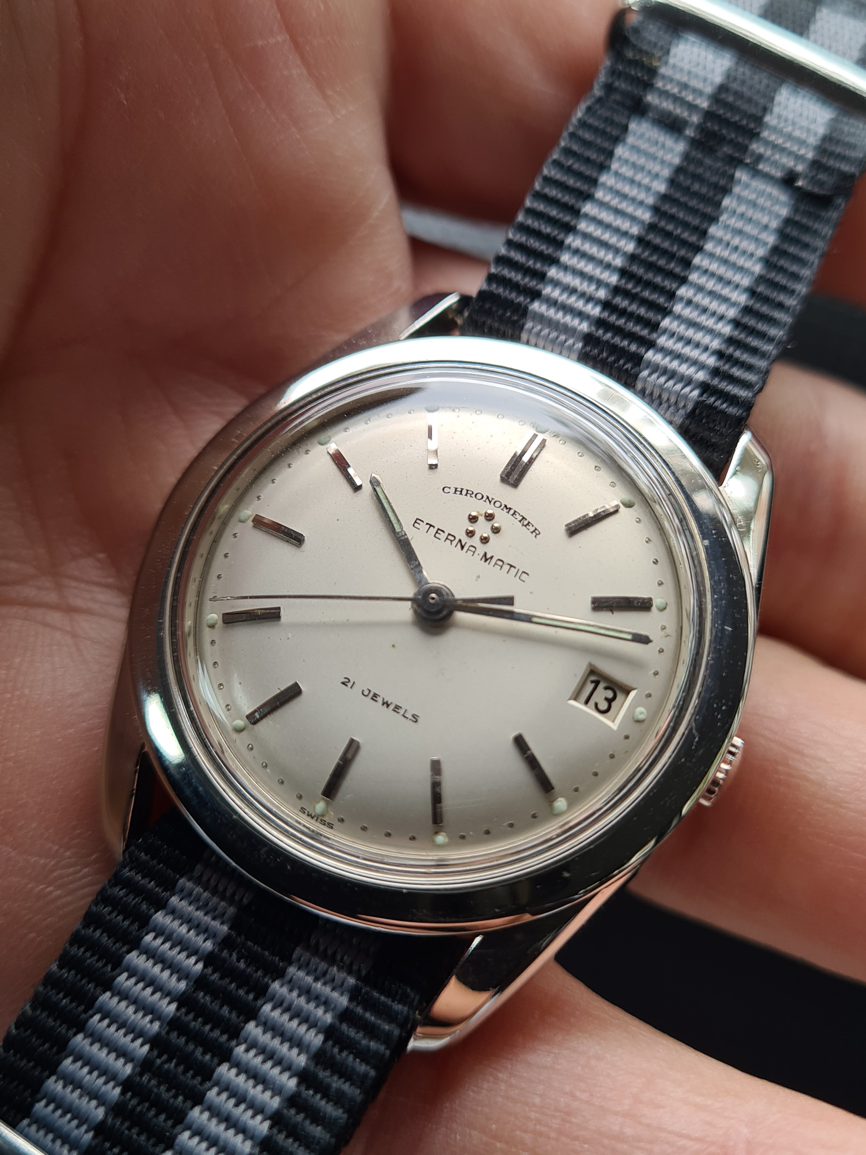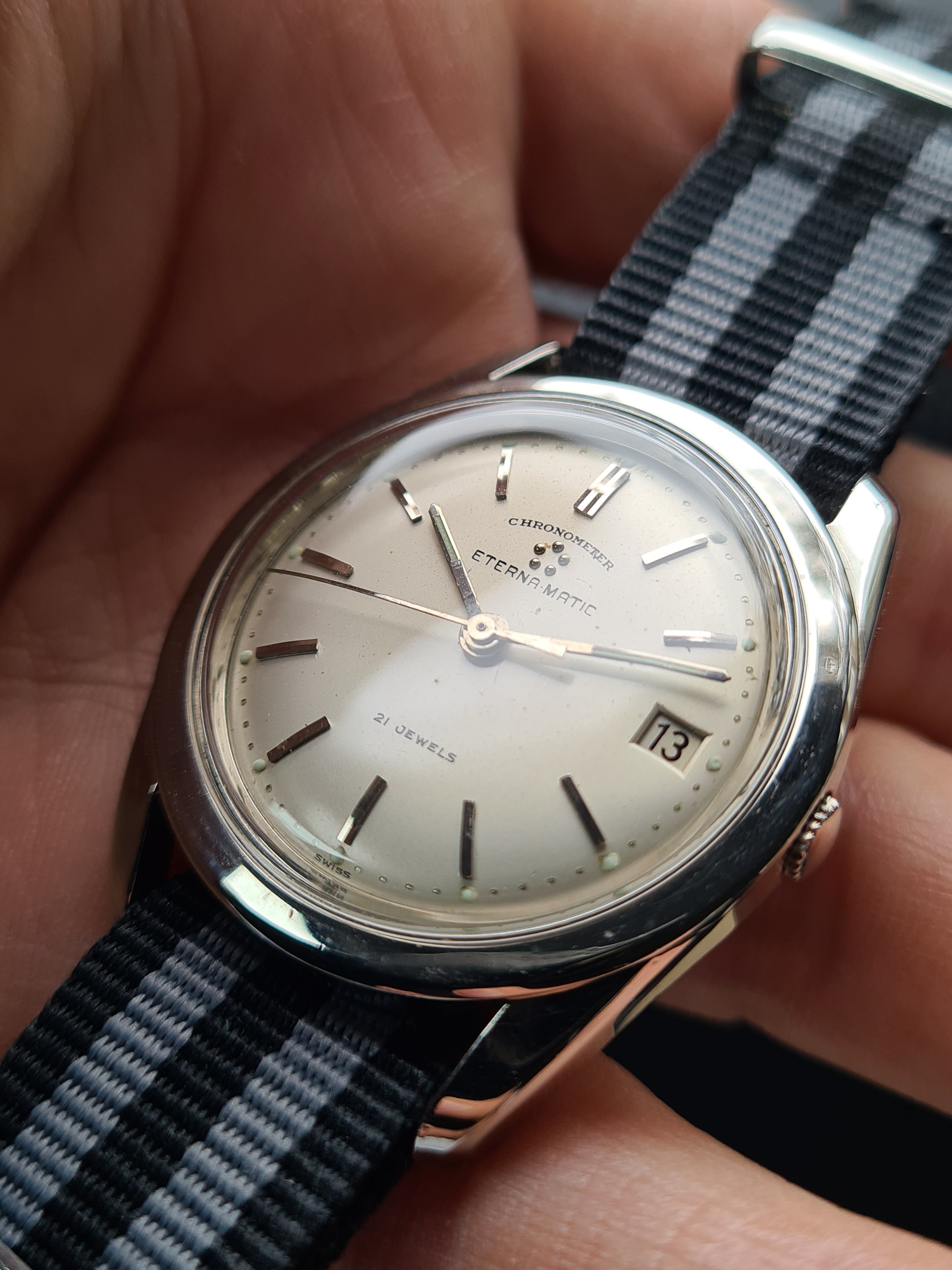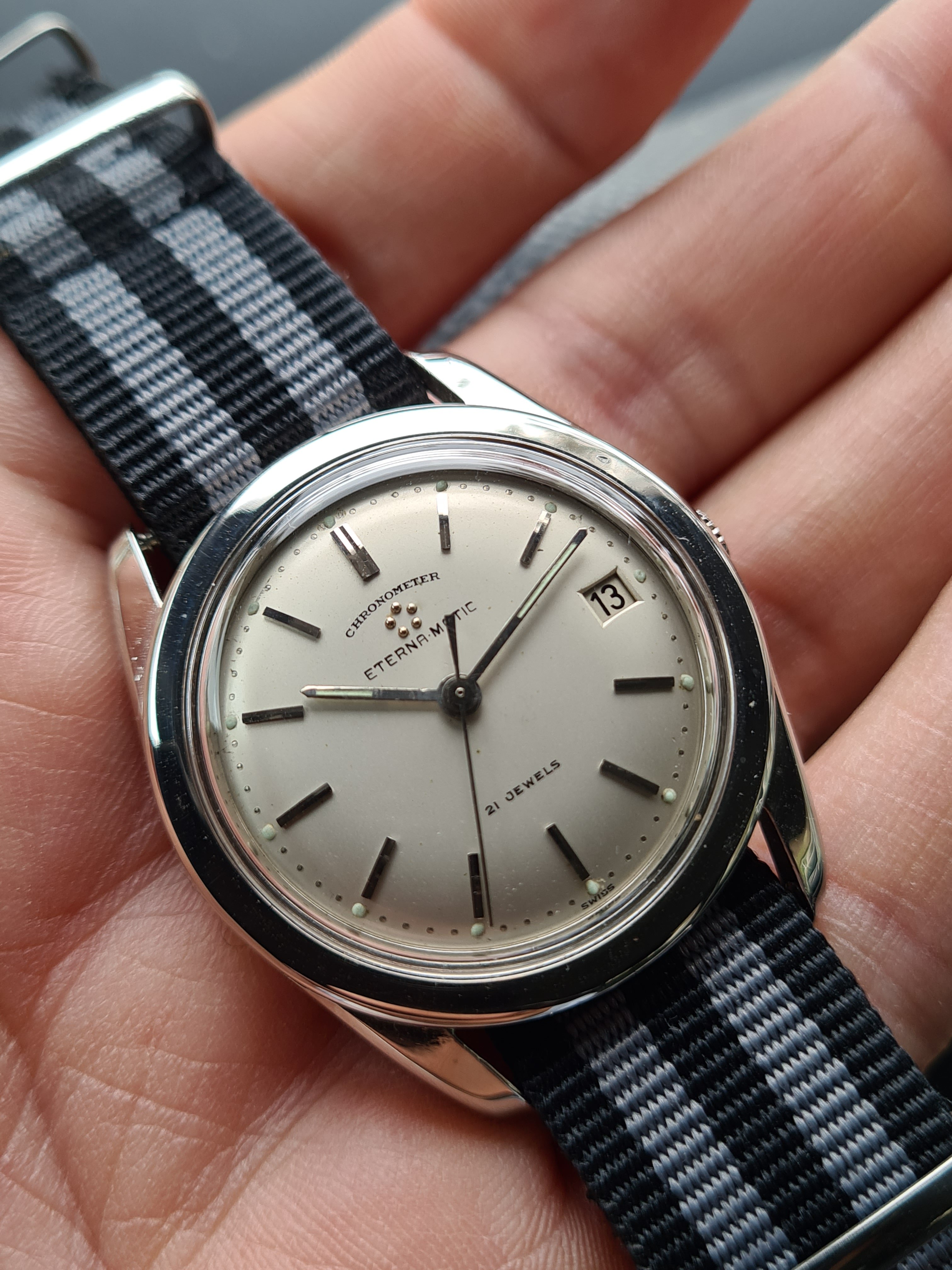 For sale today a Eterna Matic Chronometer. I'm not a eterna expert but here it goes (if I made a mistake just pm me, I will correct it). The case measures 35mm with a hidden/sunken crown. The hands were probably replaced because I only saw these with dauphine-ish hands. The crown is unsigned. Not sure if it's original. The same goes for the lume plots.The watch was produced probably around 1959/1960 according to the eterna timetable. The watch runs fine but service history is unknown. I could'nt make a picture of the caliber. But I assume it's a chronometer rated 1422U caliber. The watch will be delivered with a eterna box. I do not know if it's original to the watch.
