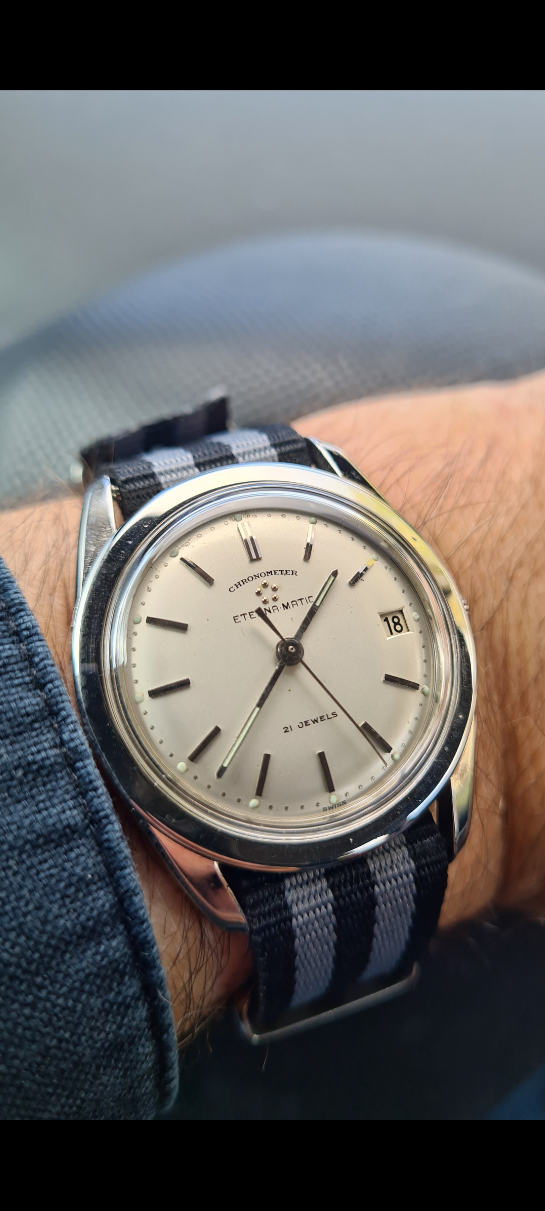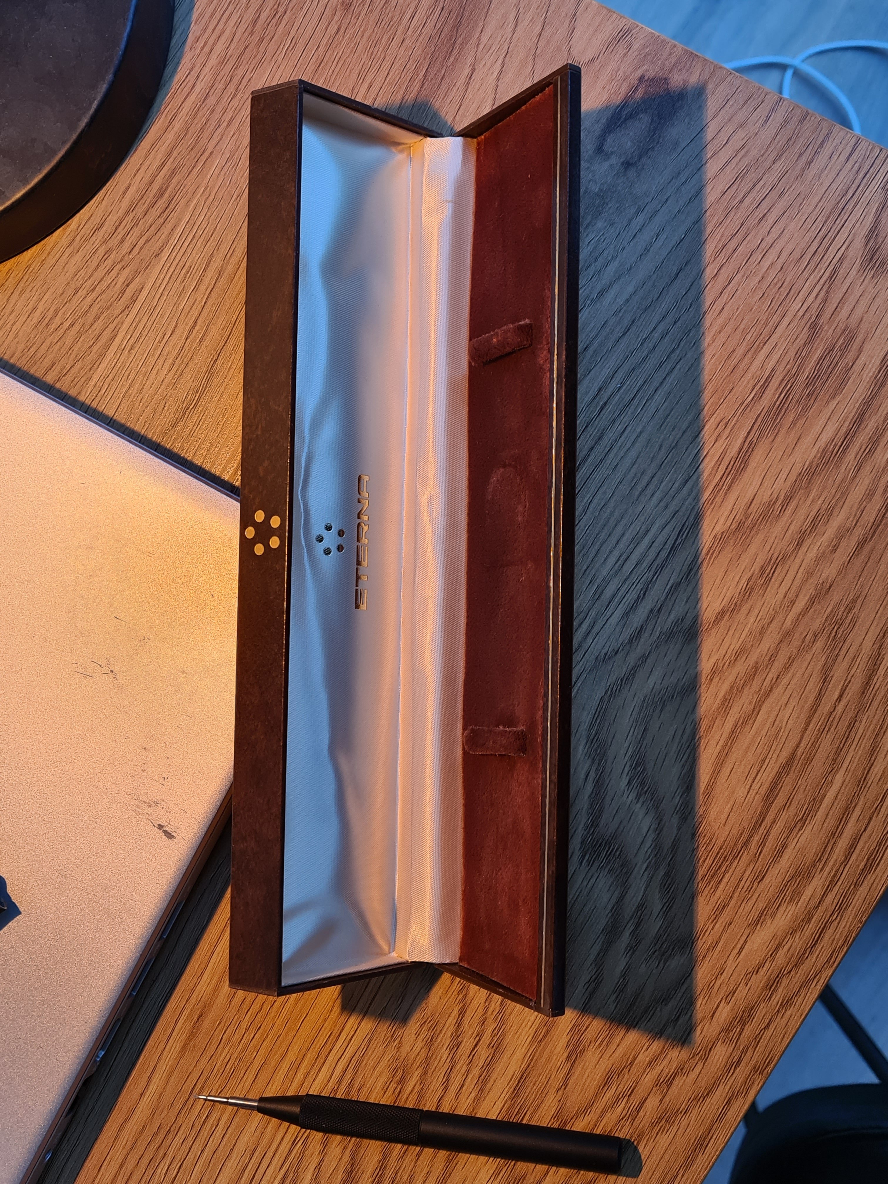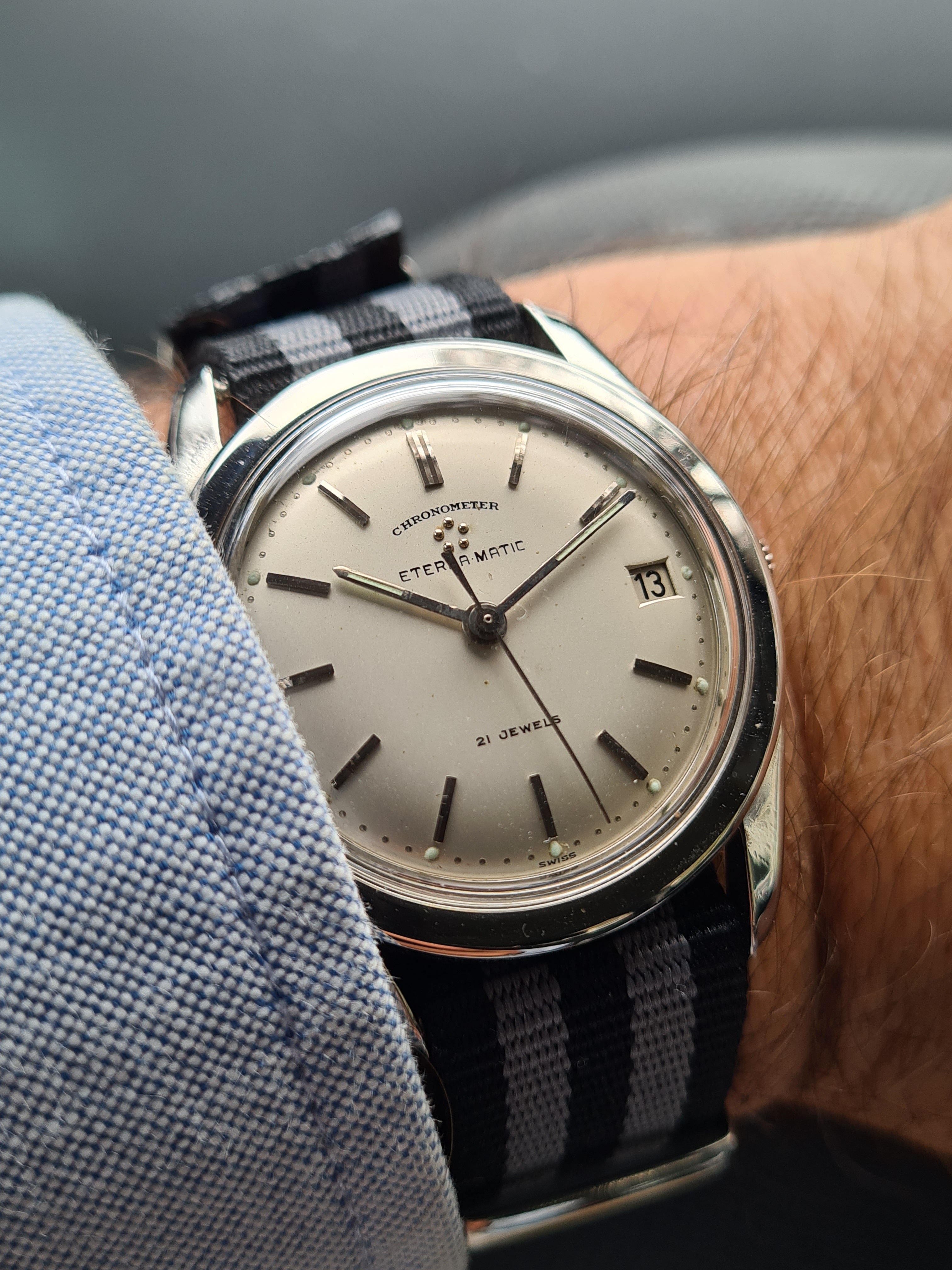 For sale today a Eterna Matic Chronometer. I'm not a eterna expert but here it goes (if I made a mistake just pm me, I will correct it). The case measures 35mm with a hidden/sunken crown. The hands were probably replaced because I only saw these with dauphine-ish hands. The crown is unsigned. Not sure if it's original. The same goes for the lume plots.The watch was produced probably around 1959/1960 according to the eterna timetable. The watch runs fine but service history is unknown. I could'nt make a picture of the caliber. But I assume it's a chronometer rated 1422U caliber. The watch will be delivered with a eterna box. I do not know if it's original to the watch.