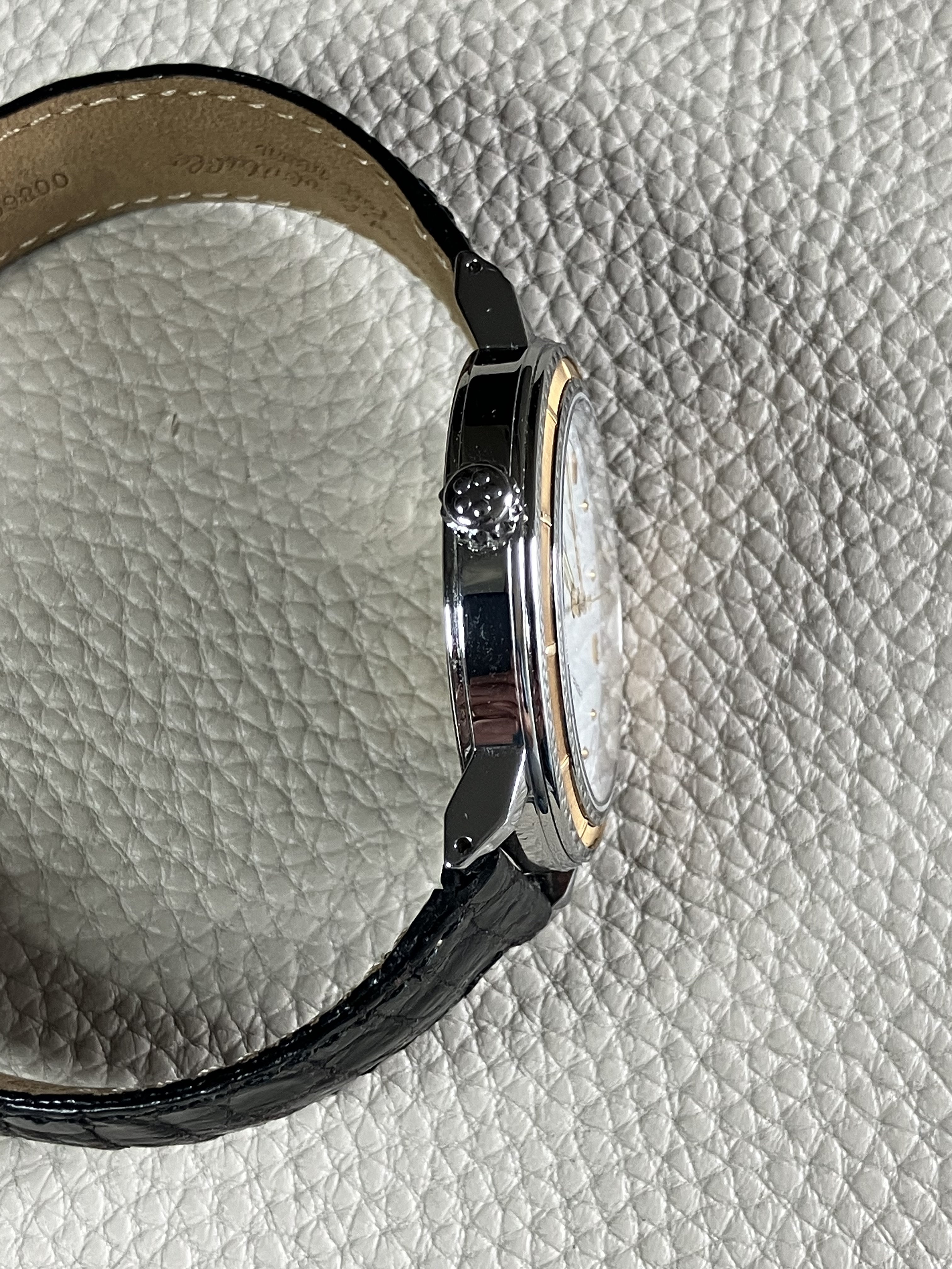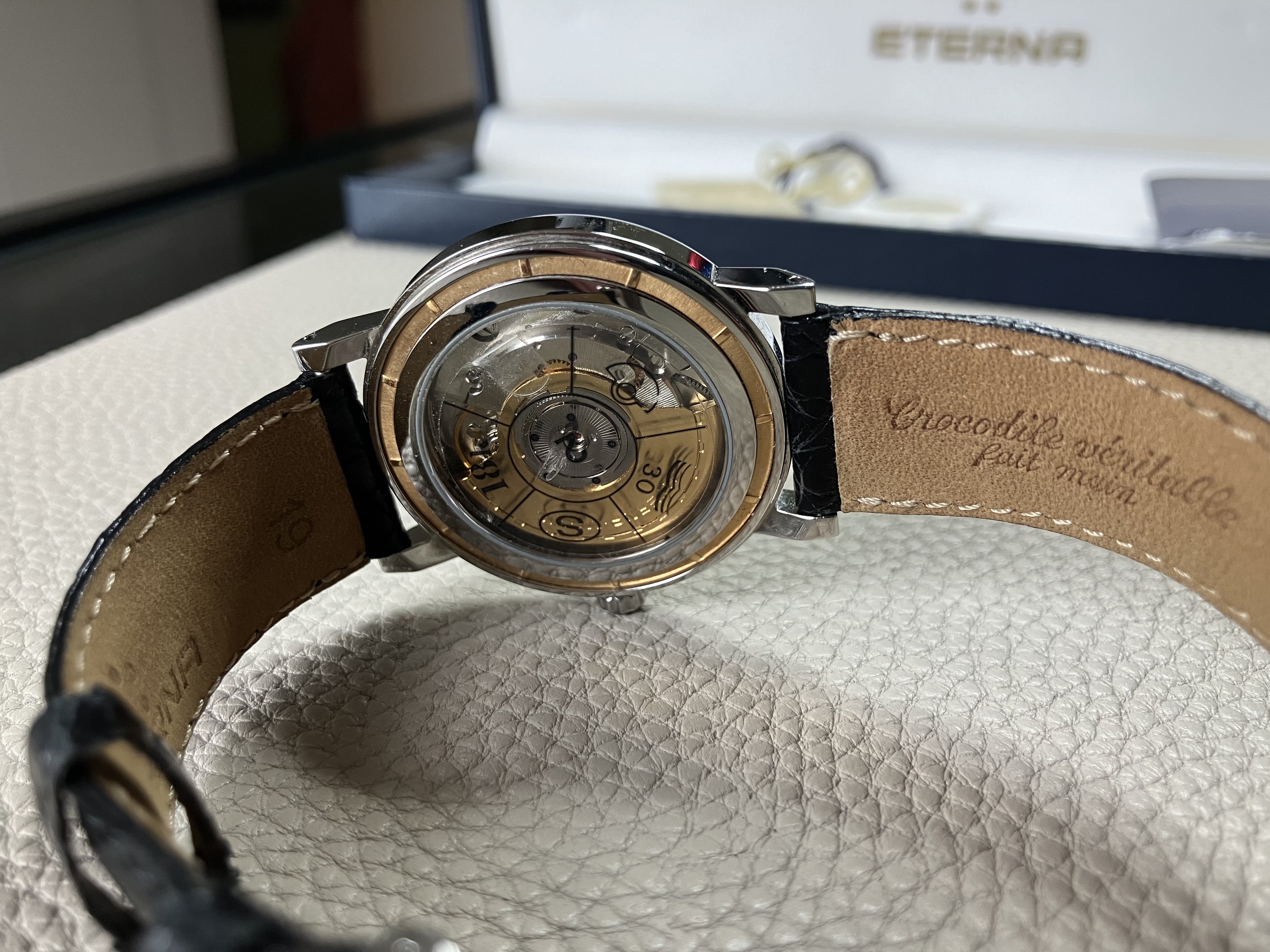 ·This may be a unique timepiece up for sale, at least I have not seen anything else like it. This Eterna-Matic Chronometer appears to date to 1992, possibly celebrating 60 years of independence of Eterna from ETA (now under the Swatch banner). One doesn’t see many of these pieces here in Canada as Eterna focused their marketing on Europe and Asia. The higher end jeweler Birks used to be their main Canadian seller, but no longer. This one could be unisex, worn by either a man or a woman. With the gold bezel, it has a bit of that Disco Volante vibe. I find it wears larger on the wrist than the 36 mm diameter, and is only 8 mm high (case+crystal). I purchased this in 2017 from a fellow OF member, but I have only worn it a handful of times since.