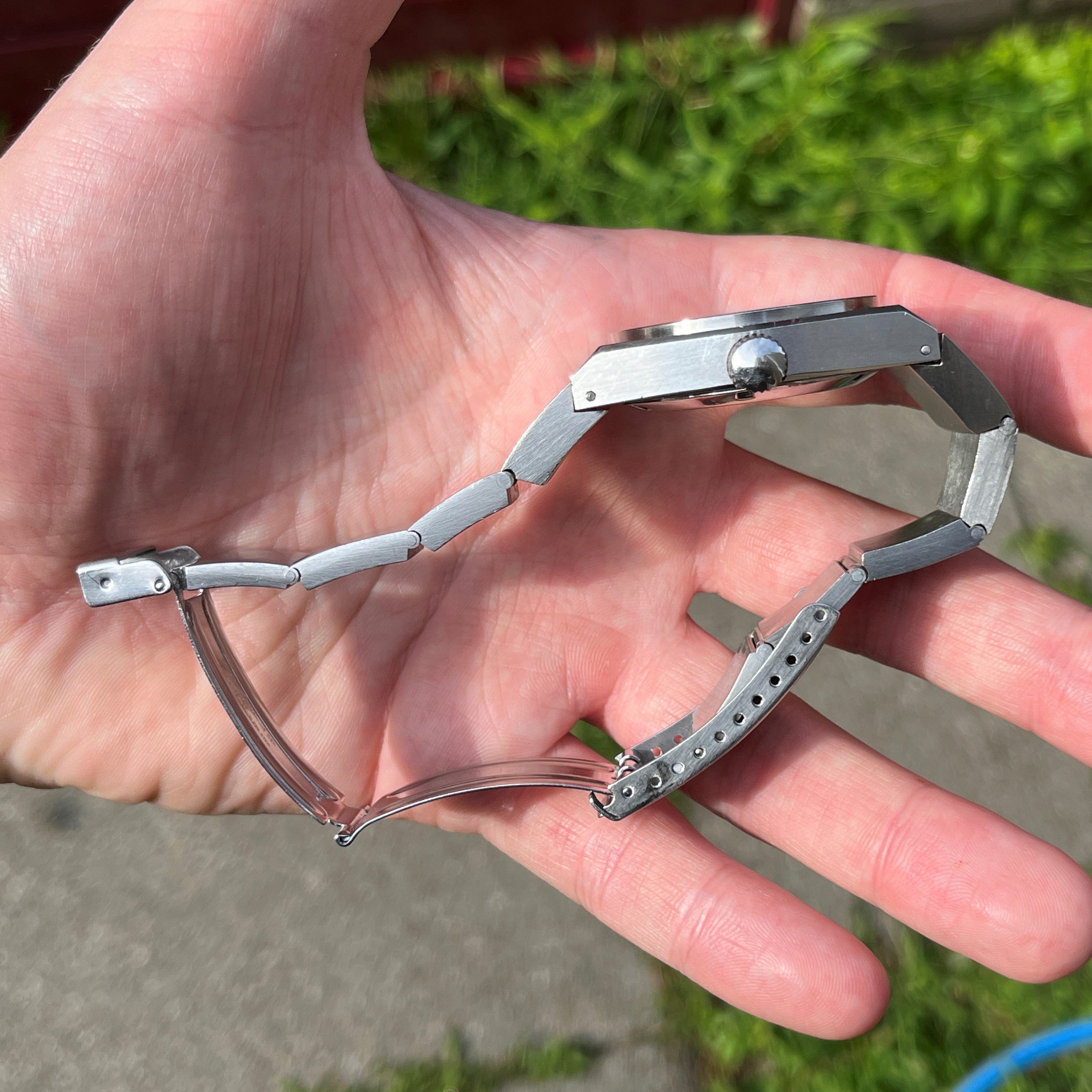 Despite its size and weight, it wears comfortably enough. The watch is fully original including the crown and crystal. The dial is a striking purple-ish blue in sunlight, and dark blue otherwise. It has an intricate pattern.