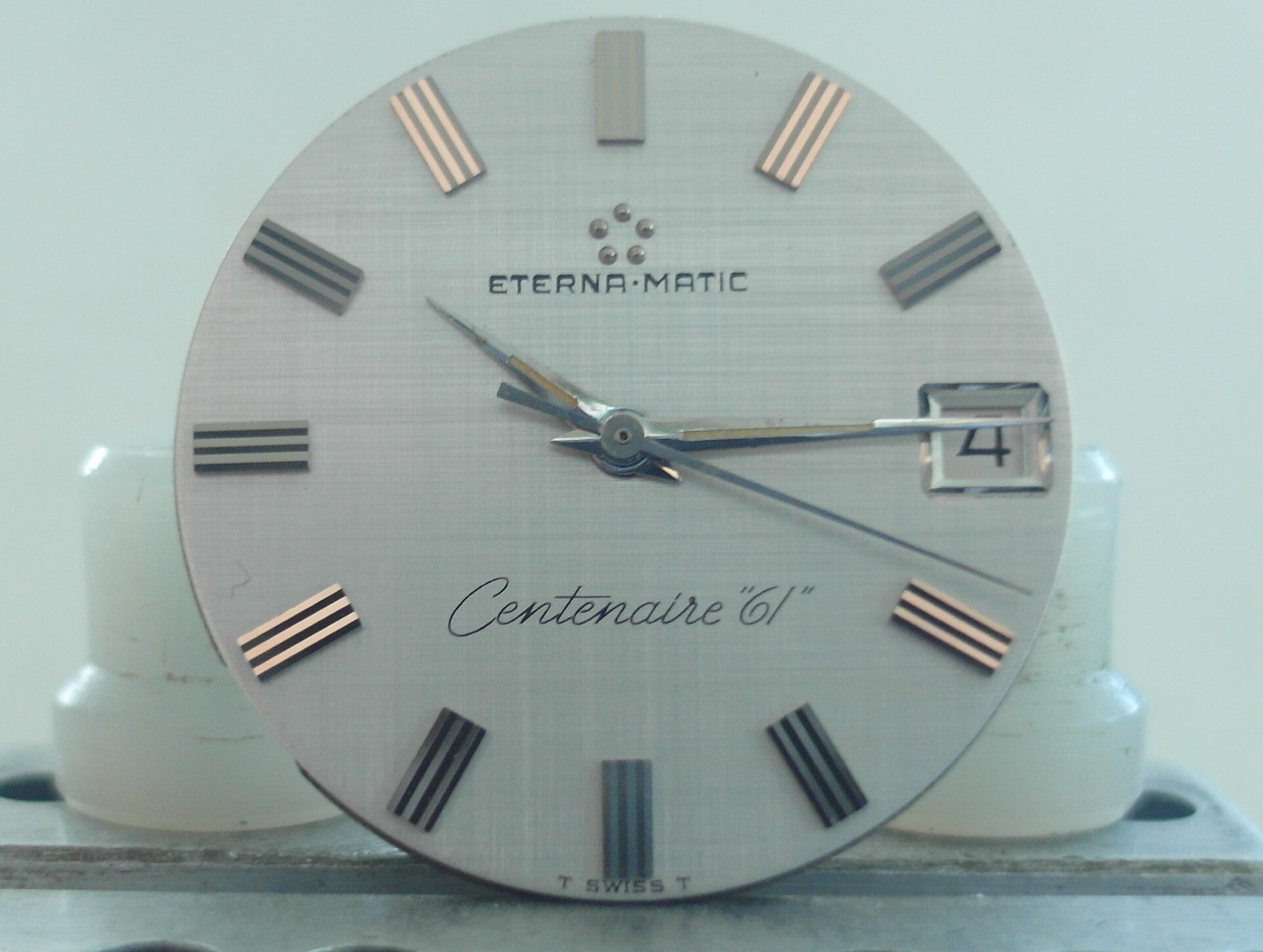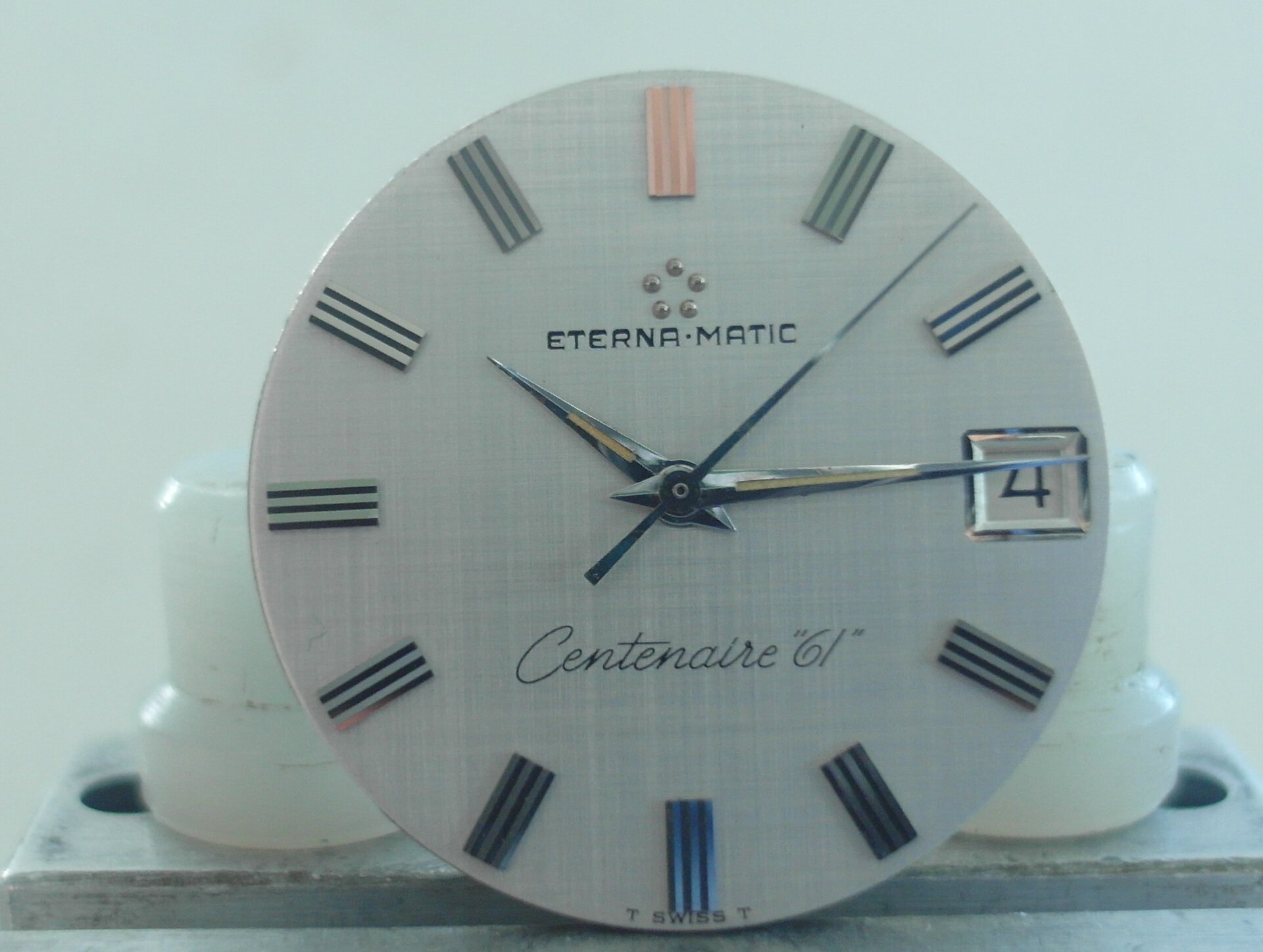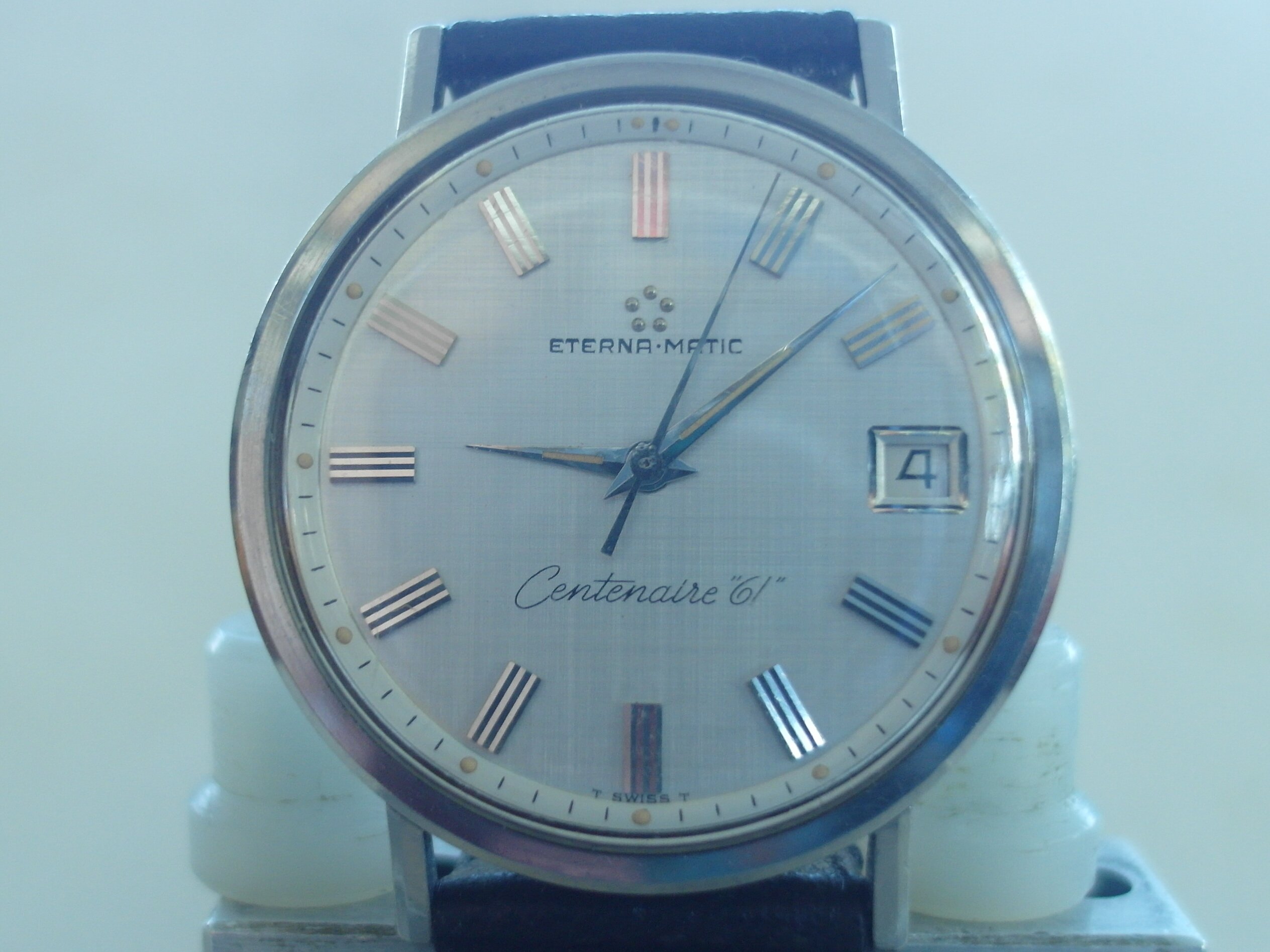 ·And another Beauty :::::: ETERNA MATIC Vintage CENTENAIRE Early Example with a Perfect LINEN Dial. An absolute Beauty. Best I have seen in many, many years. Perfect Linen dial without any defects. Perfect Metal markers without any defects ; these are the triple machined markers, I`ve only seen with Linen dials. Exellent unmolested Original hands. All lume is Original, present and never touched. Great Stainless case with no mayor dents or scratches. Recessed crown as designed for. This is a very rare unmolested early delivery Centenaire. Back only slightly scratched and slightly worn; originally the very shallow Centenaire stamping still fully present. Case and movement numbered. The Movement is shiny and works well : has the Eterna Matic Fine Regulation as well ! Service history unknown; therefore sold as is. Diameter : 36 mm. Lug to lug: 41 mm. Thickness: a sleek 10 mm. All Bankwire based Payment options ( like Send, Venmo, Wise a.s.o. ) . International Courier EMS included ! Complete US$ 590 . Your choice of strap colour.