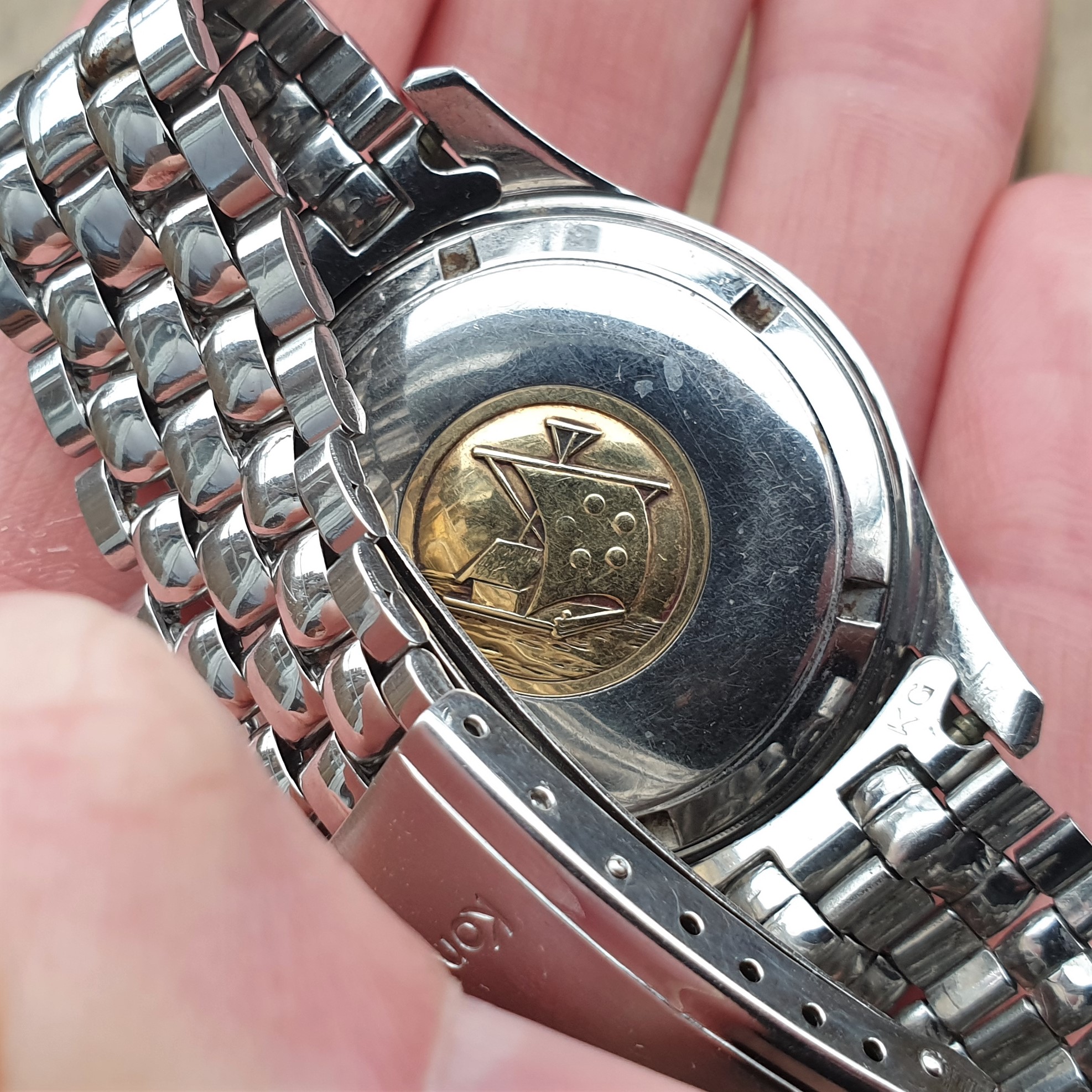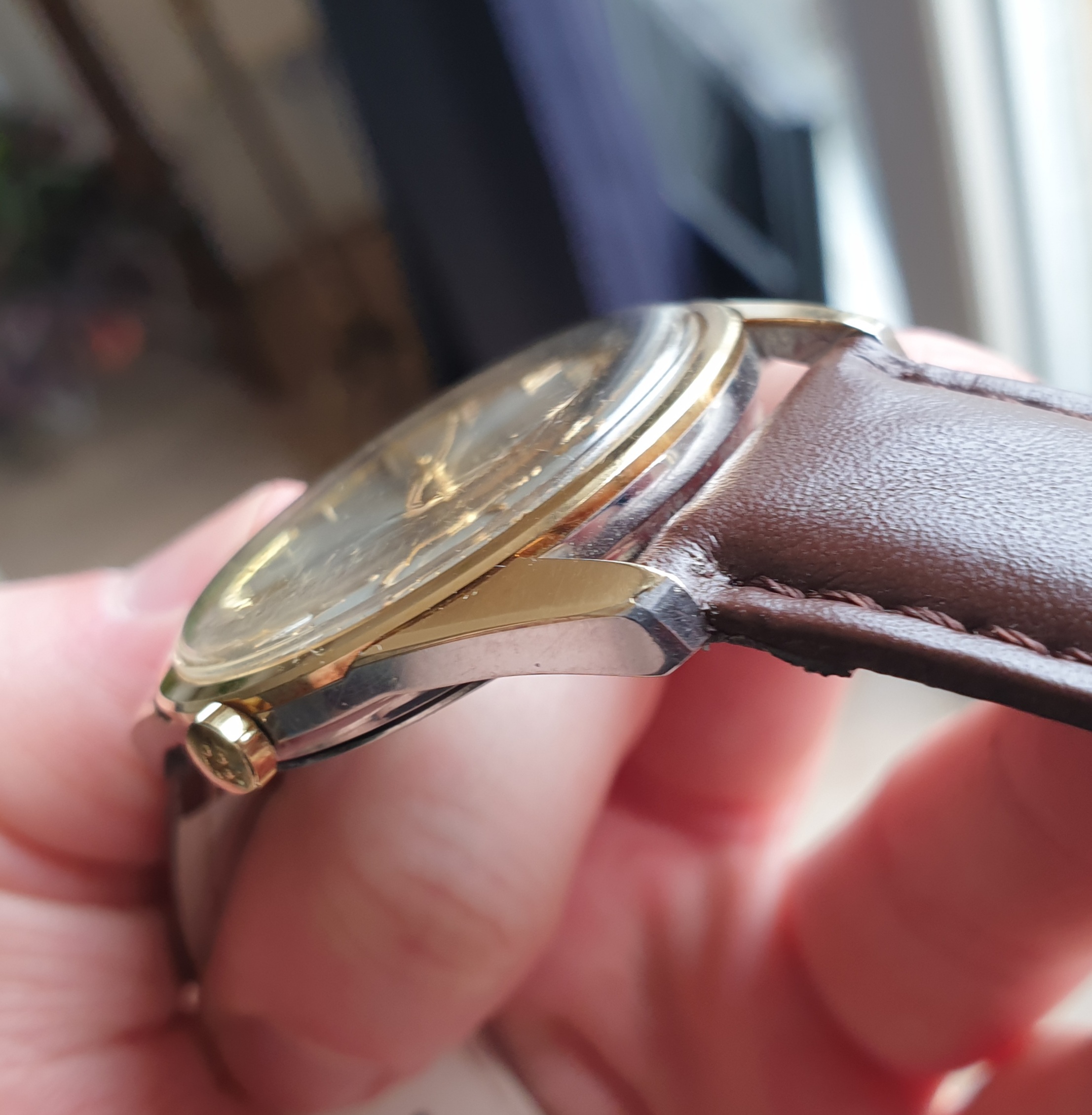 It seems to me a substantial amount of its gold cap is missing. I assumed the entire topside of the lug should be covered, but several people proposed perhaps it should be like this since the chamfer runs along smoothly on the bare steel, and all lugs show this exact thing.