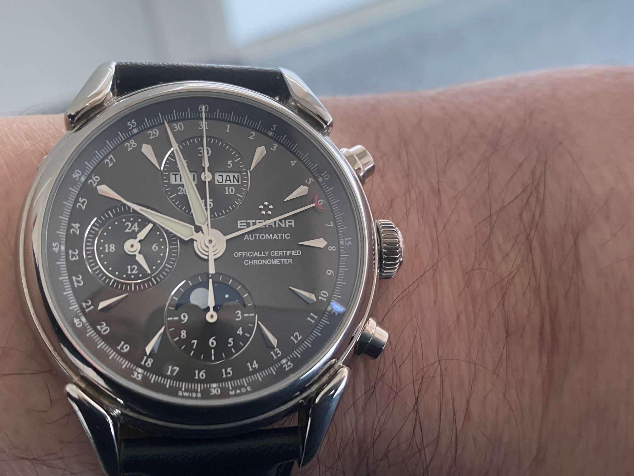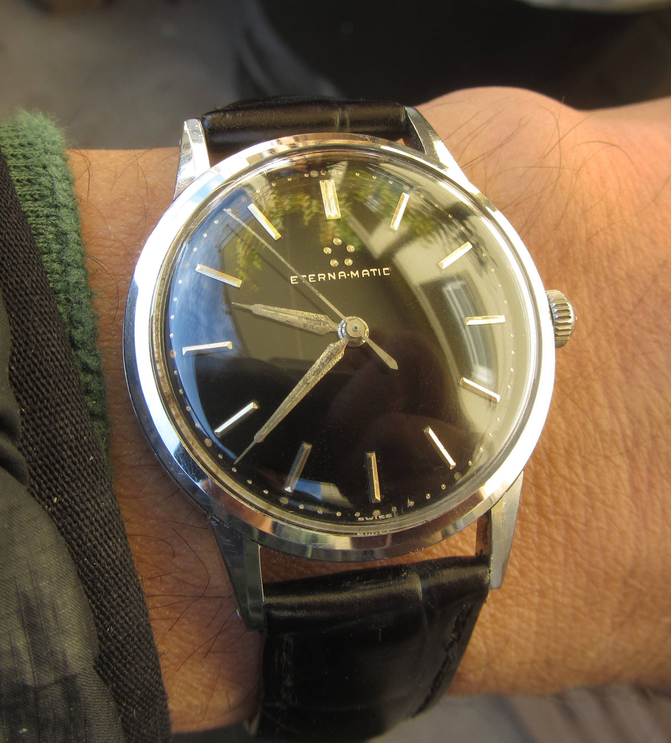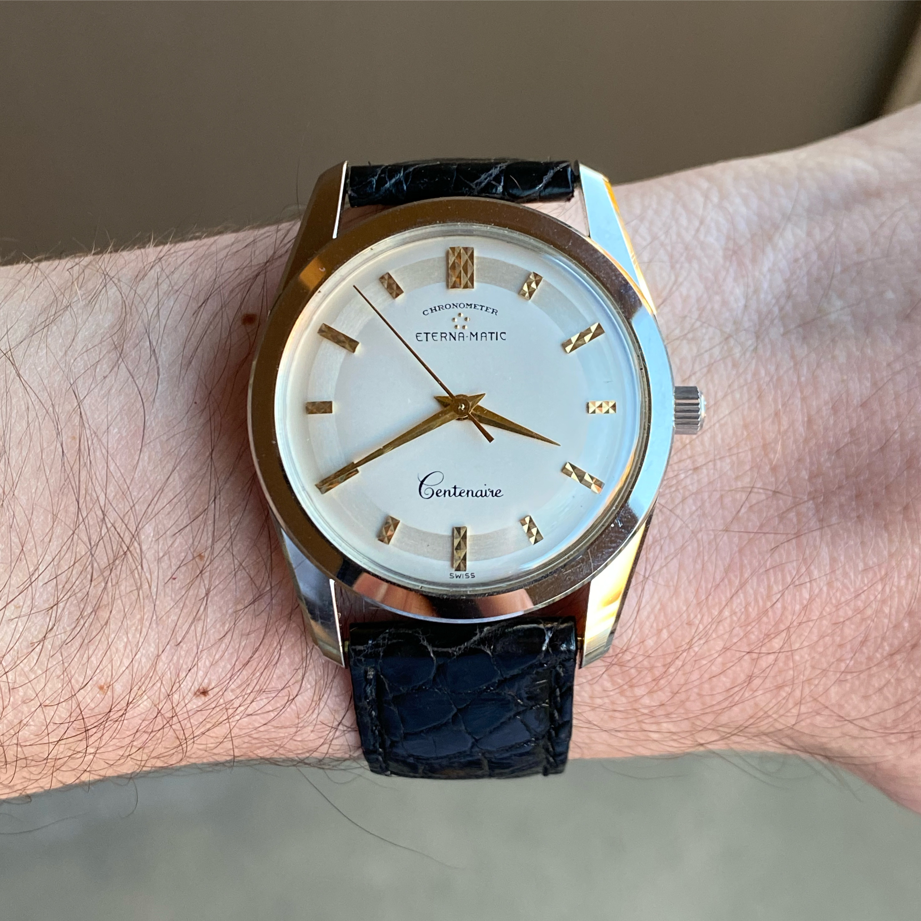 Based on the style of the hour markers and the fat 'Centenaire' font, I'd agree on '60s on your example. As I mentioned before, the round track appears to be unique. I haven't seen it before on any Eternas and it is most reminiscent of the Longines Conquest, i.e. my ref. 9000.