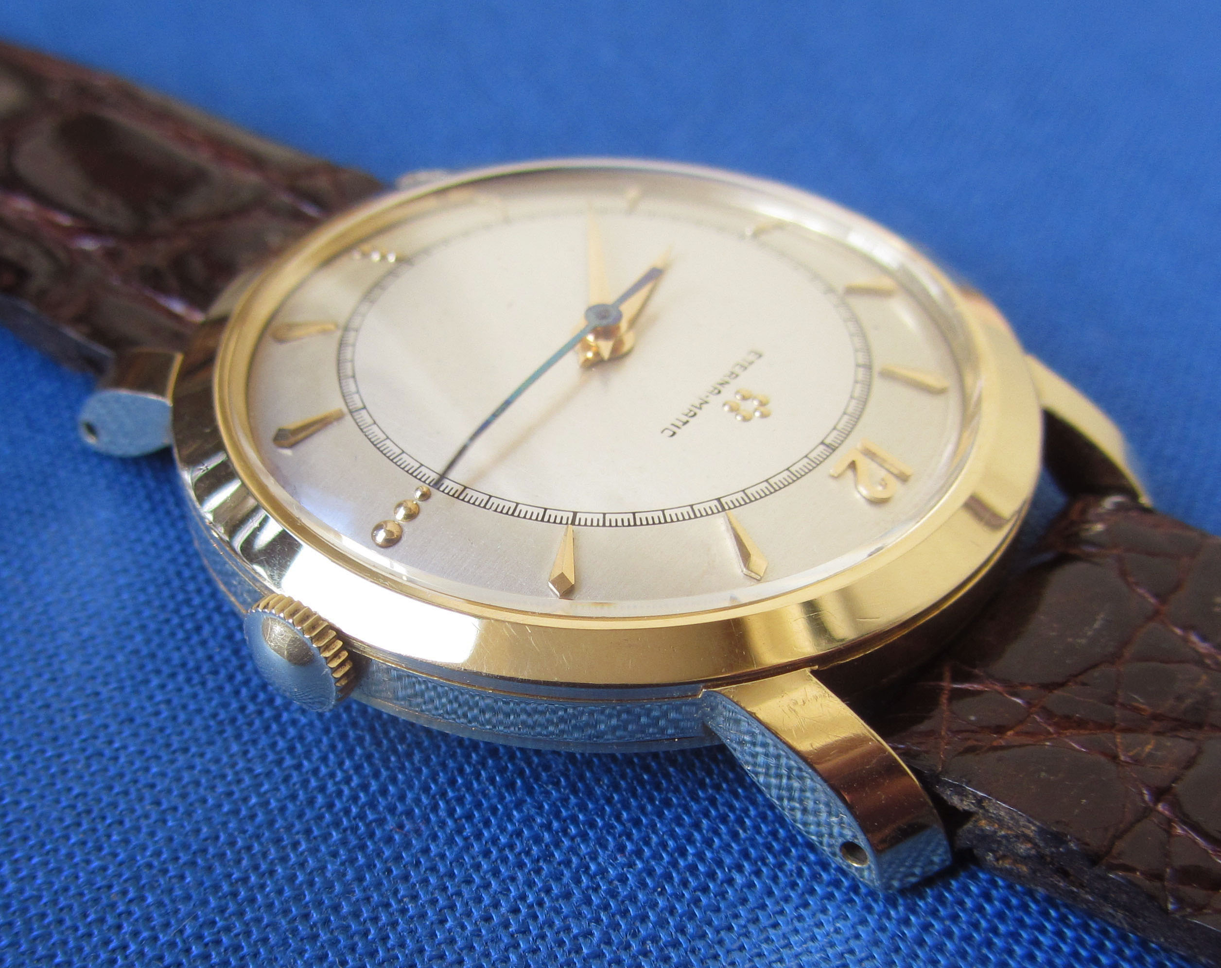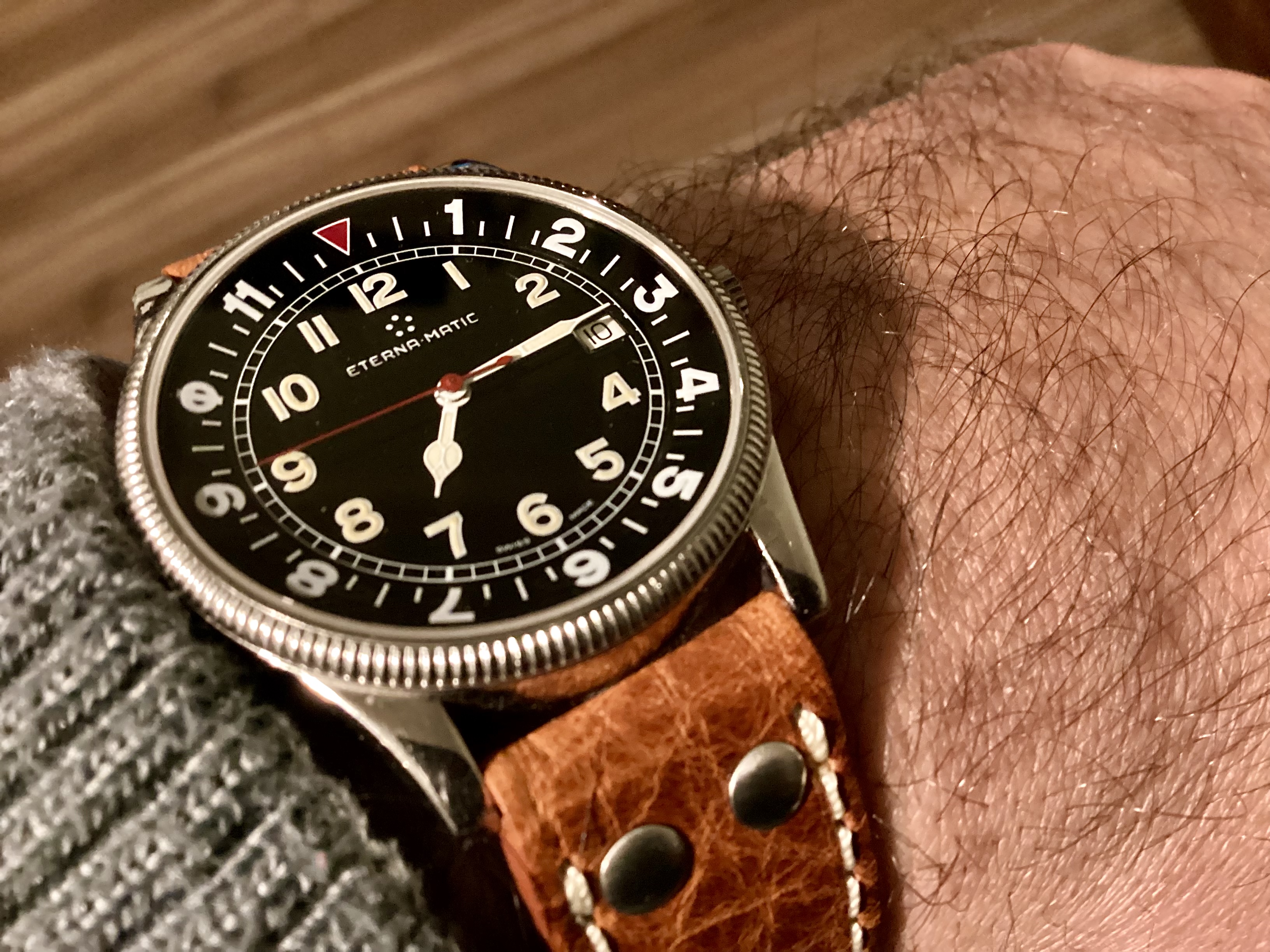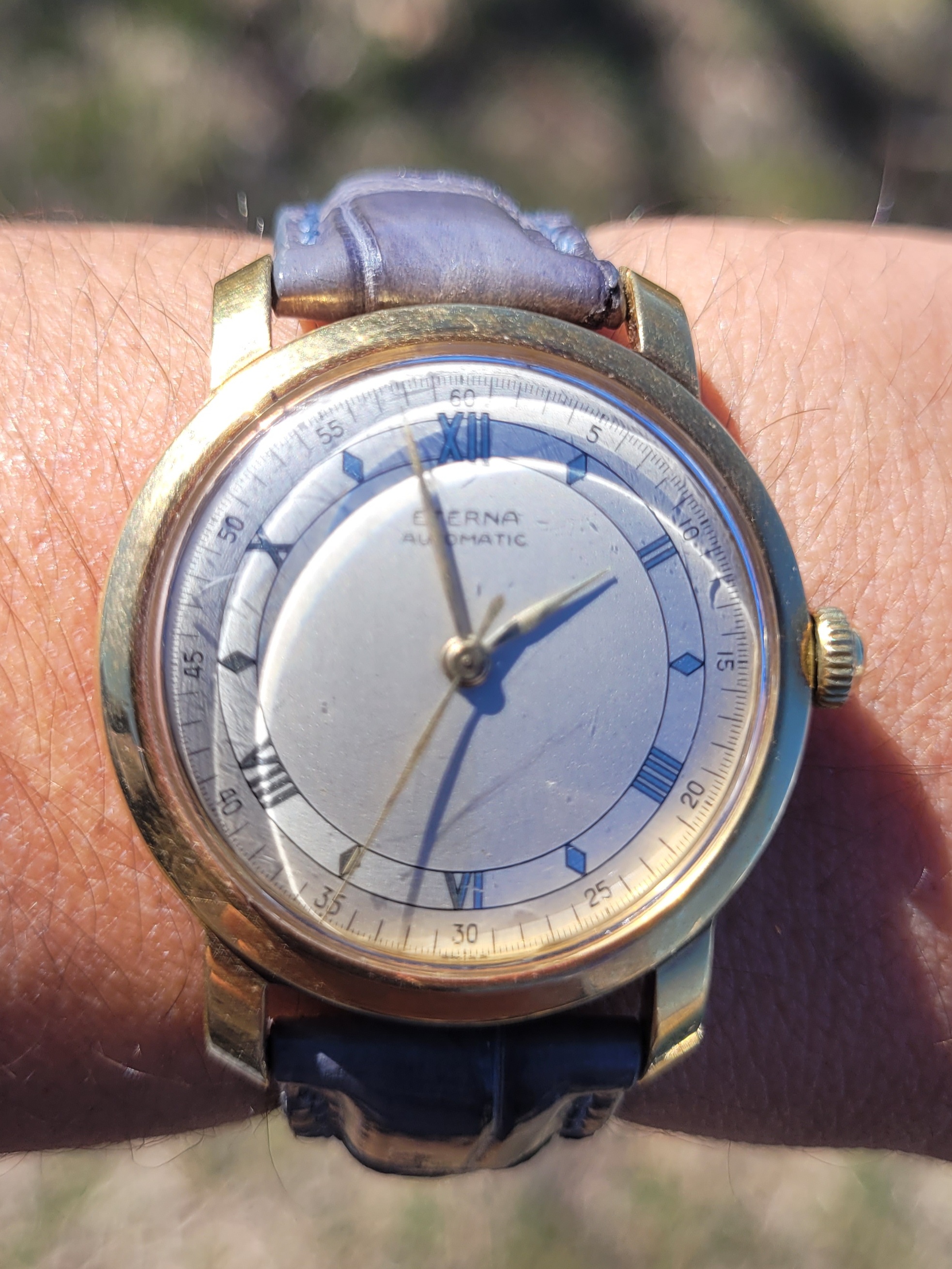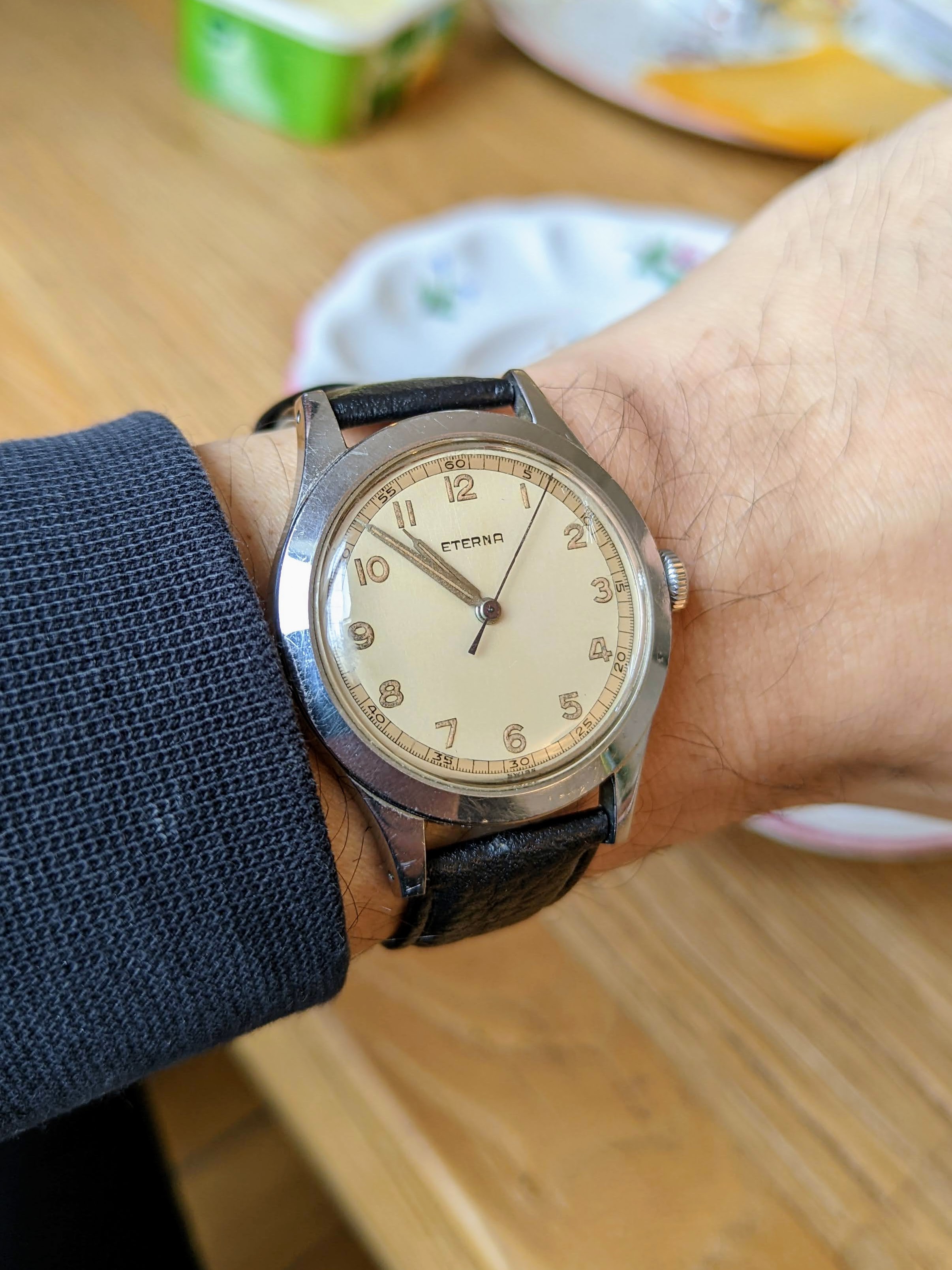 New arrival today: Eterna-Matic Centenaire with a perfect glossy black dial and to my surprise, really cool triple facetted lugs. The facets weren't visible on the seller's pictures.