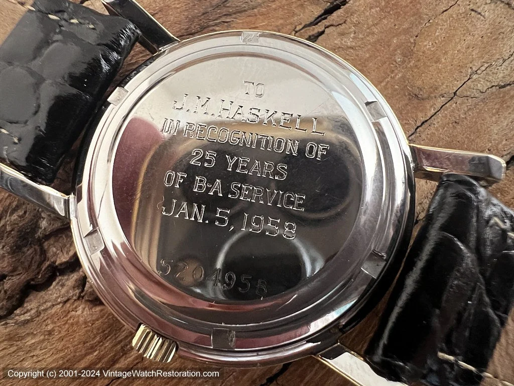 It has an engraving for 25 years of service in Jan 5 1958. Its case number is 5204958(and movement serial number 5472888)