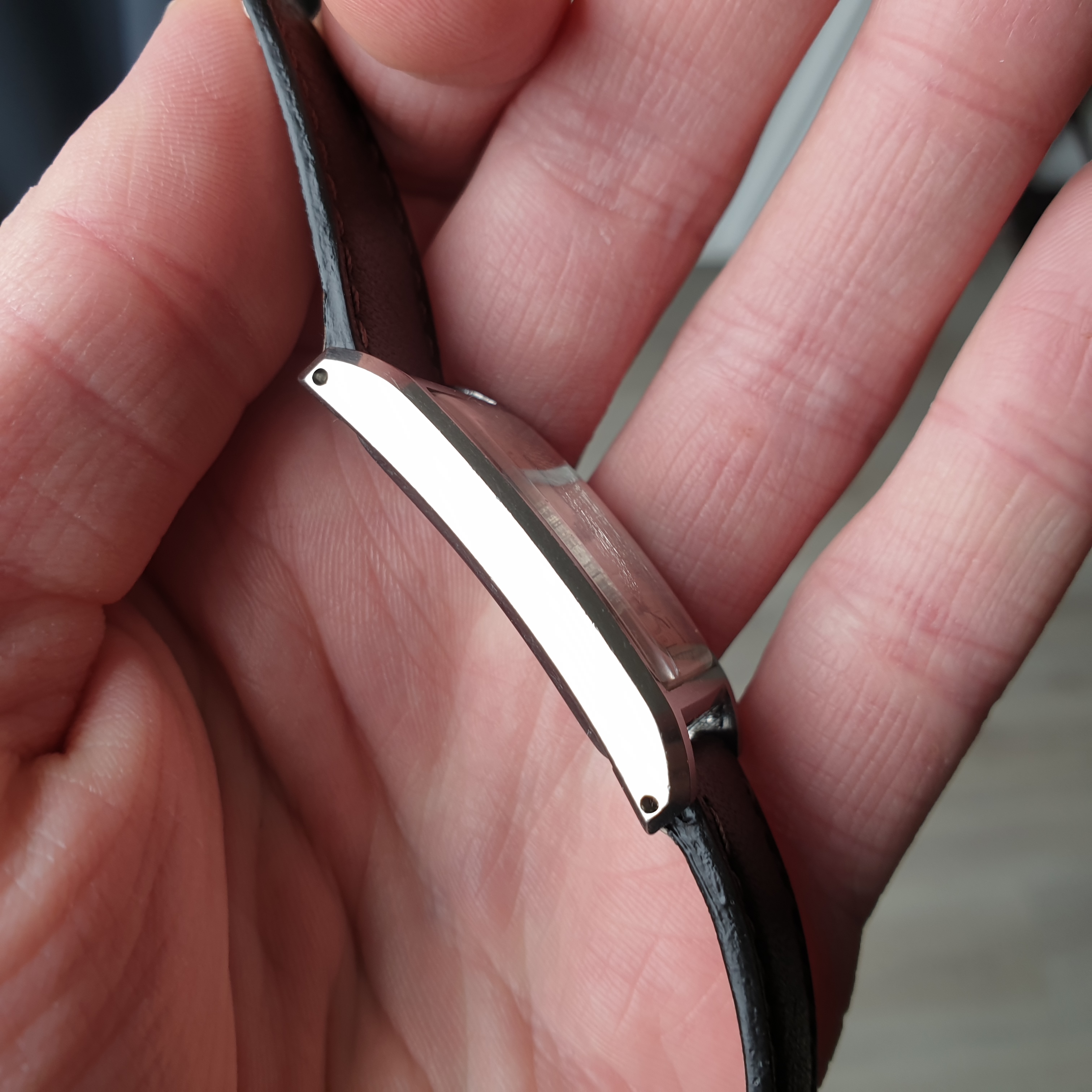 This watch has many highlights. It is rectangular, obviously, which is an uncommon sight. The case is very well-designed and manufactured, featuring intricate chamfers that elongate the wrist-presence of the case, as well as drilled lug-holes. The case and case back are curved ever so slightly (they are slightly hollow), hugging your wrist comfortably and avoiding sliding action, even when wearing it more loosely.