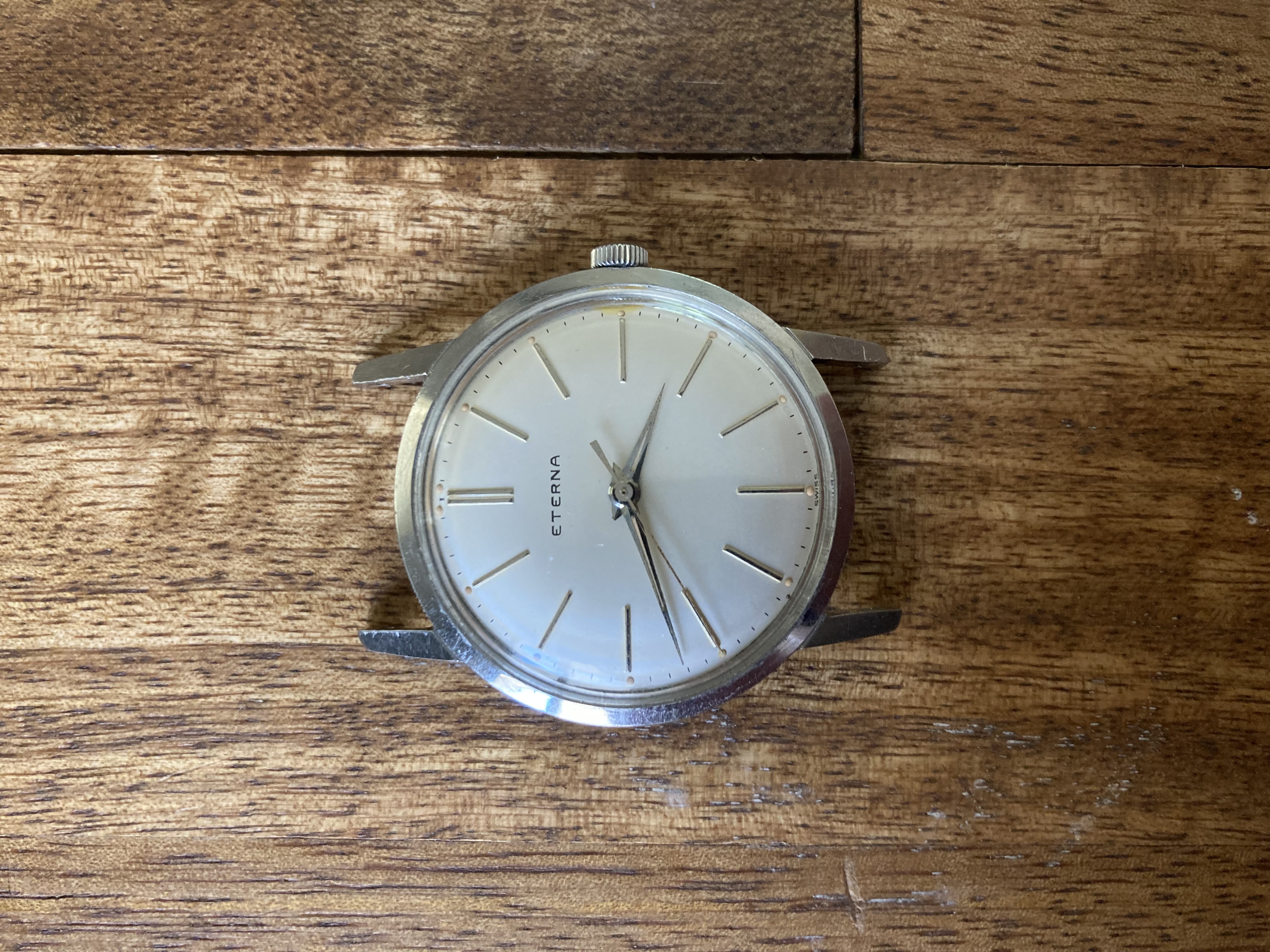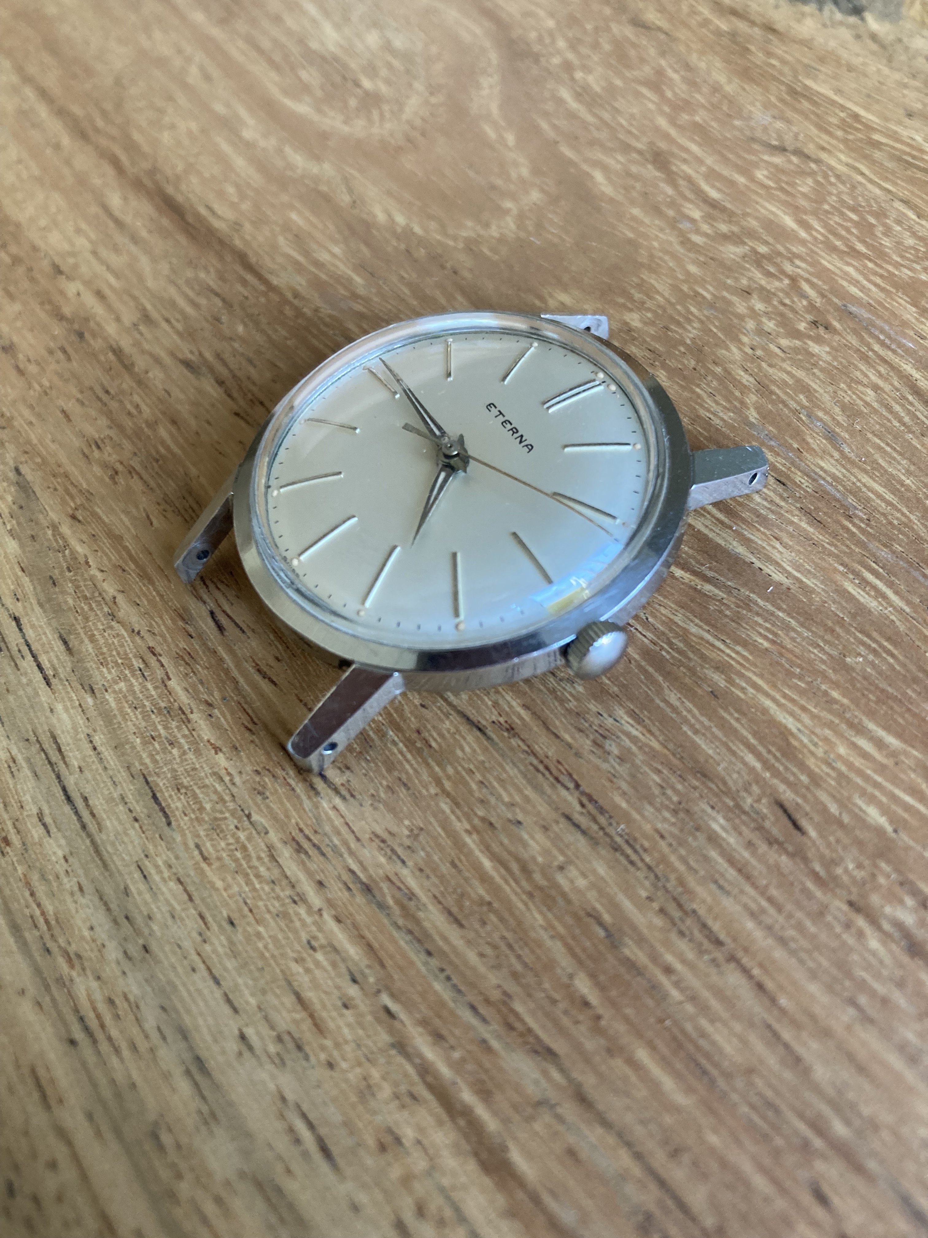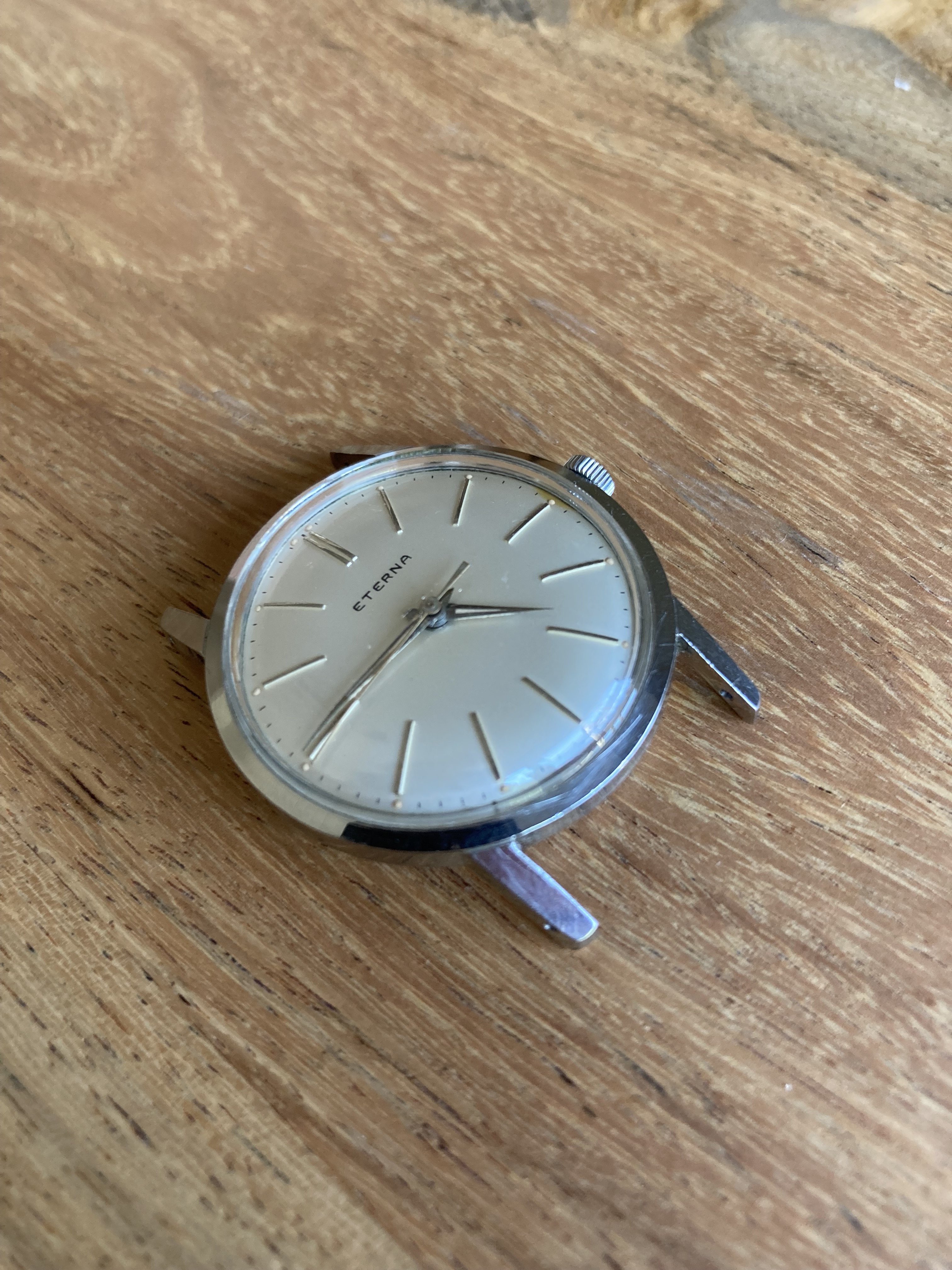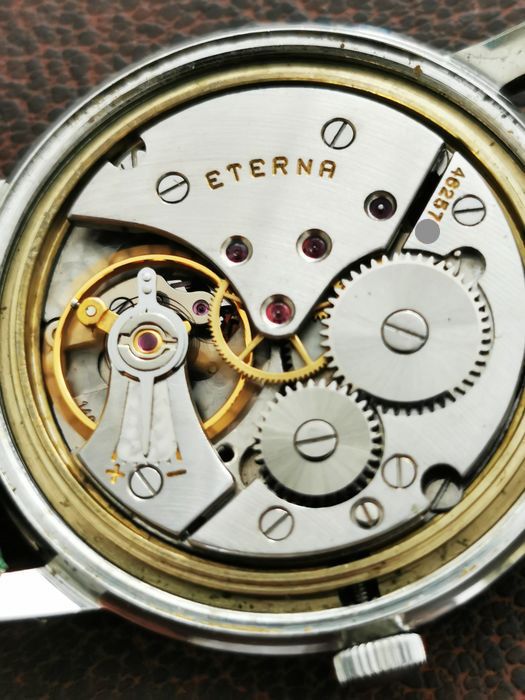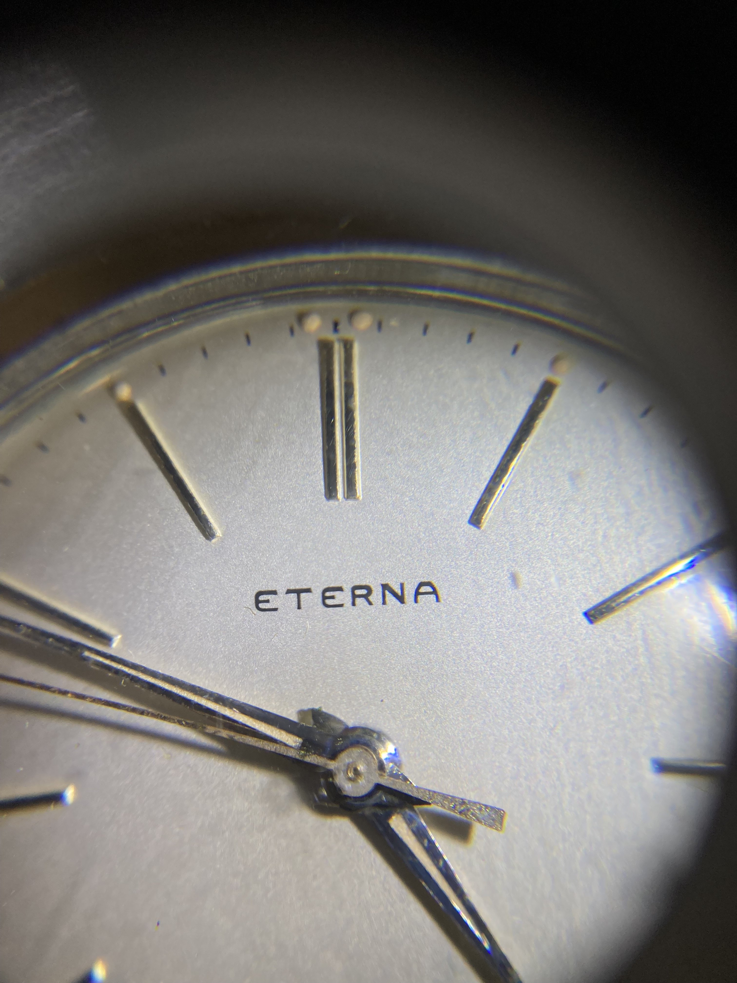 I would think the dial is too flawless for a watch of this age. And although there does appear to be some variation in the typeface used by Eterna, this one seems off. There doesn't seem to be enough line thickness variation, the spacing between the E and R looks to be too close, and the A seems different from other variants.