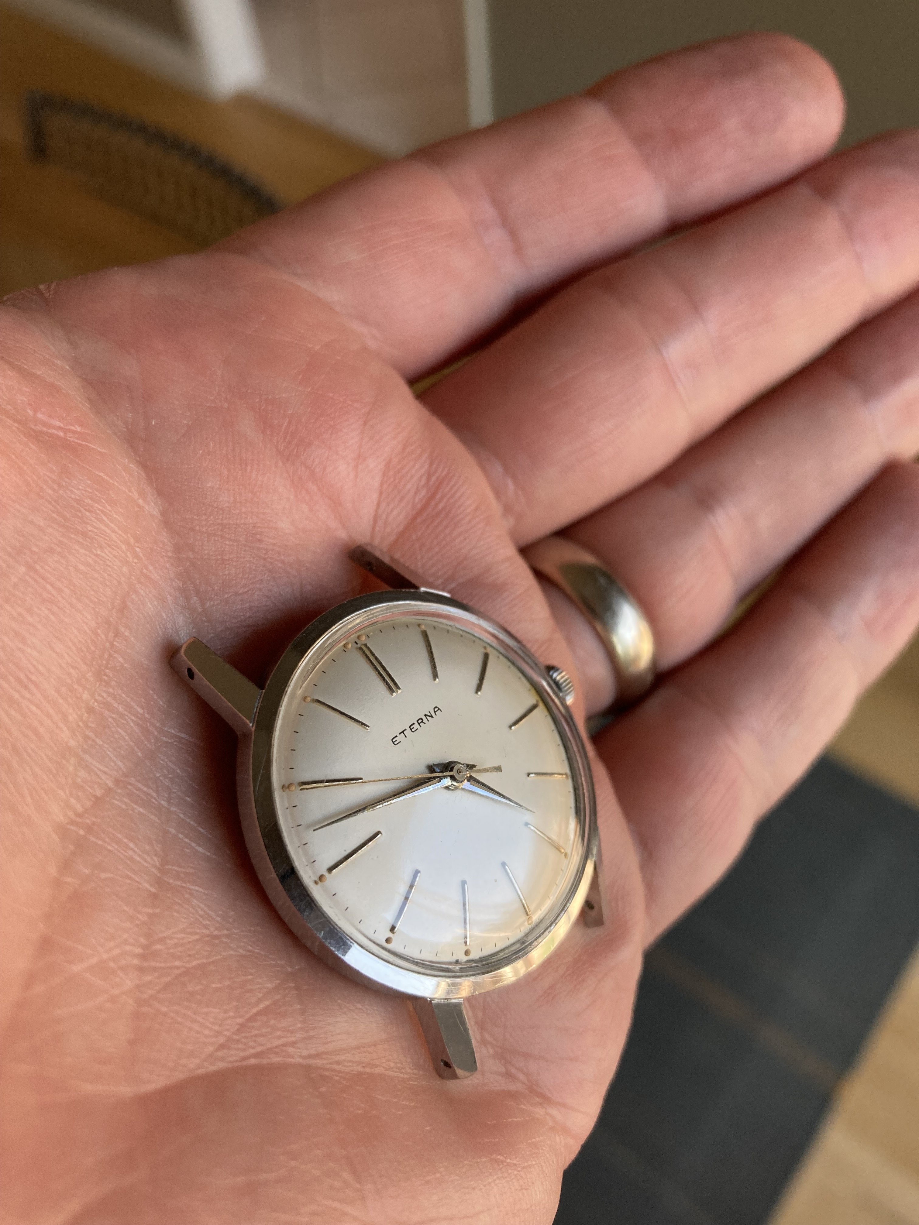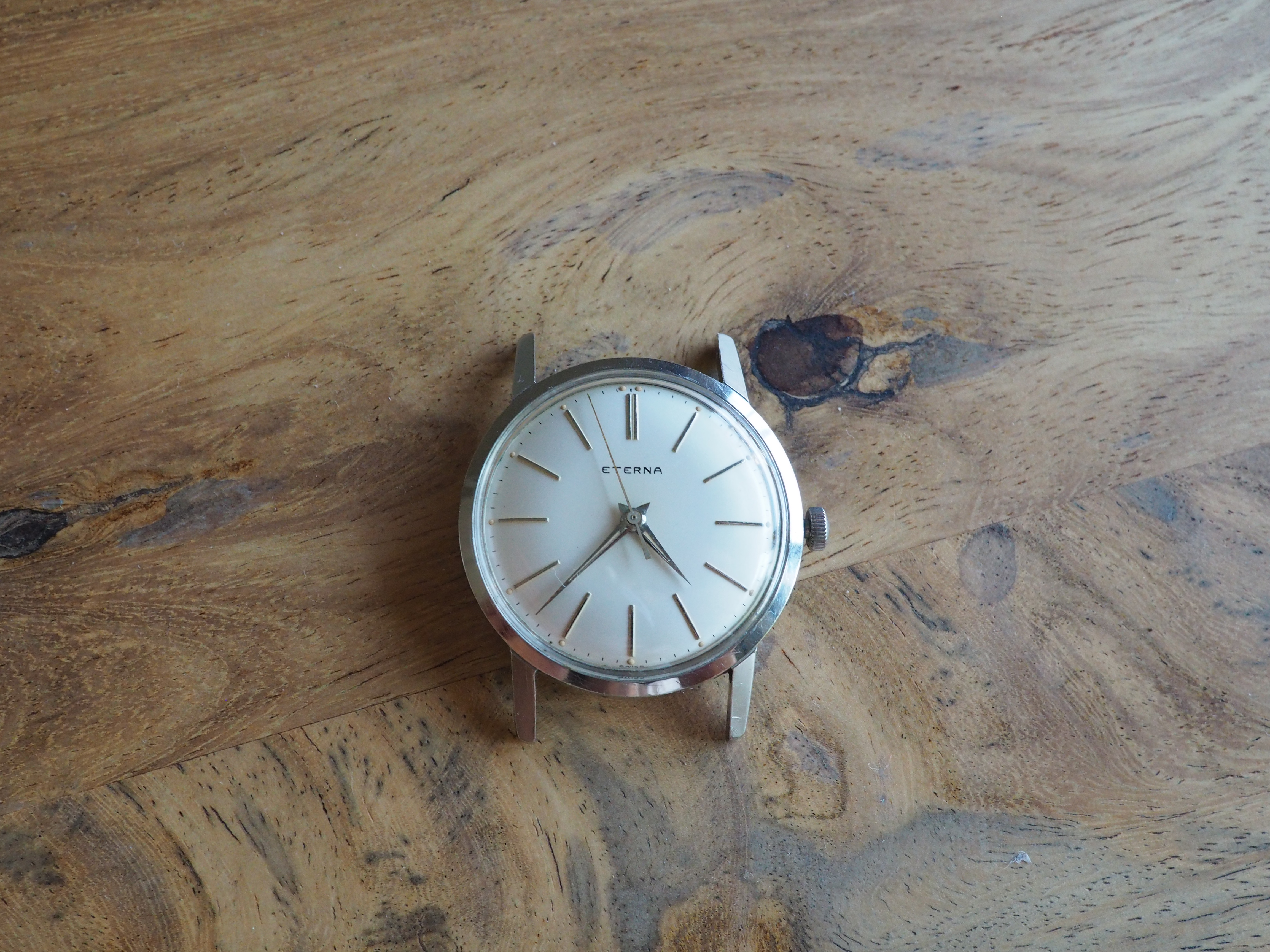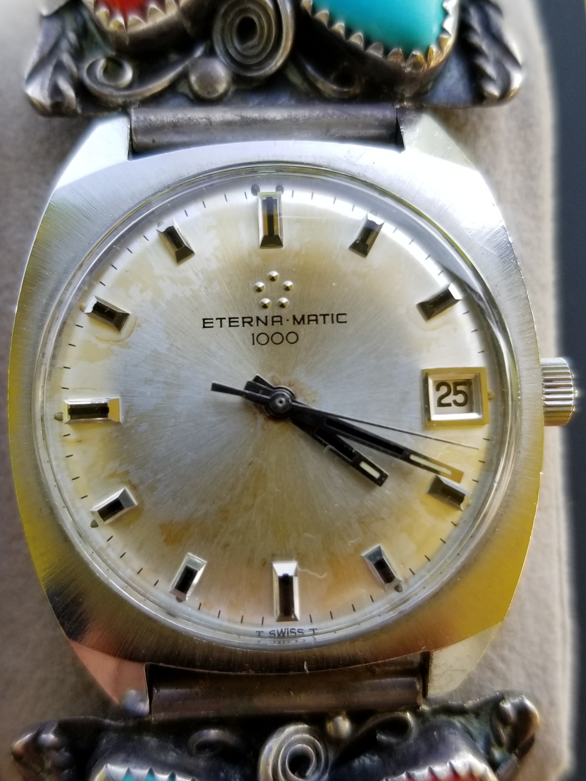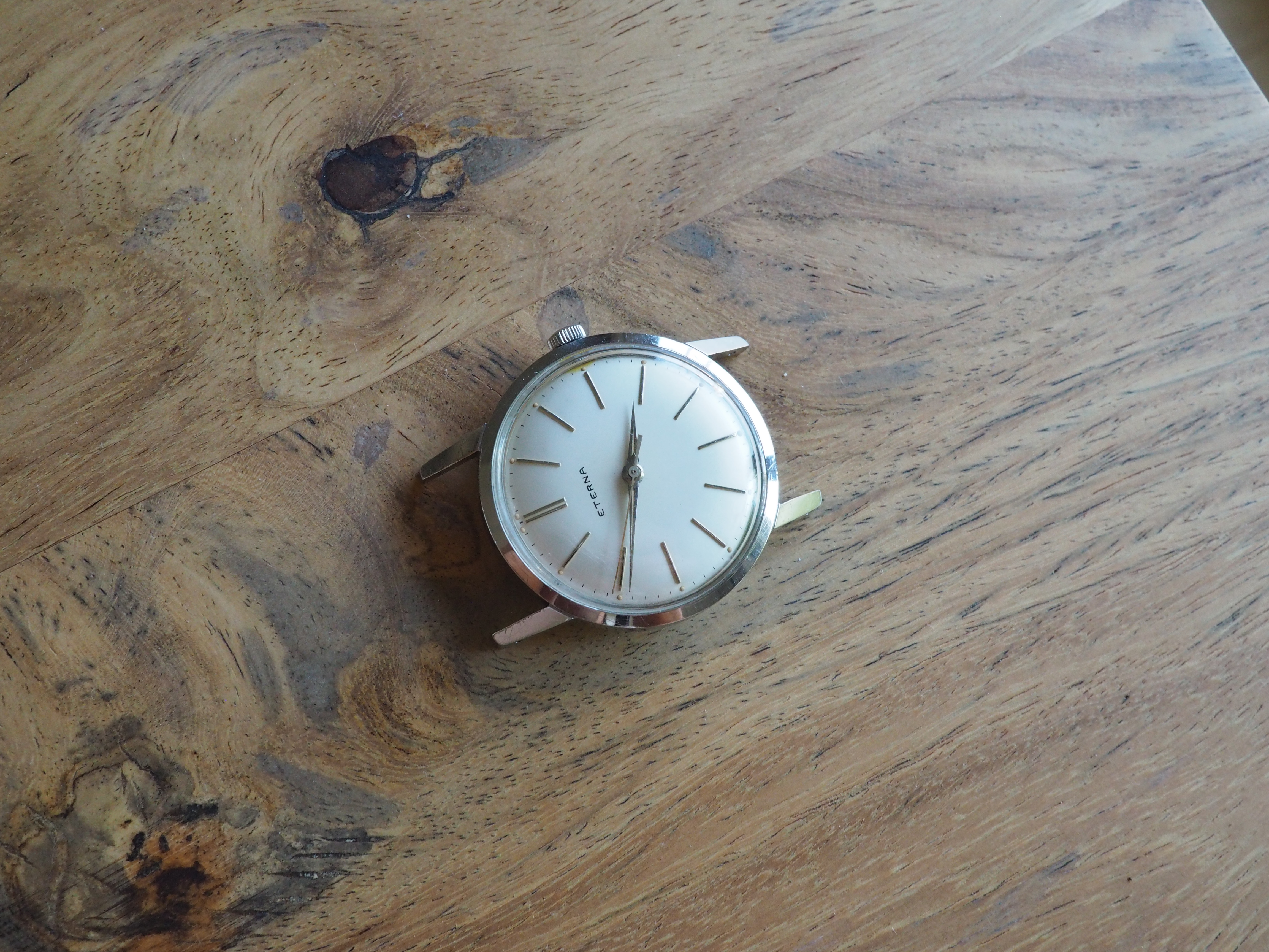 I would think the dial is too flawless for a watch of this age. And although there does appear to be some variation in the typeface used by Eterna, this one seems off. There doesn't seem to be enough line thickness variation, the spacing between the E and R looks to be too close, and the A seems different from other variants.