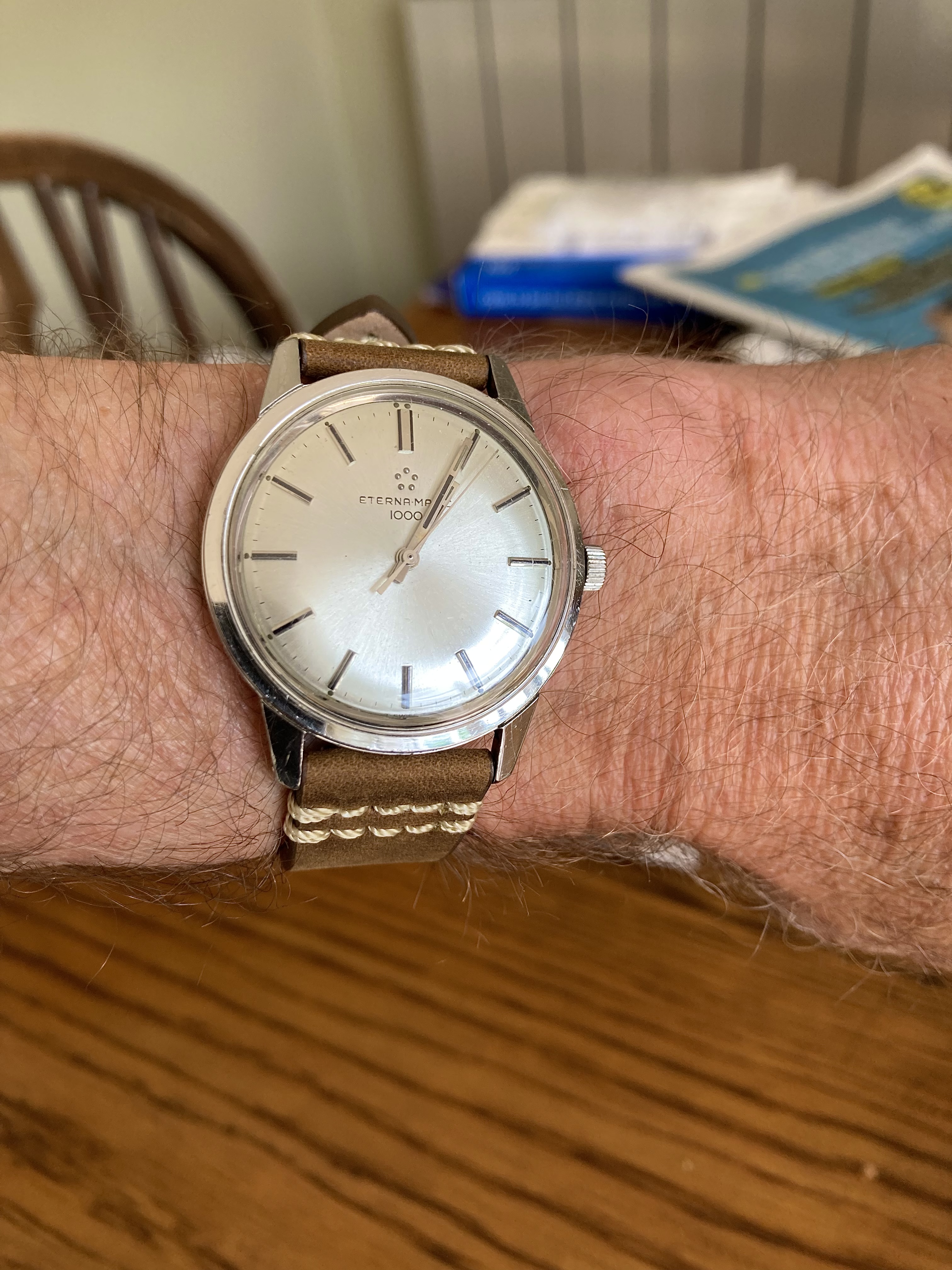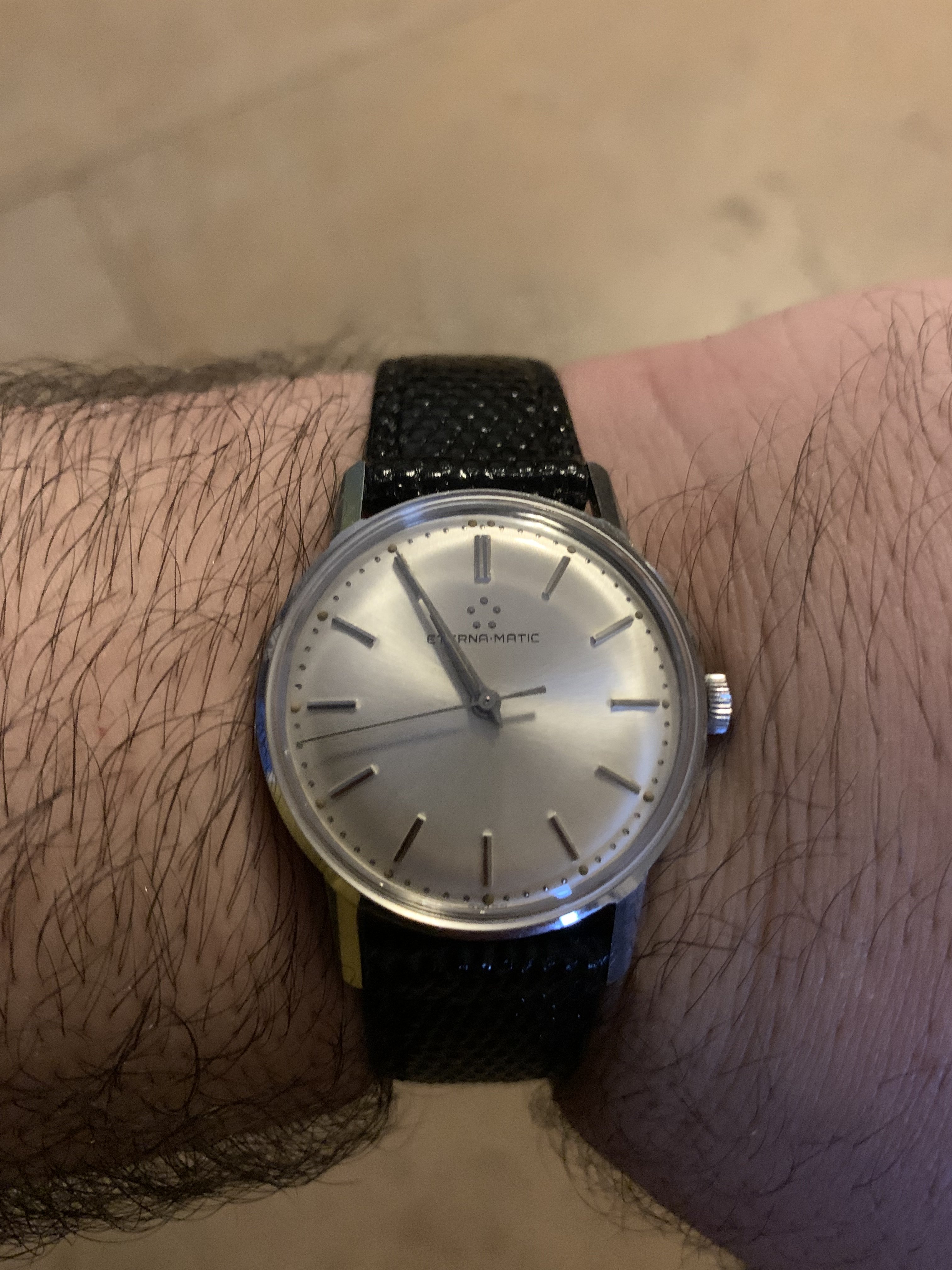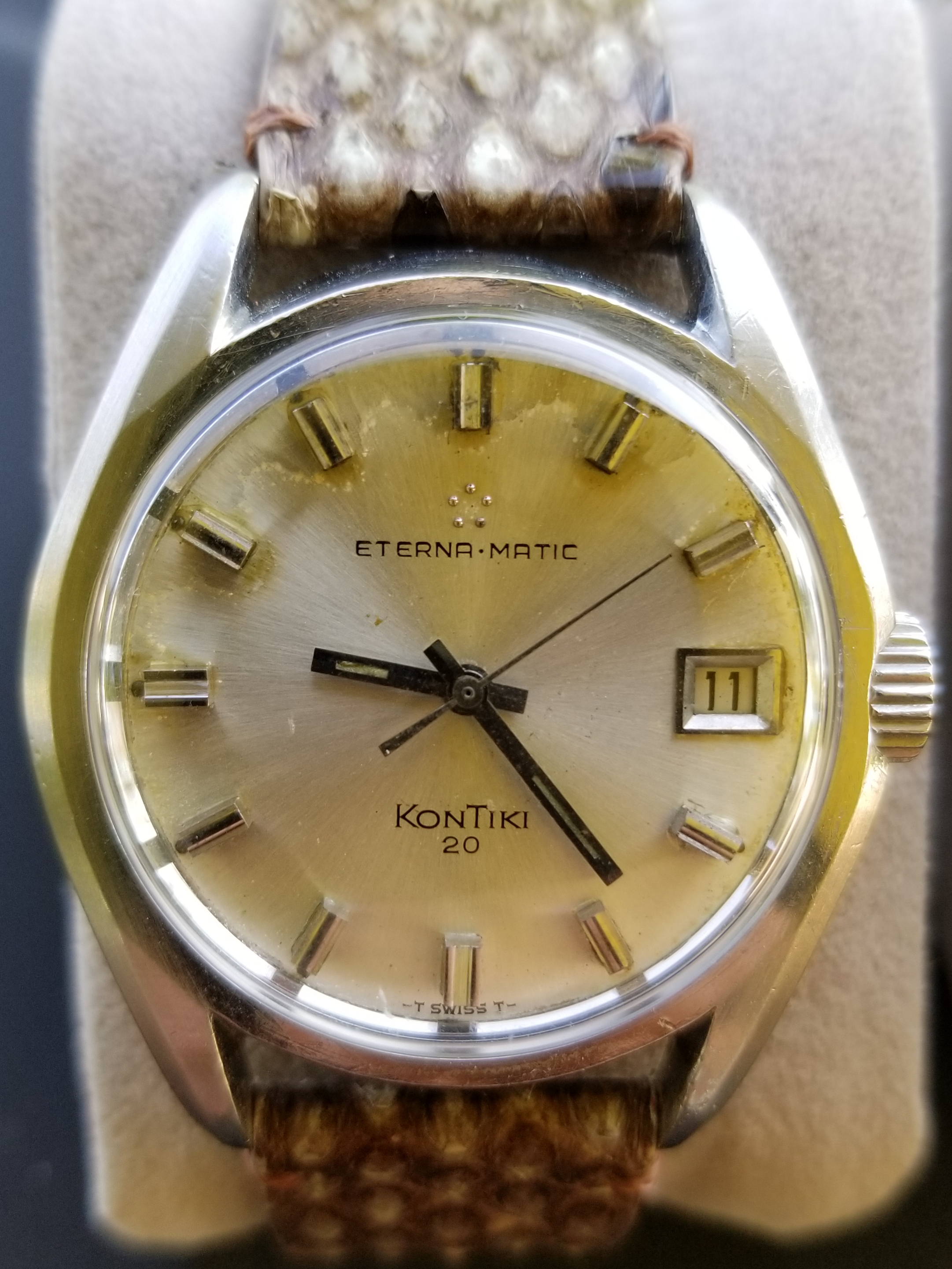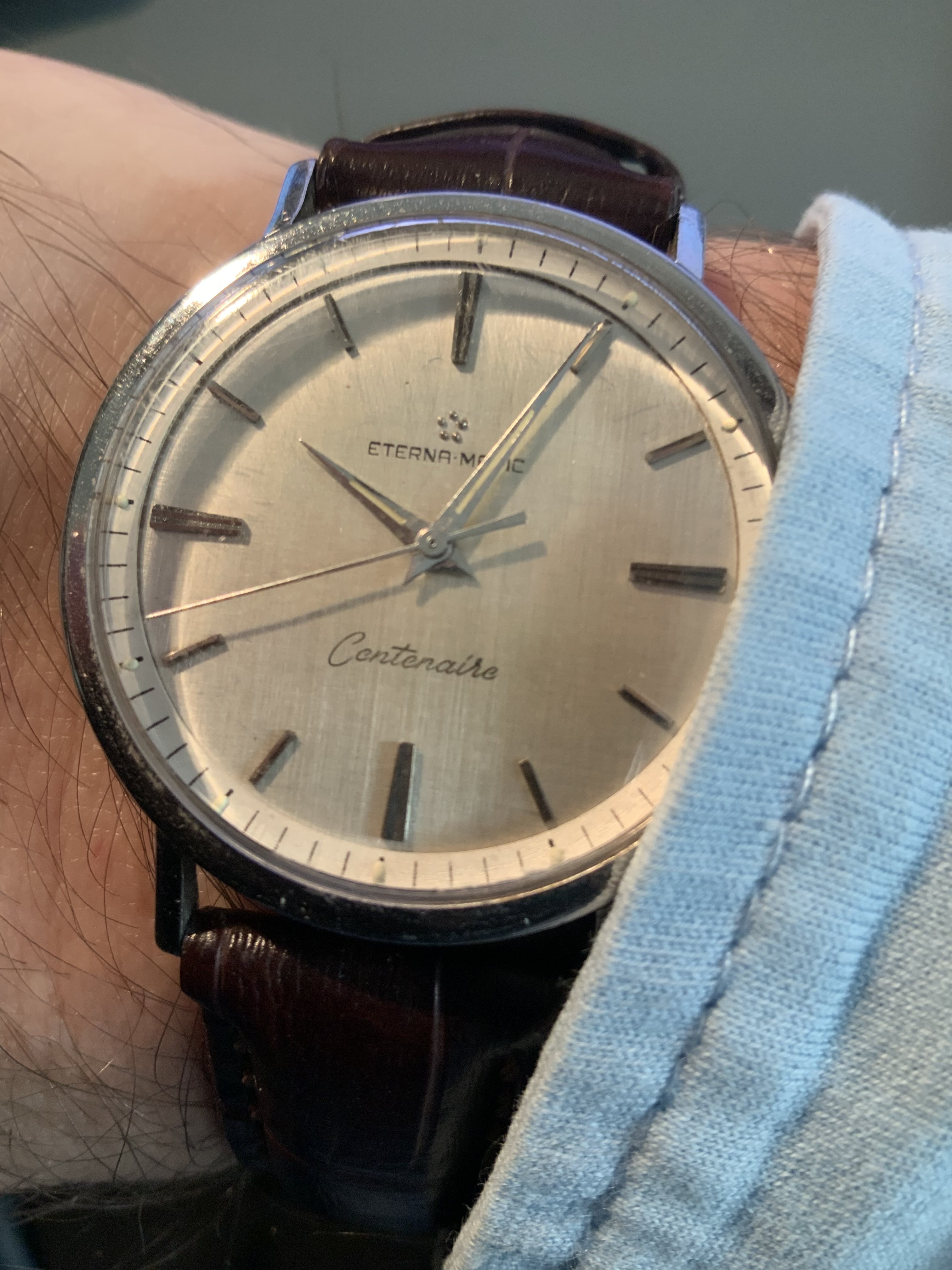 I would think the dial is too flawless for a watch of this age. And although there does appear to be some variation in the typeface used by Eterna, this one seems off. There doesn't seem to be enough line thickness variation, the spacing between the E and R looks to be too close, and the A seems different from other variants.