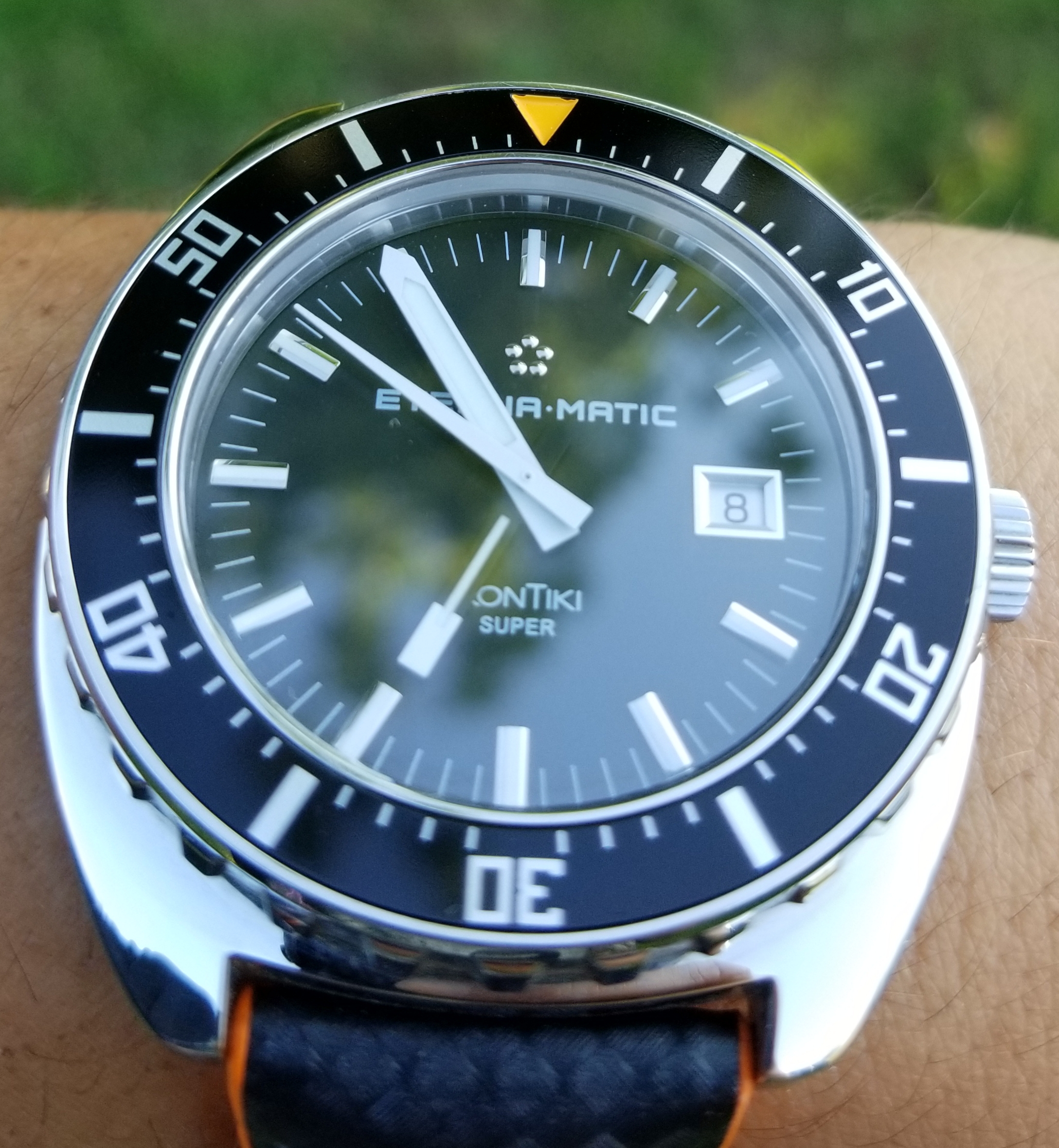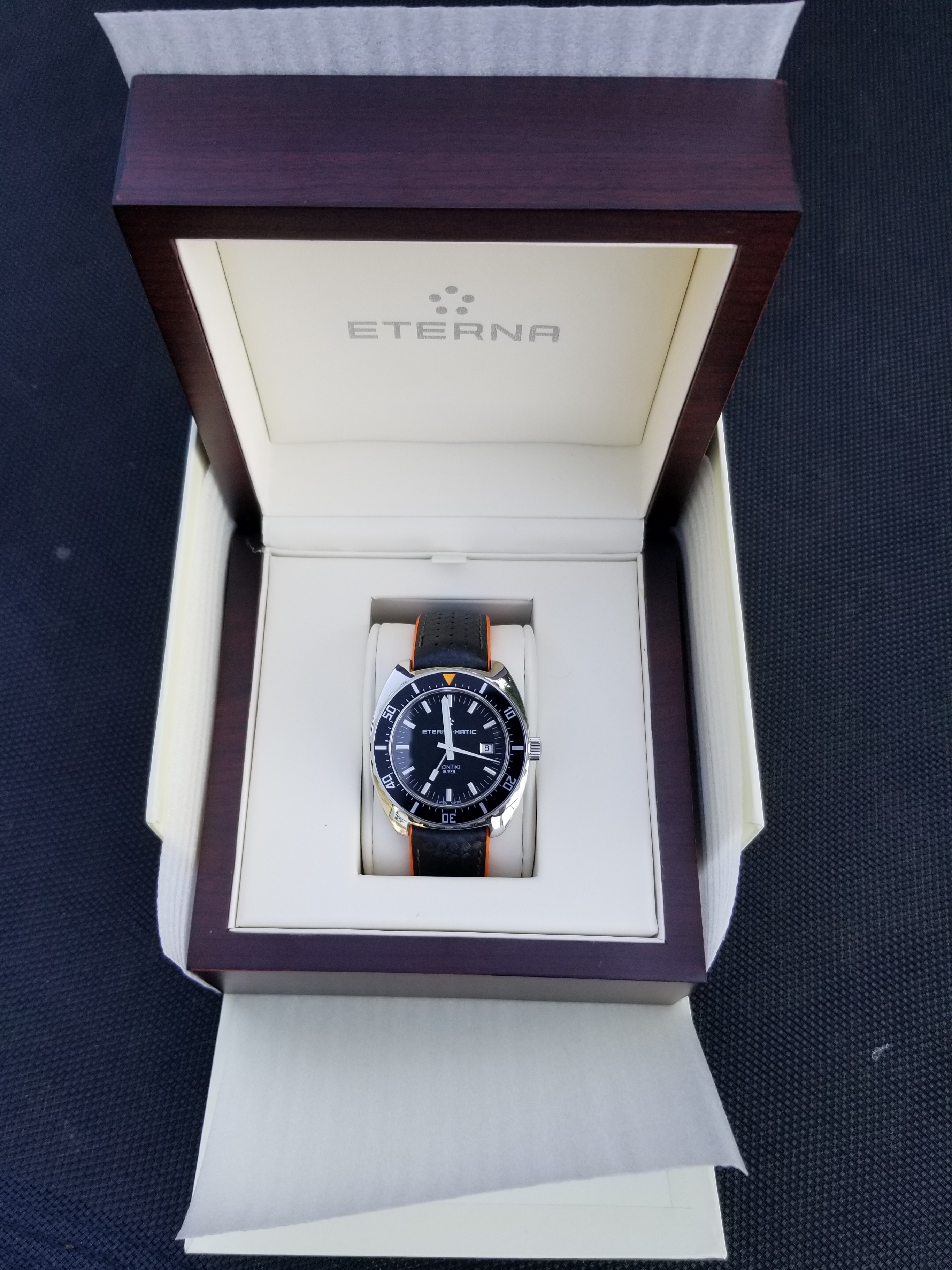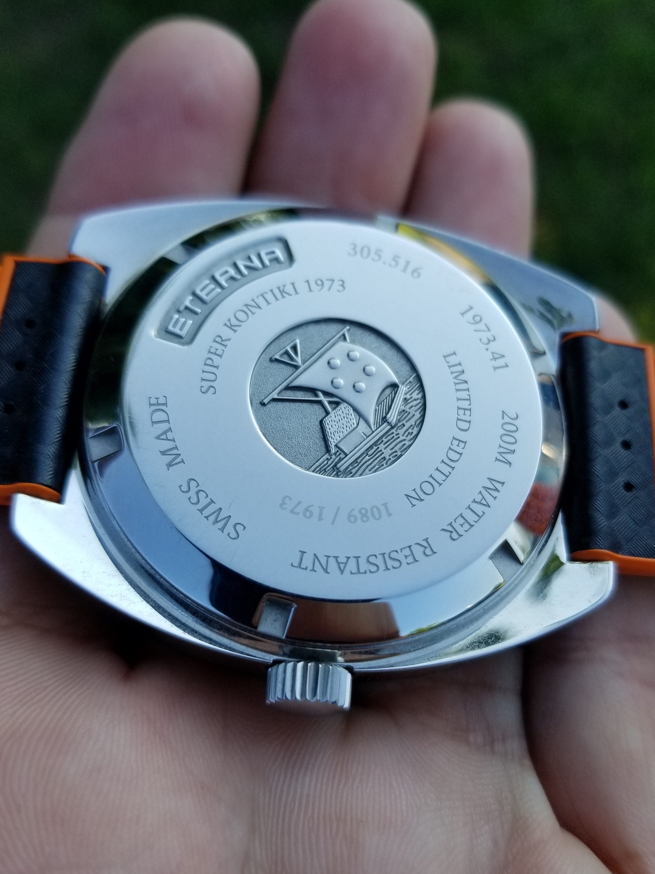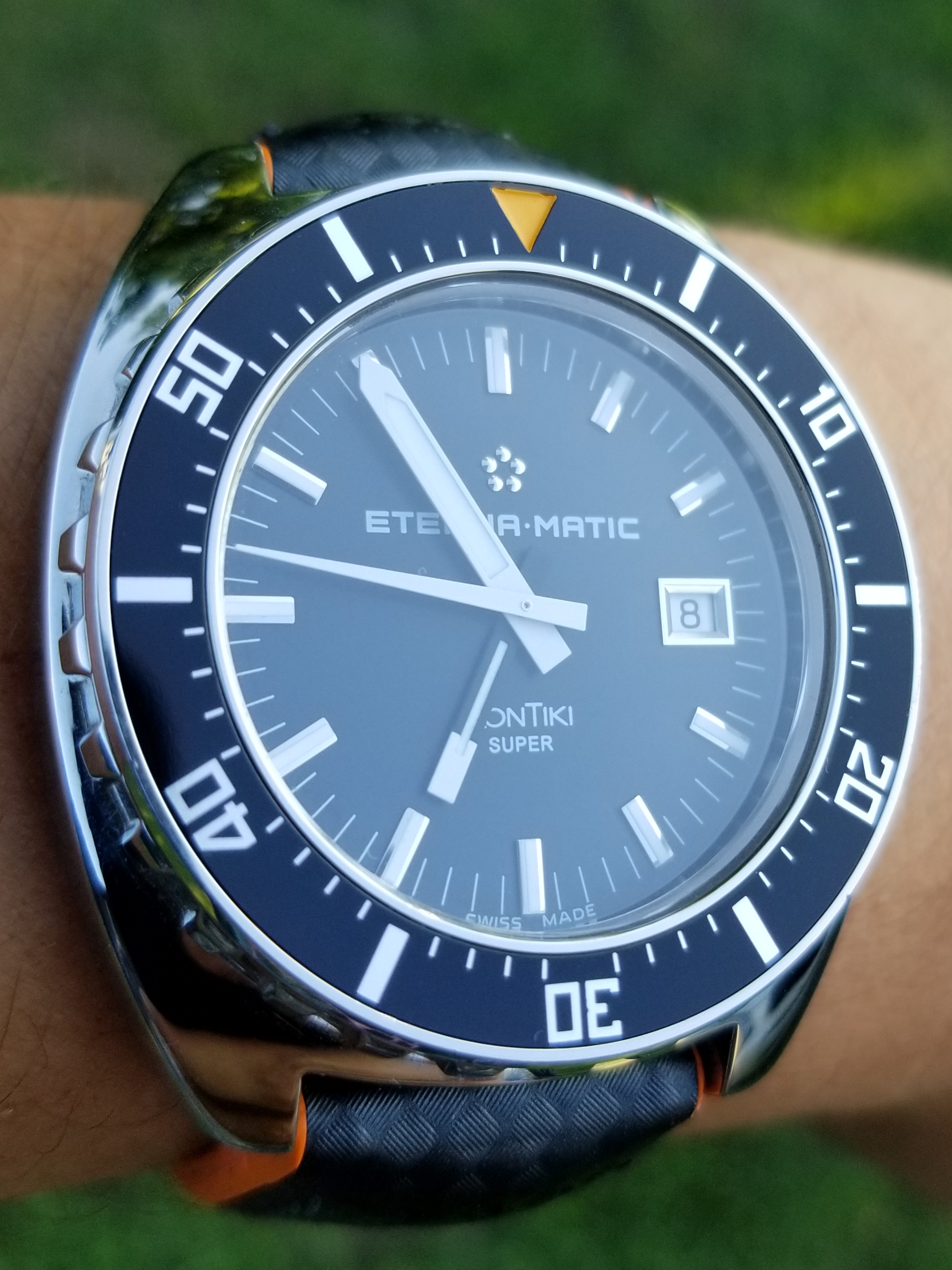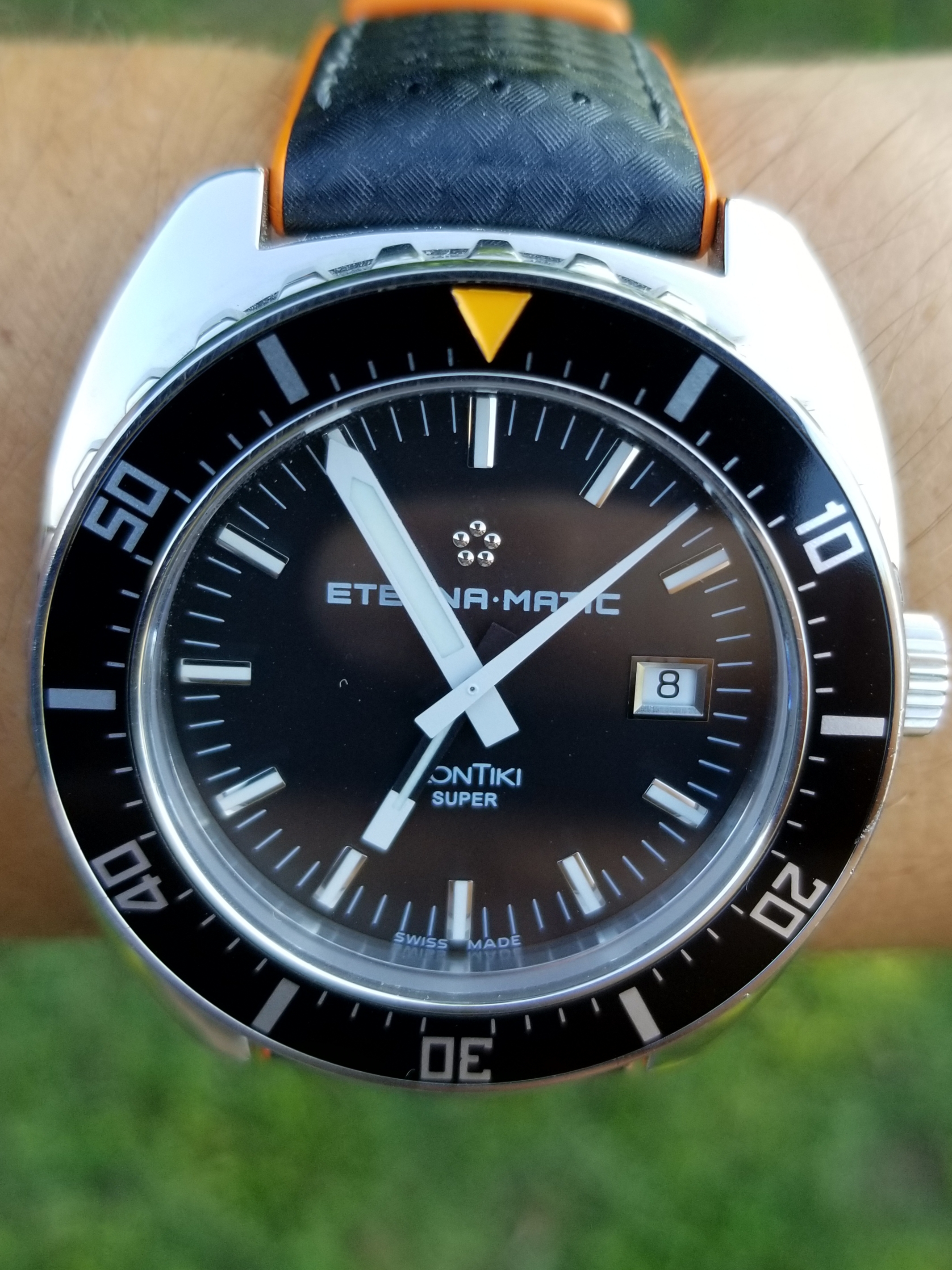 ·Here is my limited edition Eterna Super KonTiki 1973 made in 2010. I am the second owner of this watch and have had it for about three years. I've worn it very little, mostly on vacation. It runs well and has no issues. I've swam with it on several occasions but never dived with it. The original owner had the bracelet cut down to fit his small wrist, it will fit a 7 1/2" wrist but barely. I currently have it on a Hirsch strap that I find more comfortable than the orginal. Sold for $900 USD.