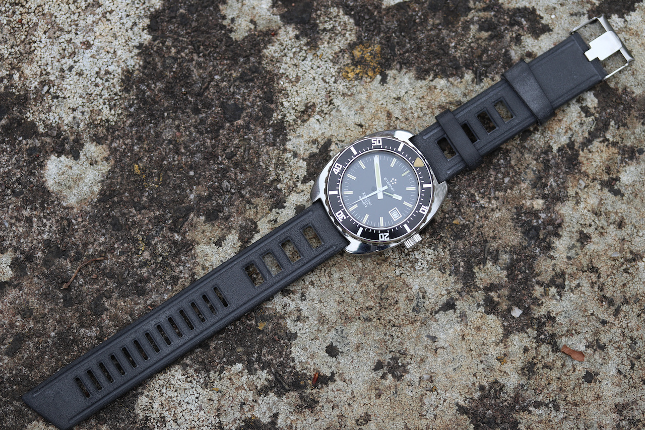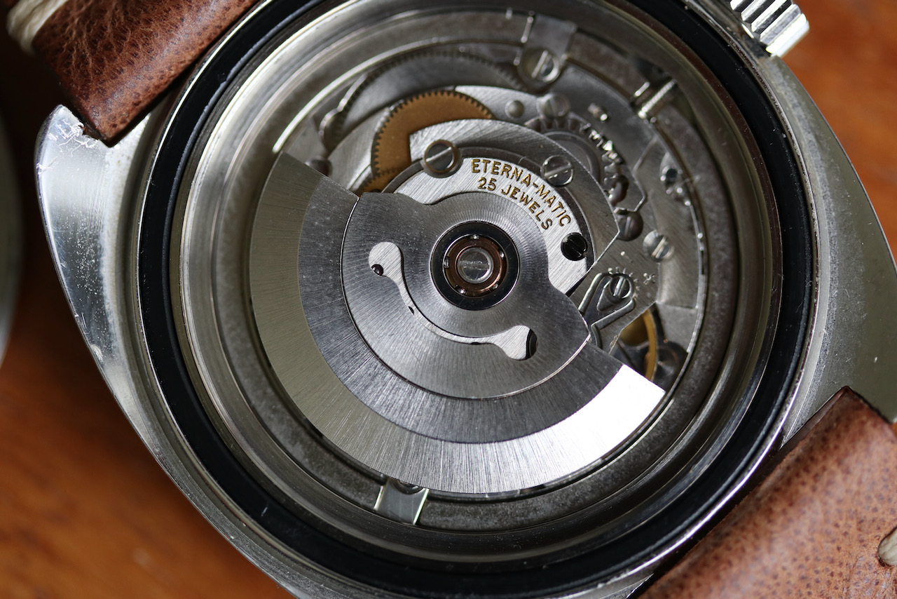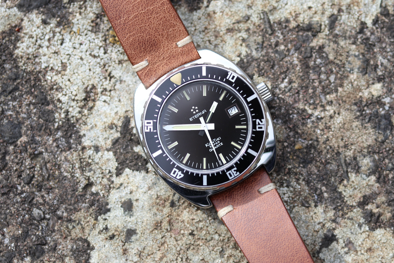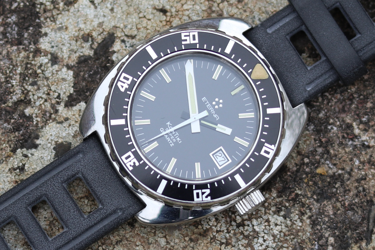 ·Eterna Super Kontiki Diving watch from the mid 1970s. This is the watch made famous through its use by the IDF special forces. It is the definition of a tool watch, with well thought out features for its intended use. The hand set is particularly clever with the hour hand partially blacked out to avoid any distraction from the minute hand while diving. The second hand has a similar treatment by locating the lume pip on the tail of the hand rather than the tip to maintain a clear view of the minute hand.