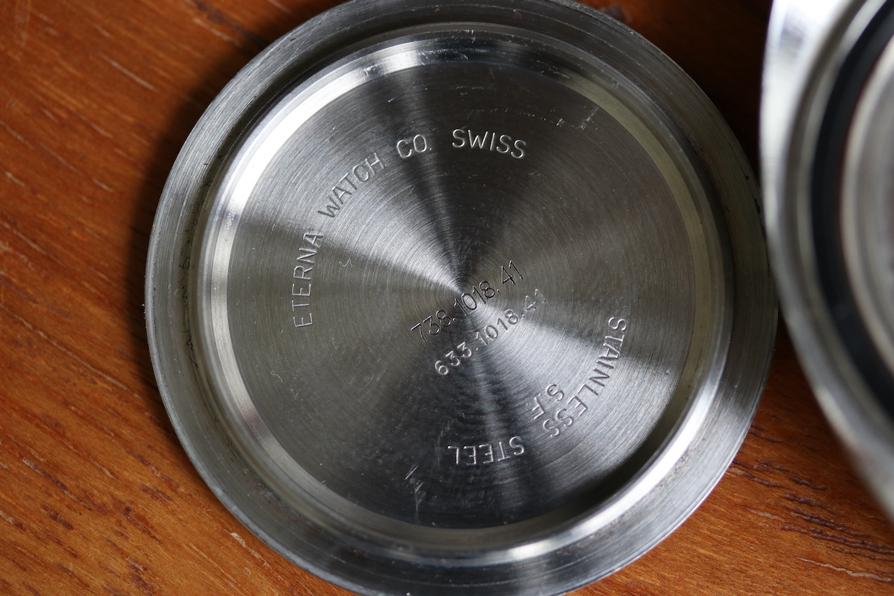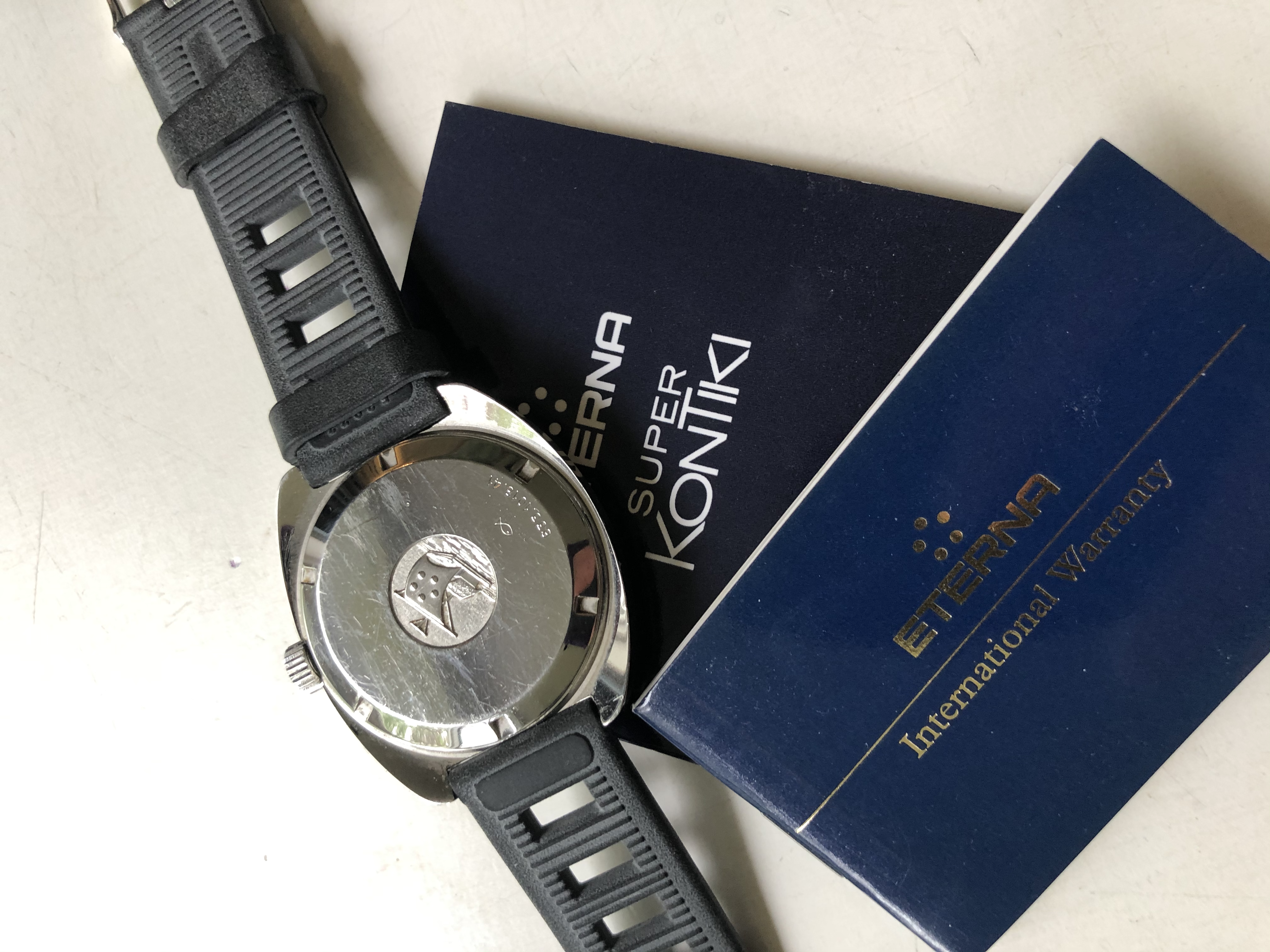 This watch has a slight anomaly in that the dial is marked Quartz, and the case is double stamped with two reference numbers, one standard to all these watches and another that I assume relates to a quartz version. This watch has an Eterna automatic movement, as per the 1973 model. I have never seen another Quartz Super Kontiki in this model, just some Hummers. This watch was not sold until 2001, having sat unloved in a Sardinian Jewelers for more than 20 years! It is in superb condition and comes with papers from the original sale.