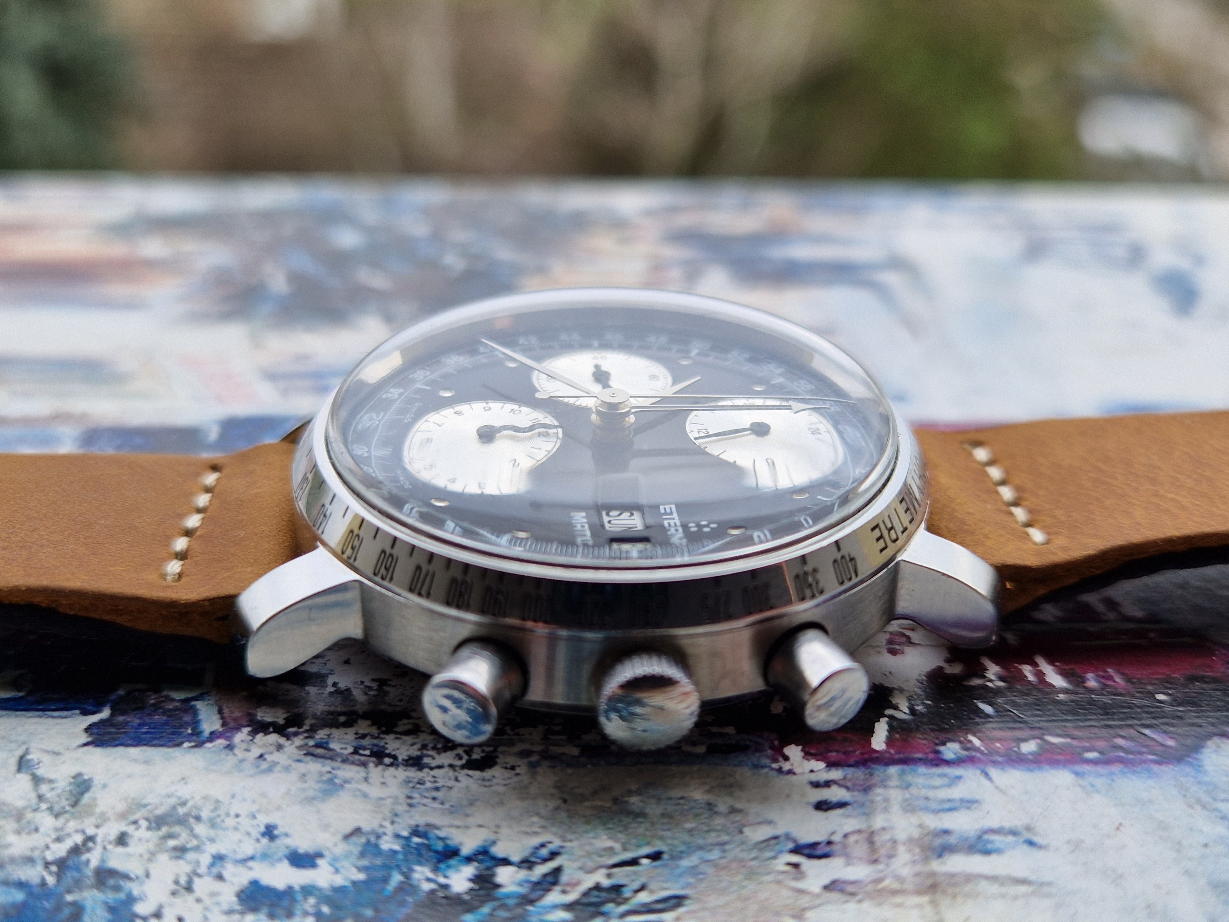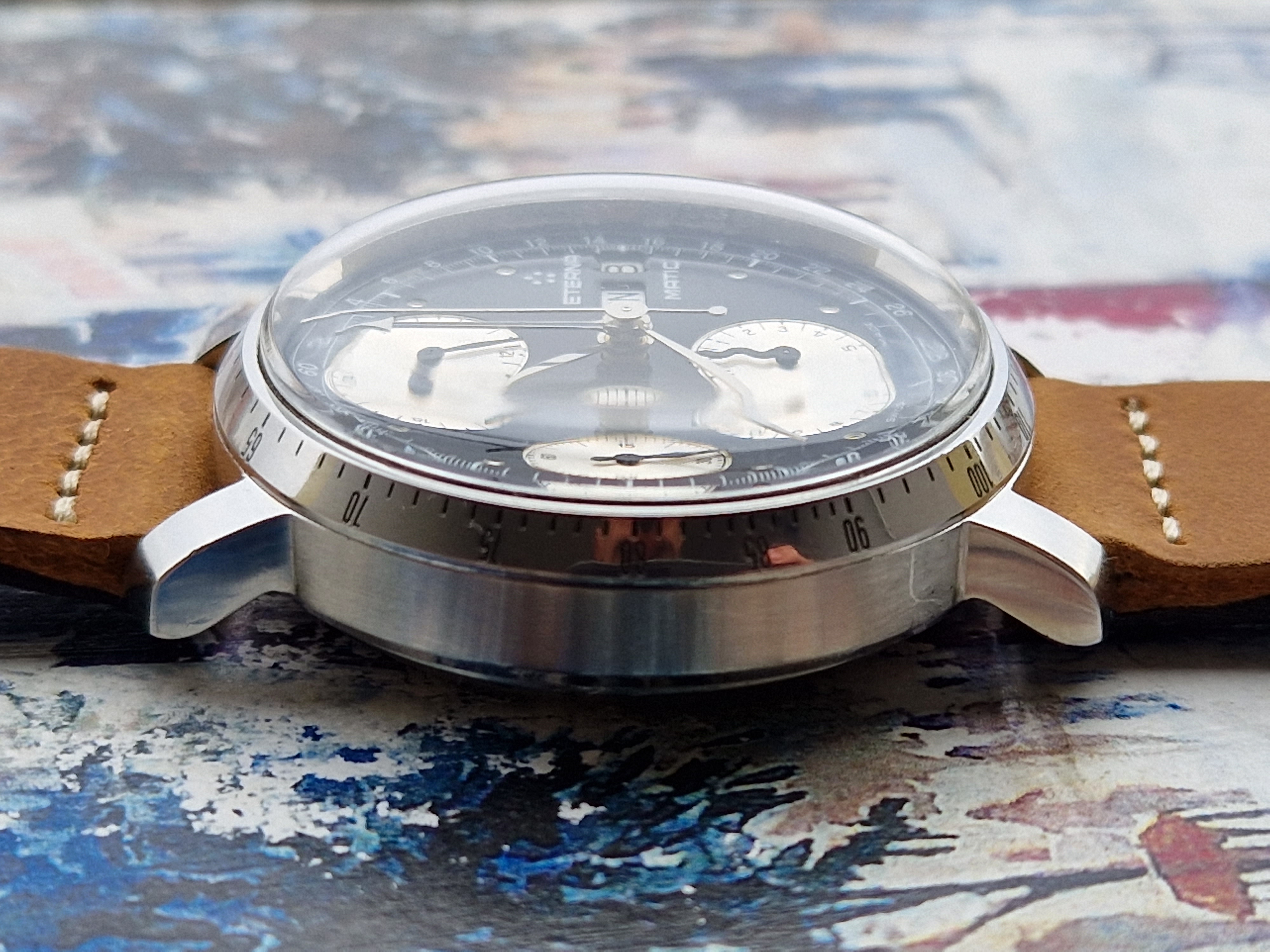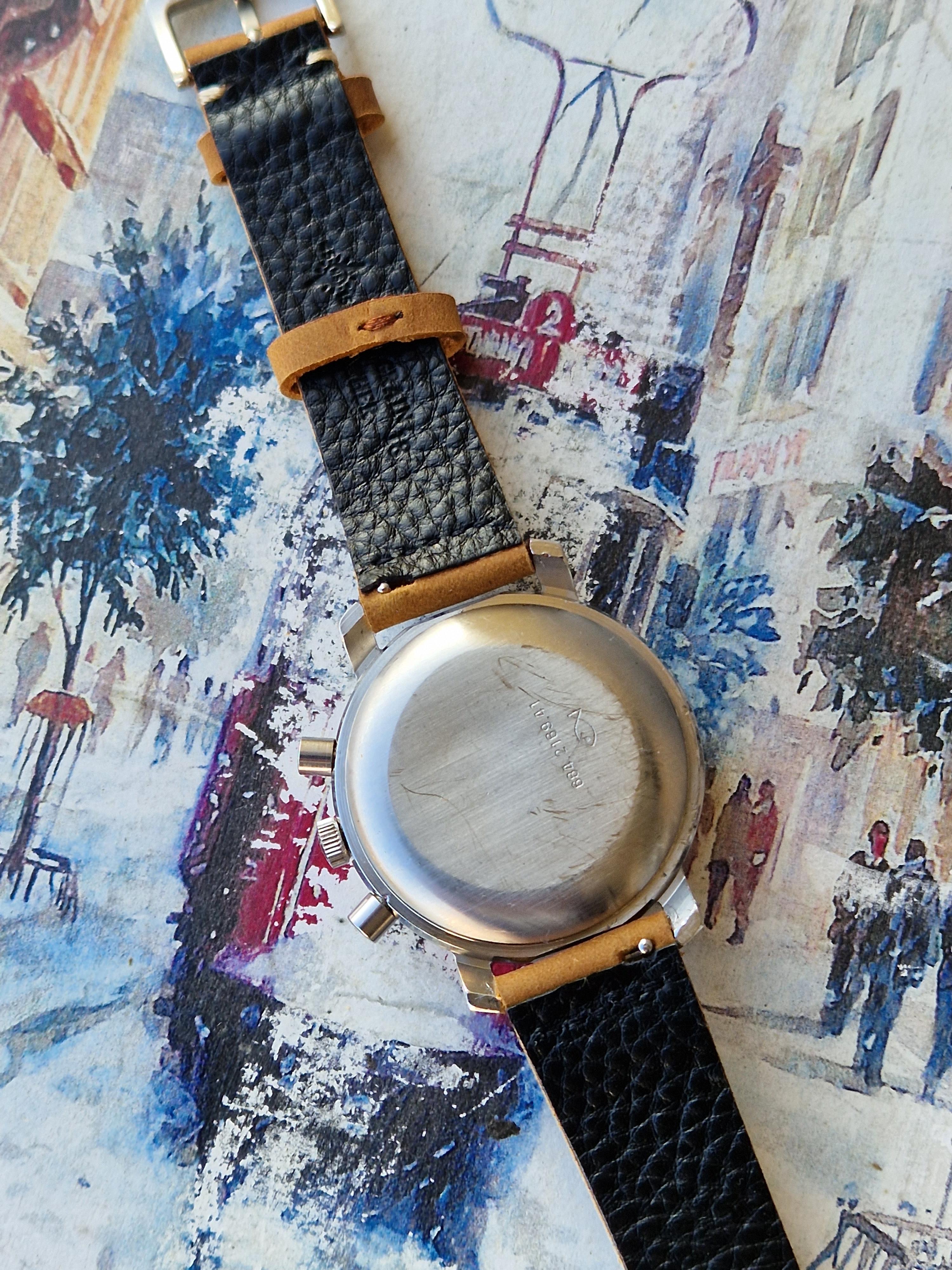 inside is serviced (10.2022) lemania 5100 a legendary workhorse of a movement. It has 17 jewels, hacking seconds, and power reserve of 48 hours, and operates at 28,800 A/h.
