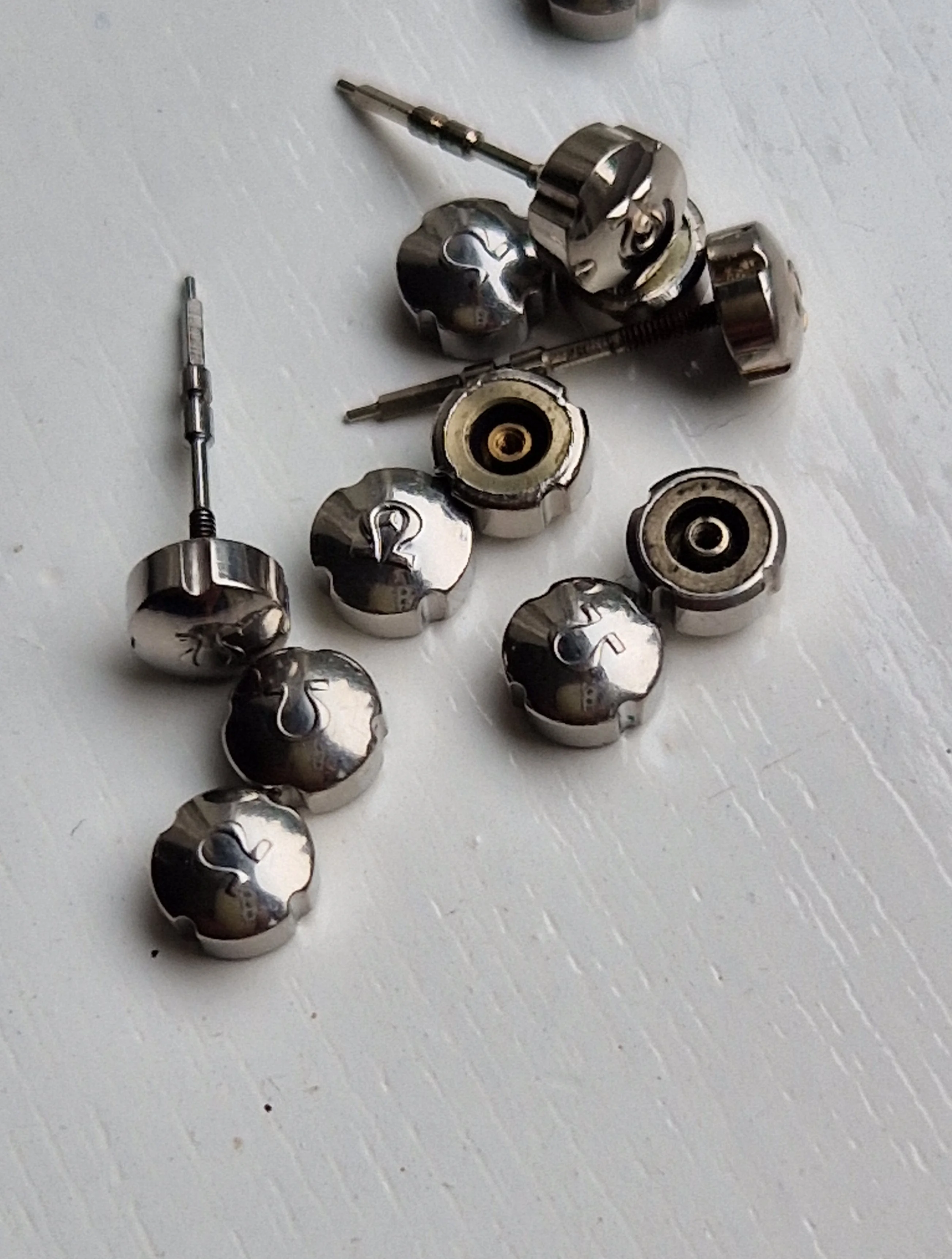 ·I've come into a stash of crowns, amongst them some vintage steel Seamaster clover crowns. These are 1950's vintage and in great shape with the old flat foot logo. Some of them are really early and also have the cool Naiad 'Mercedes' logo.