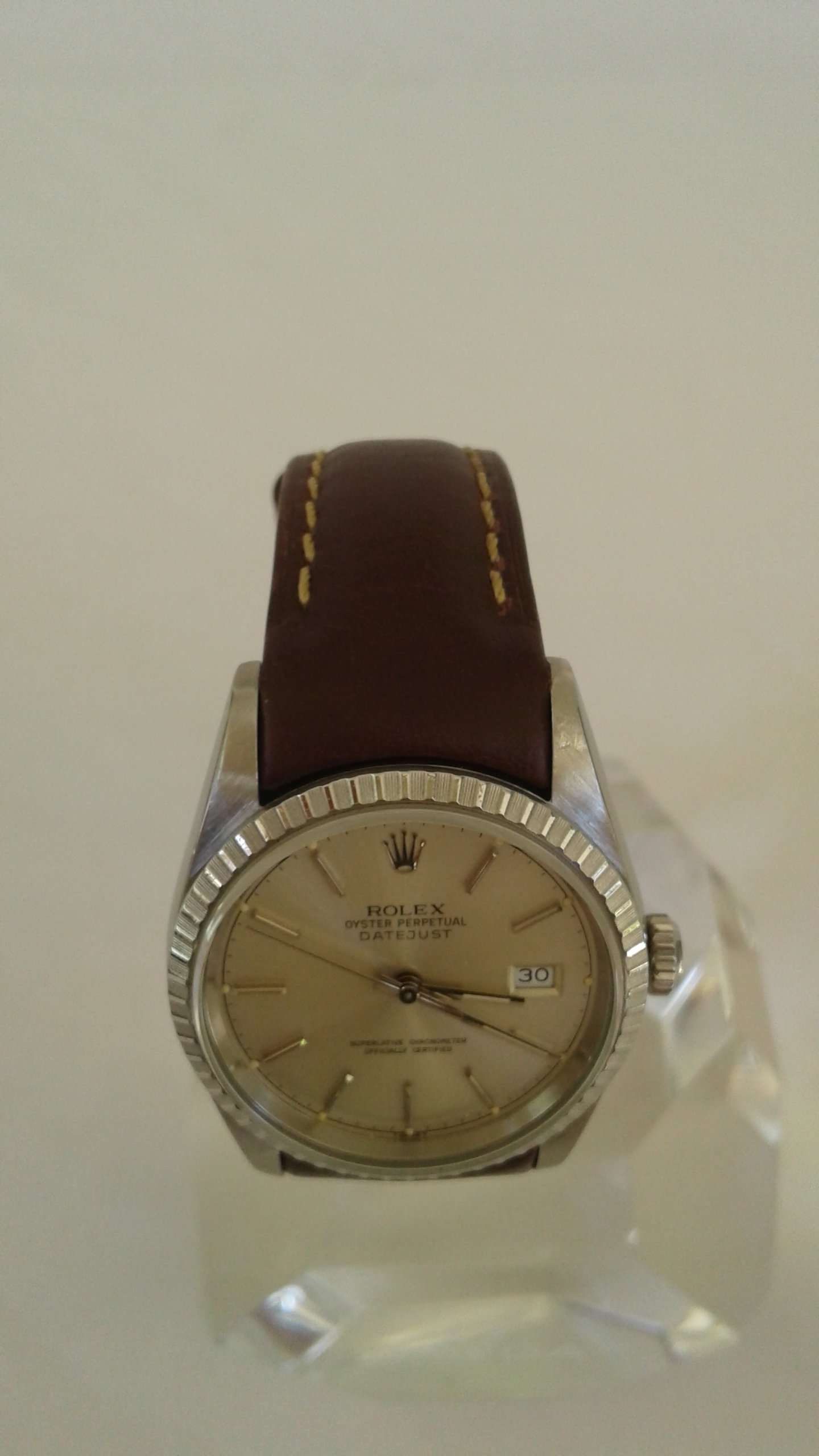 For sale I have an Everest curved end calf leather strap in brown with tan stitching for Rolex Datejust 36mm with reference number 16xxx (1980 to 2004 made). 20mm wide lug end, 18mm wide buckle end. The strap is long 80mm buckle end and 120mm holes end.