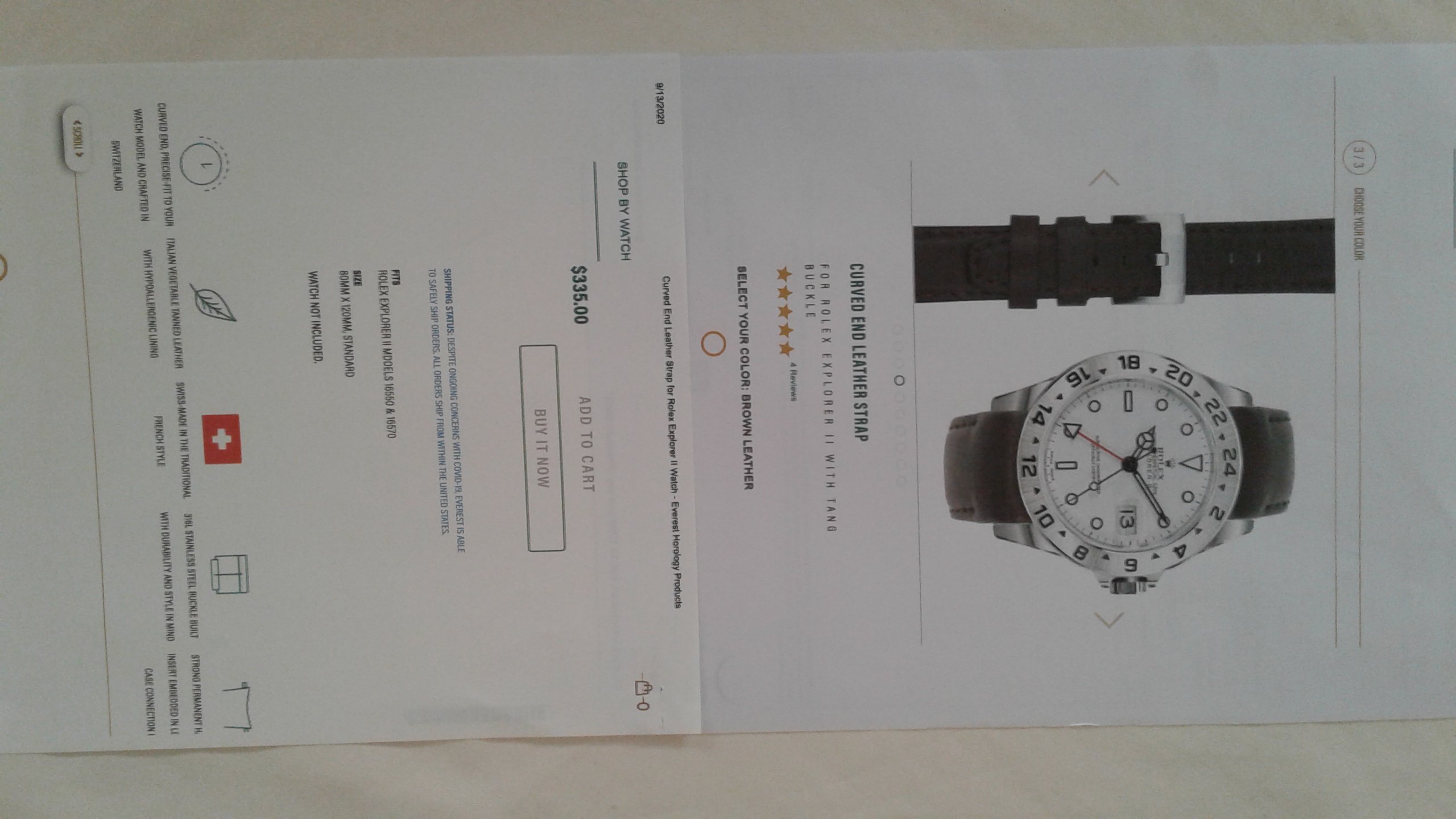 Up for sale I have an Everest brown calf leather watch strap with curved ends and tang/pin buckle made for the Rolex Explorer II 40mm model 16570. The curved lug ends are 20mm, the clasp ends are 18mm. Holes end is 123mm long, clasp end is 83mm long. The strap is in good condition with the usual crease marks in the leather on the inside and face side, no scuffmarks or other visible damages. The leather has some marks where the strap is connected to the watch lugs, this is not visible when installed on the watch. The stains on the inside of the strap are from the butterfly deployant clasp I had fitted, they are not dirt. Brushed SS tang/pin buckle in new condition. Made for the Rolex Explorer II 16570 it 'll also fit the 40mm Submariner 14060 and the 40mm GMT Master 16700 or 16710. Comes with all the envelopes and cards/papers as per the picture.